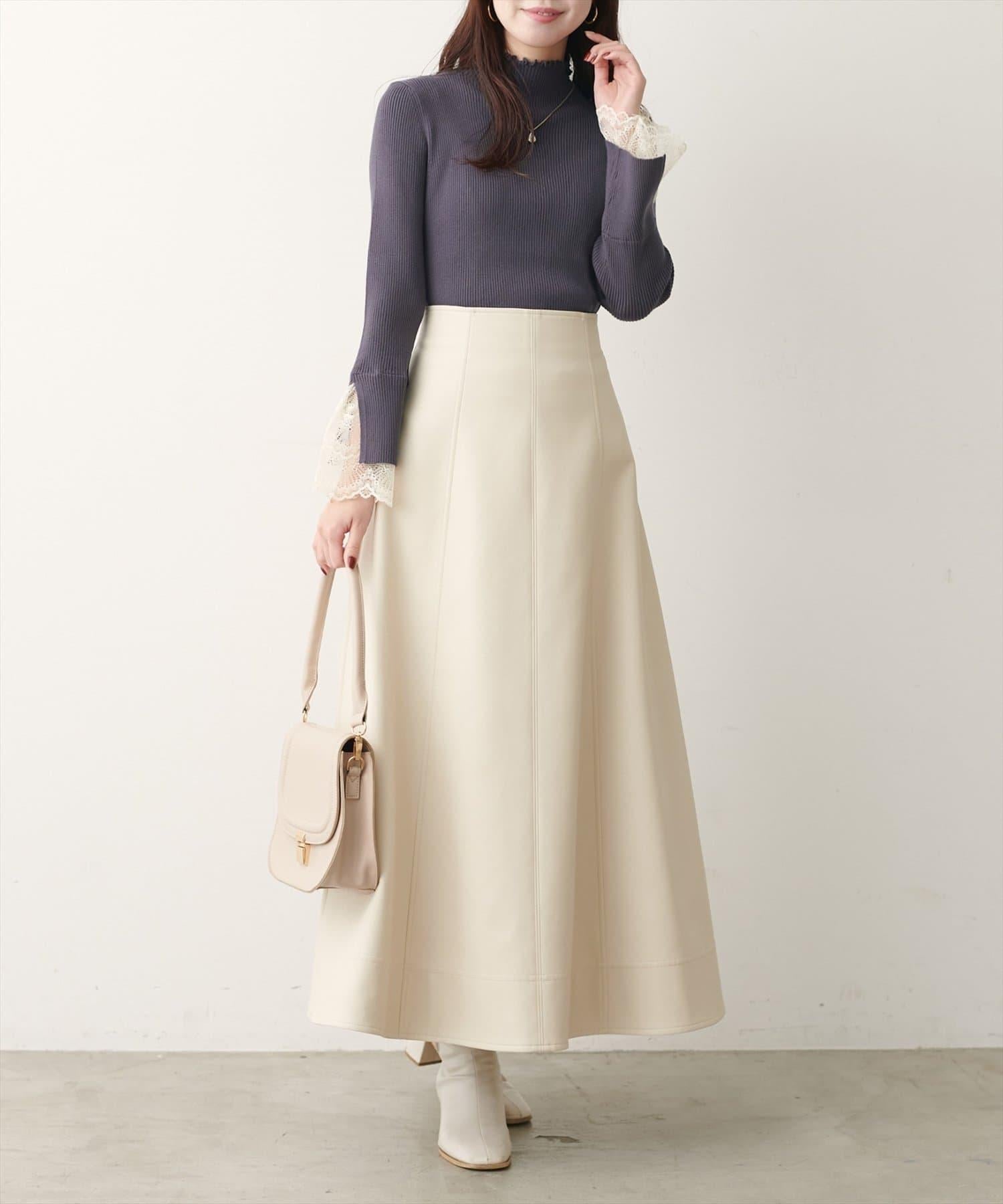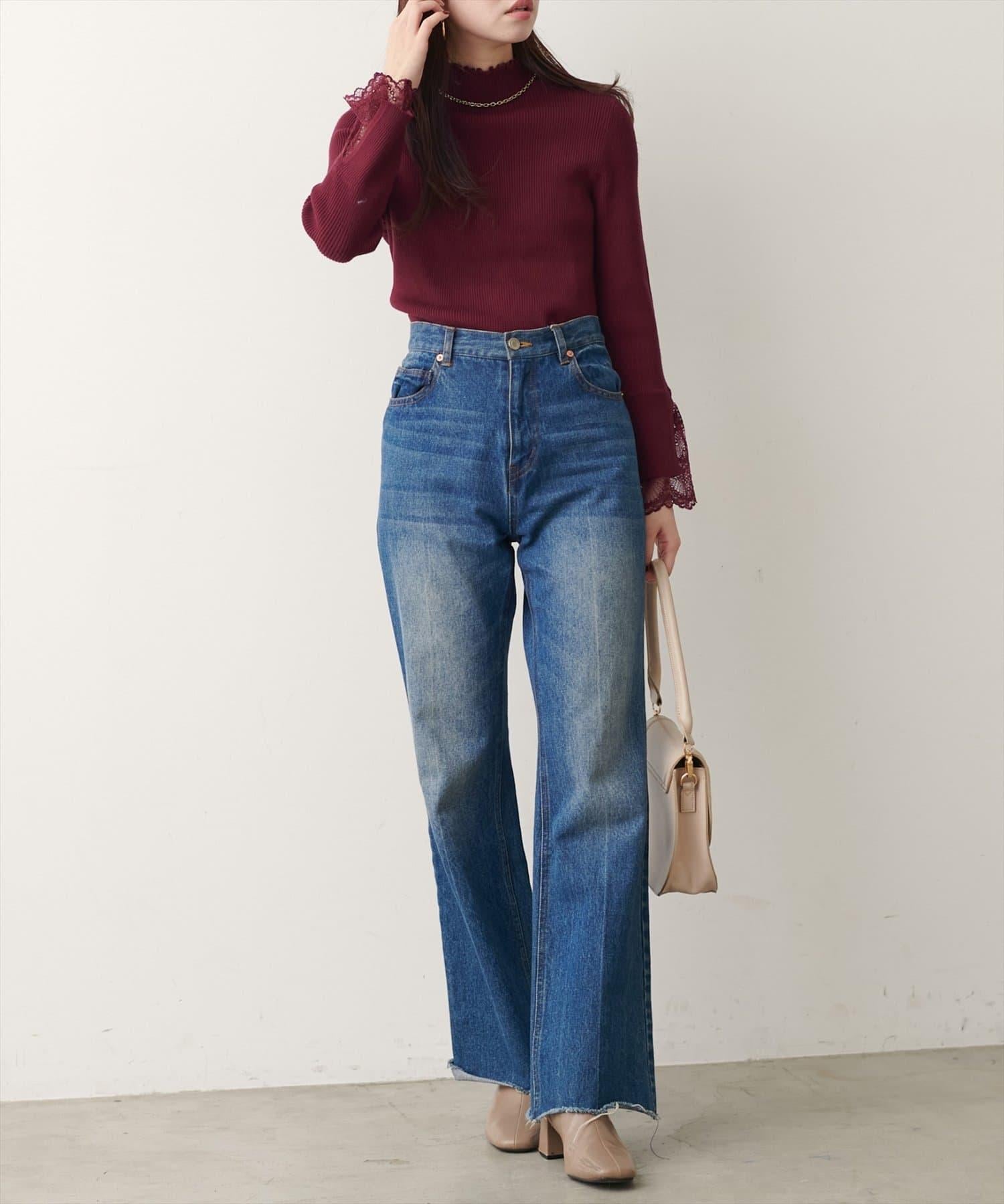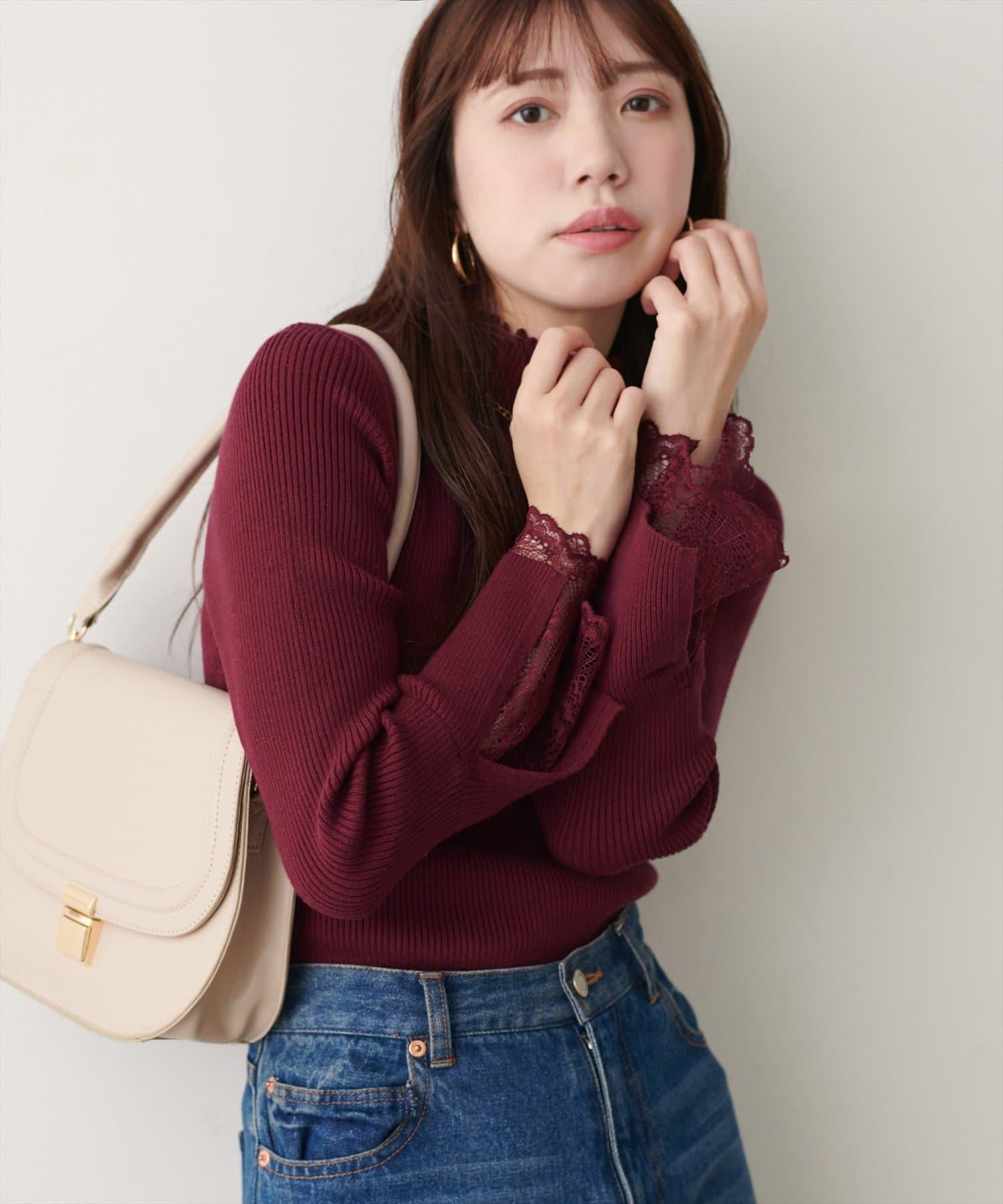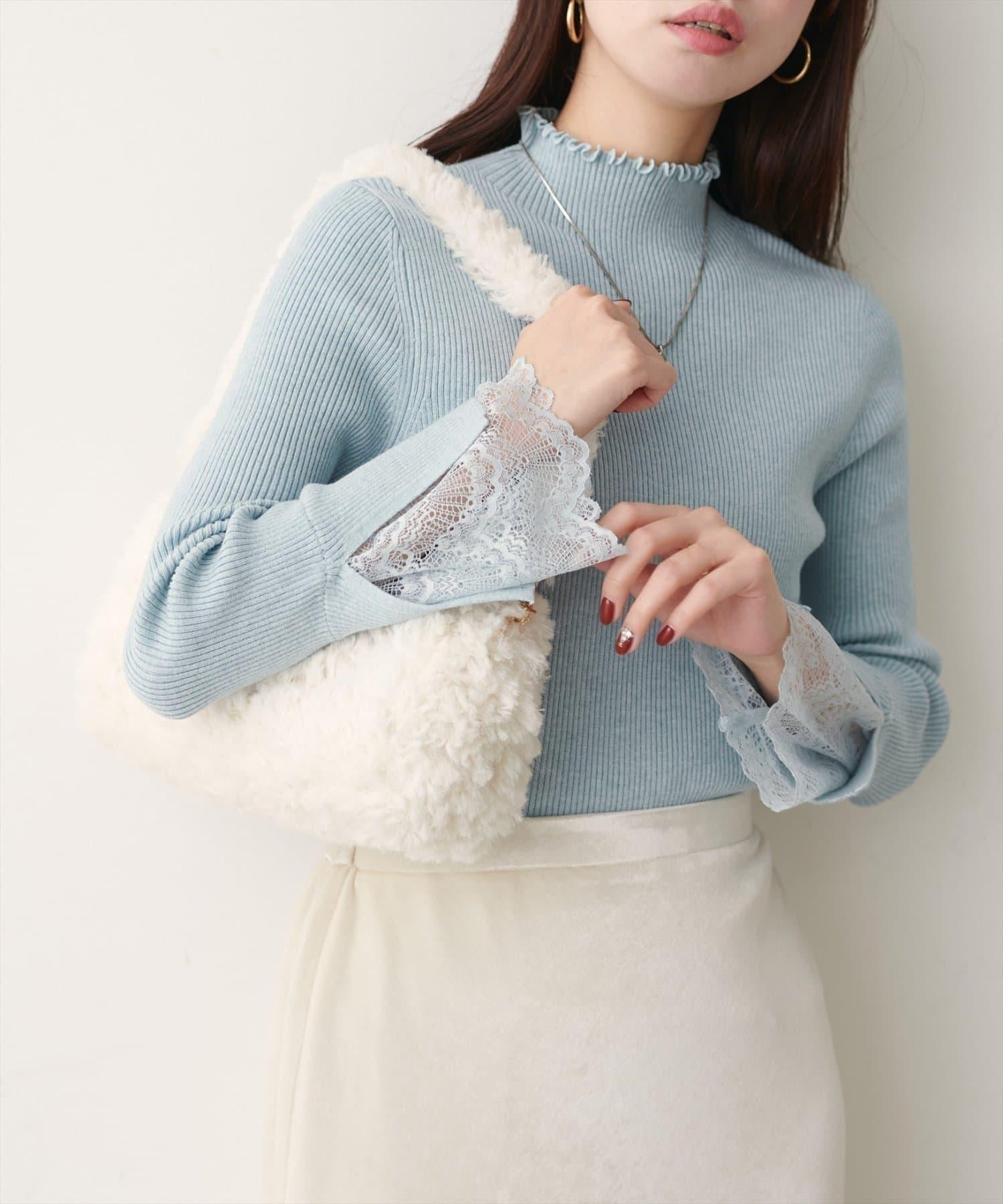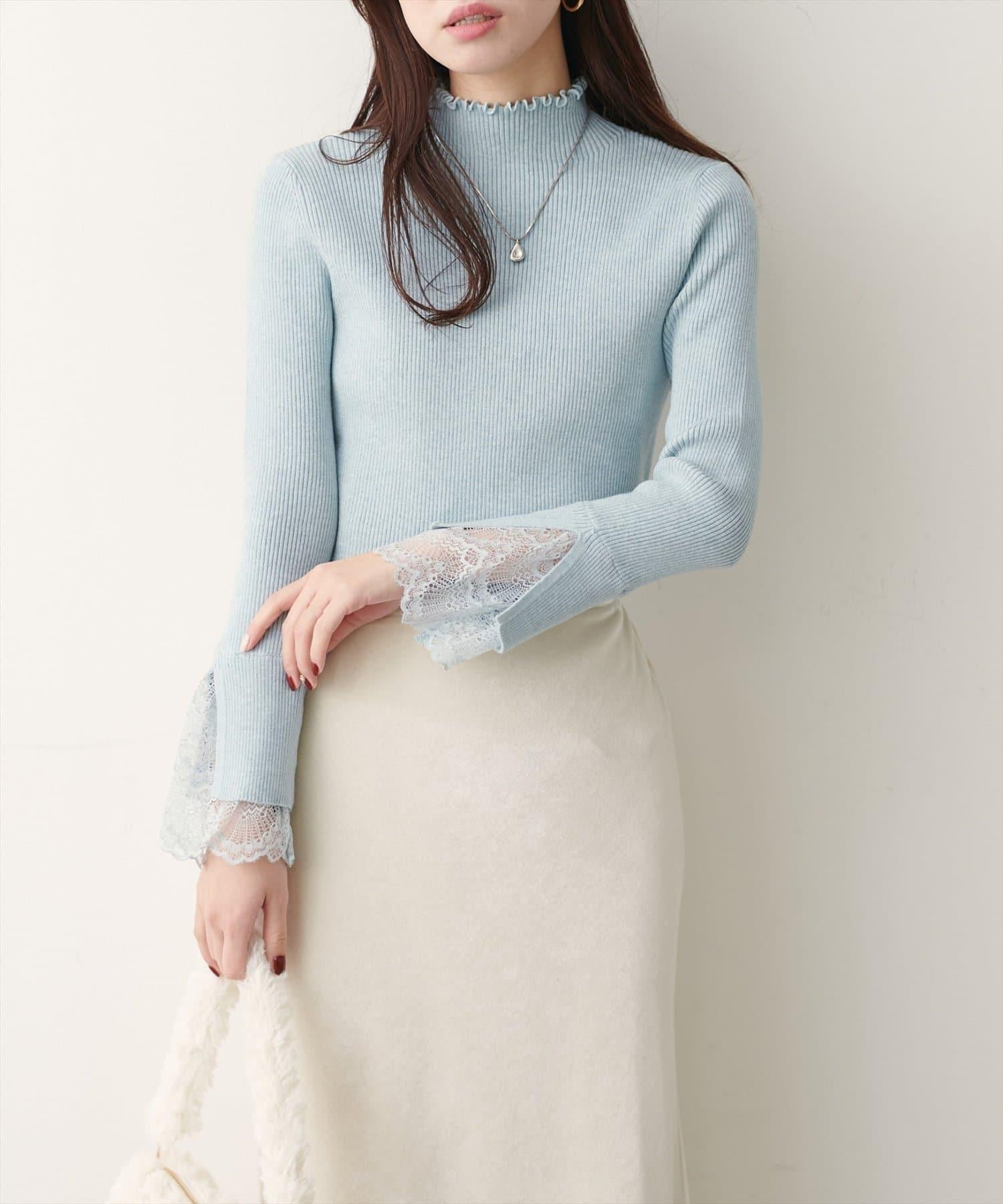 簡潔的羅紋針織上帶有蕾絲袖口的女性化高領針織衫,可搭配任何服飾。