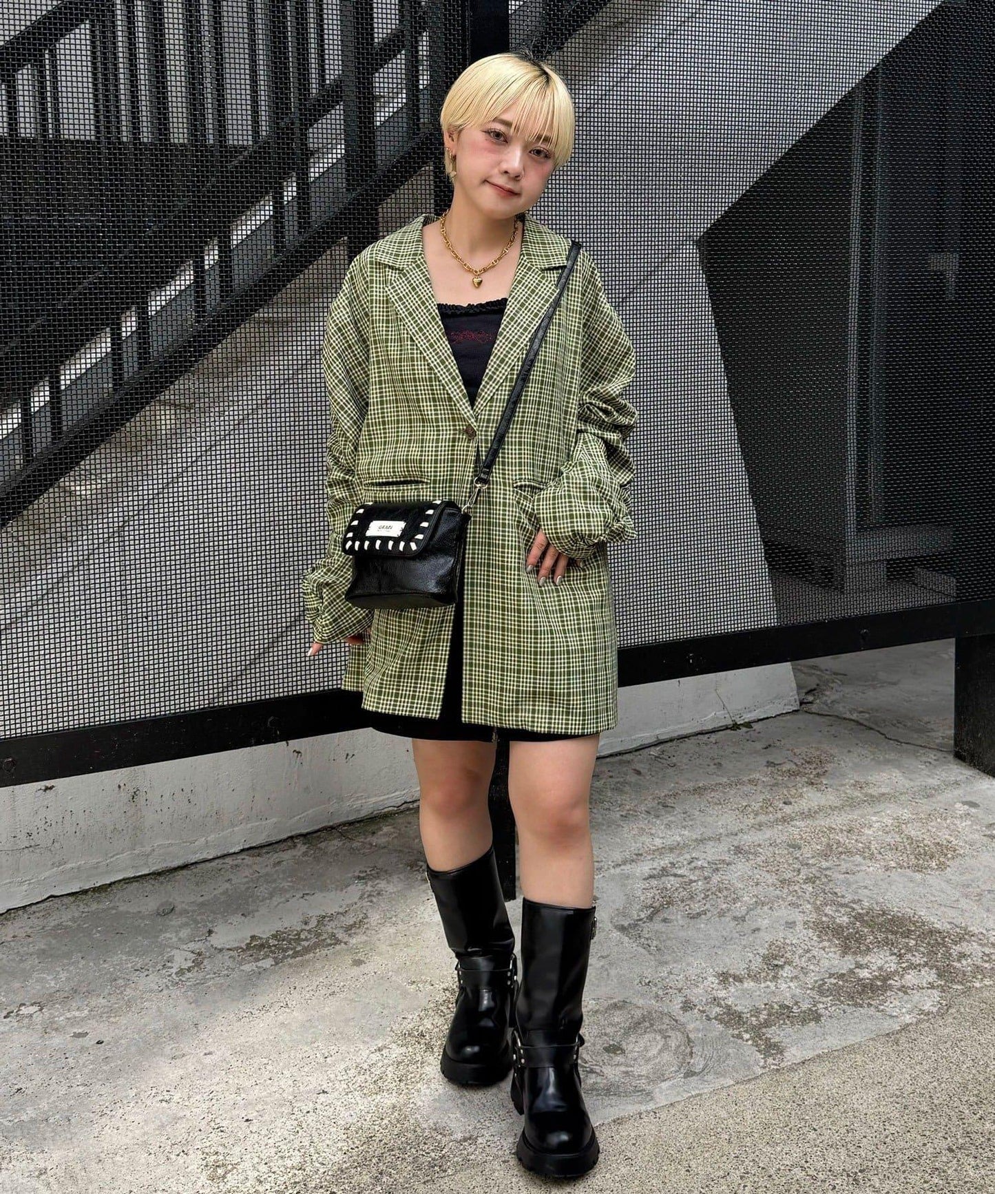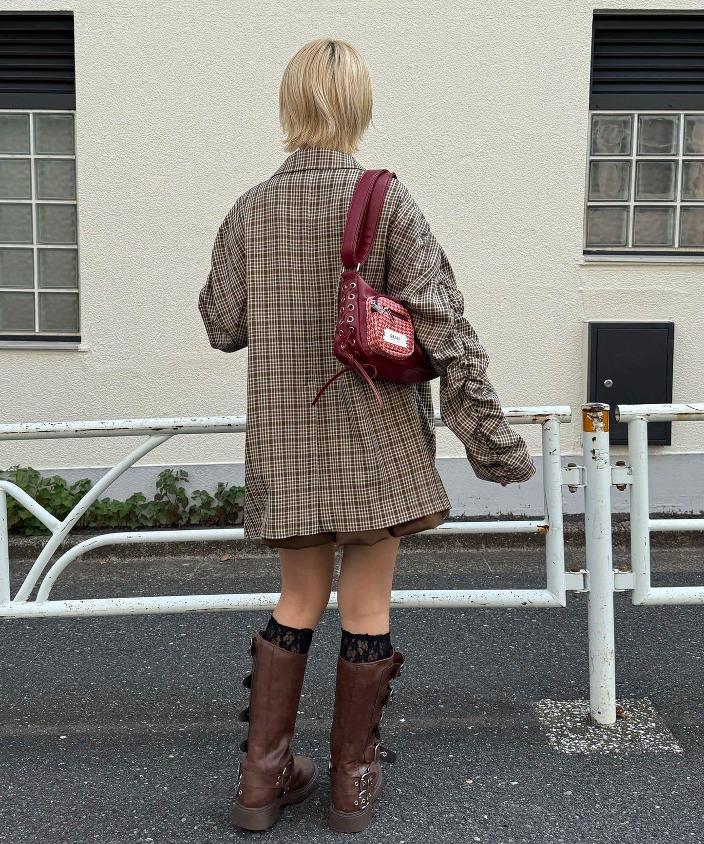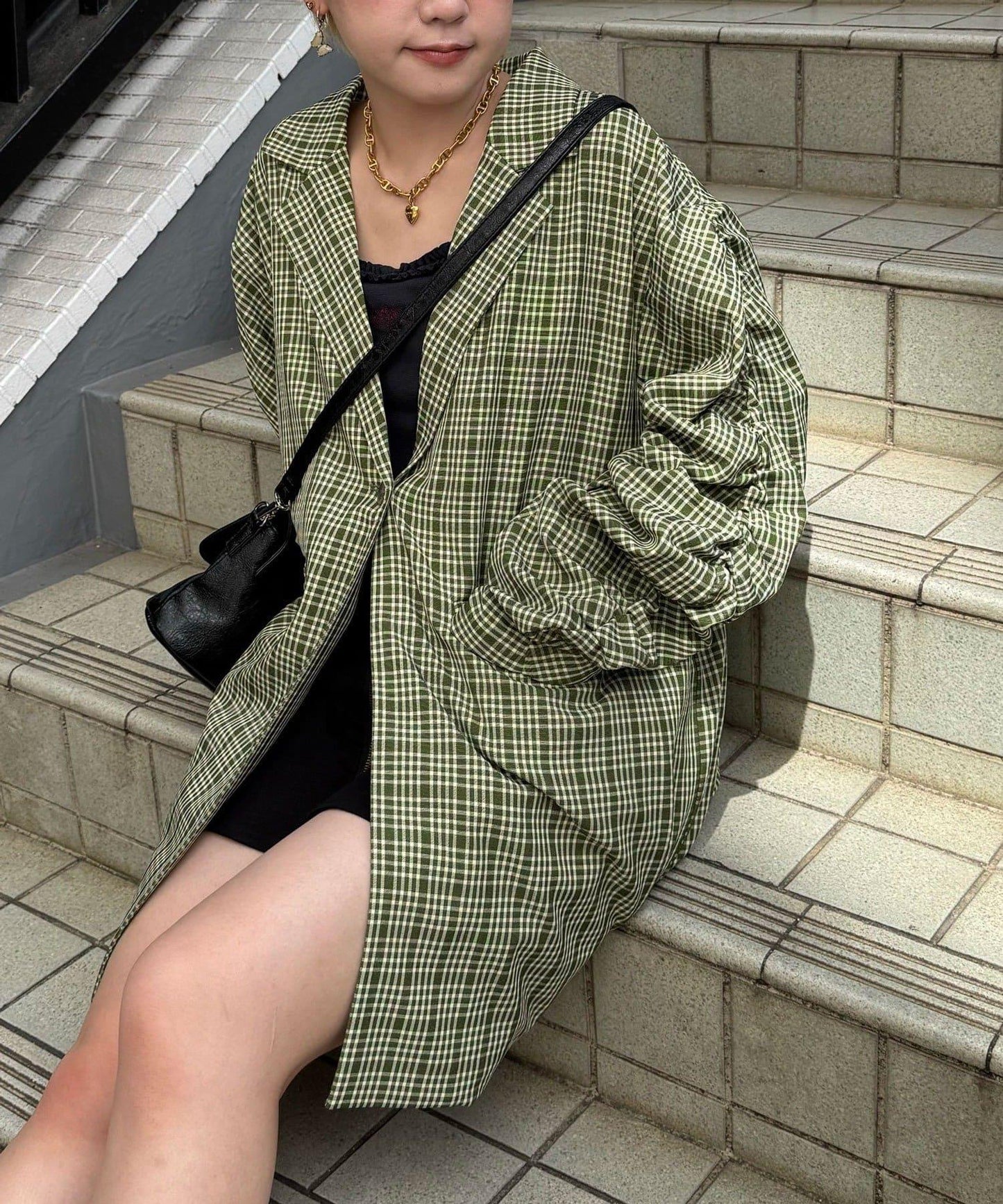 寬鬆廓形的 "老爺爺 "式夾克,肩部平放,飾有棋盤格圖案。