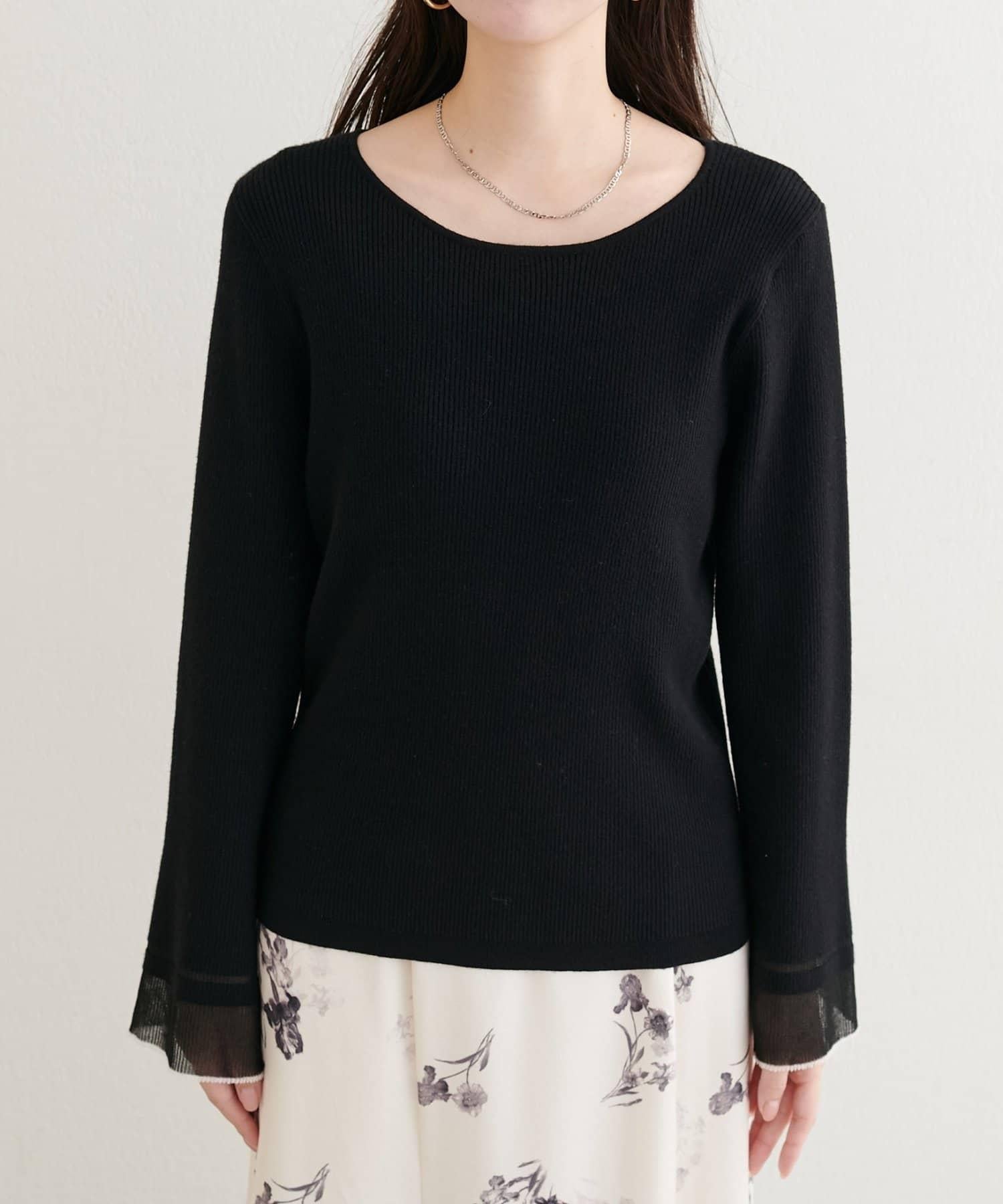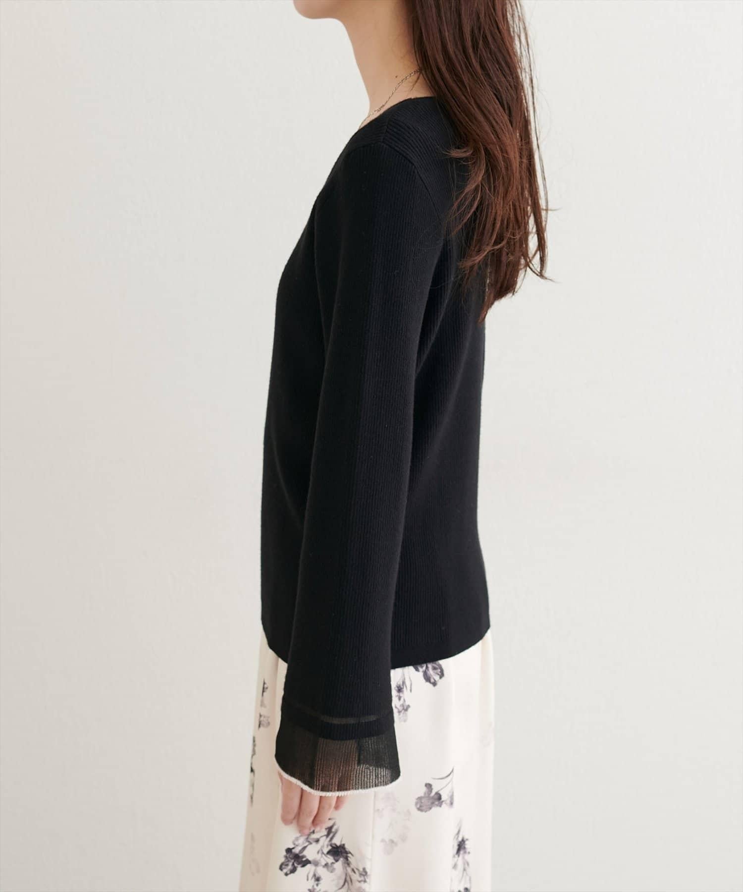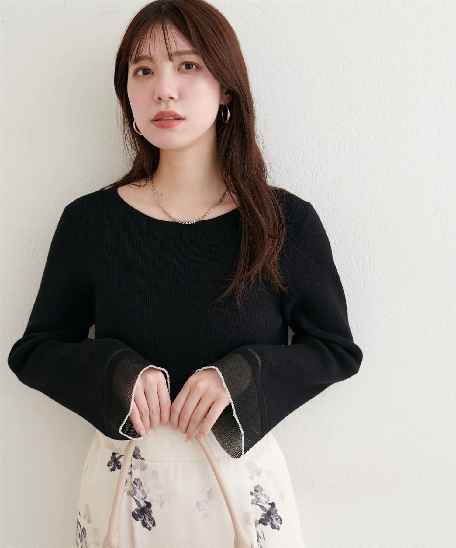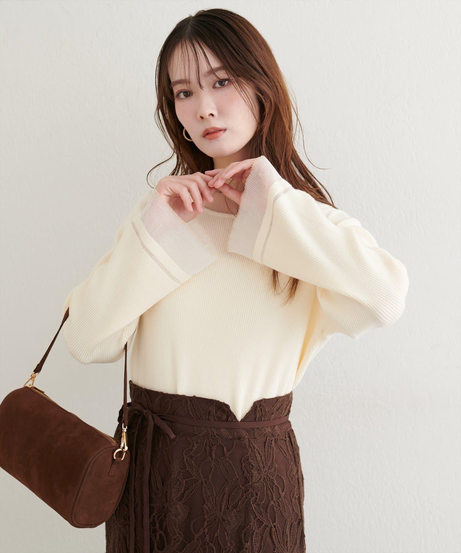 這款針織上衣袖口的透視喇叭設計給人一種含蓄而華麗的印象。
