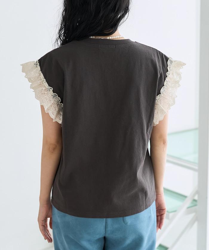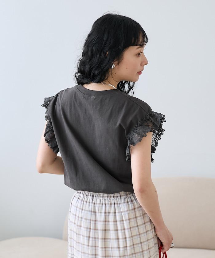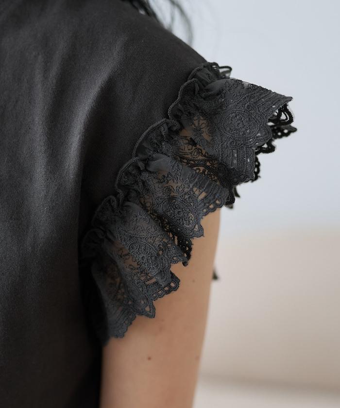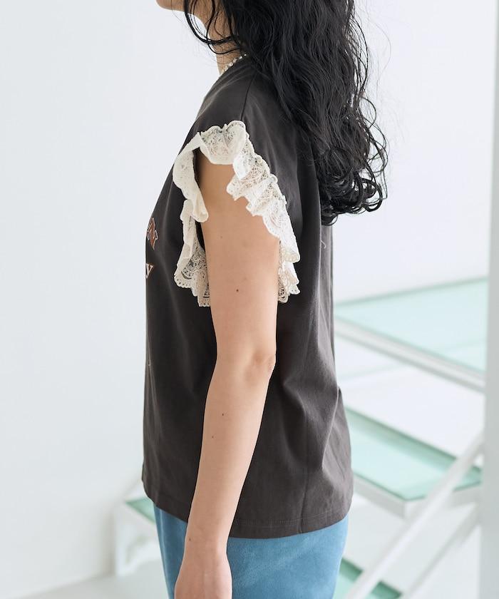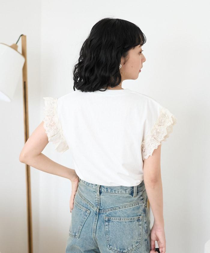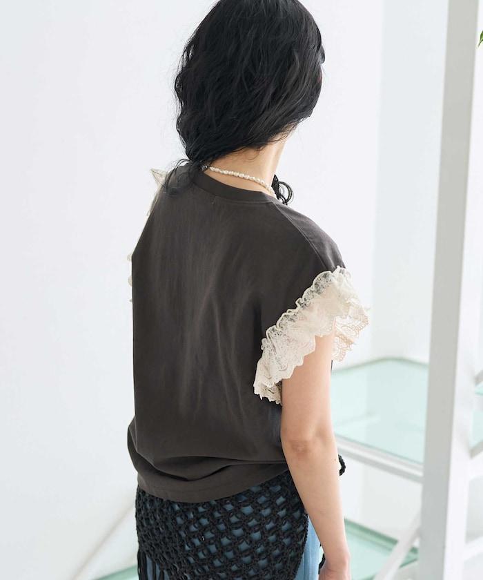 這是一款偏向休閒的 T 恤,但袖口的蕾絲花邊讓它看起來更有女人味。