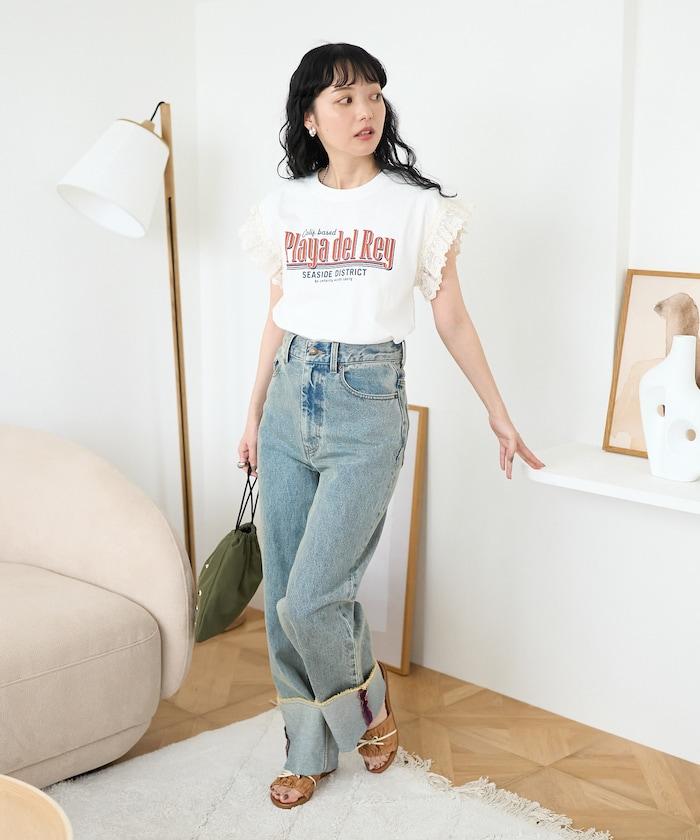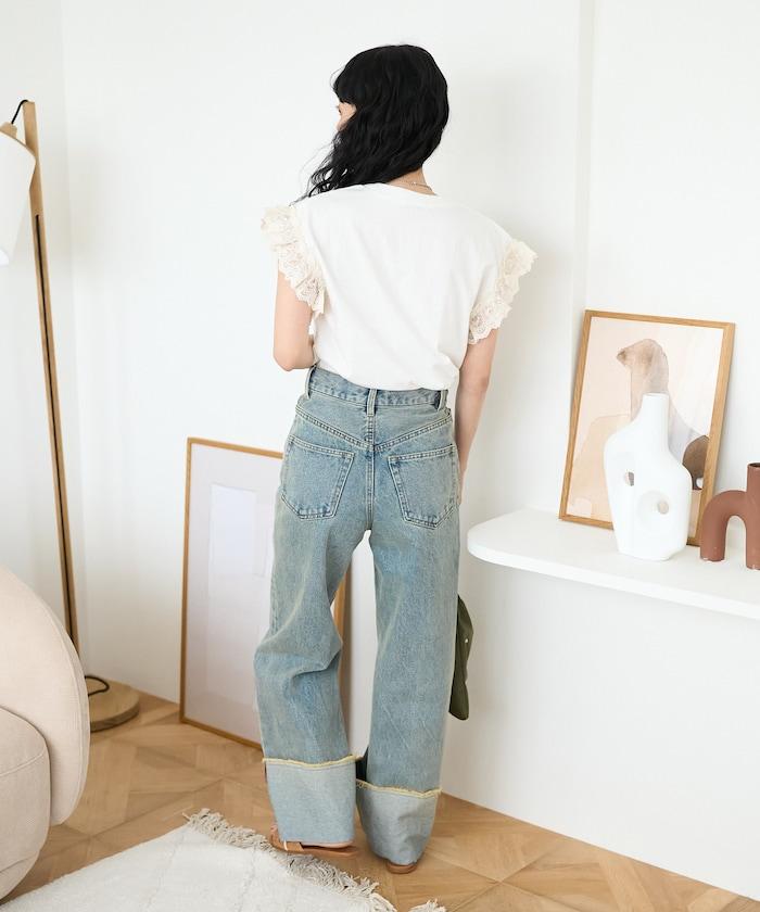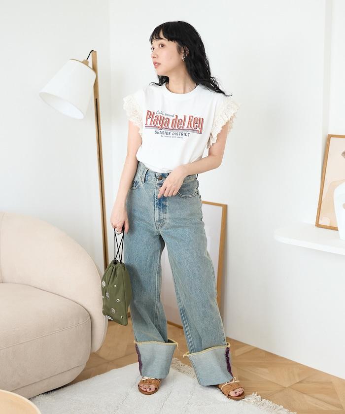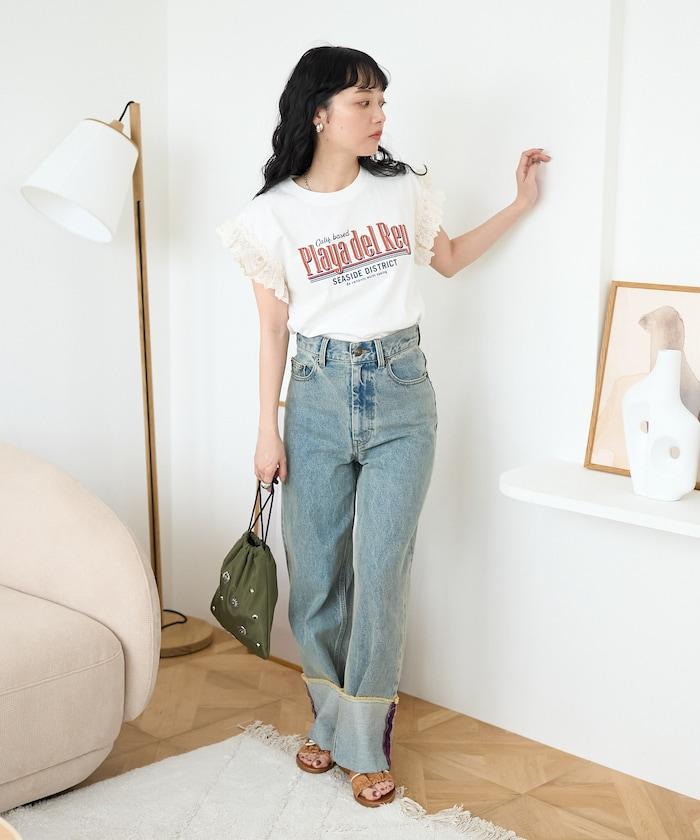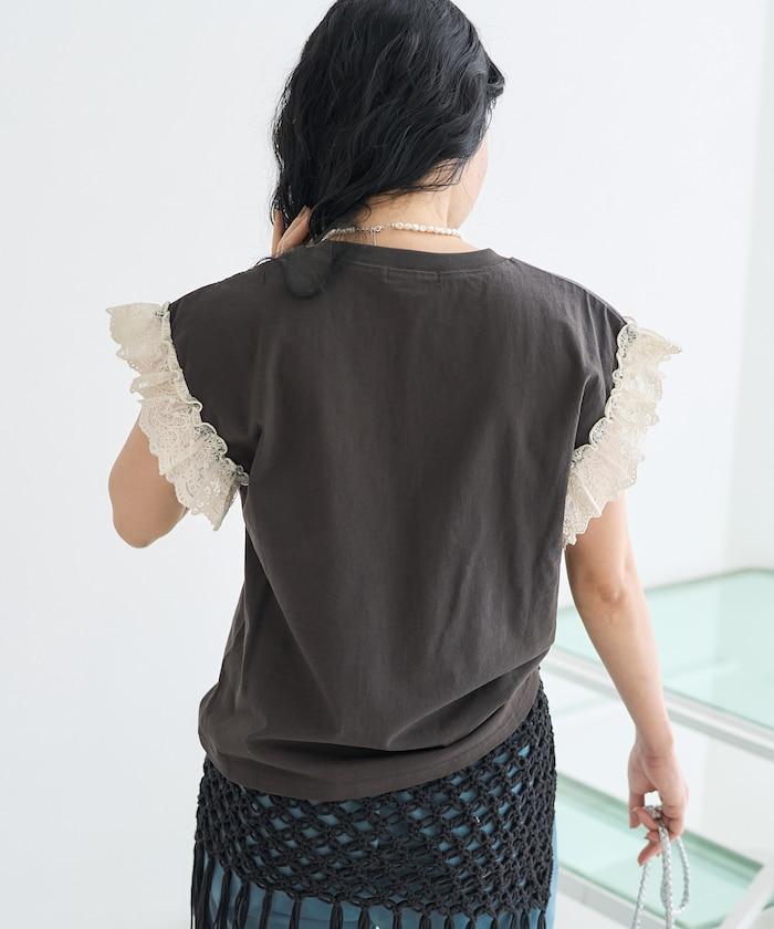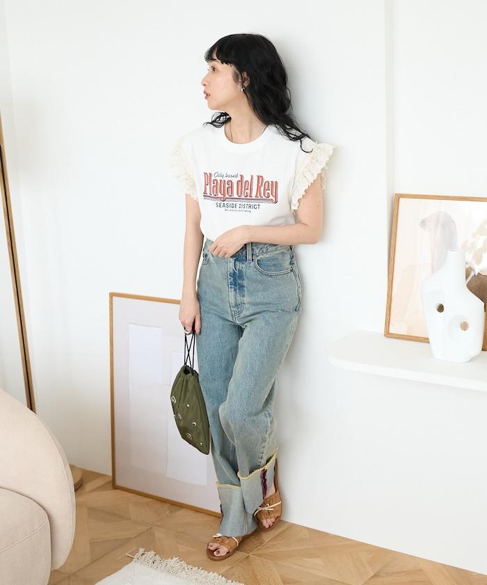 這是一款偏向休閒的 T 恤,但袖口的蕾絲花邊讓它看起來更有女人味。
