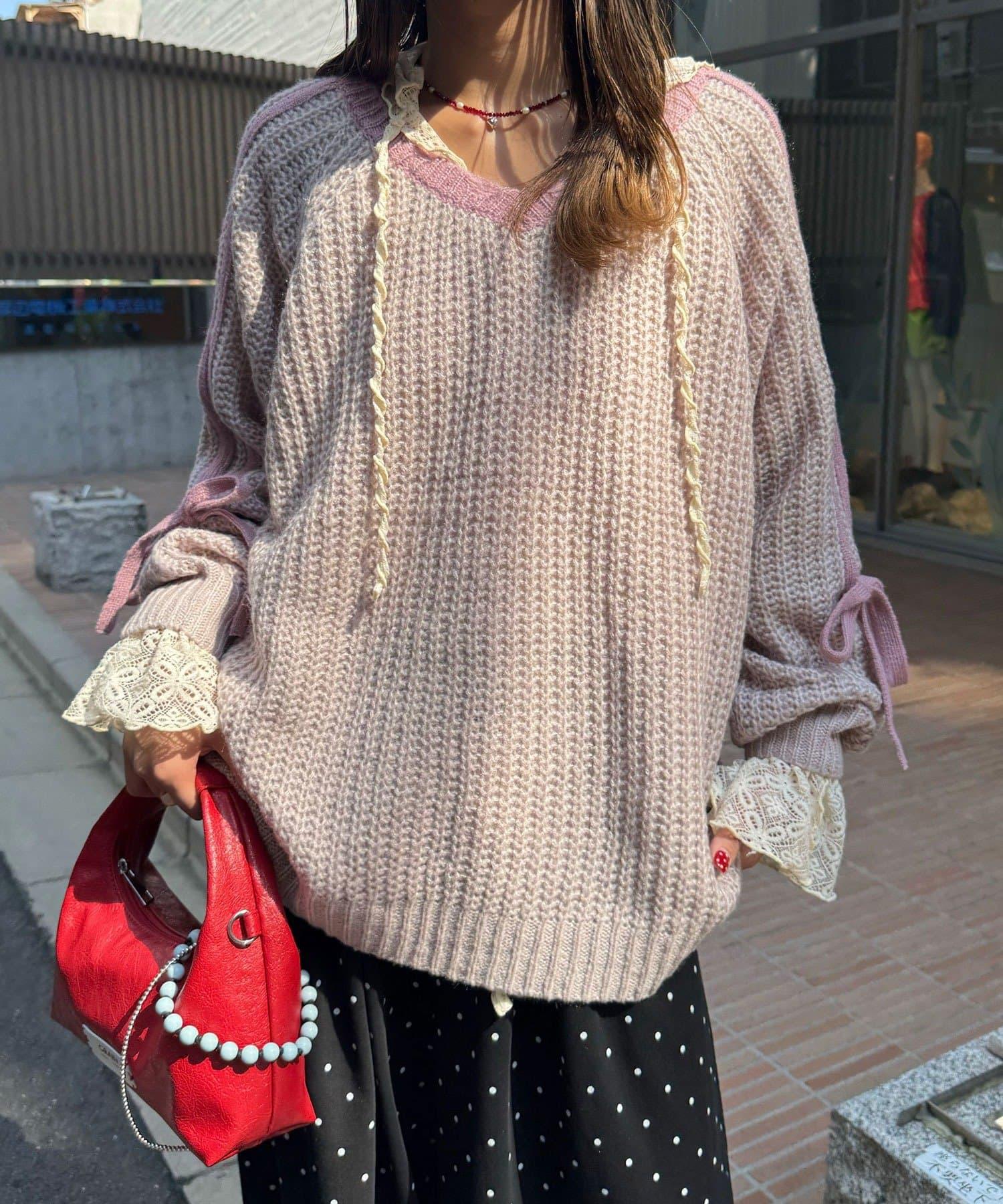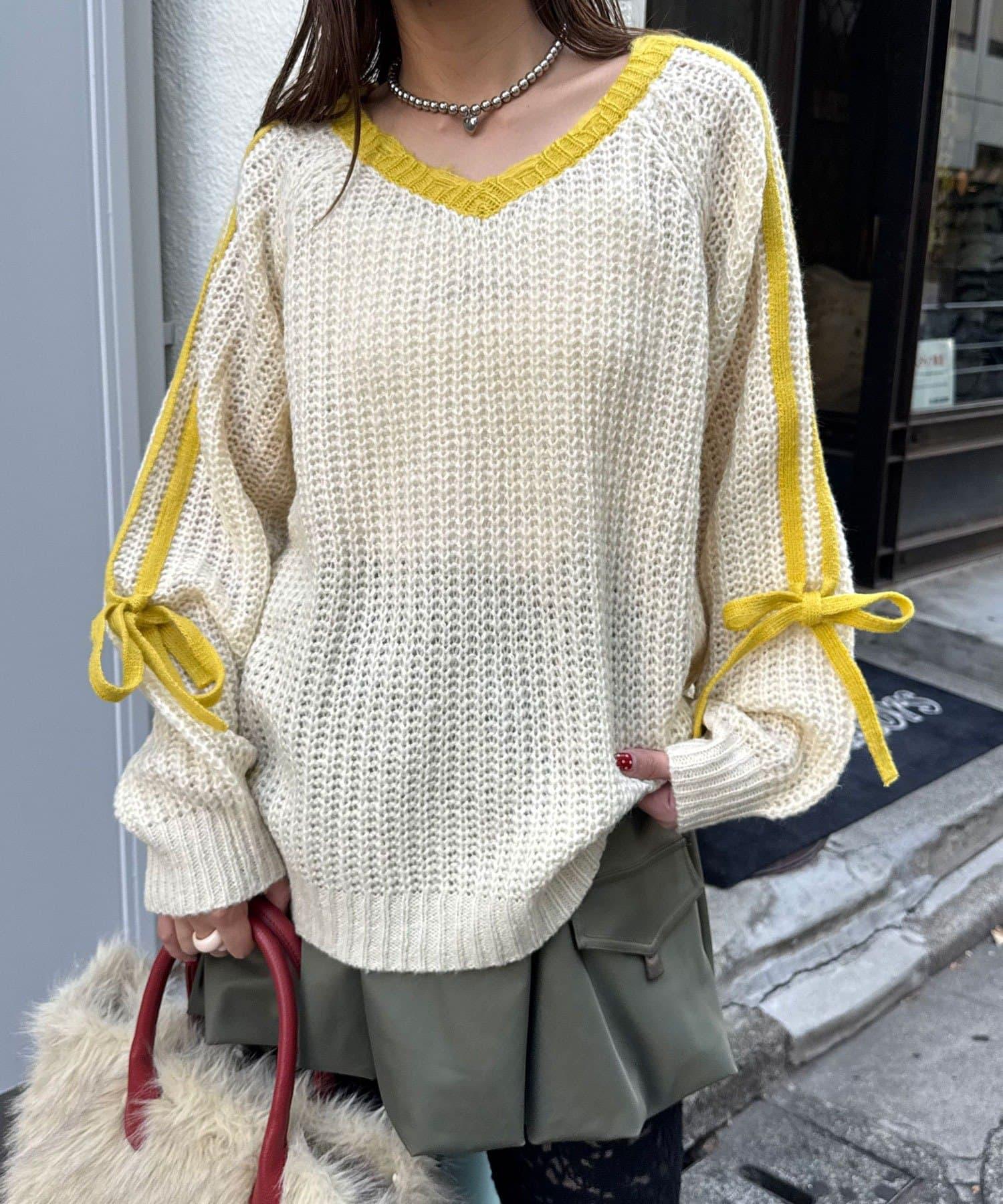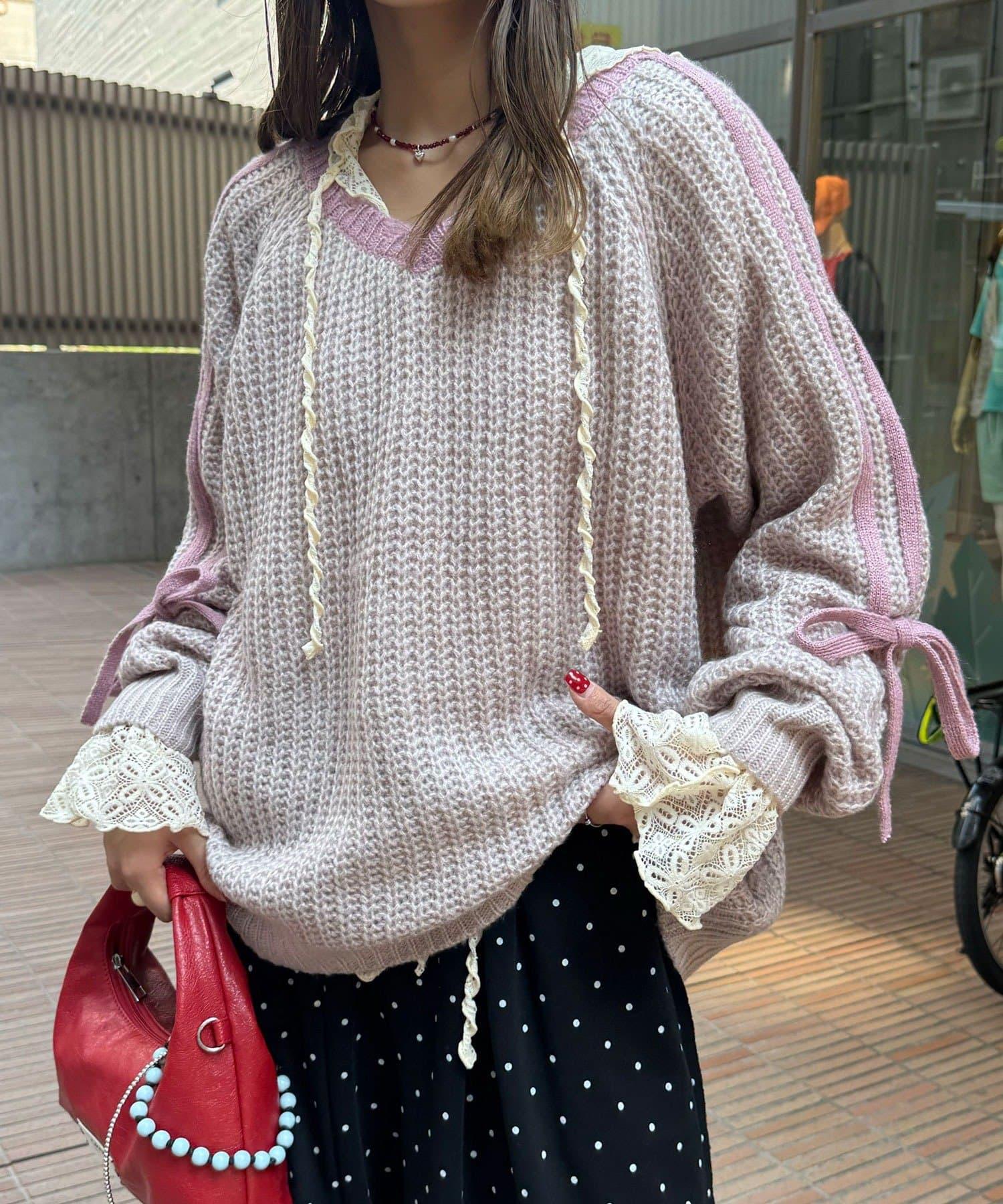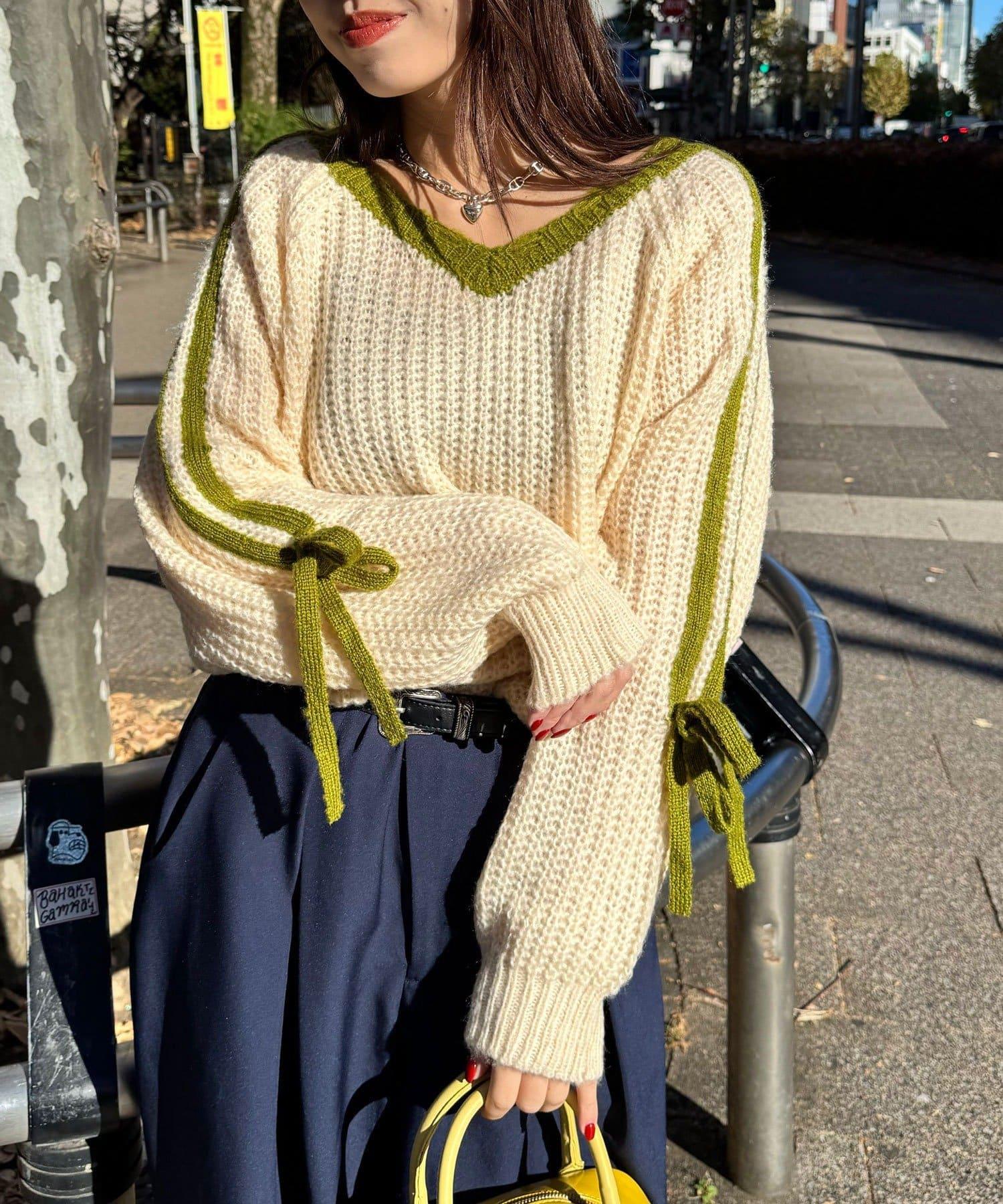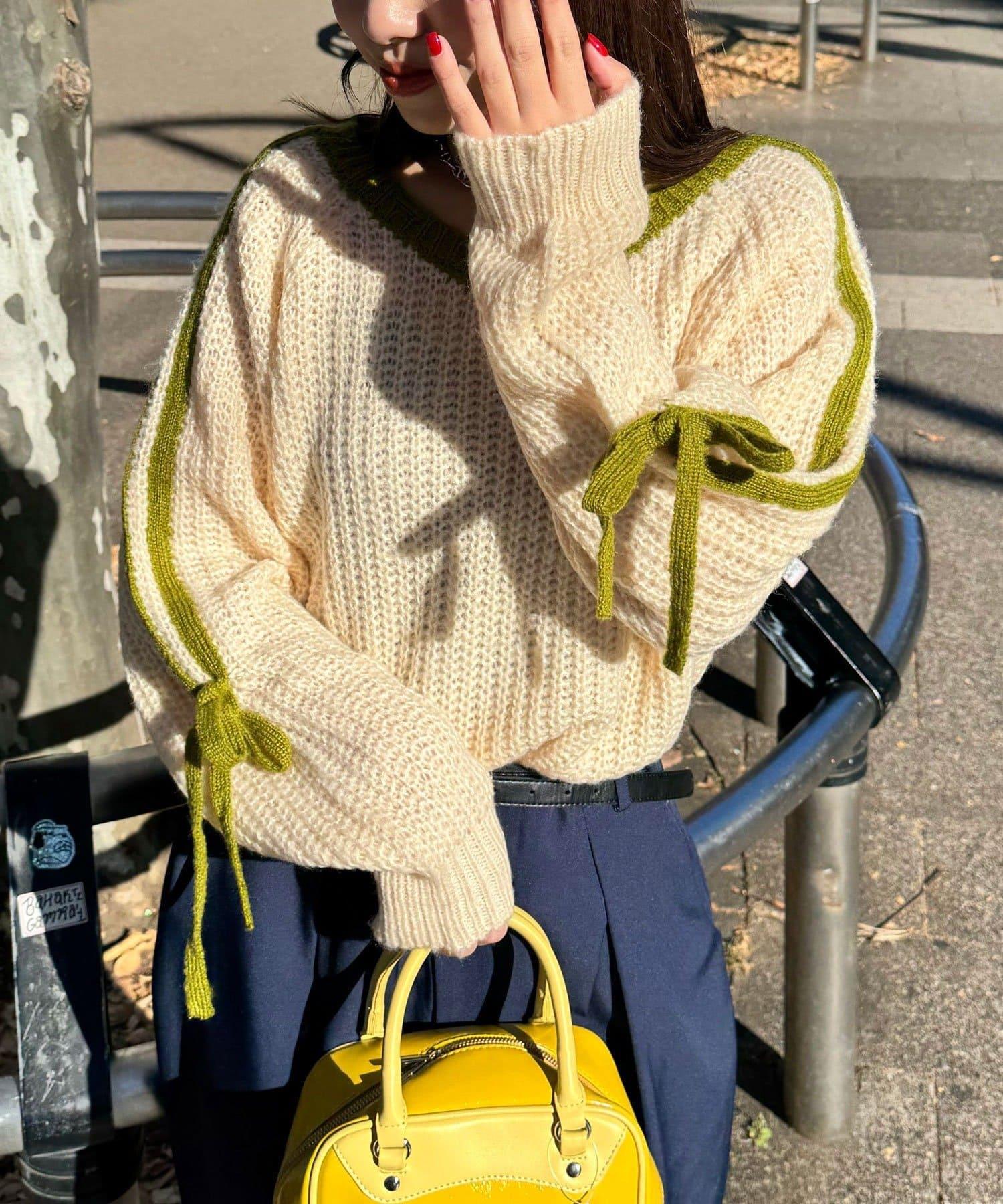 插肩式針織衫,袖子上有線條和絲帶細節。