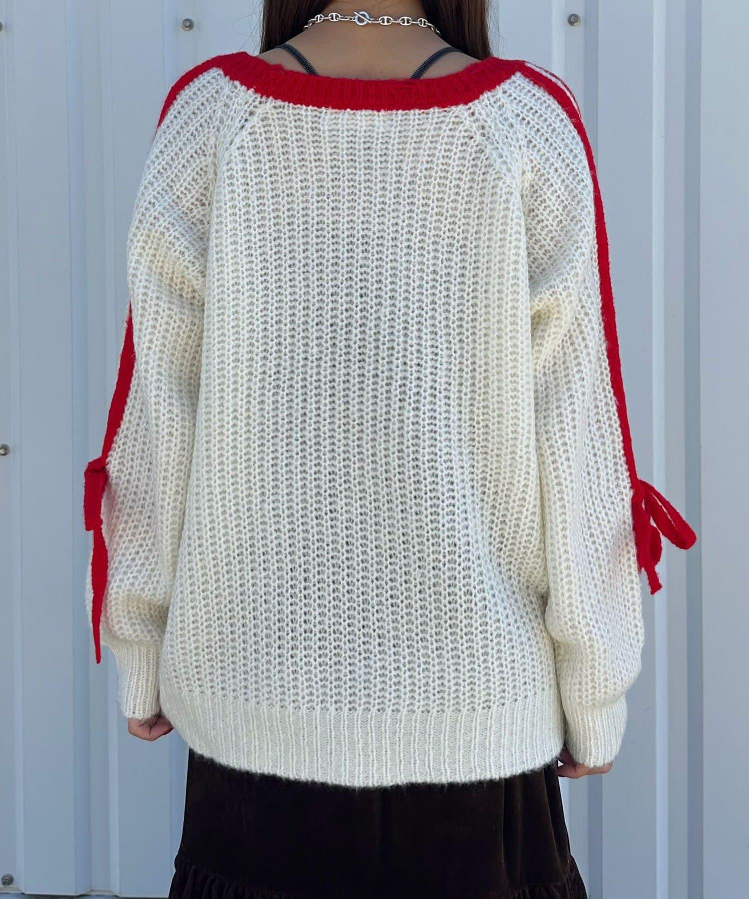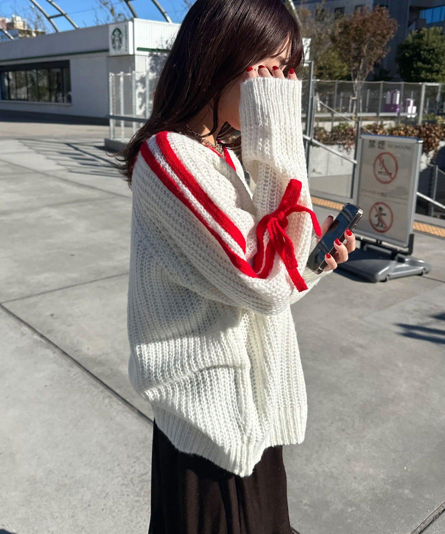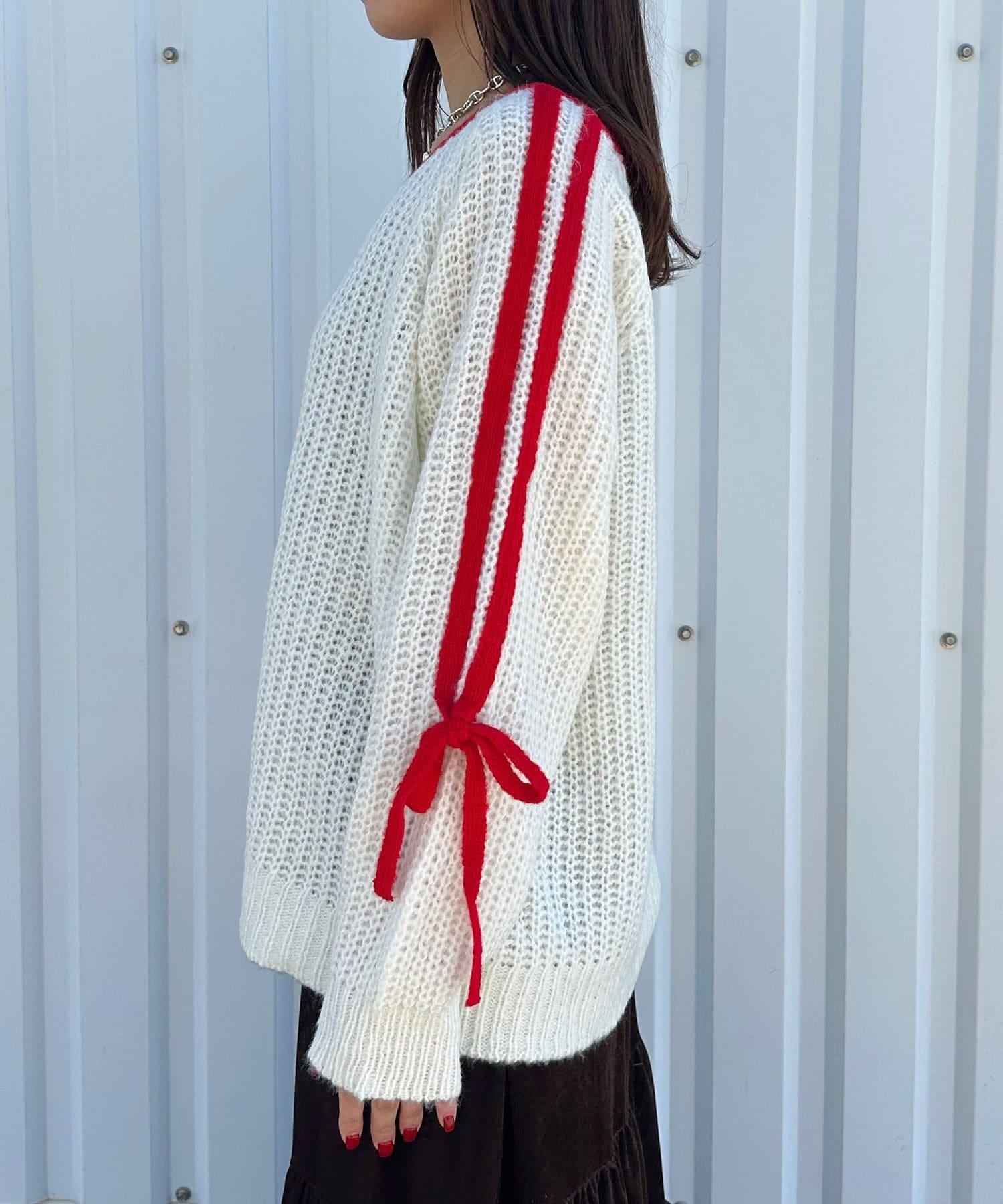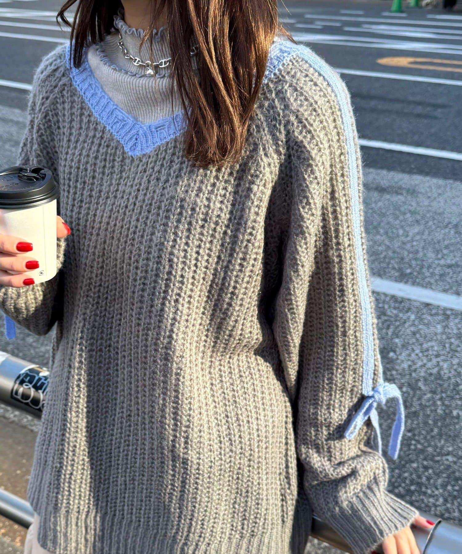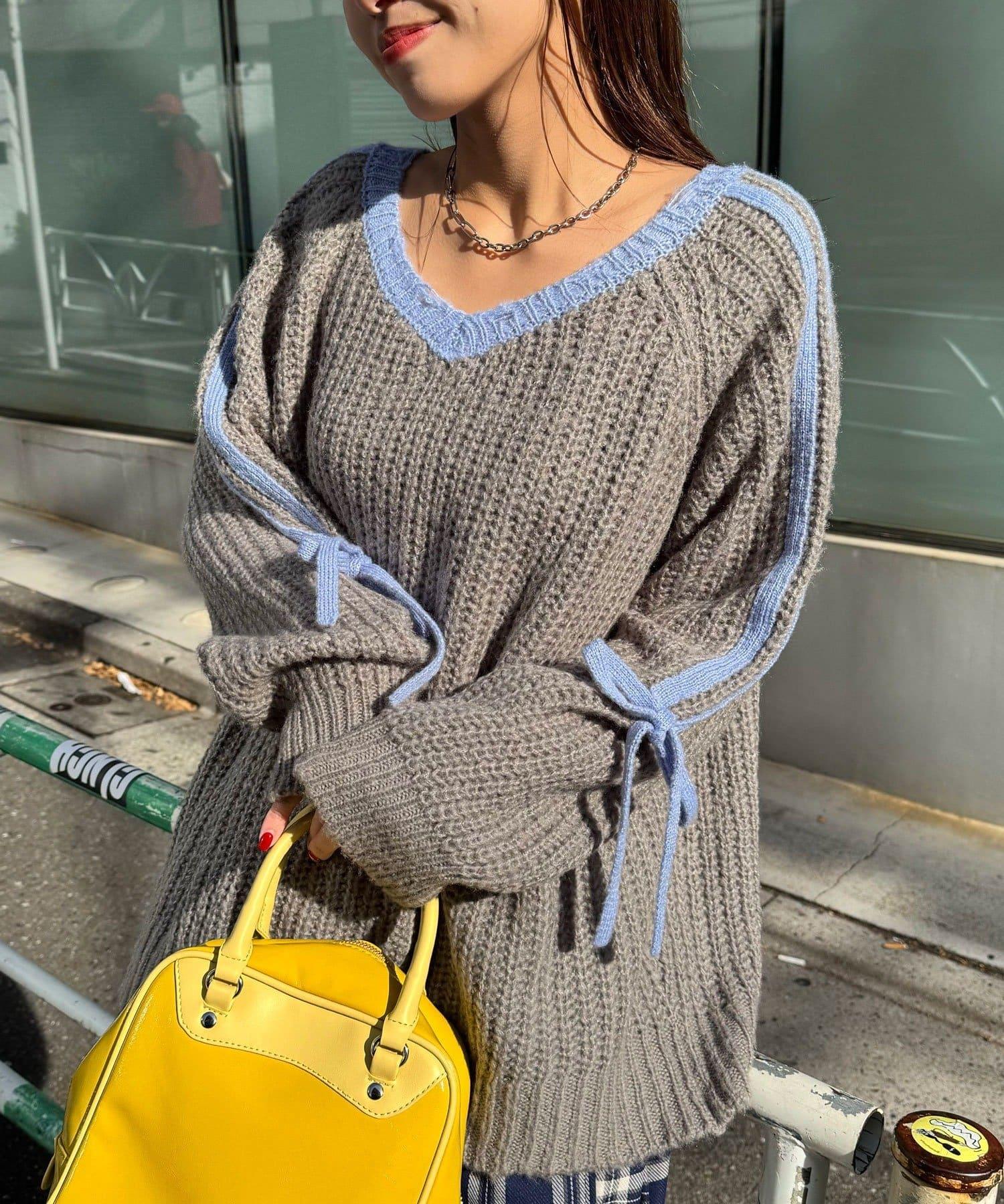 插肩式針織衫,袖子上有線條和絲帶細節。