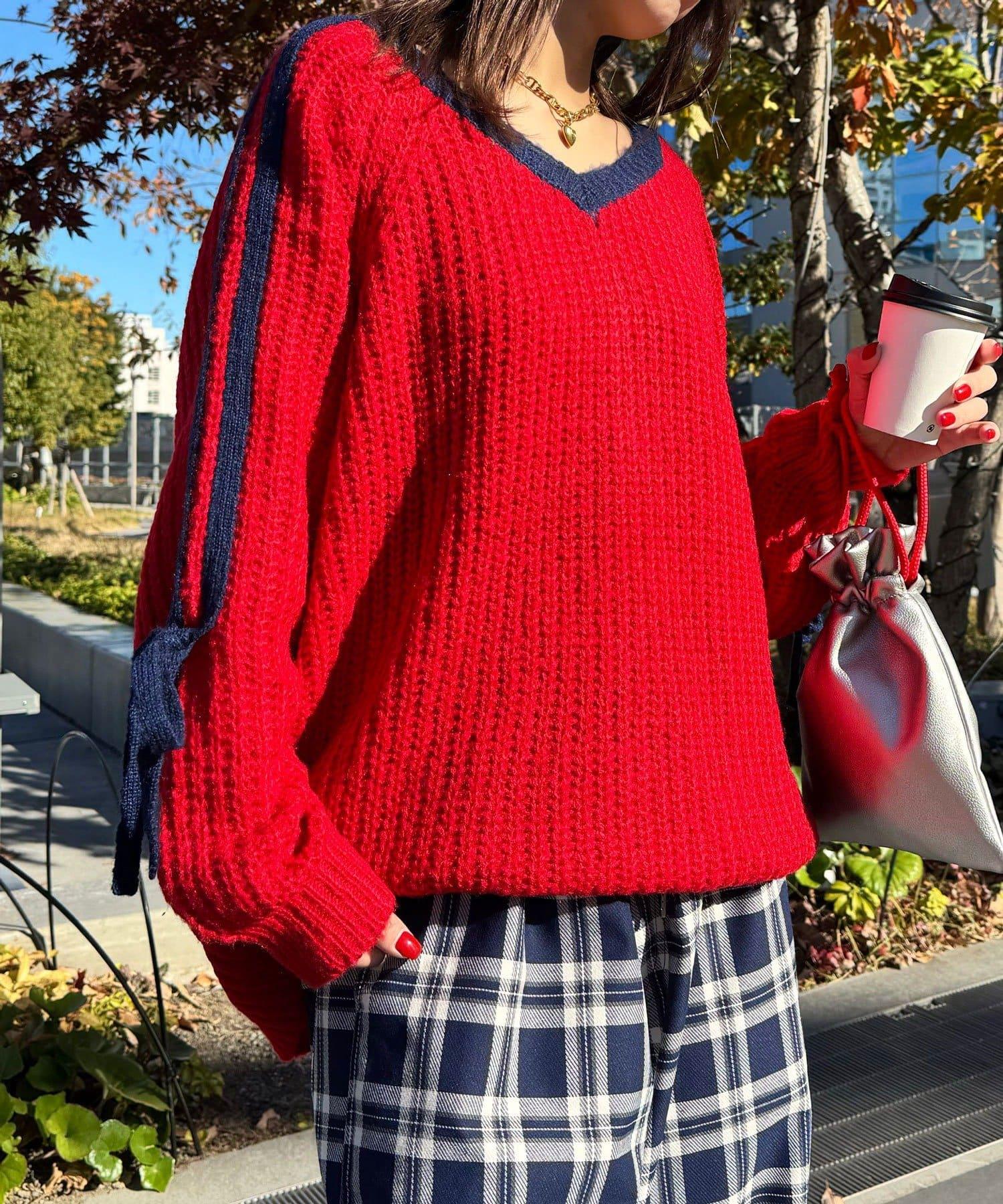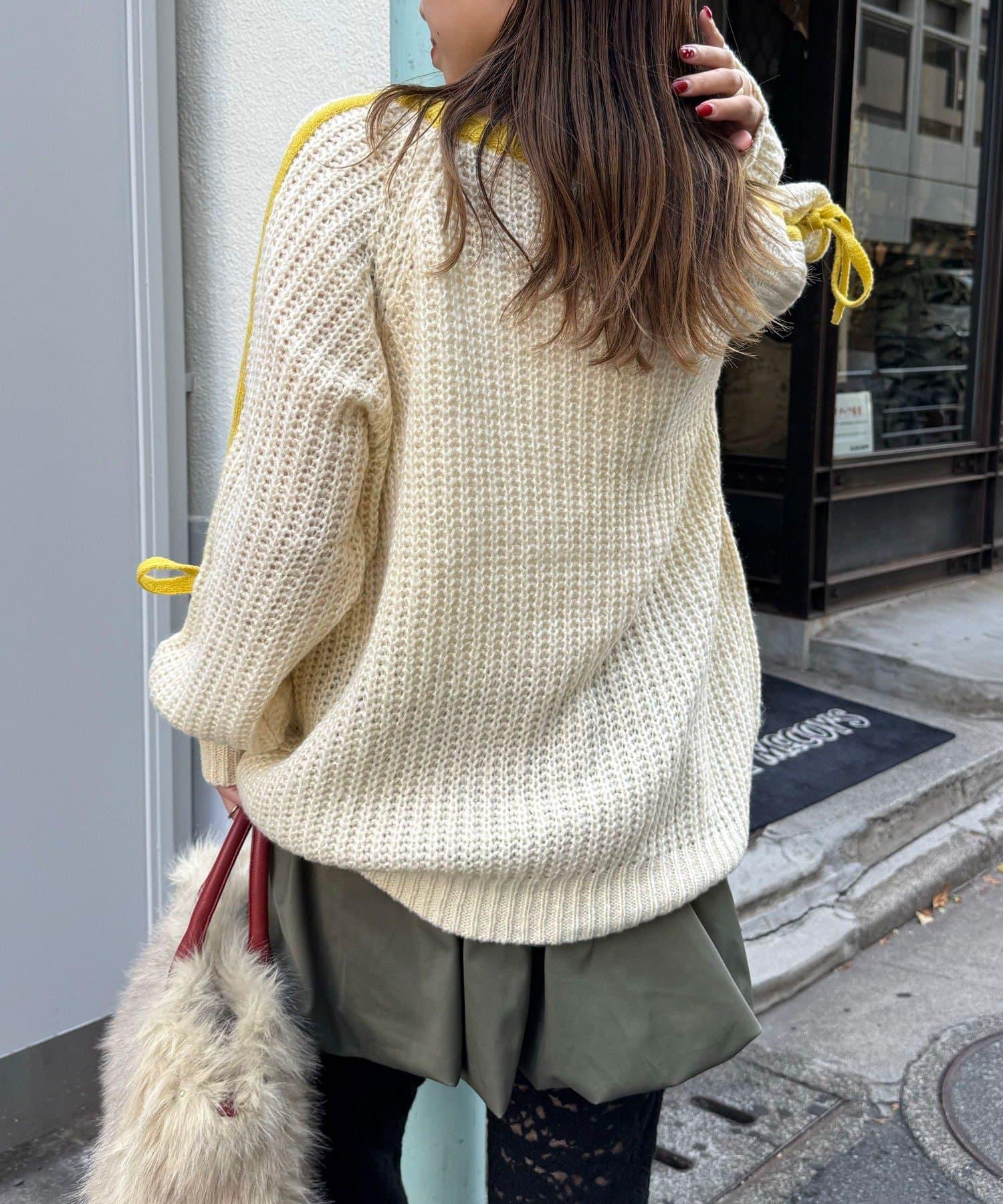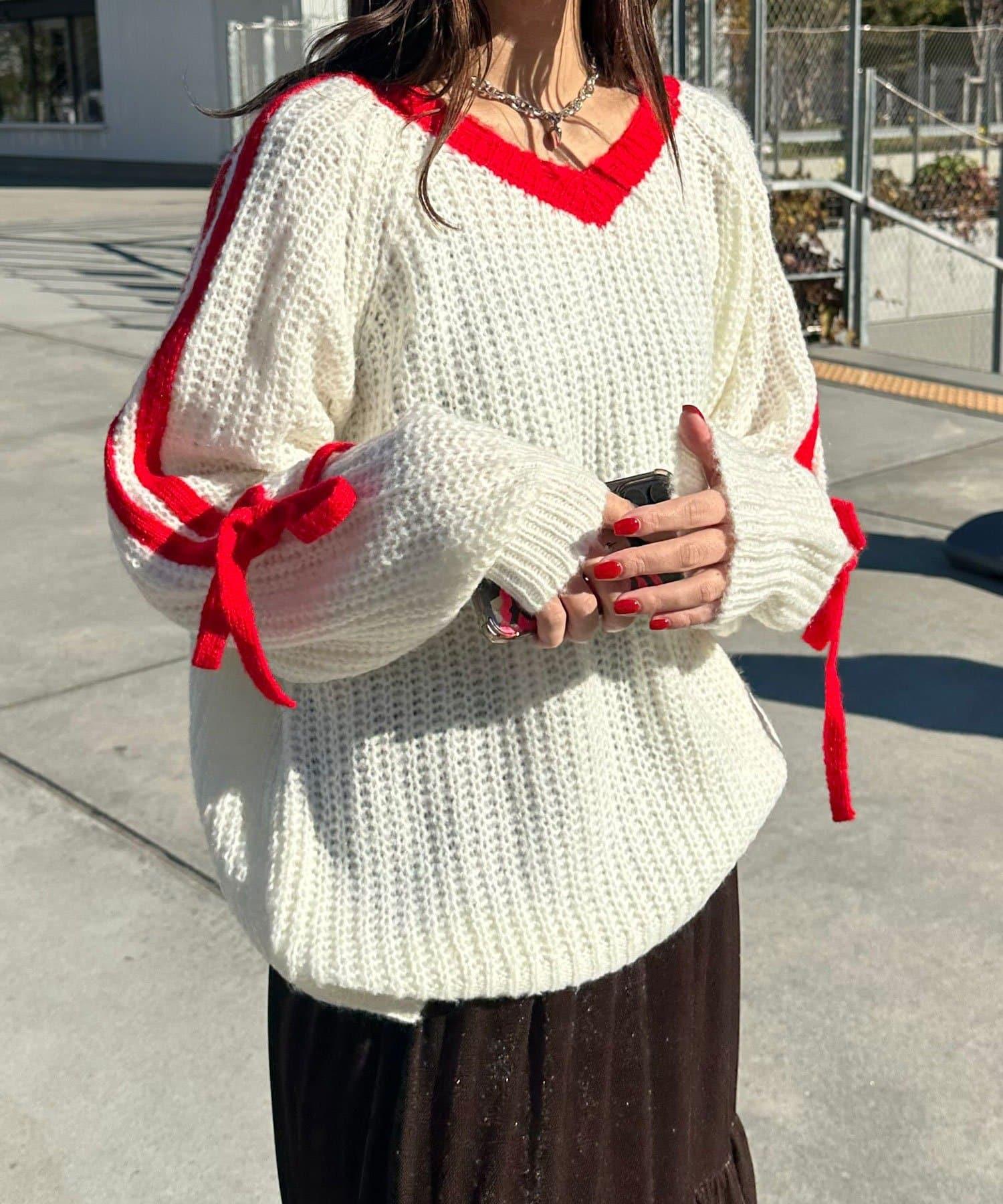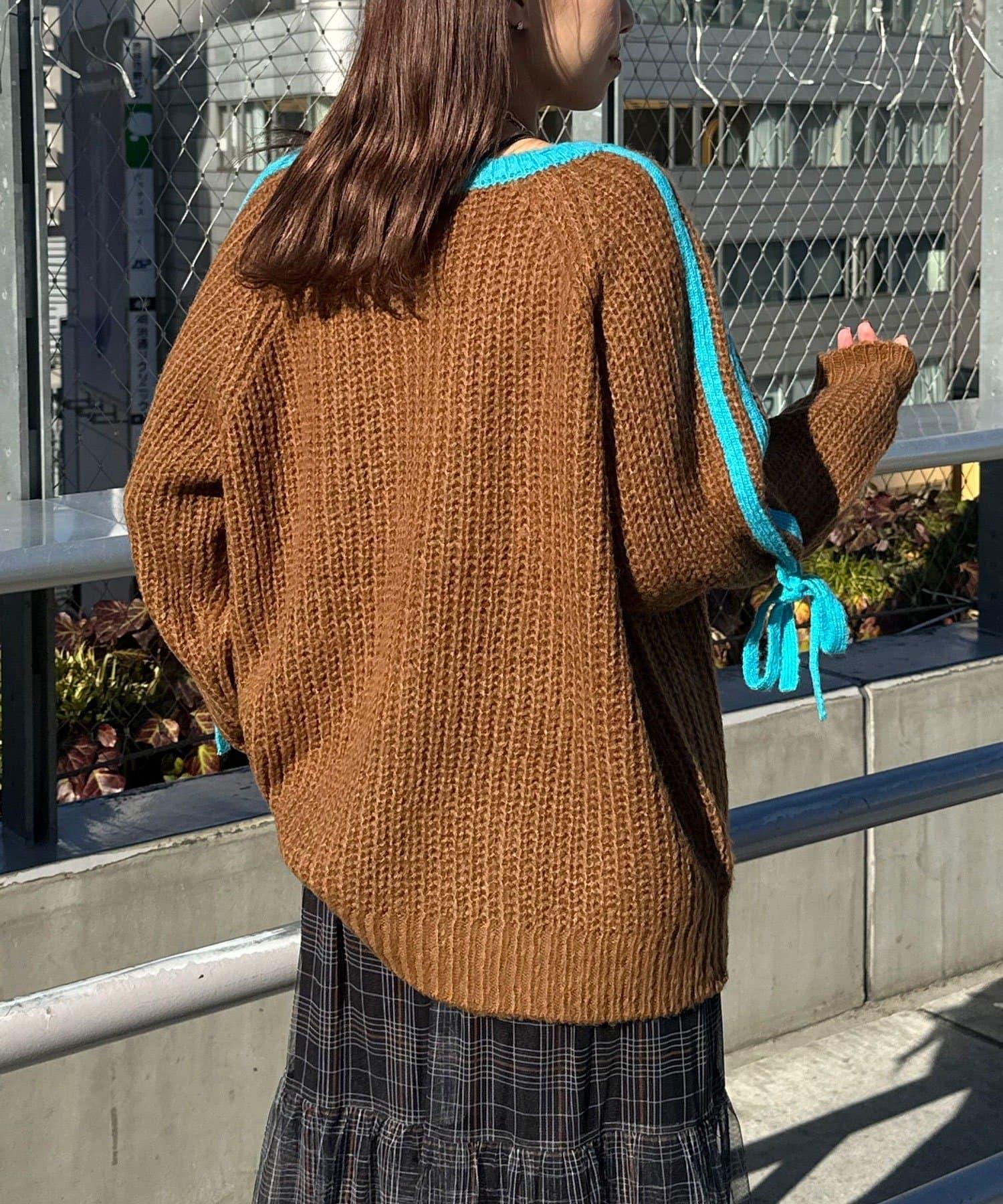 插肩式針織衫,袖子上有線條和絲帶細節。