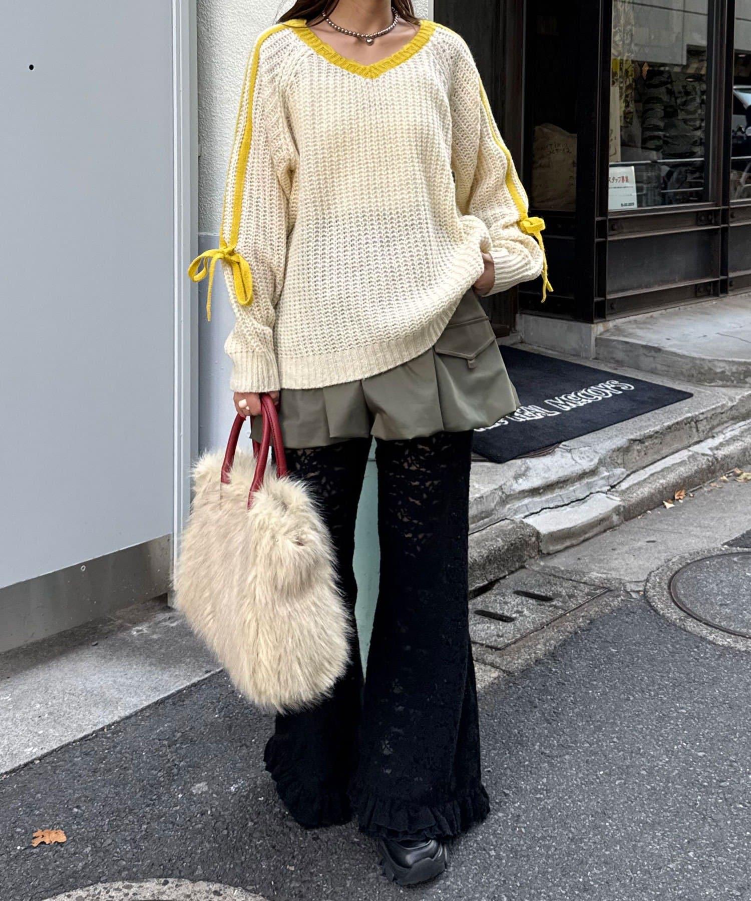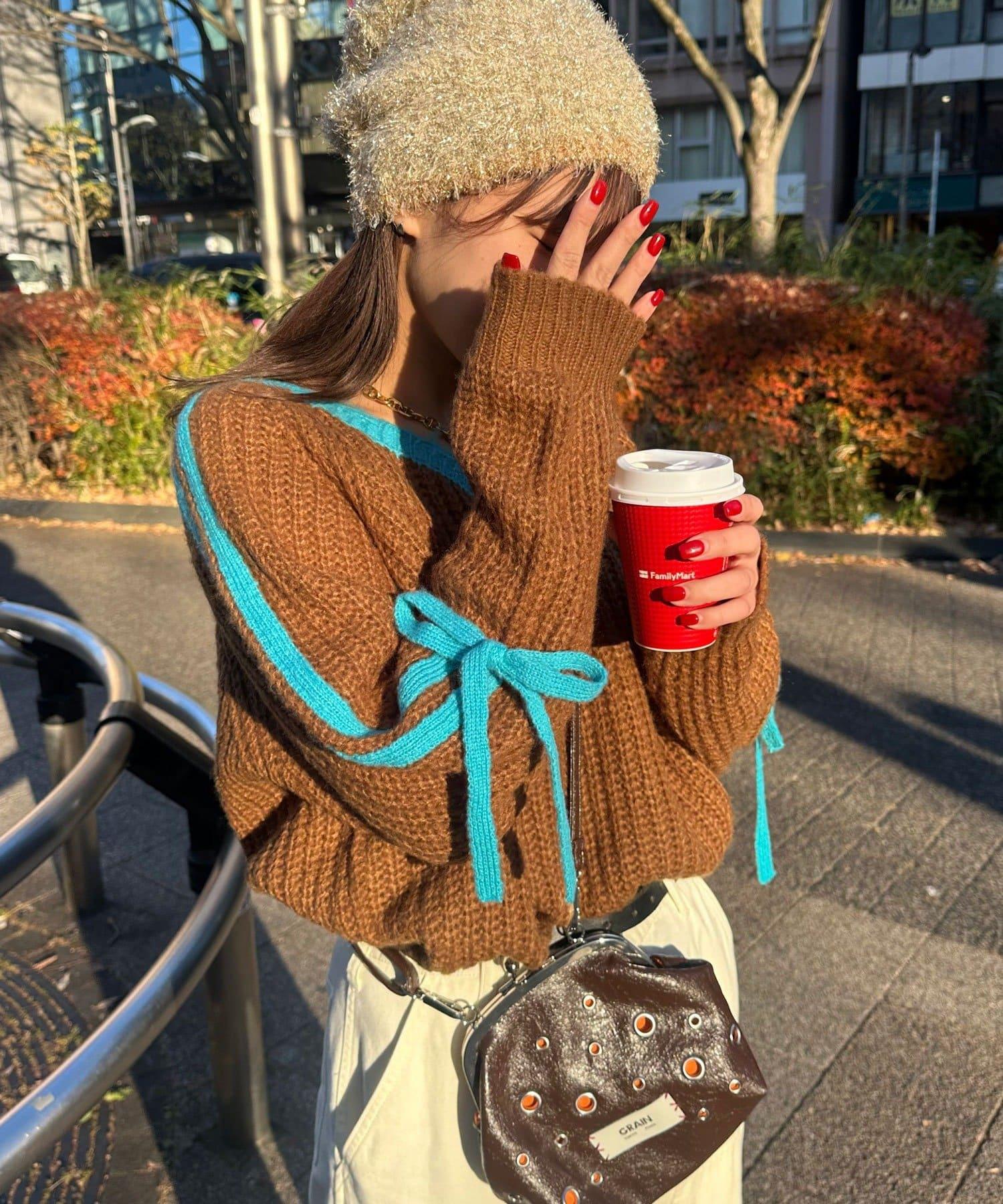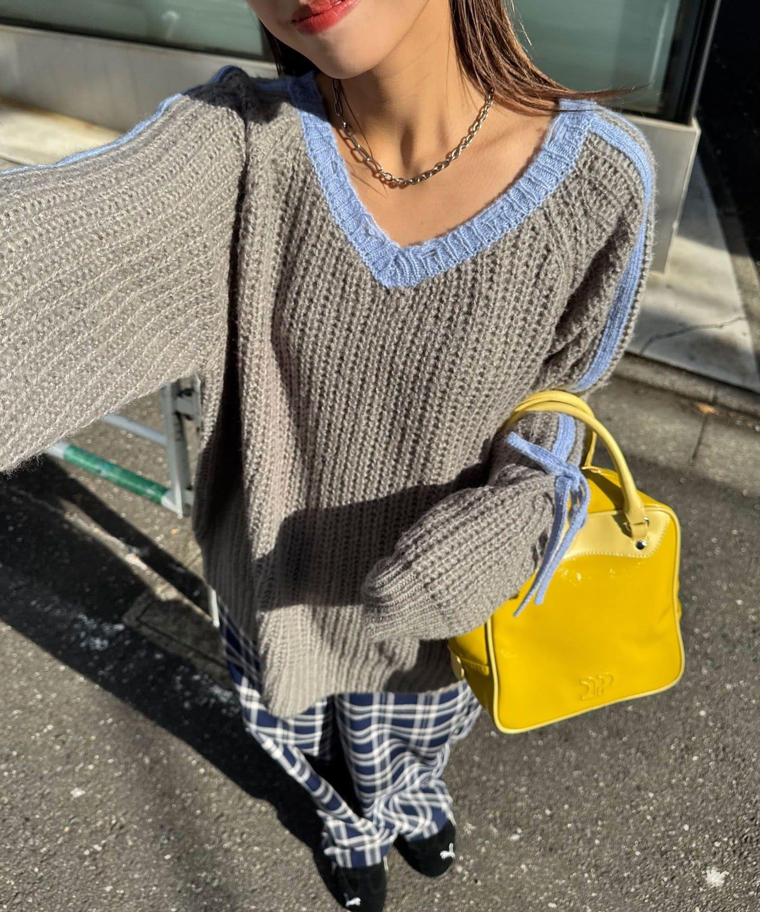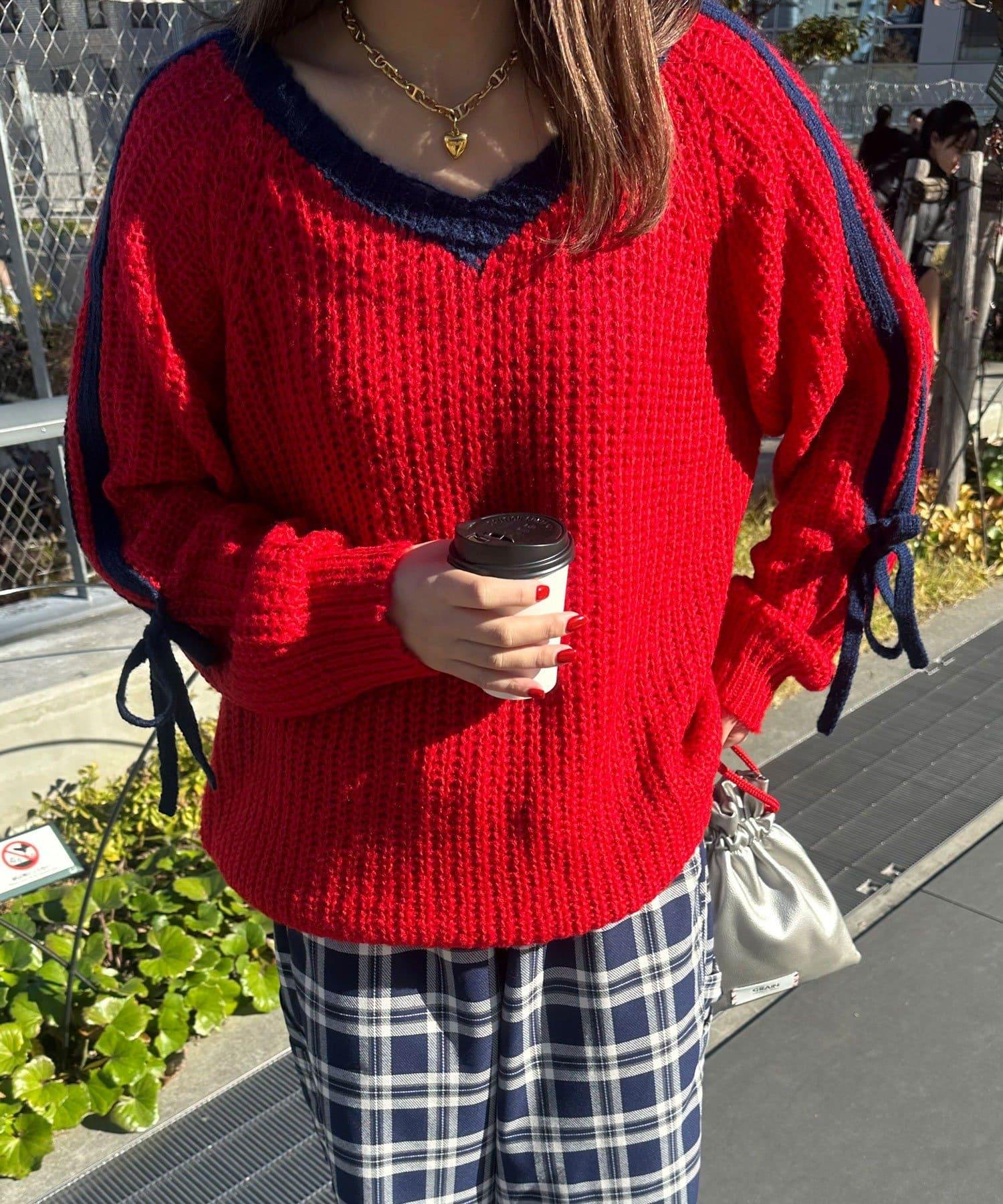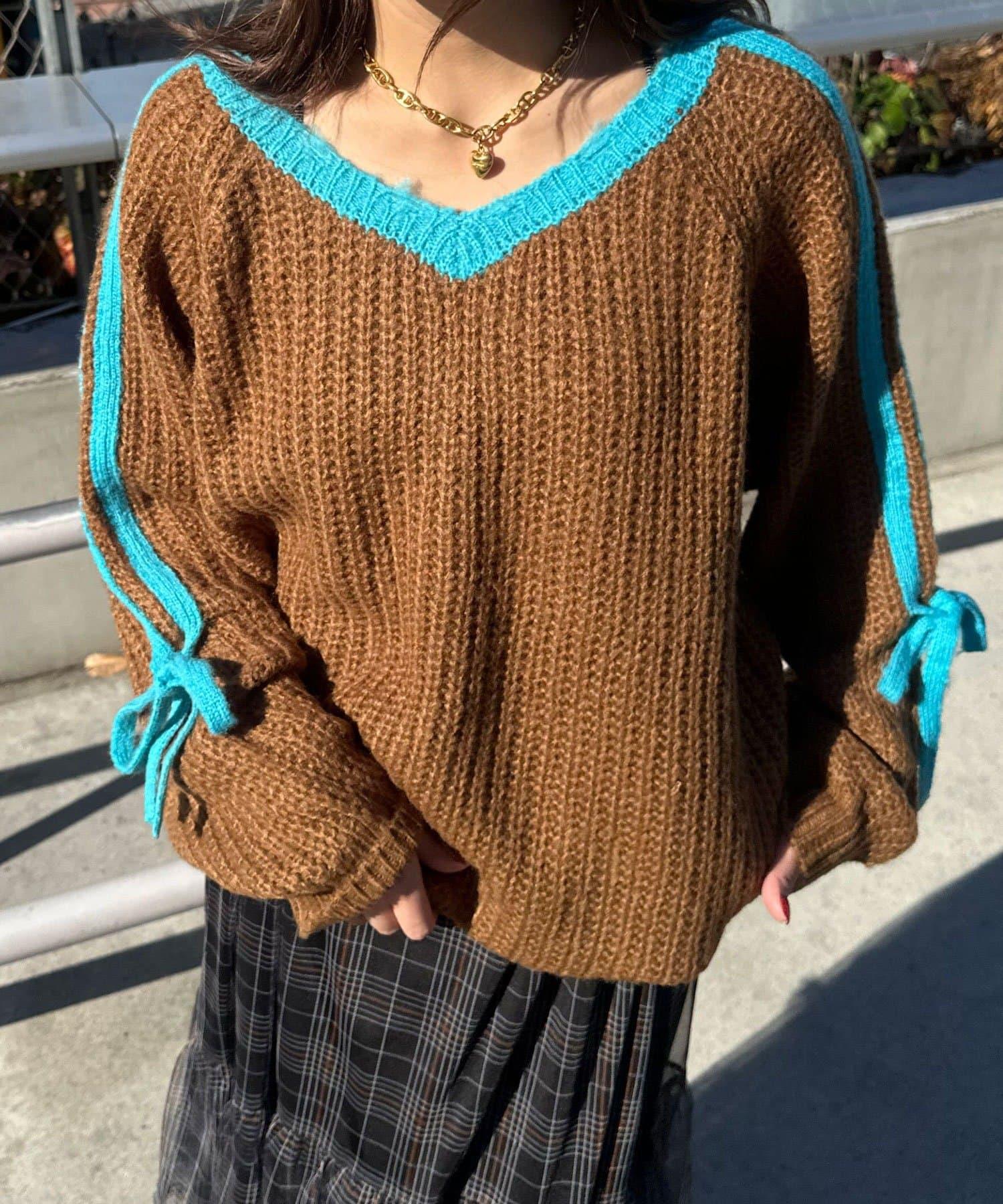 插肩式針織衫,袖子上有線條和絲帶細節。