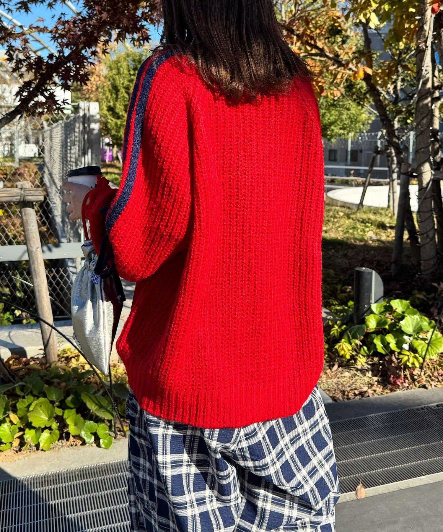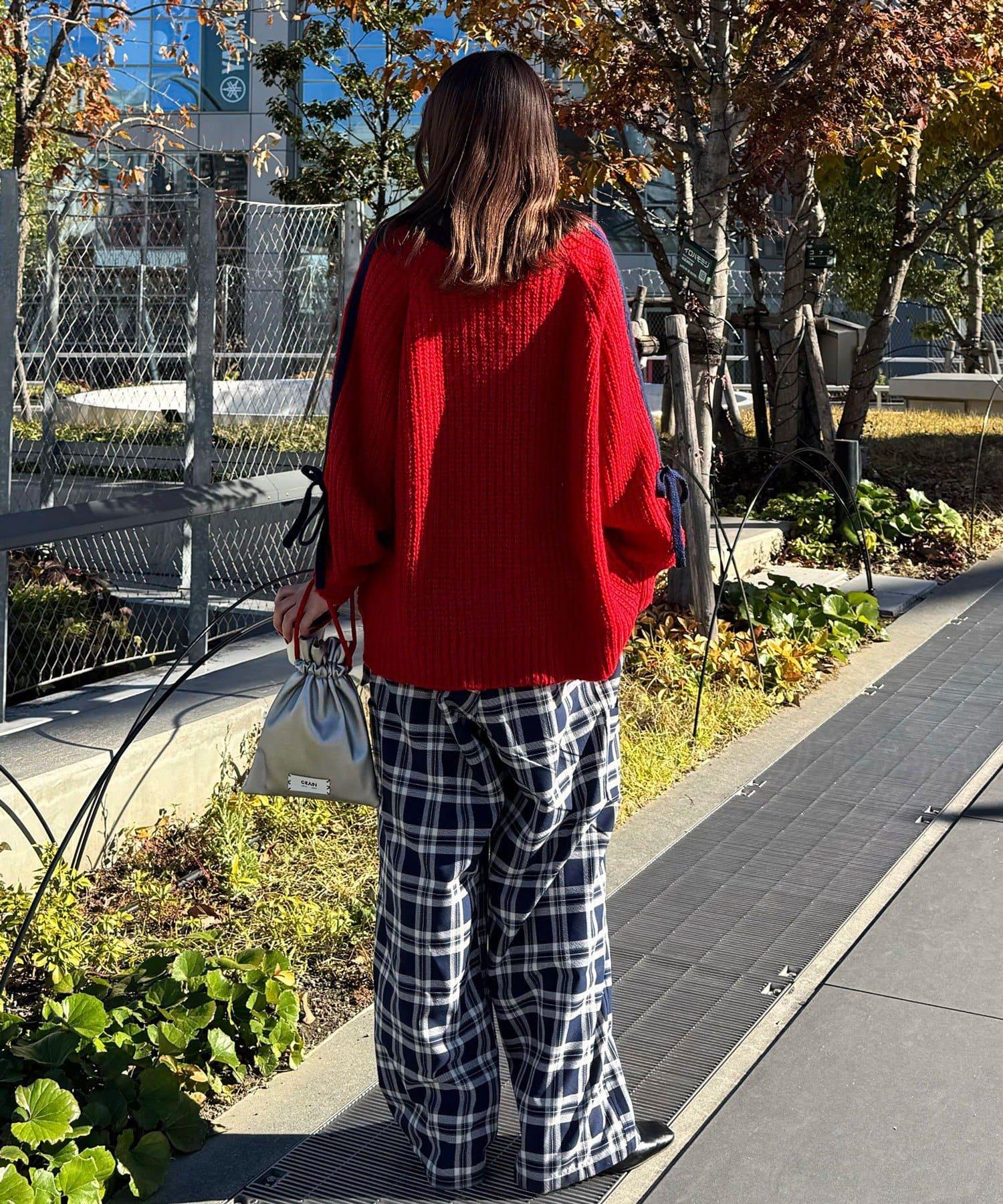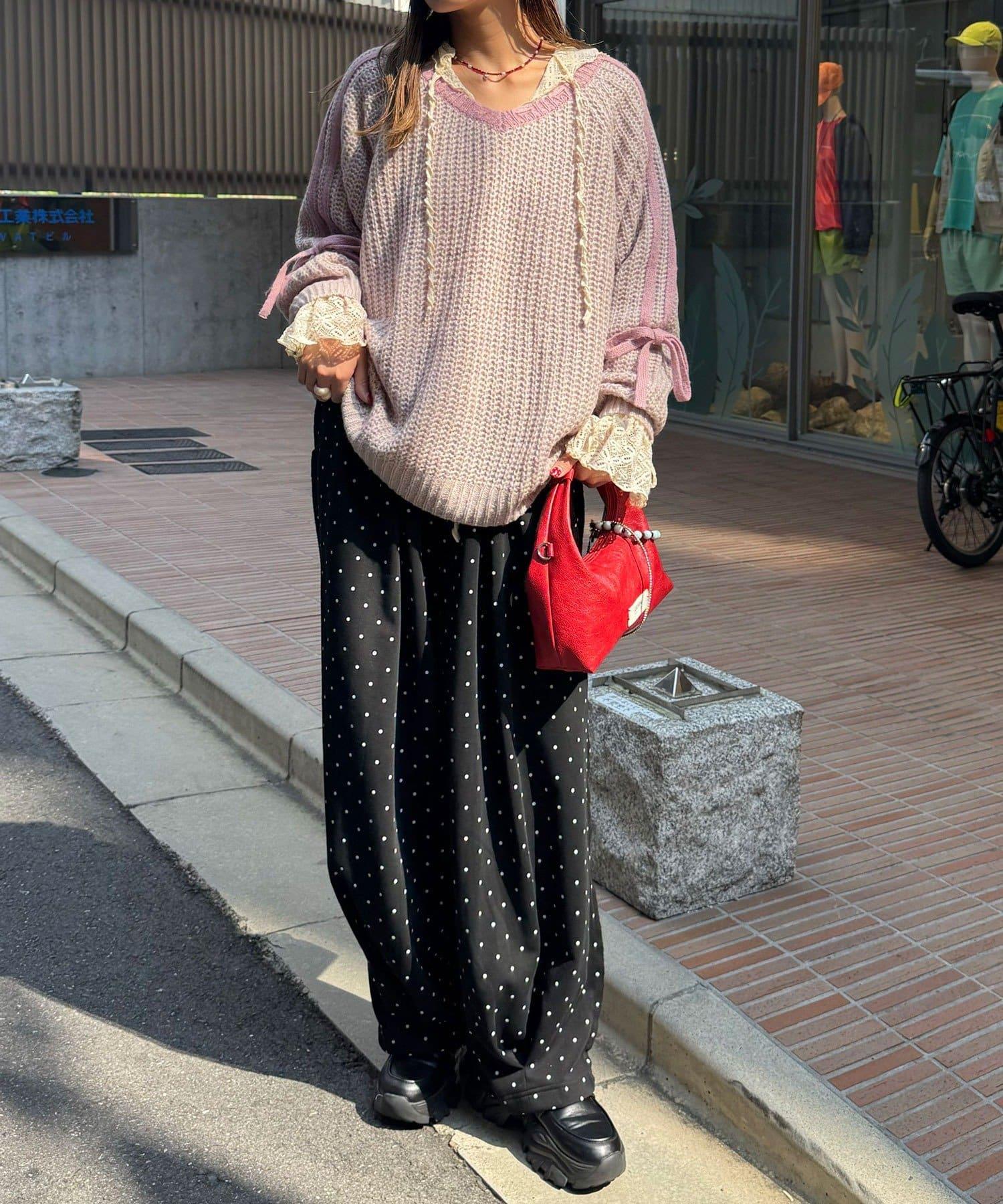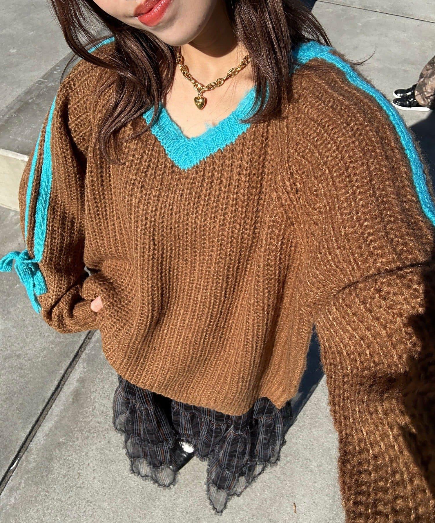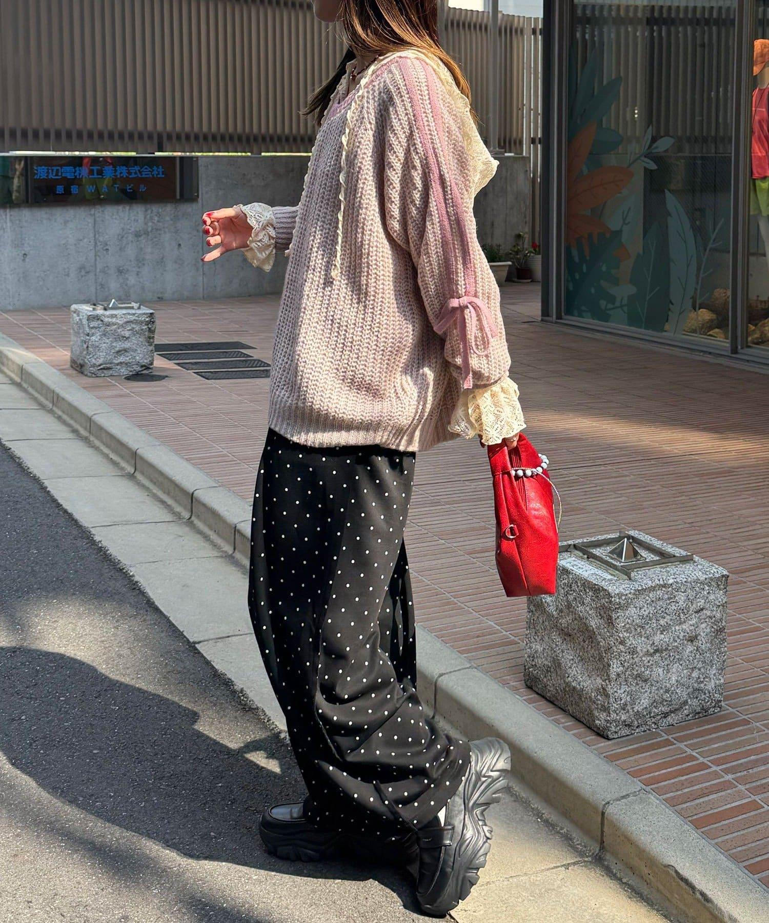 插肩式針織衫,袖子上有線條和絲帶細節。