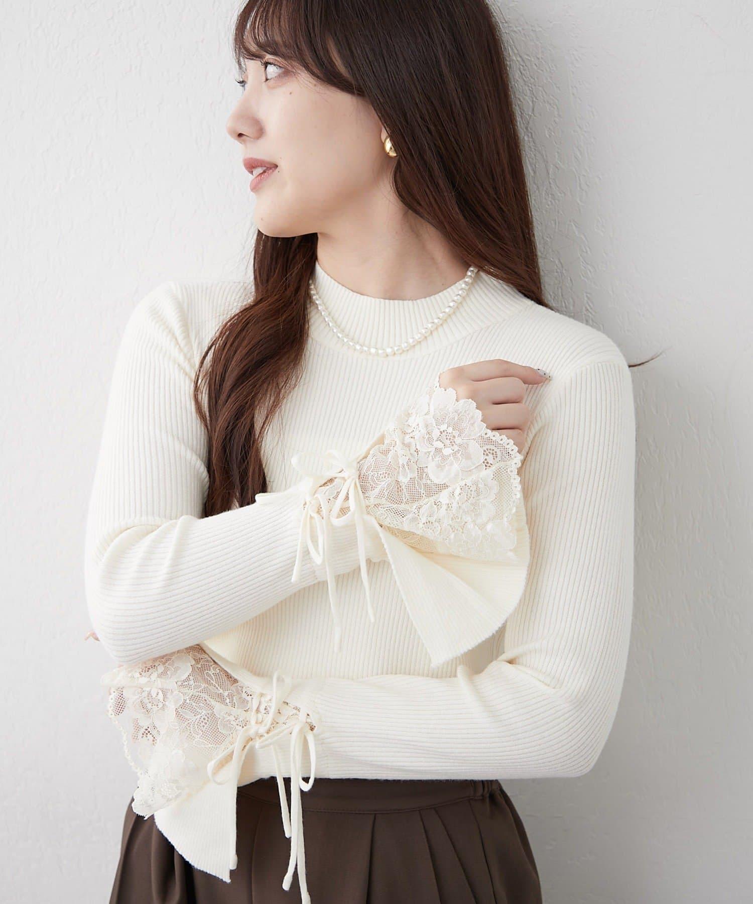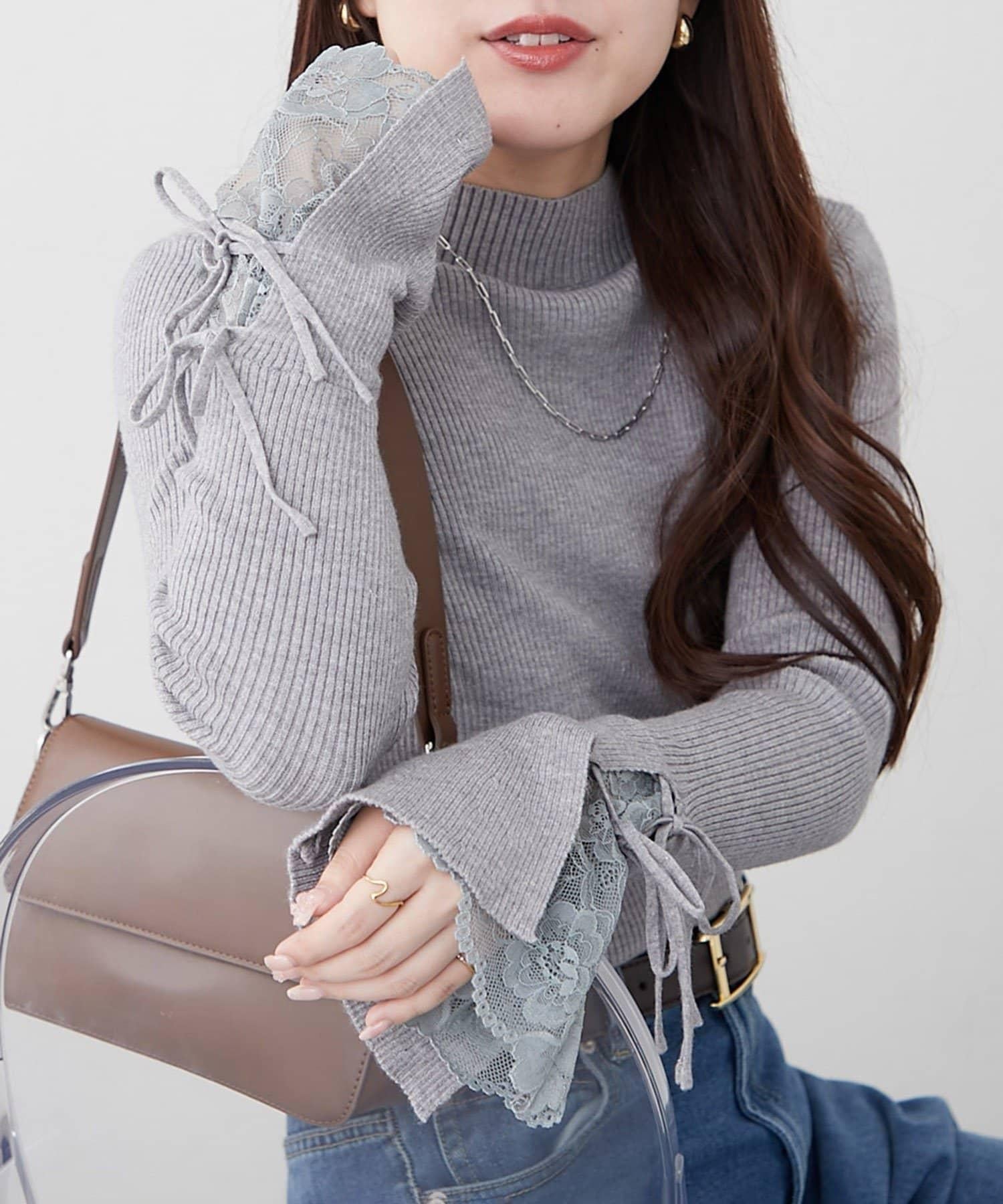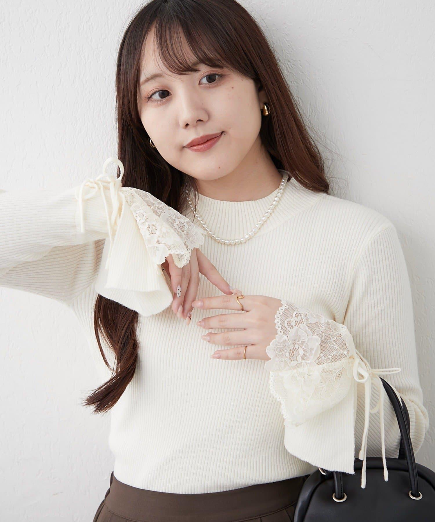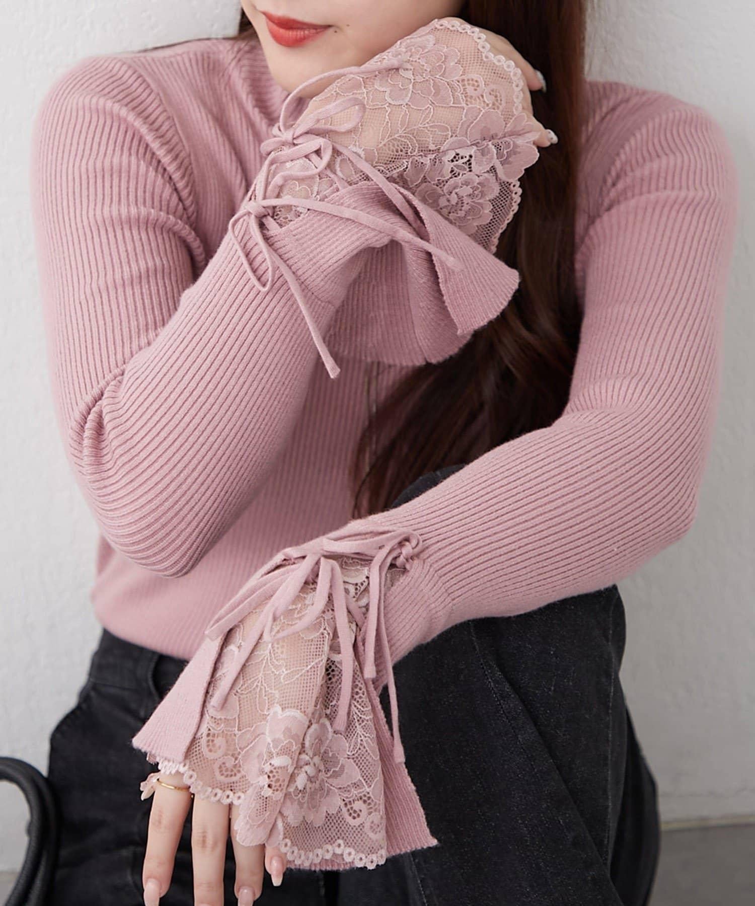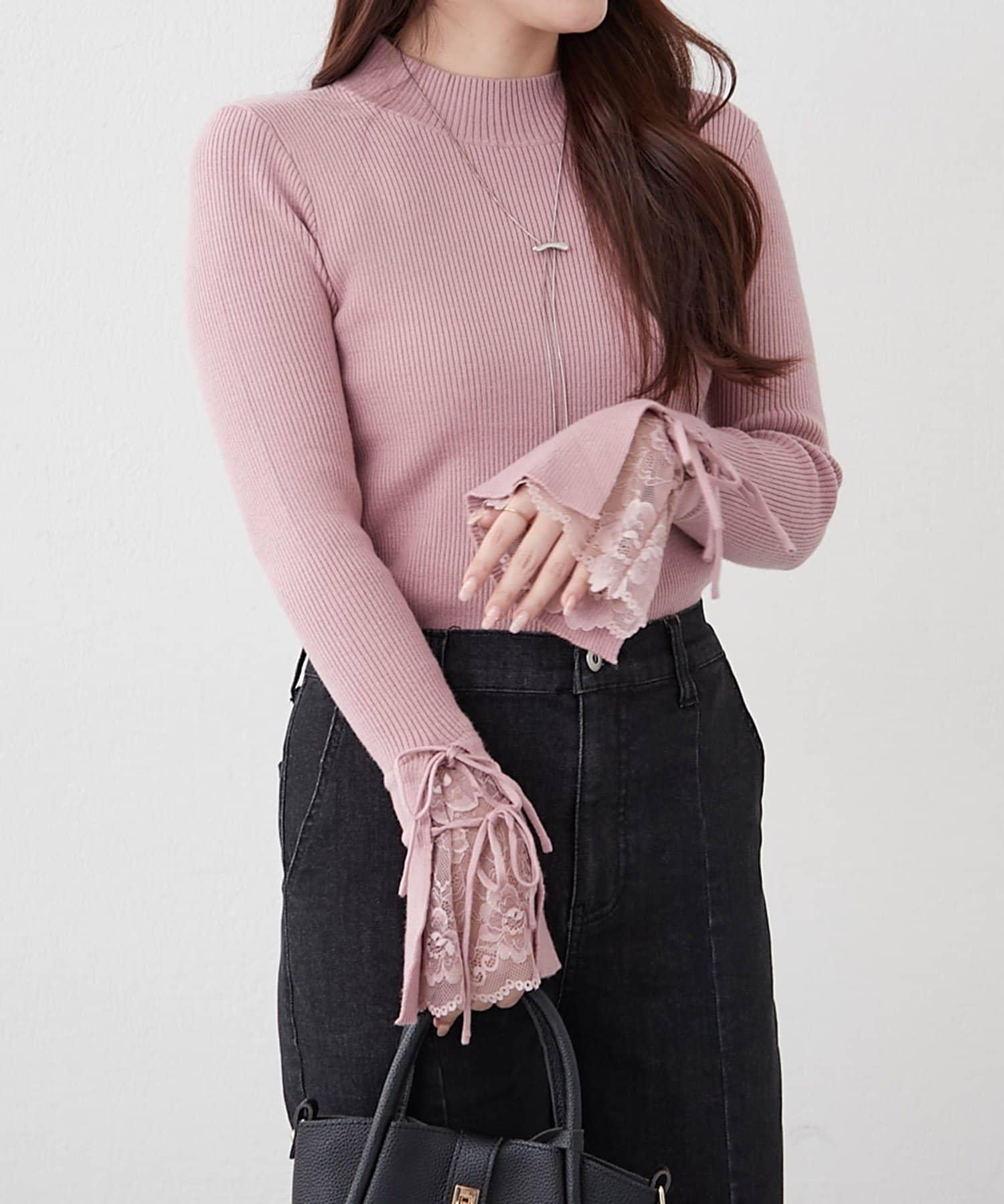 這款針織上衣的袖子上有可愛的蕾絲和絲帶。