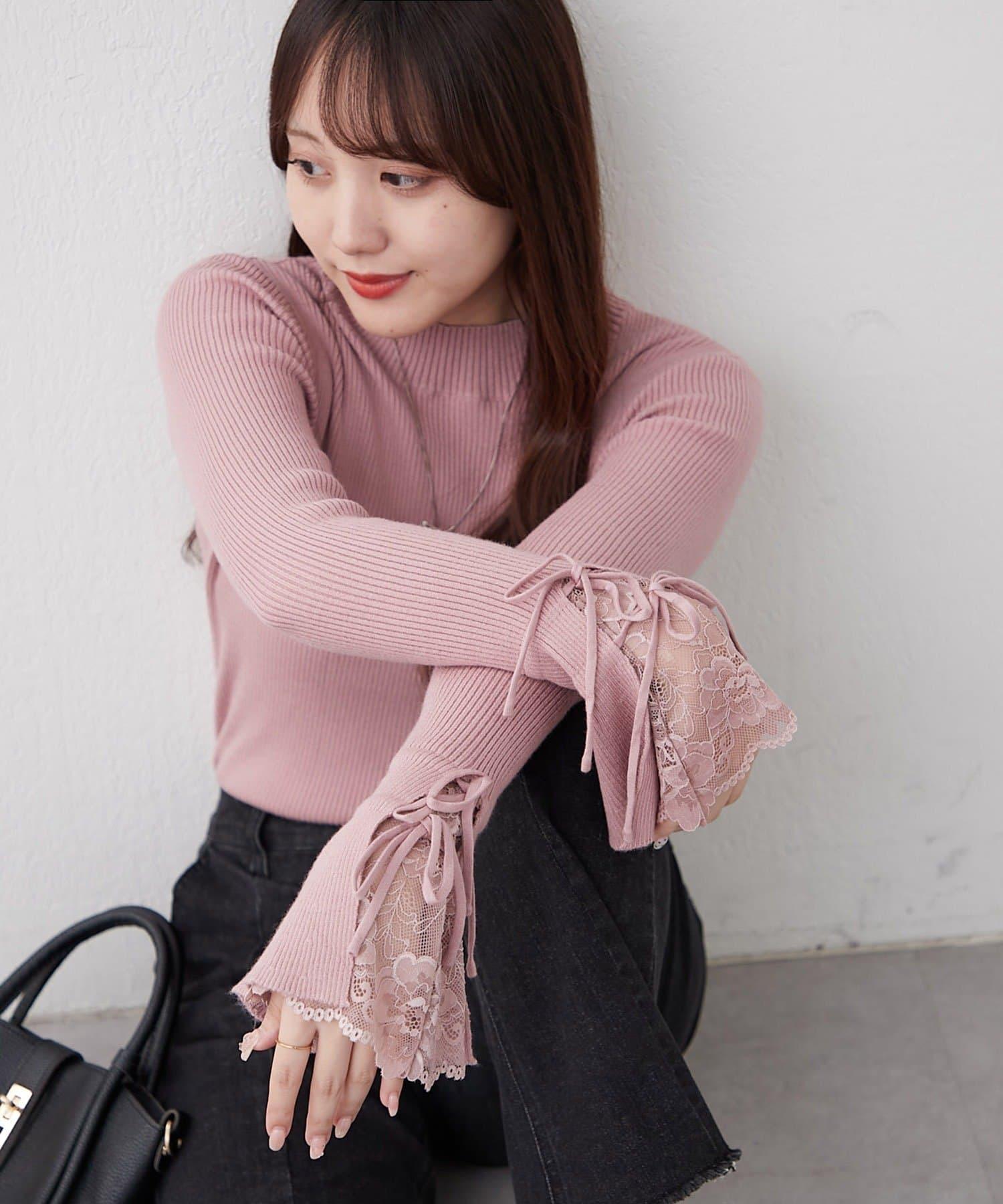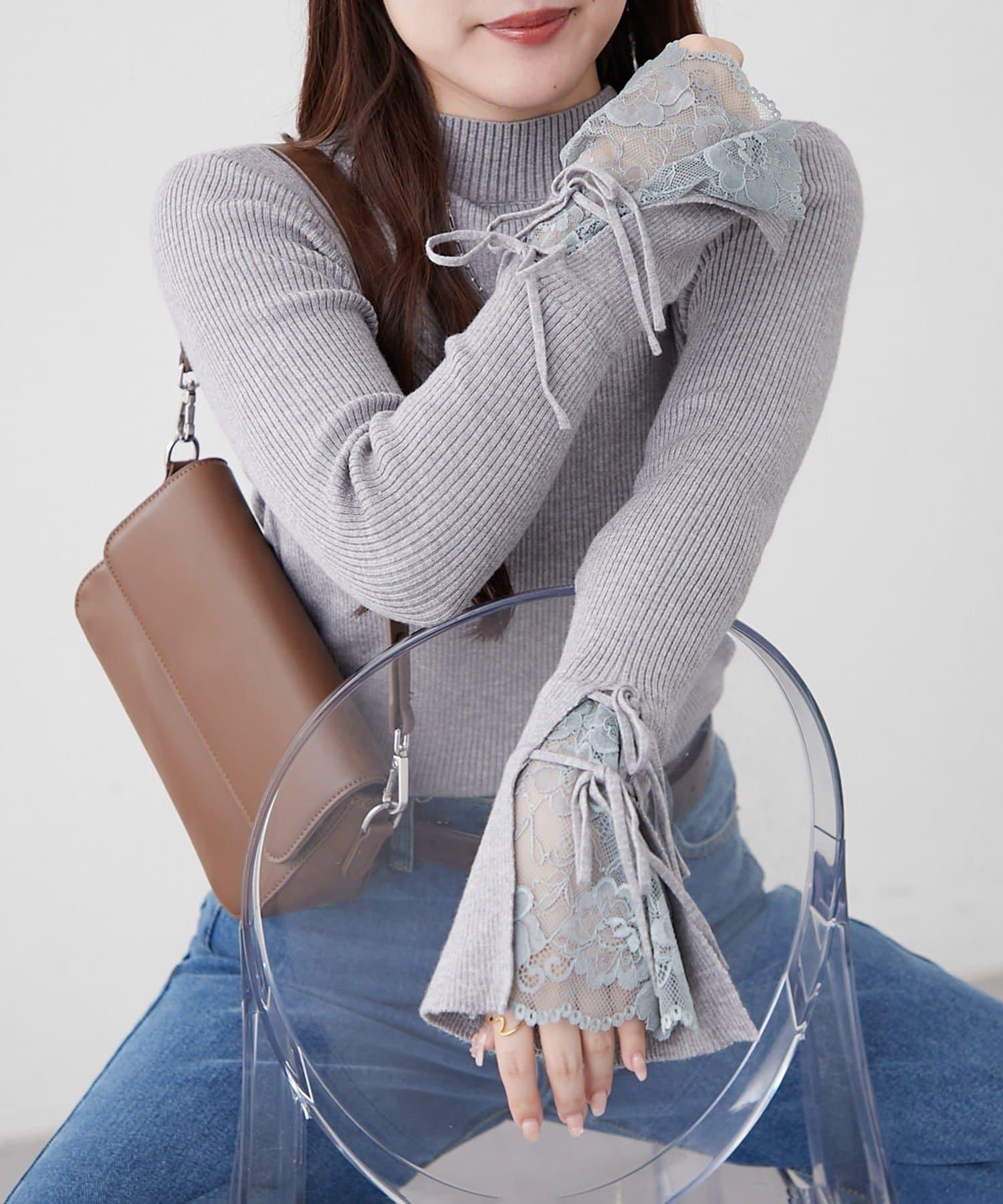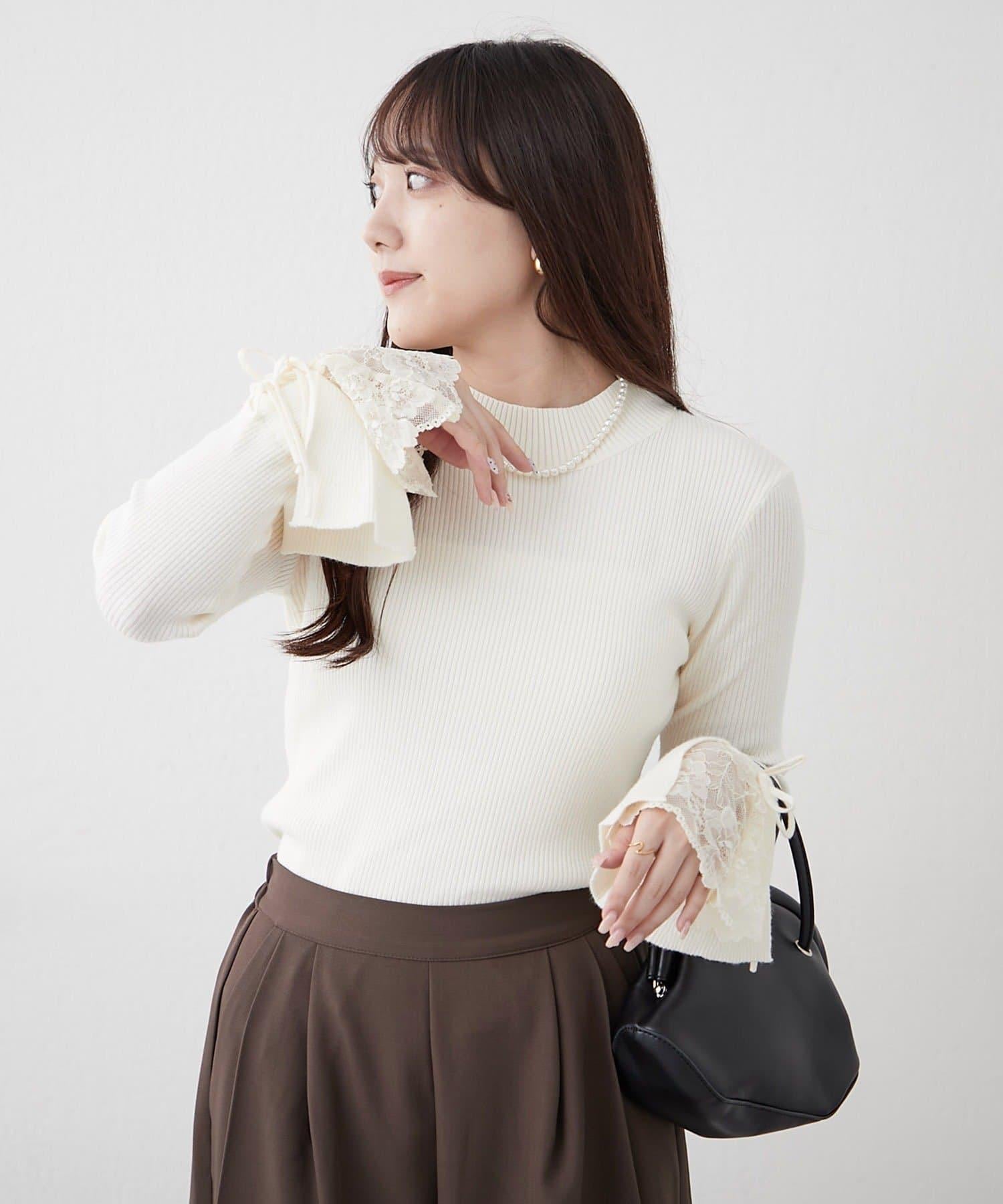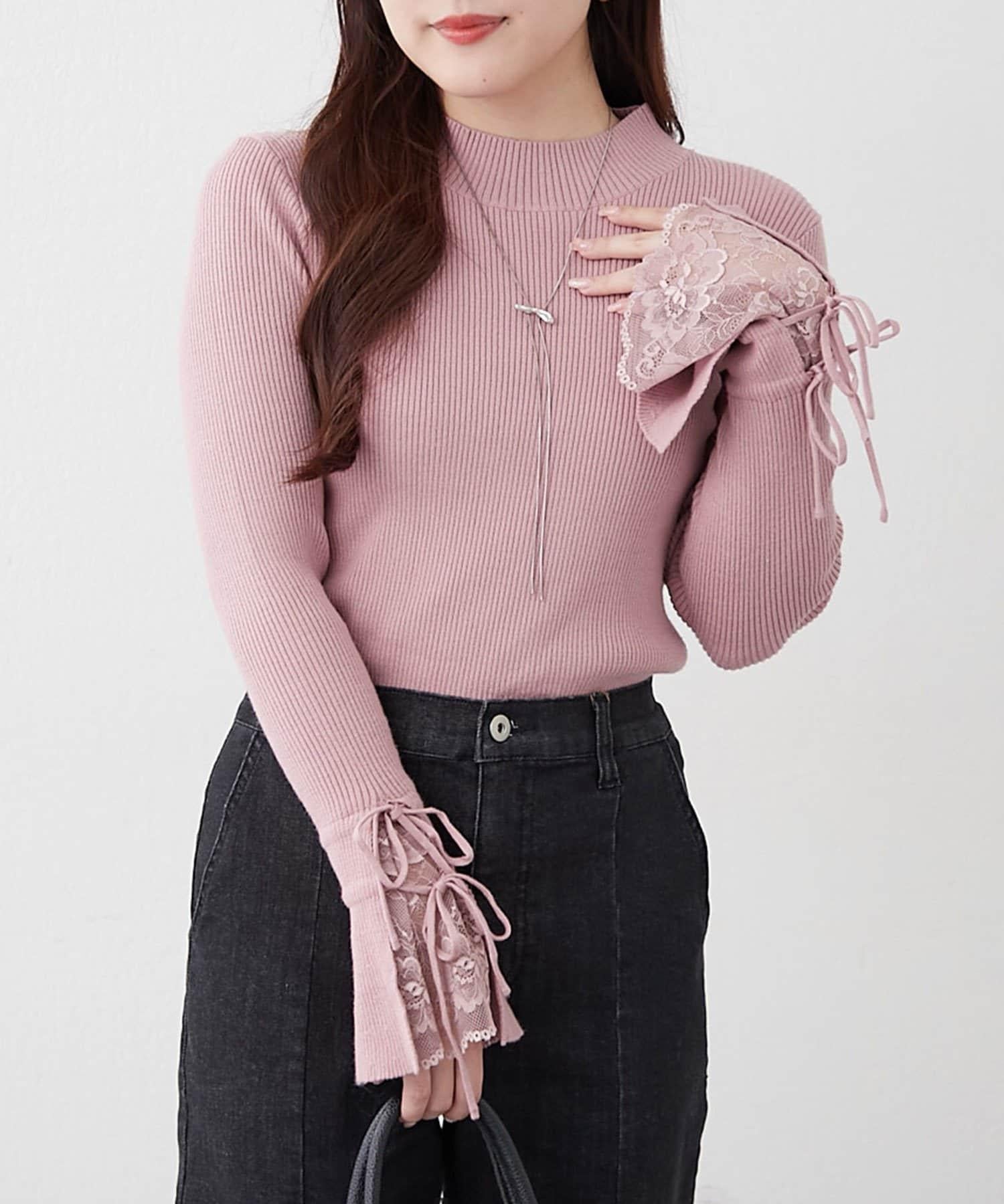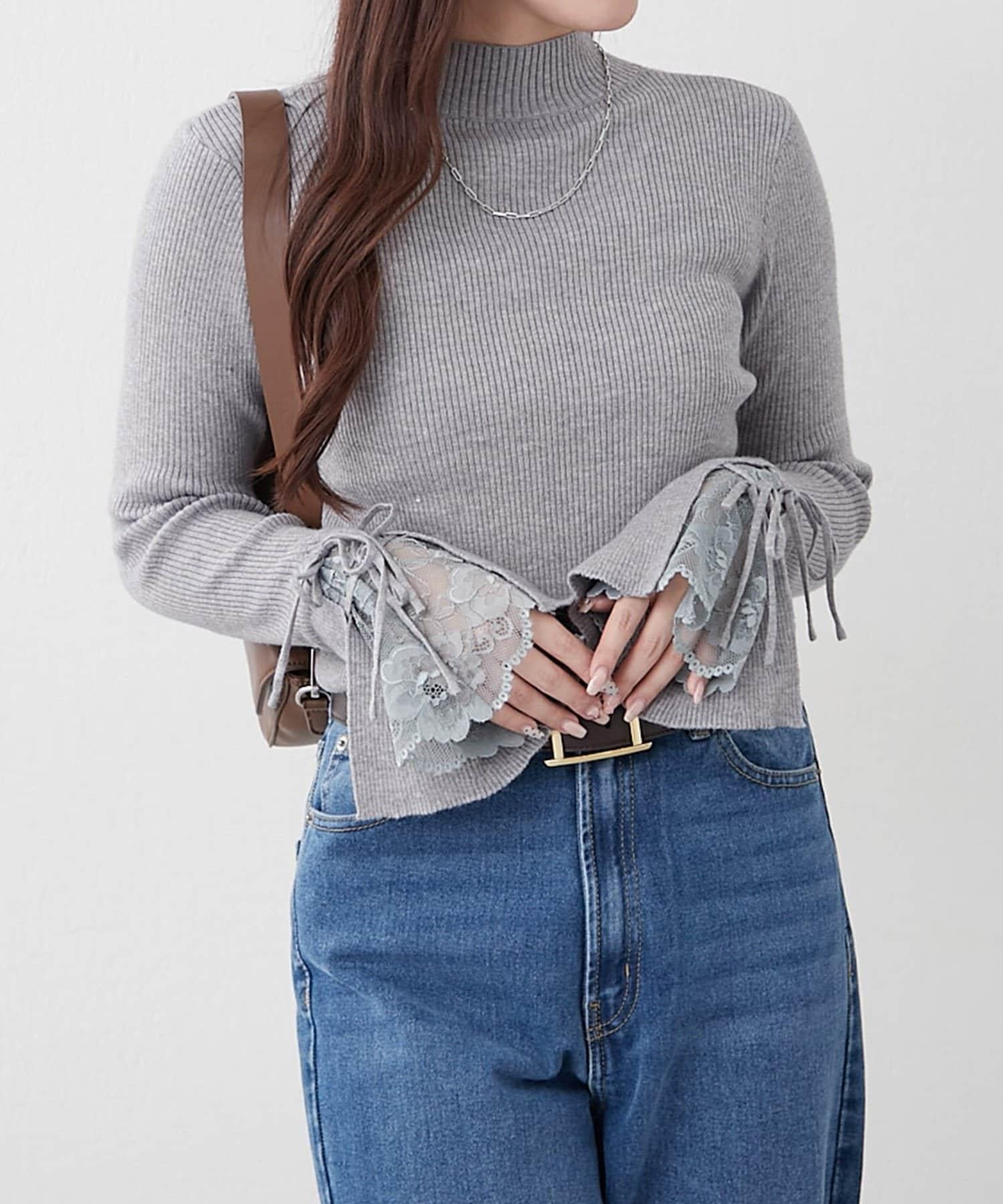 這款針織上衣的袖子上有可愛的蕾絲和絲帶。