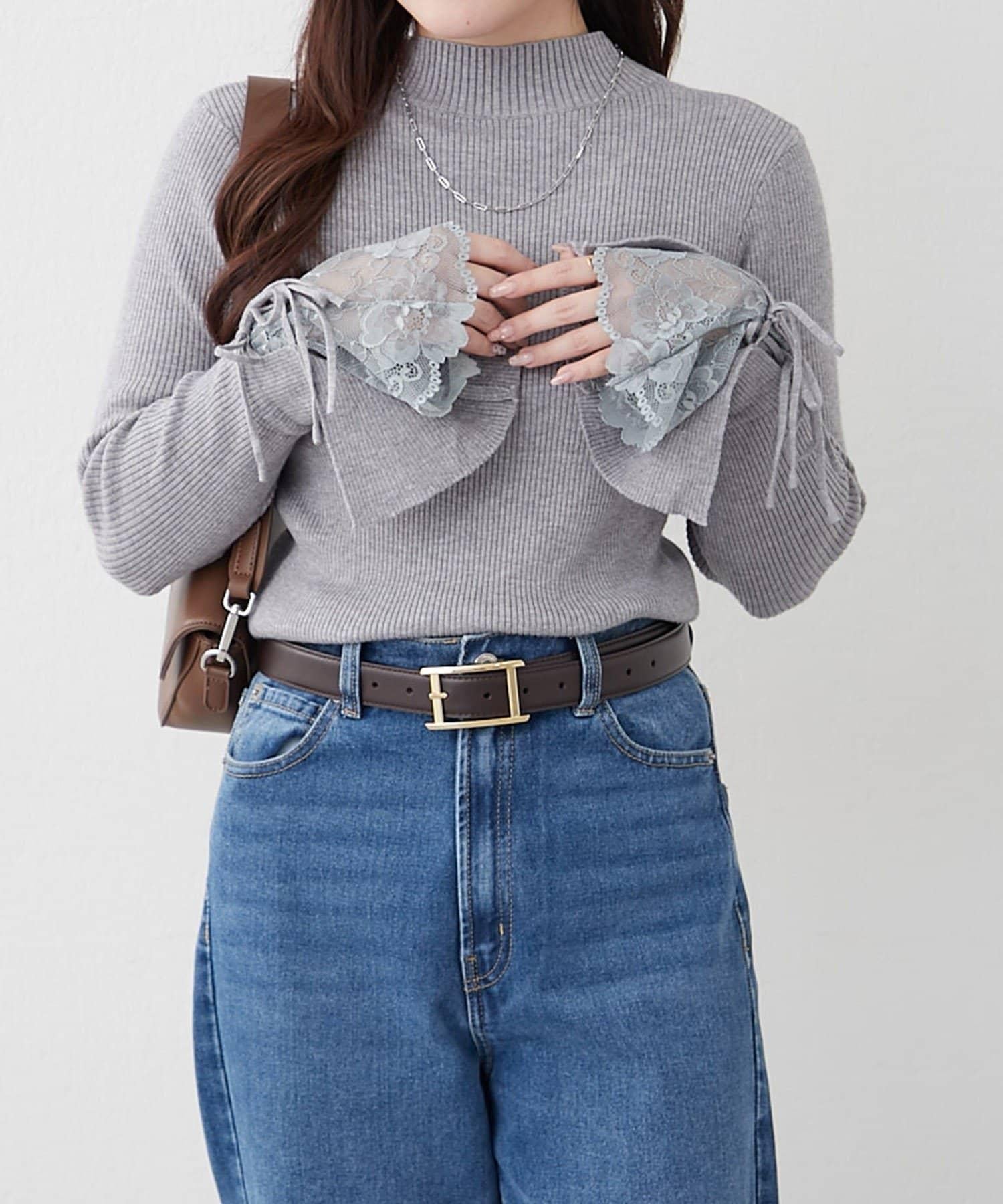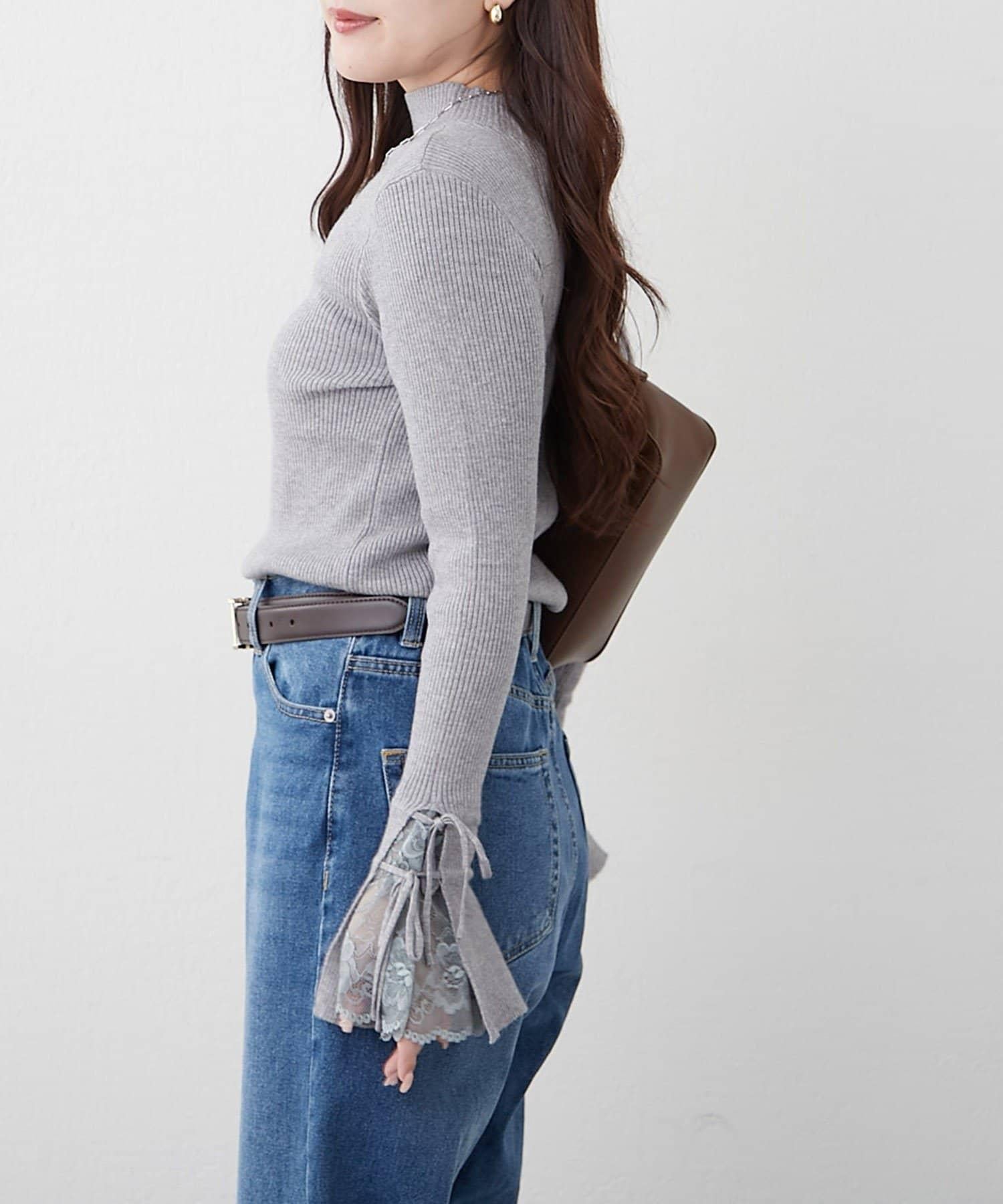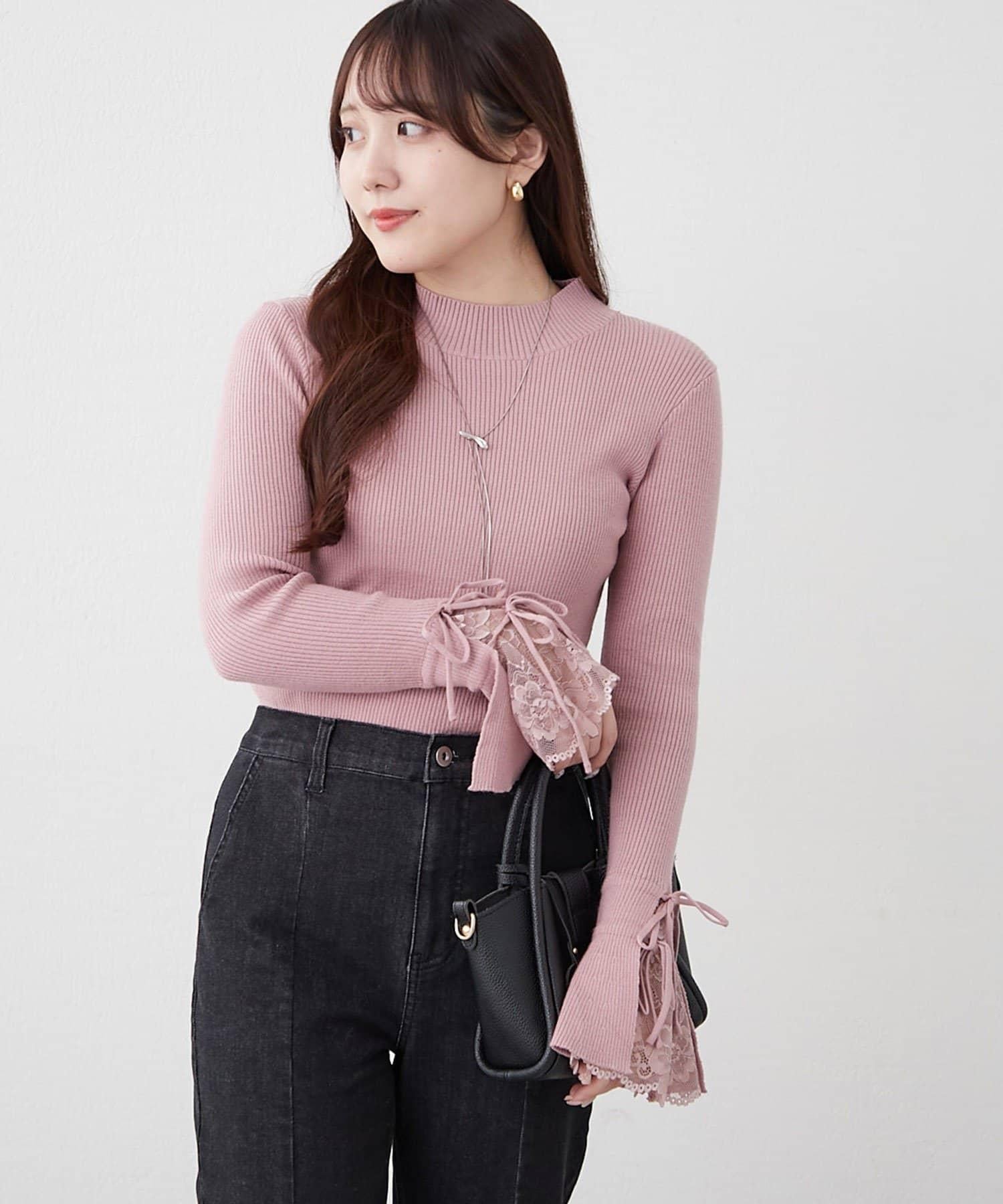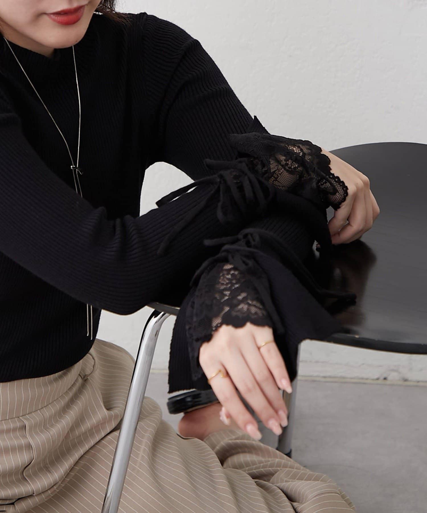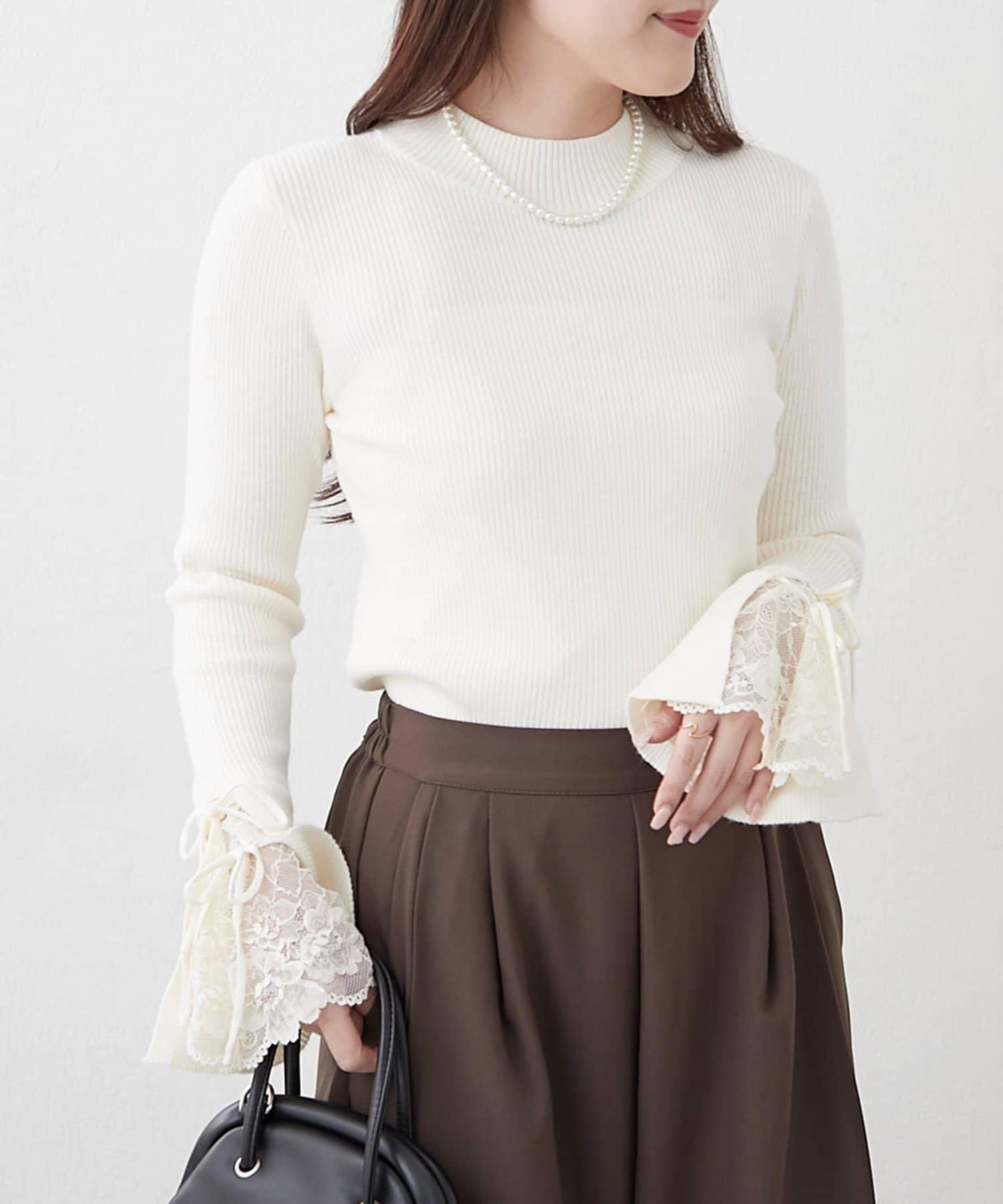 這款針織上衣的袖子上有可愛的蕾絲和絲帶。
