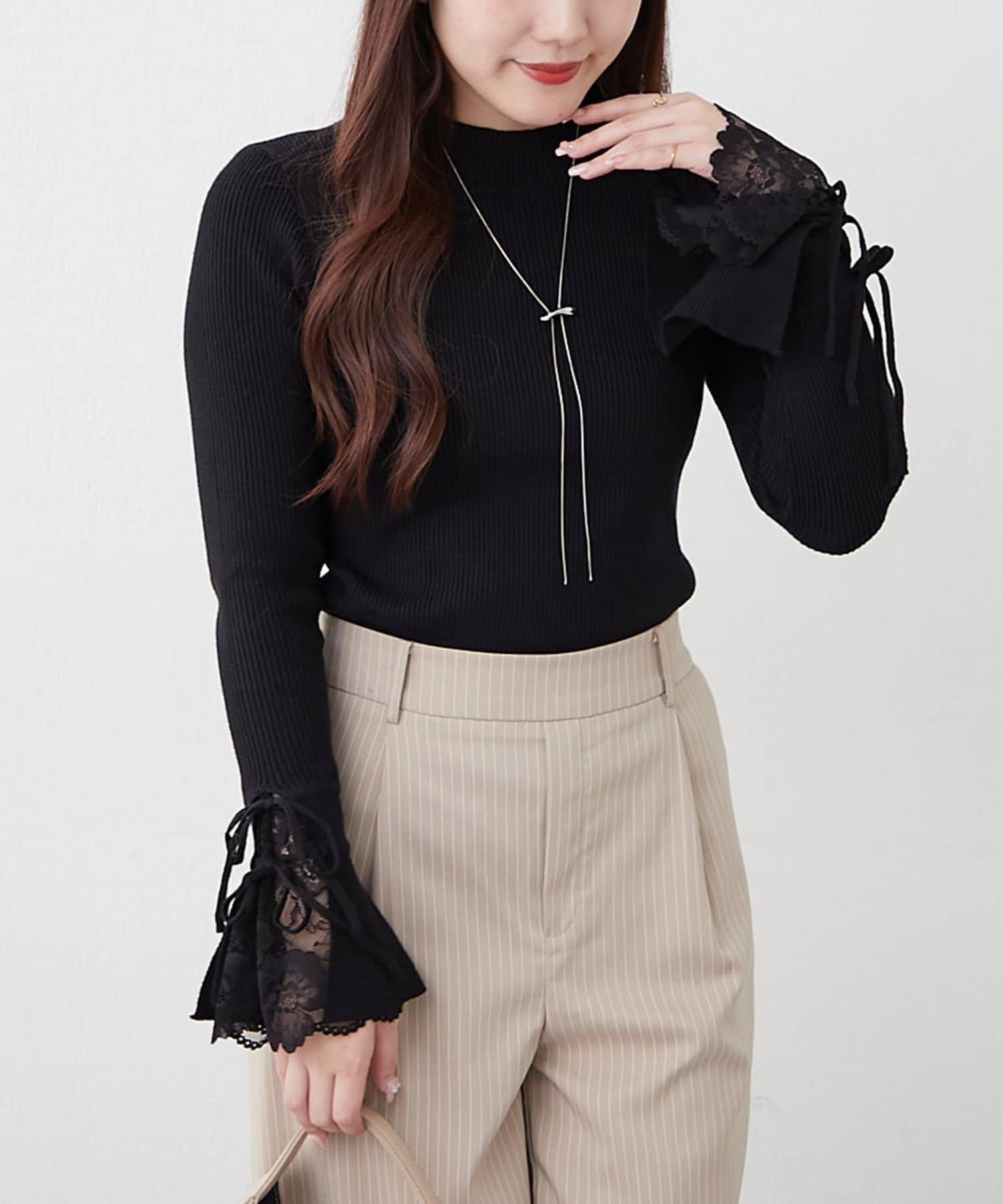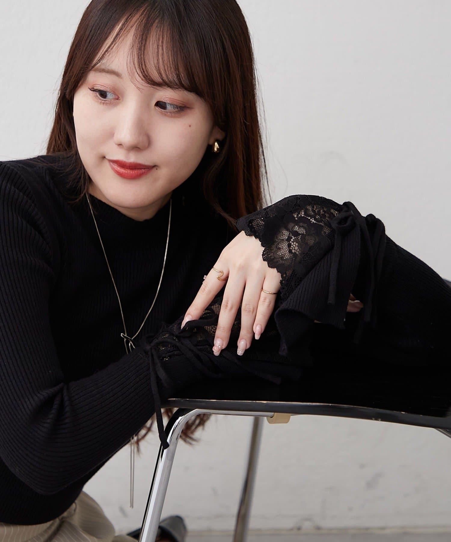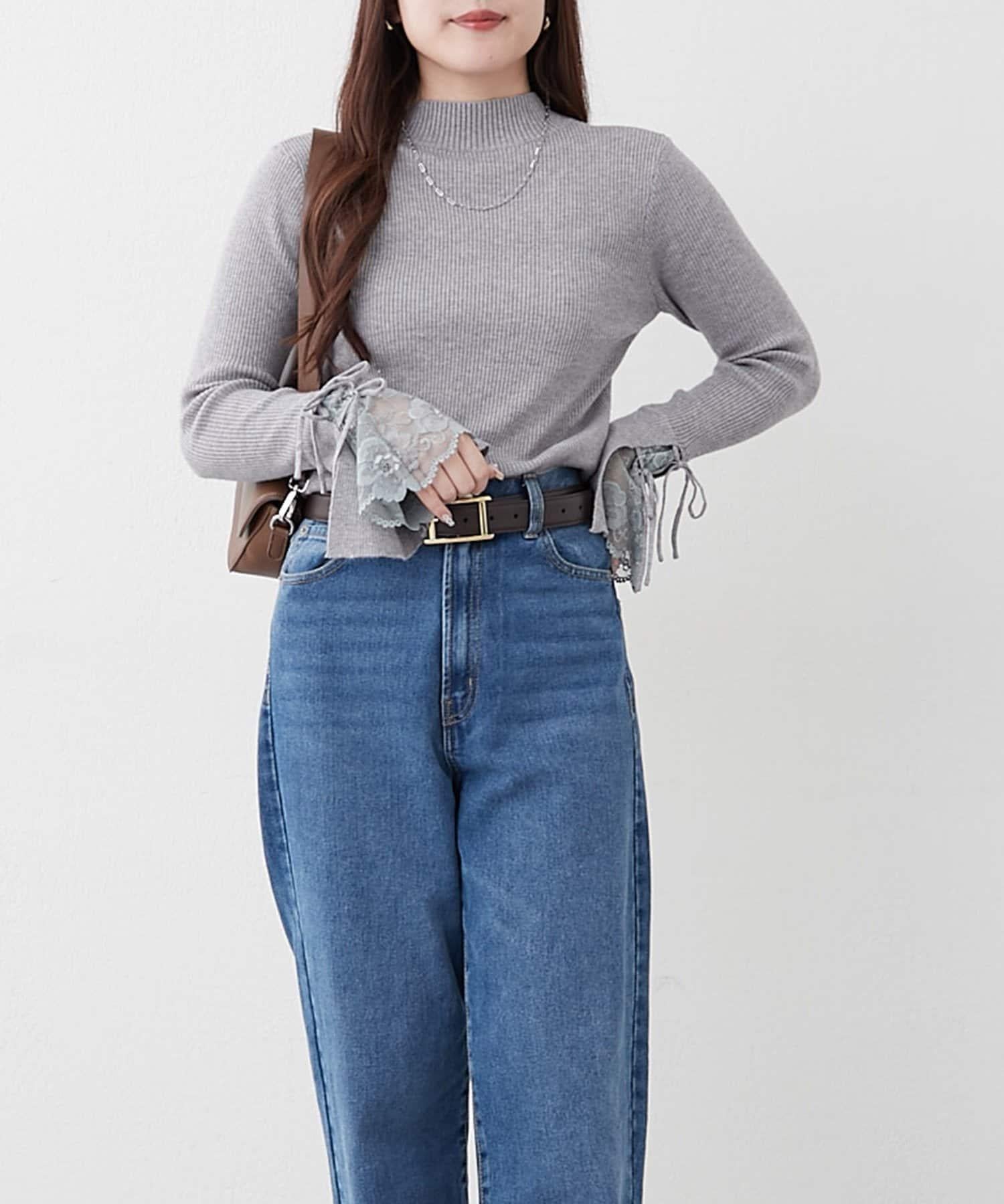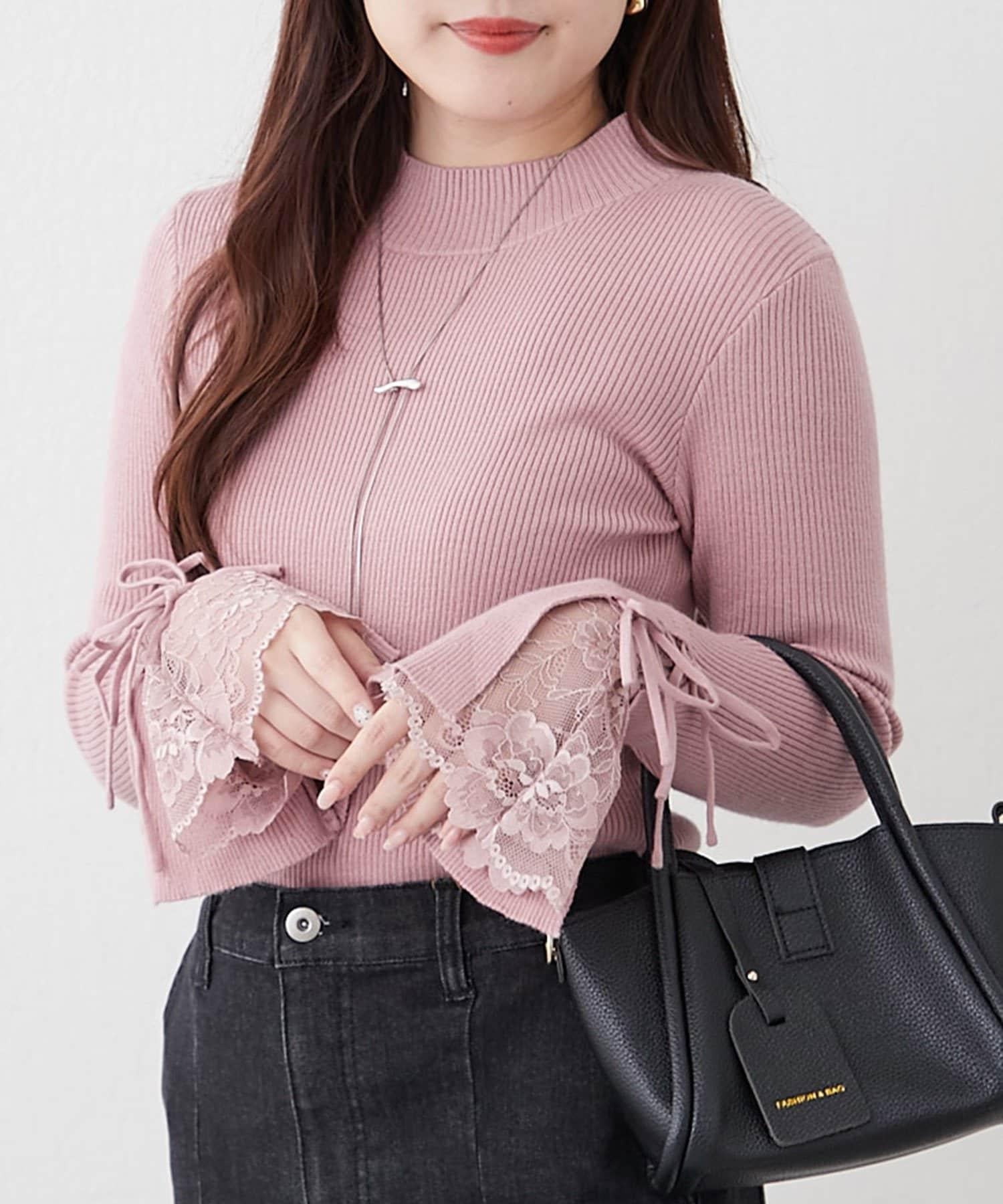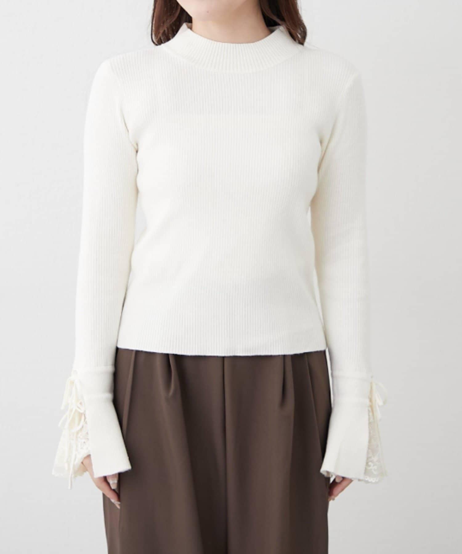 這款針織上衣的袖子上有可愛的蕾絲和絲帶。