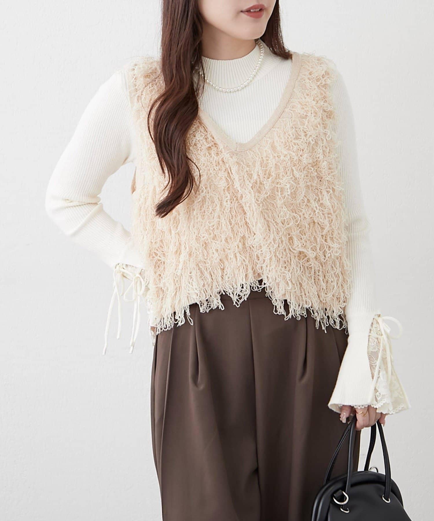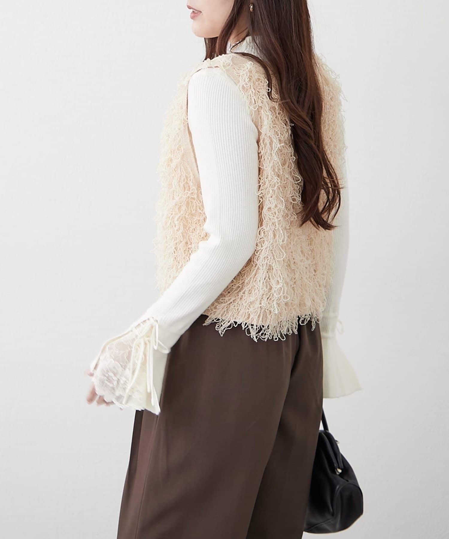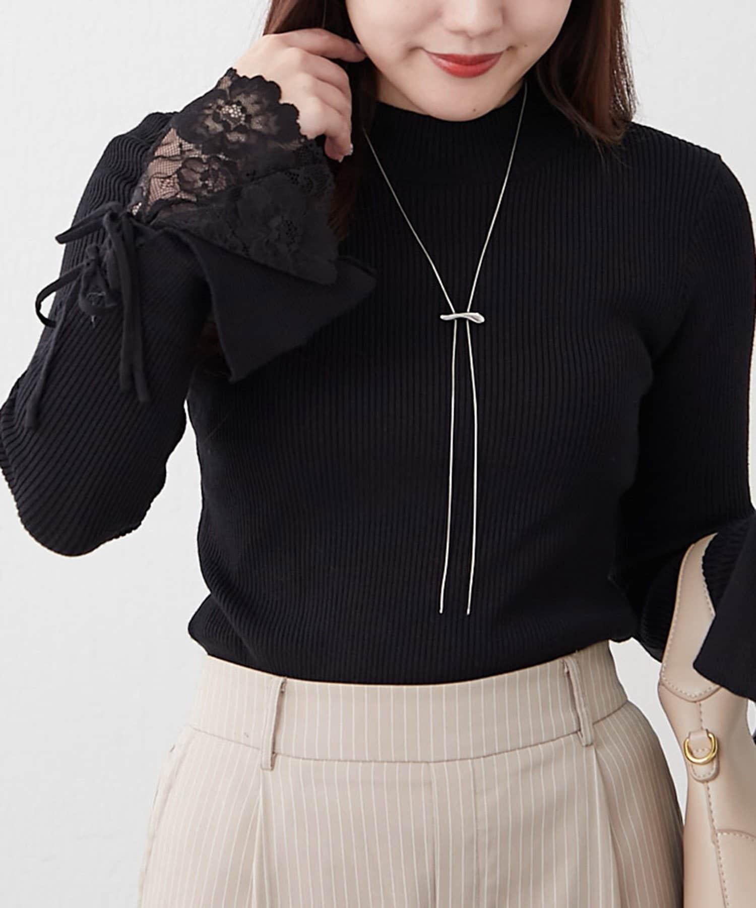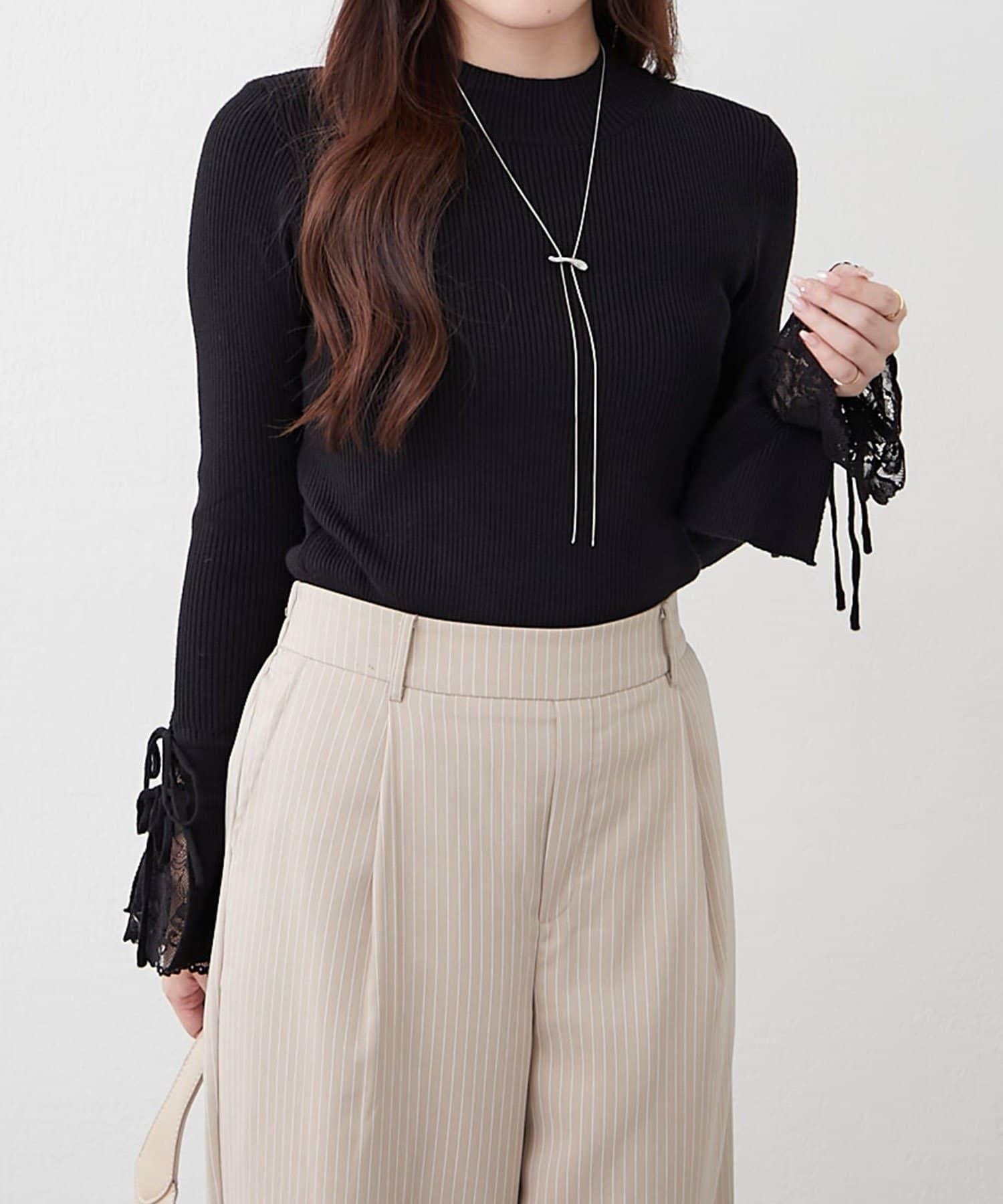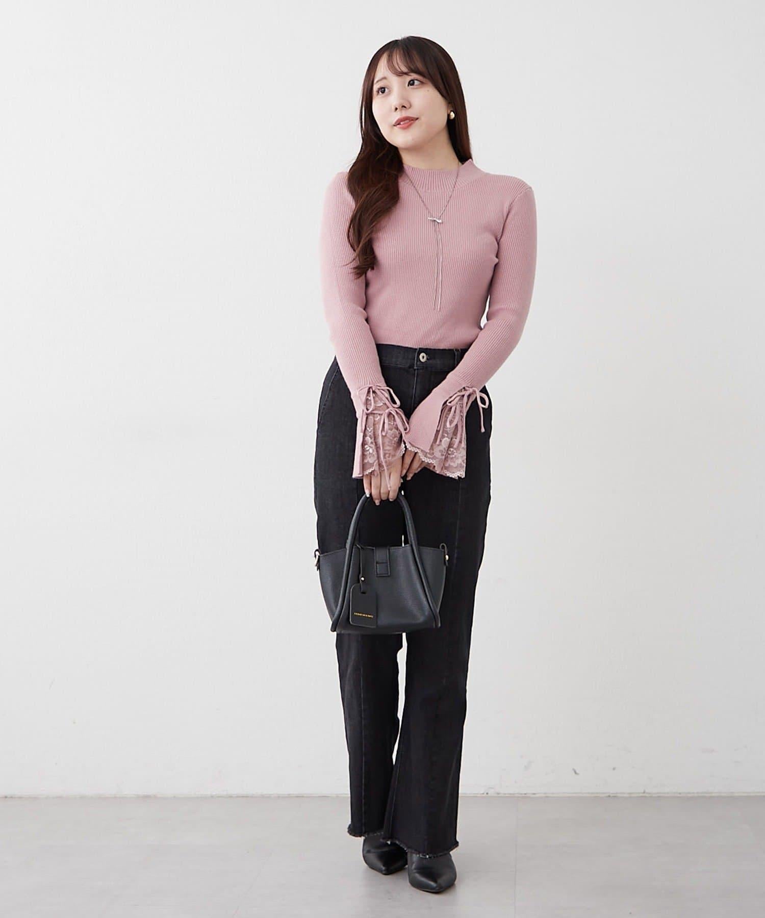 這款針織上衣的袖子上有可愛的蕾絲和絲帶。