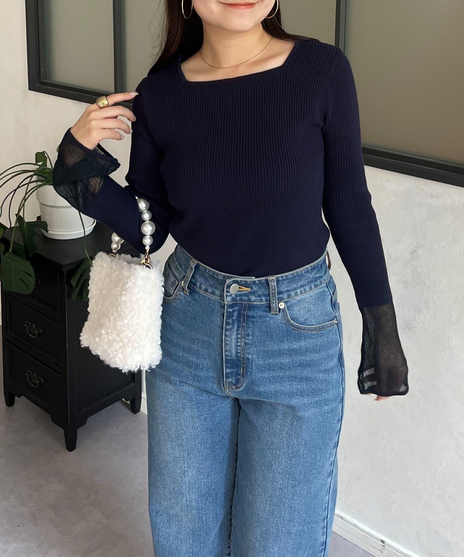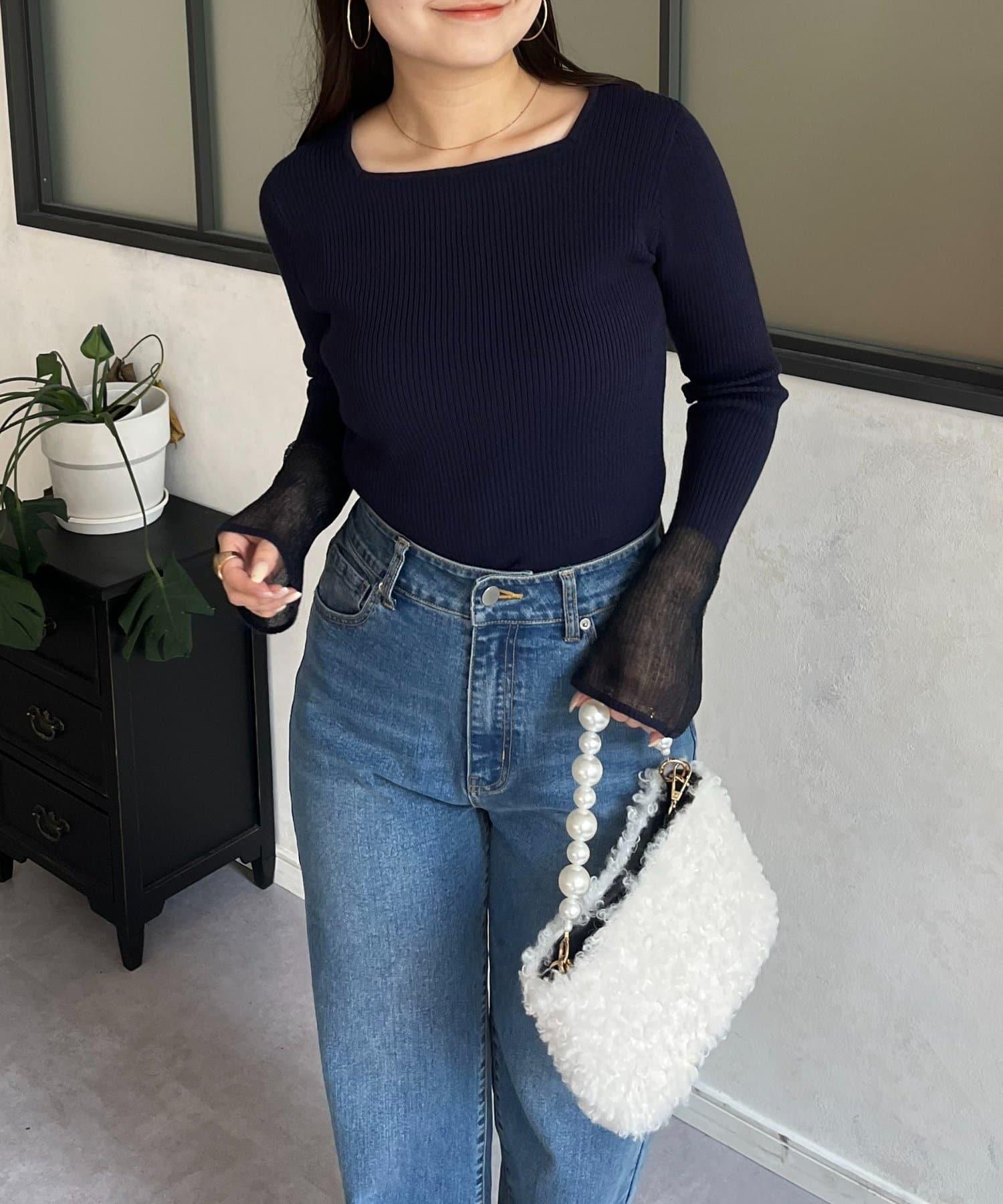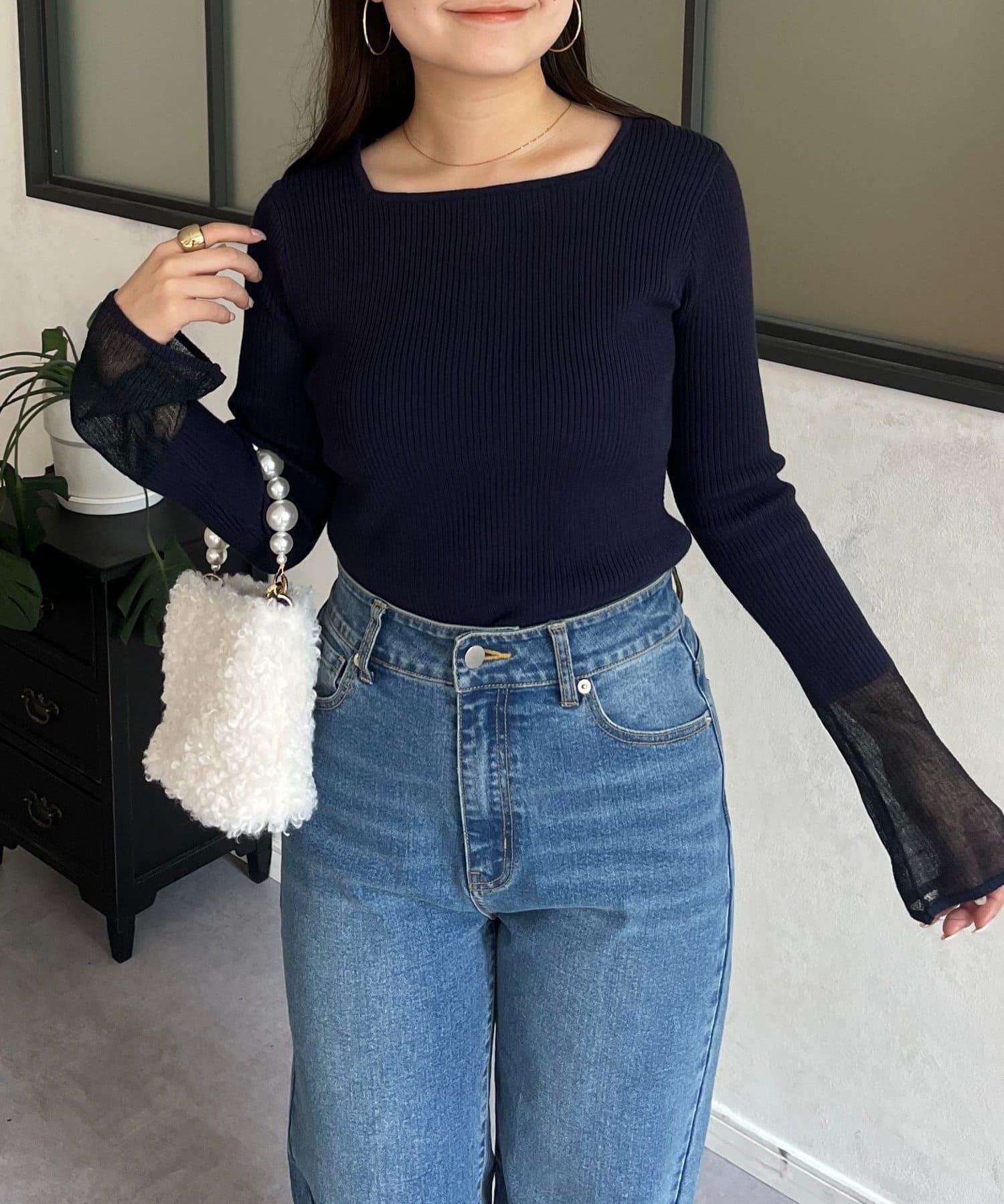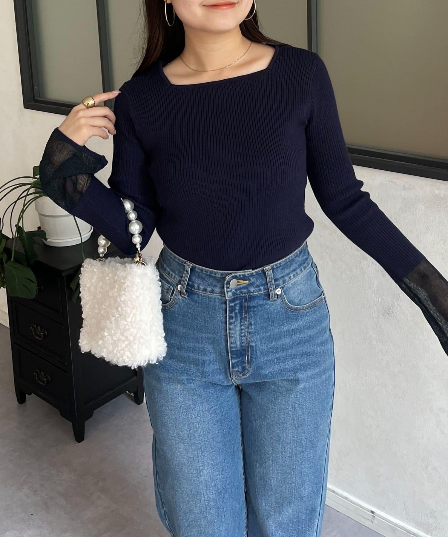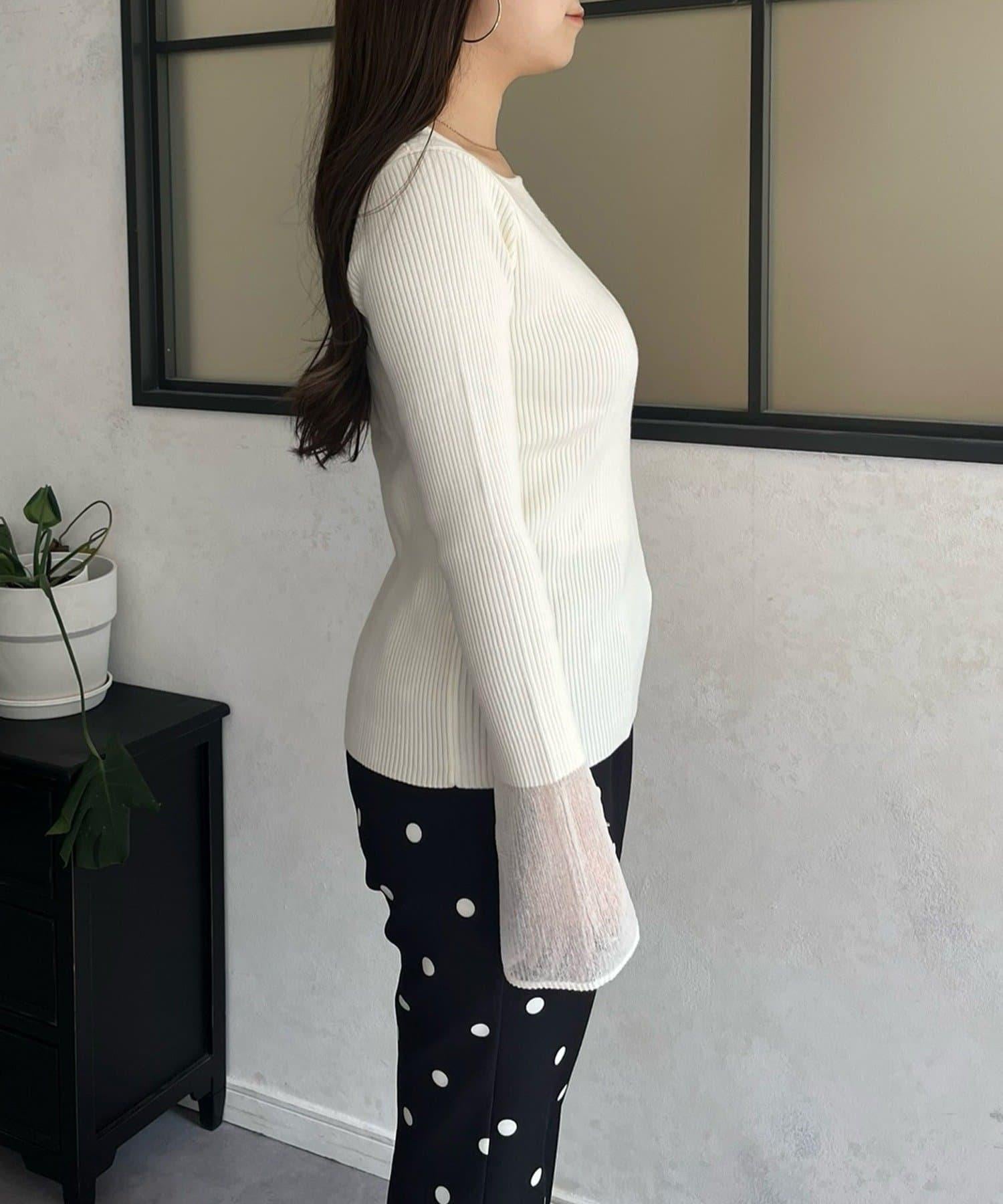 袖部透視方領羅紋針織衫