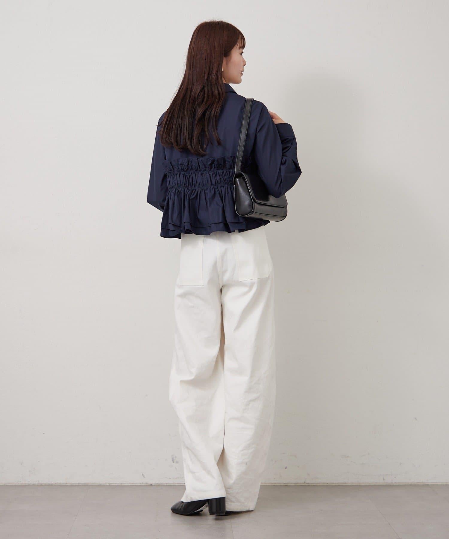 這款上衣的輪廓柔和而立體,胸前下襬採用了碎花和層疊設計。