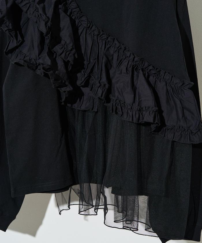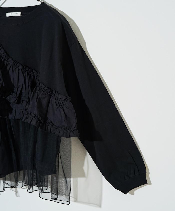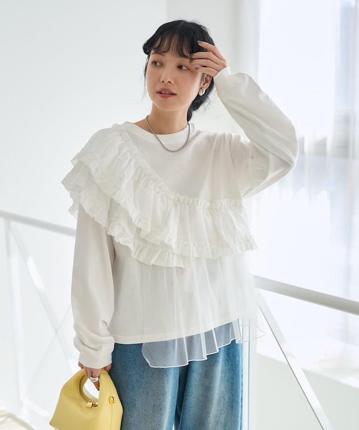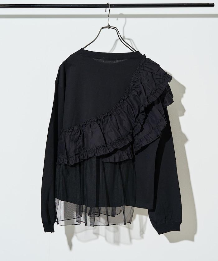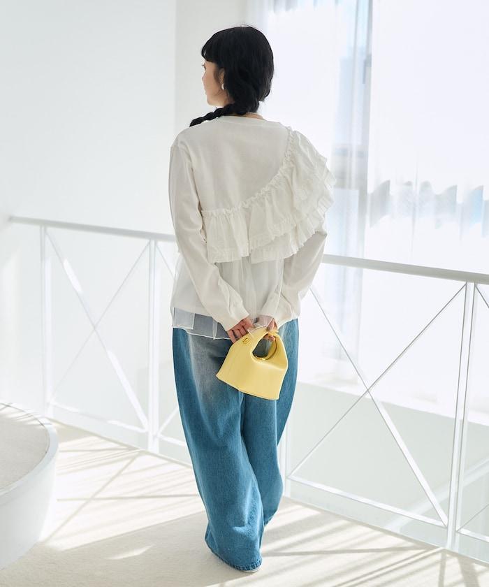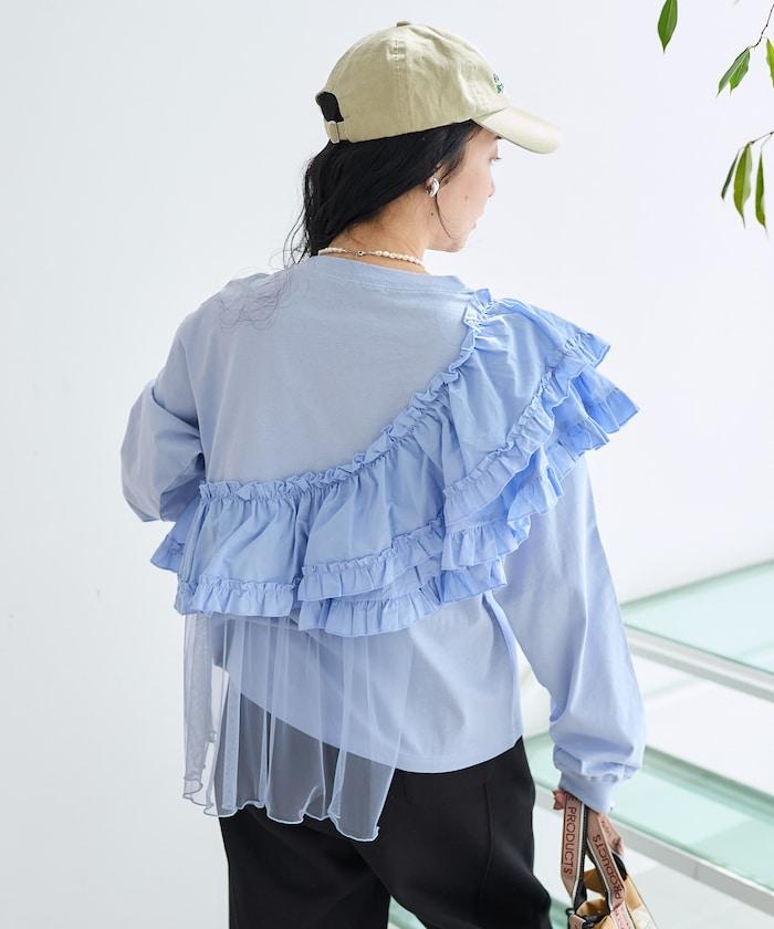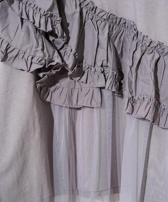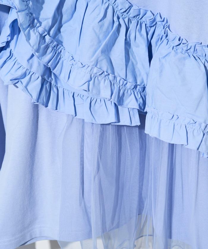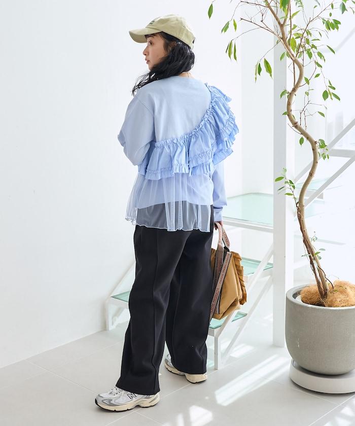 荷葉邊和薄紗不對稱地運用,營造出更加立體的效果。
