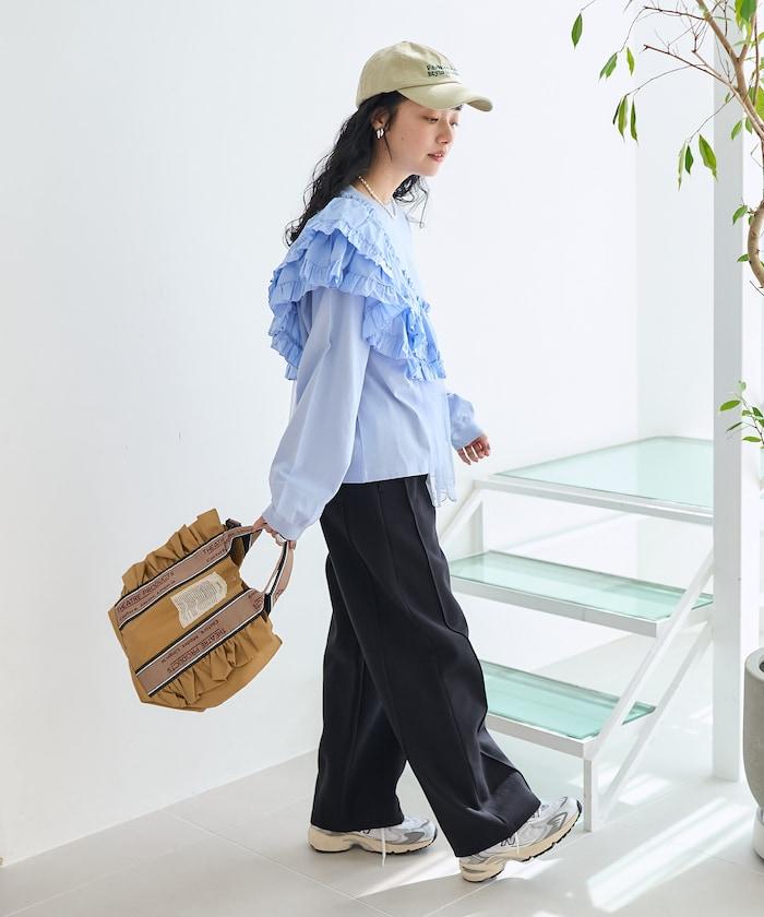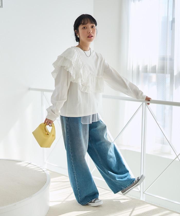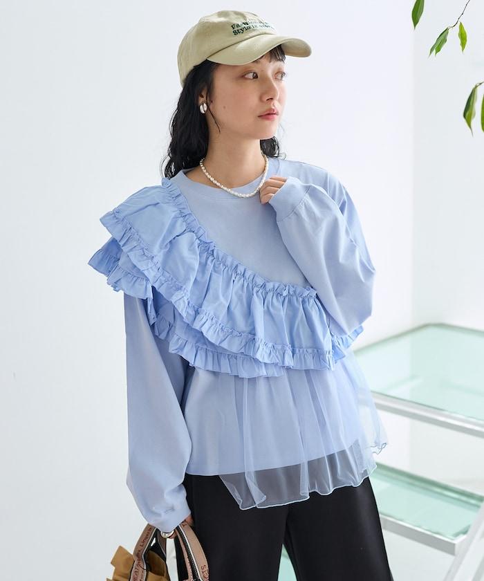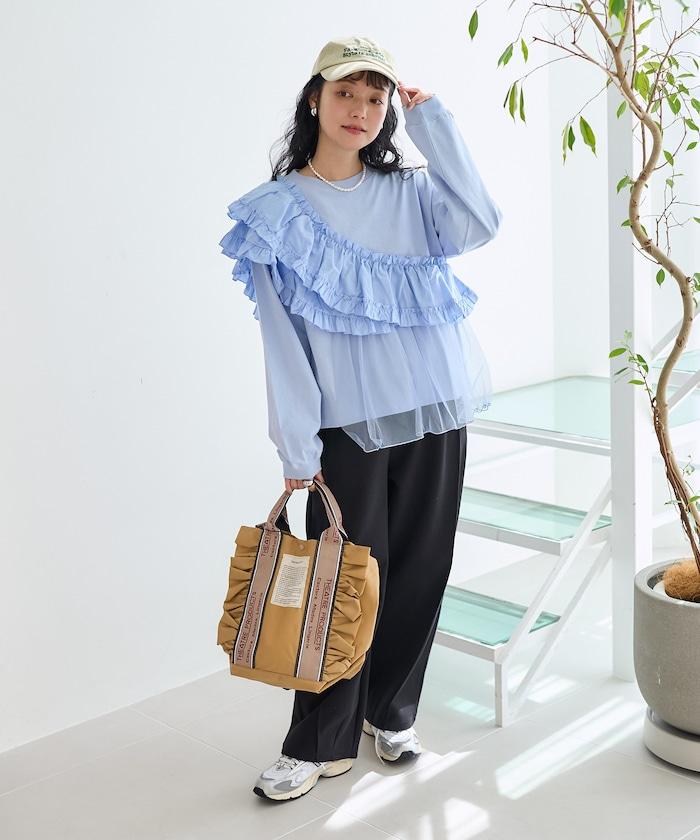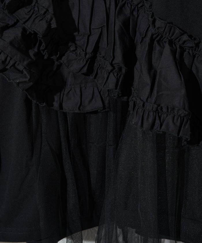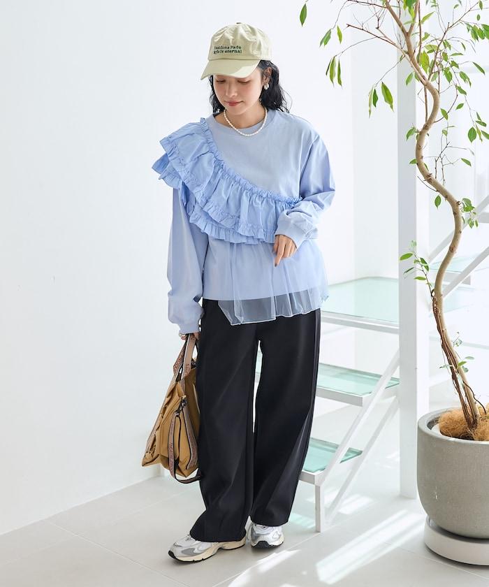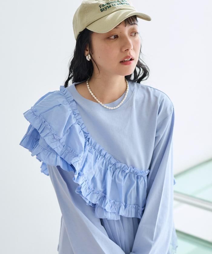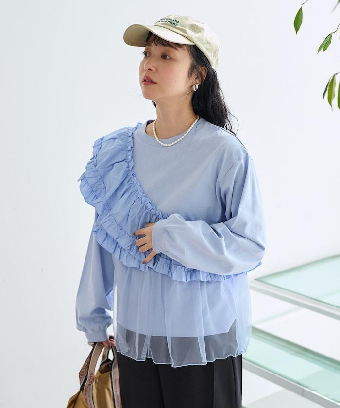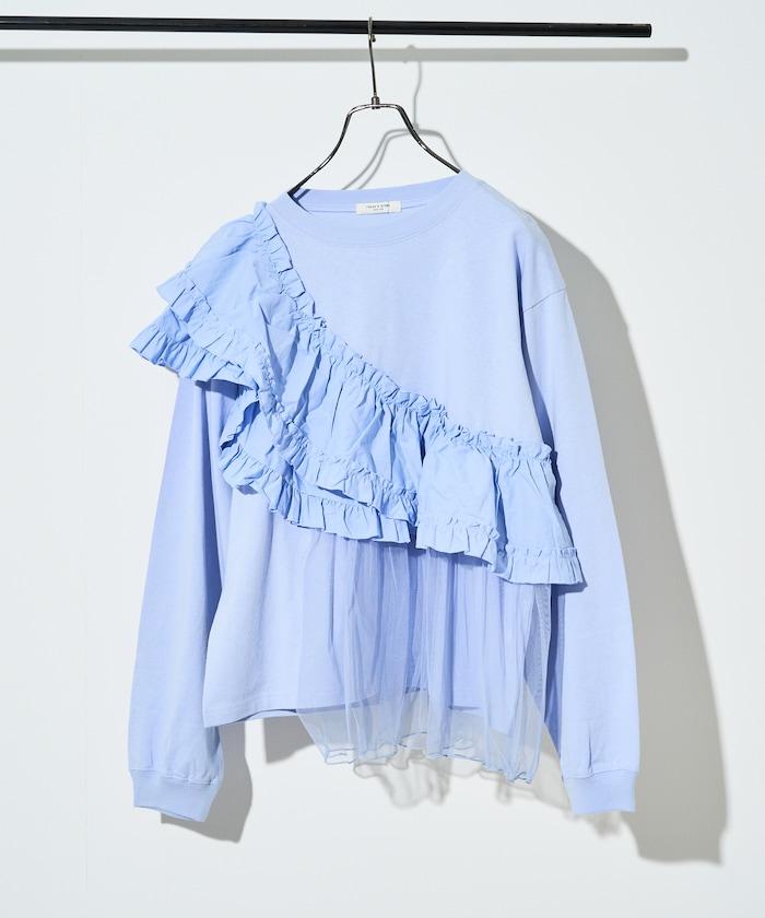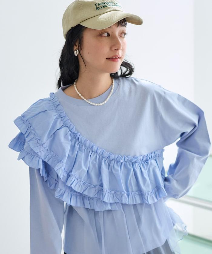 荷葉邊和薄紗不對稱地運用,營造出更加立體的效果。