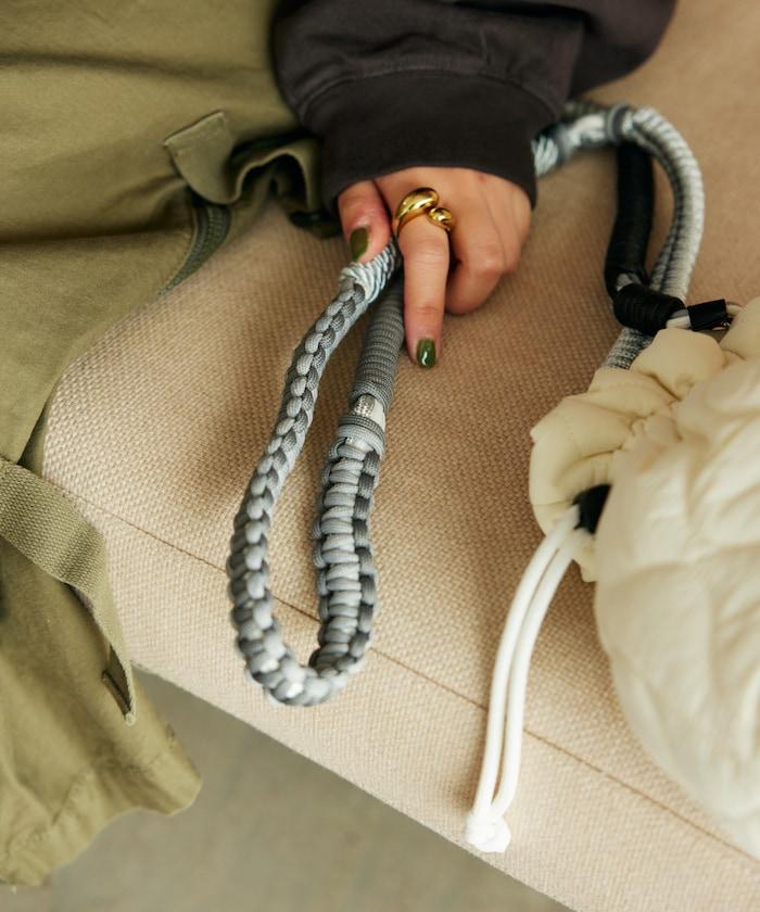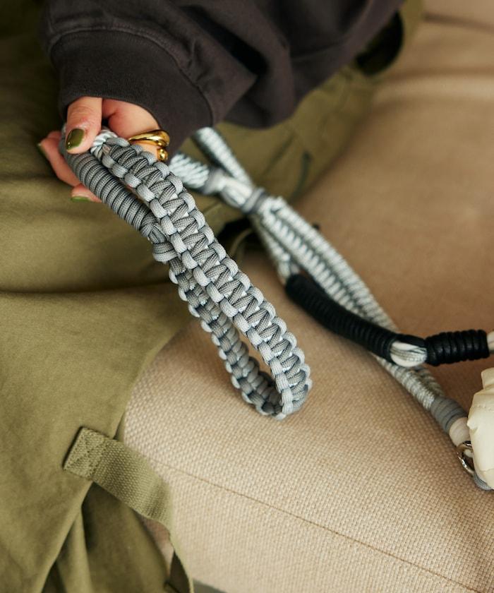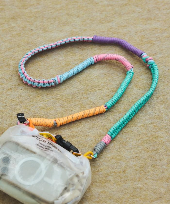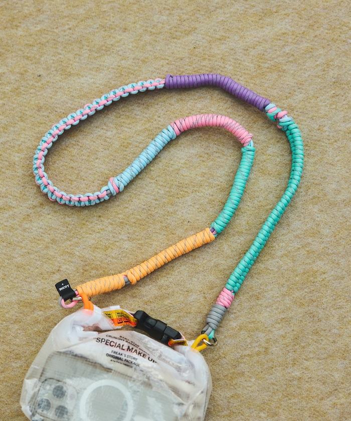 肩帶由色彩繽紛、編織複雜的傘繩編織而成,具有強烈的視覺衝擊力。