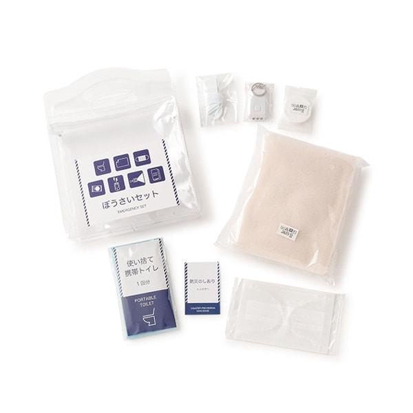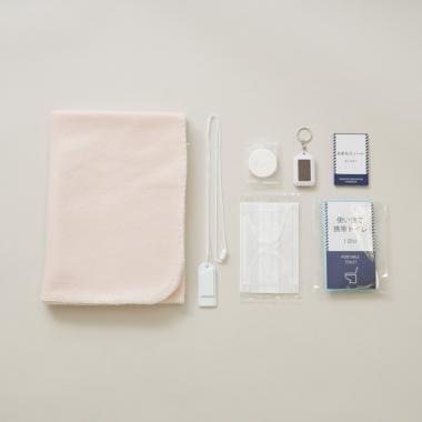 七件套包括便攜式廁所、毯子、壓縮毛巾、口罩、哨子、太陽能燈和防災書籤。