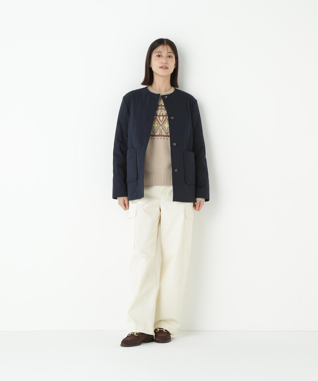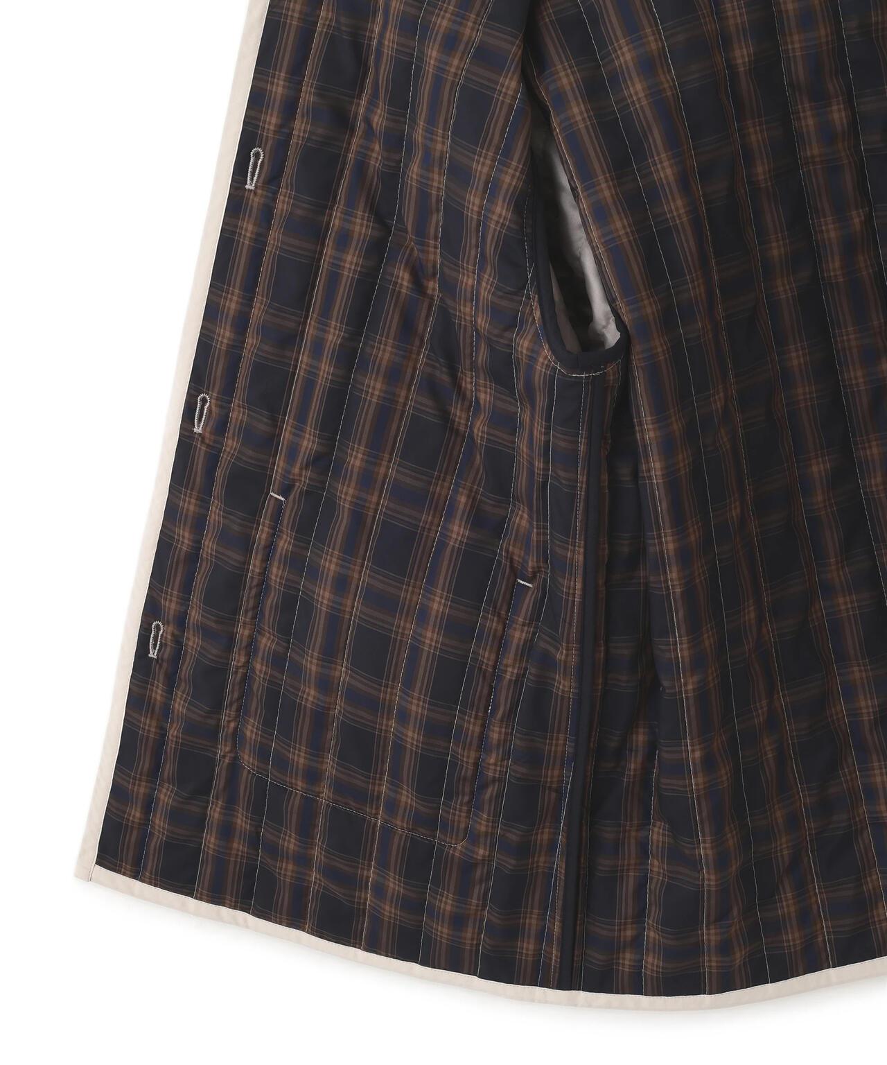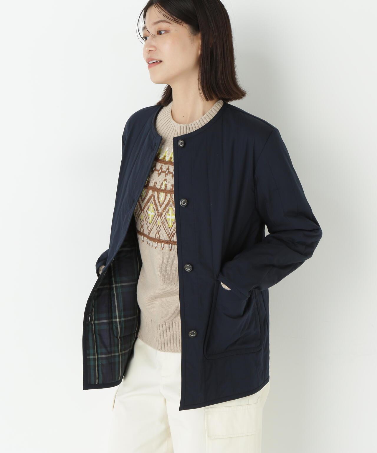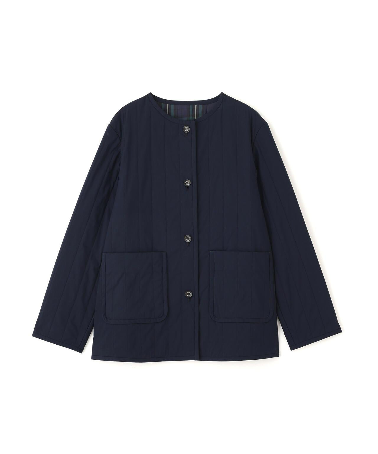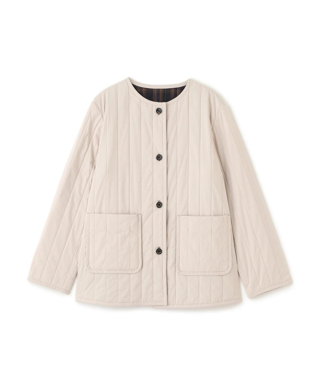 適合日常穿著的絎縫夾克 [設計要點] 這款無領夾克採用垂直紋理絎縫,是今年的典型款式。帶有傳統標誌的水牛式紐扣也是一大亮點。👍後以相同面料的細滾邊收尾,乾淨利落。絎縫正面由輕質棉-尼龍打字機制成,硬度適中,反面由啞光 P-taffeta 格子布製成。中間夾著木棉混紡襯墊。這是一款休閒風格的絎縫外衣必備品。在換季時,它可以作為外套穿在身上,活躍很長一段時間。它是一款可搭配任何下裝的廓形夾克。