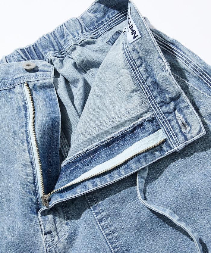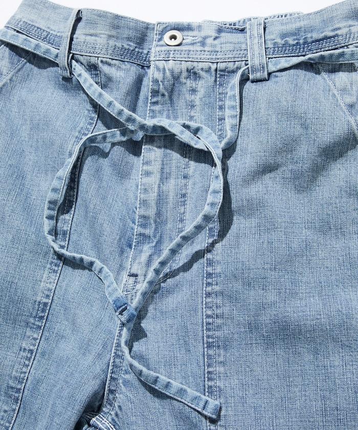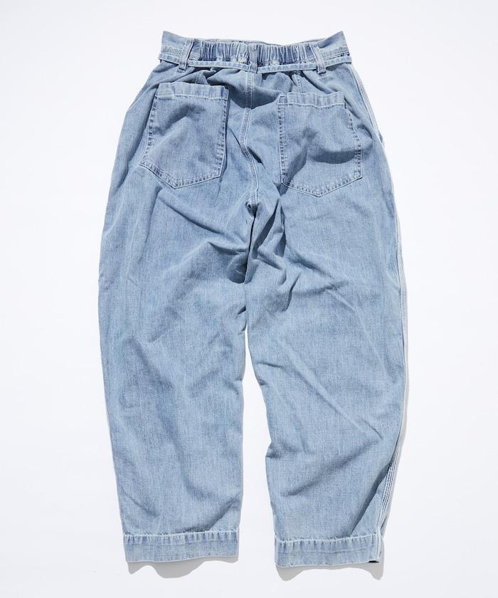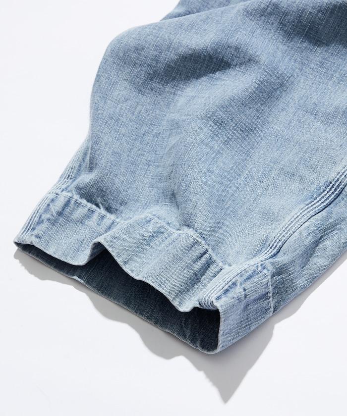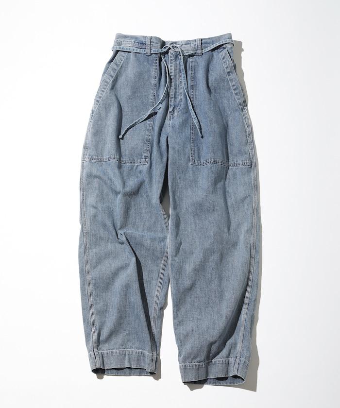 我喜歡淺色彩繪長褲,去美國的時候經常會買。這種獨特的薩克斯藍顏色是用一種叫做霜漂的技術創造出來的,使顏色看起來更自然。和工裝褲一樣,褲子的兩側和大腿內側也採用了三針鏈式縫製,腰部採用收腰設計,穿著非常舒適"。(A.H)