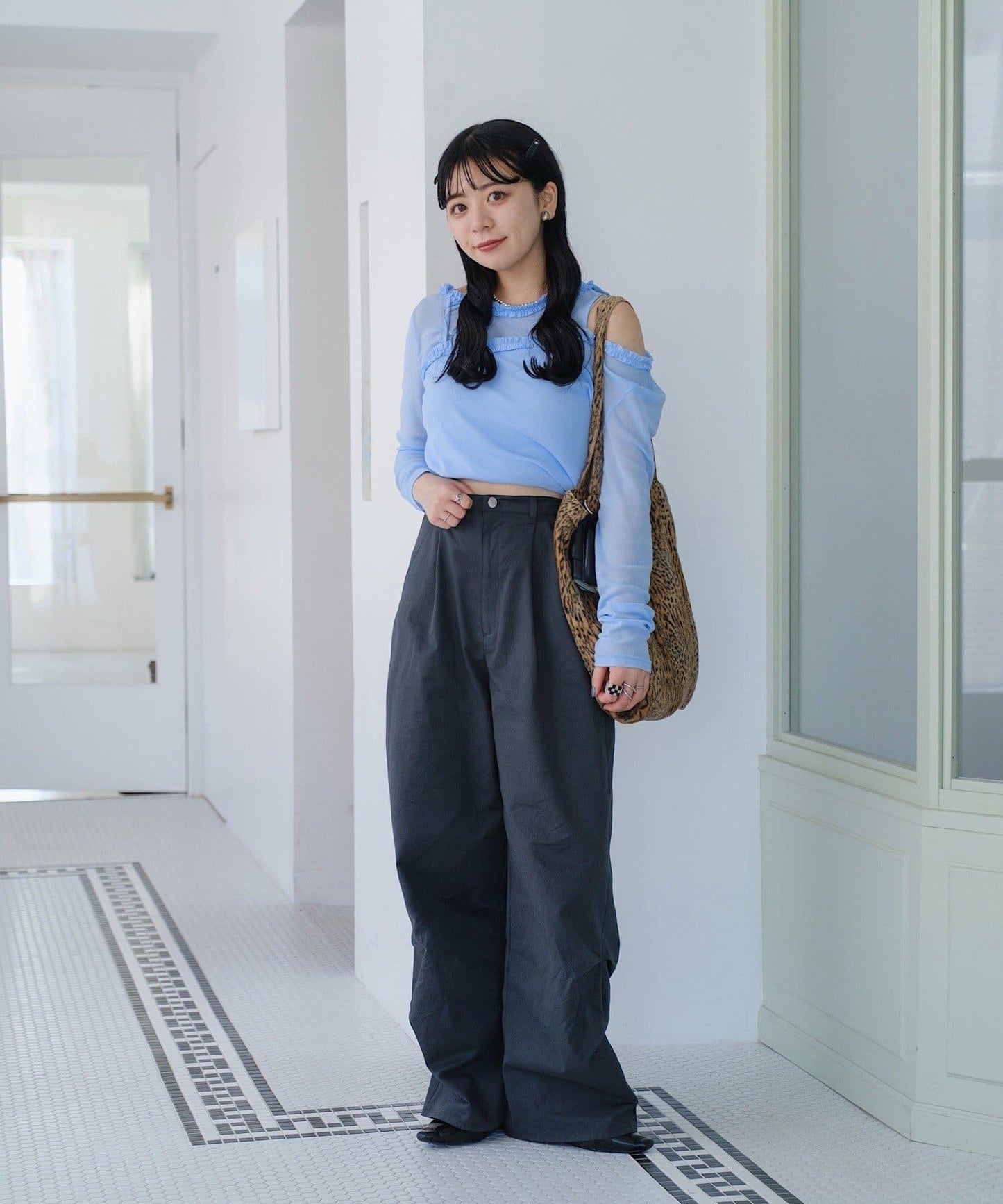 因為是寬鬆長褲,所以適合搭配短上衣和小巧的上衣。