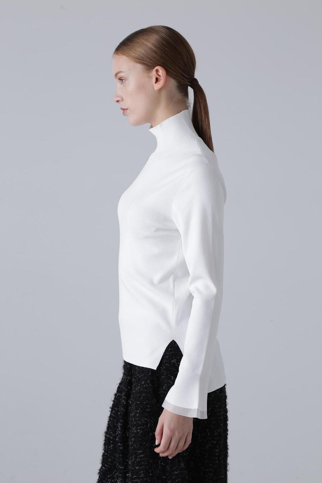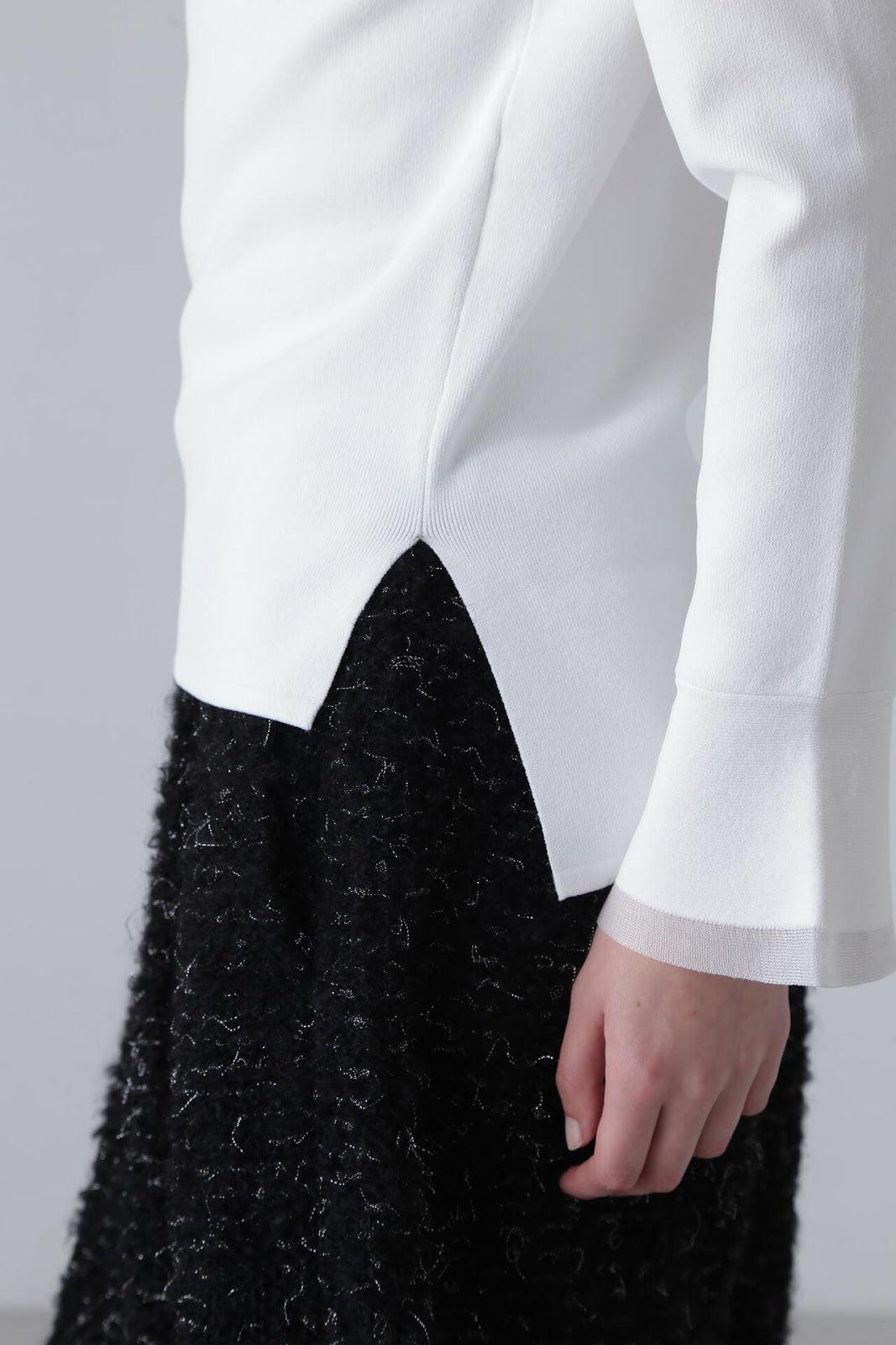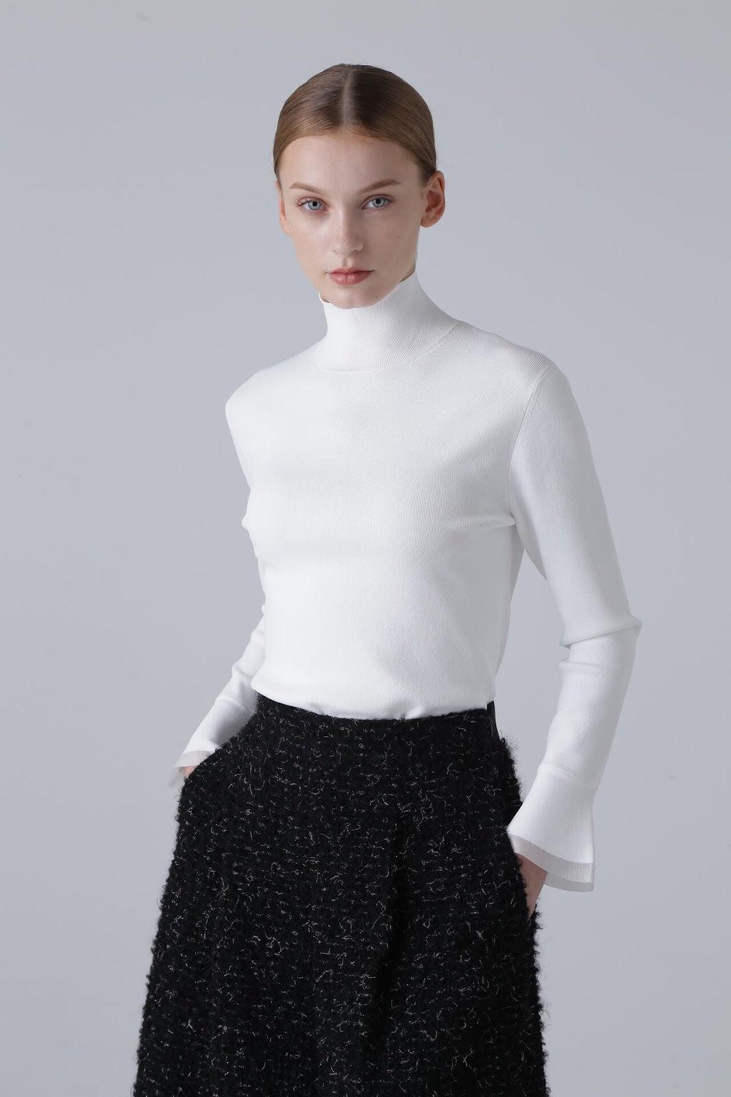 柔軟的彈力針織衫,既可單穿,也可作為內搭立領針織衫,袖口採用鐘罩式設計。這種設計在上一季非常流行,本季袖口採用了不同的針織面料。這款單品不會過於顯露您的曲線,給您帶來時尚、簡潔的外觀。人造絲和 PBT 聚酯高捻紗。袖口採用滌綸薄紗。