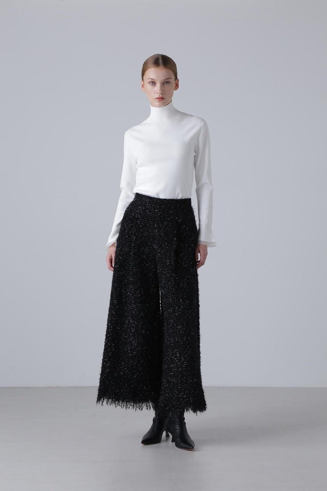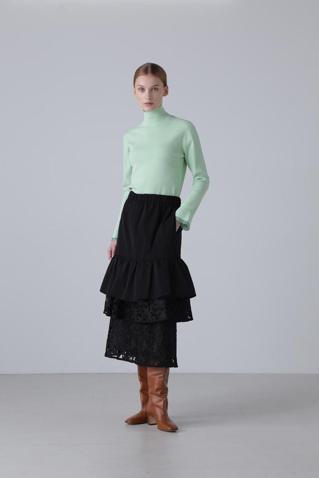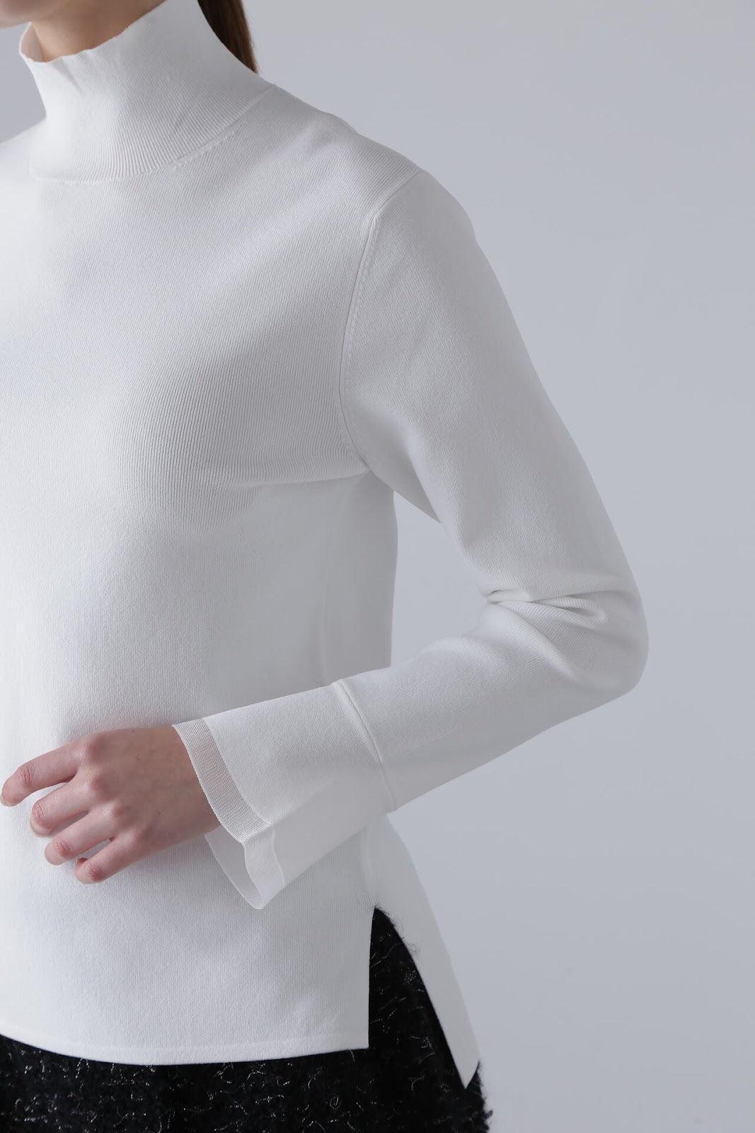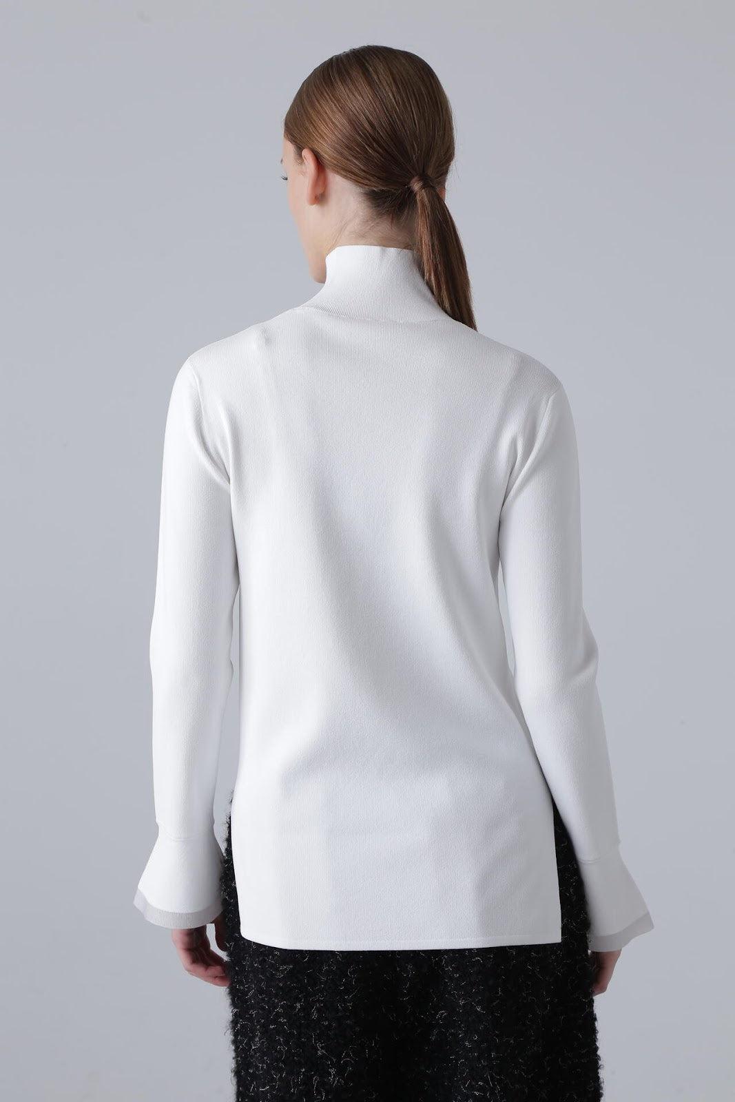柔軟的彈力針織衫,既可單穿,也可作為內搭立領針織衫,袖口採用鐘罩式設計。這種設計在上一季非常流行,本季袖口採用了不同的針織面料。這款單品不會過於顯露您的曲線,給您帶來時尚、簡潔的外觀。人造絲和 PBT 聚酯高捻紗。袖口採用滌綸薄紗。