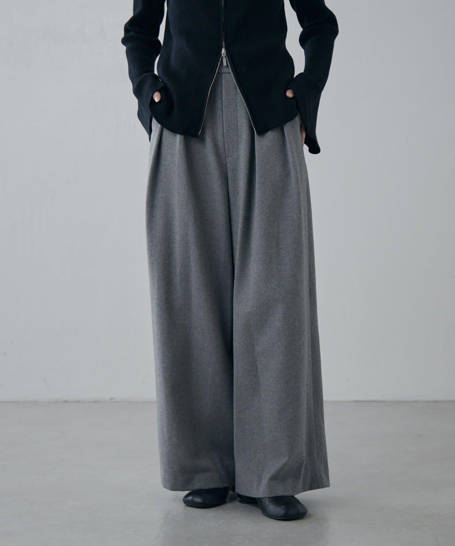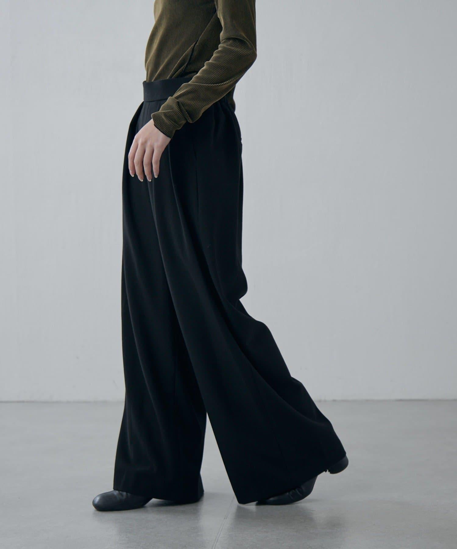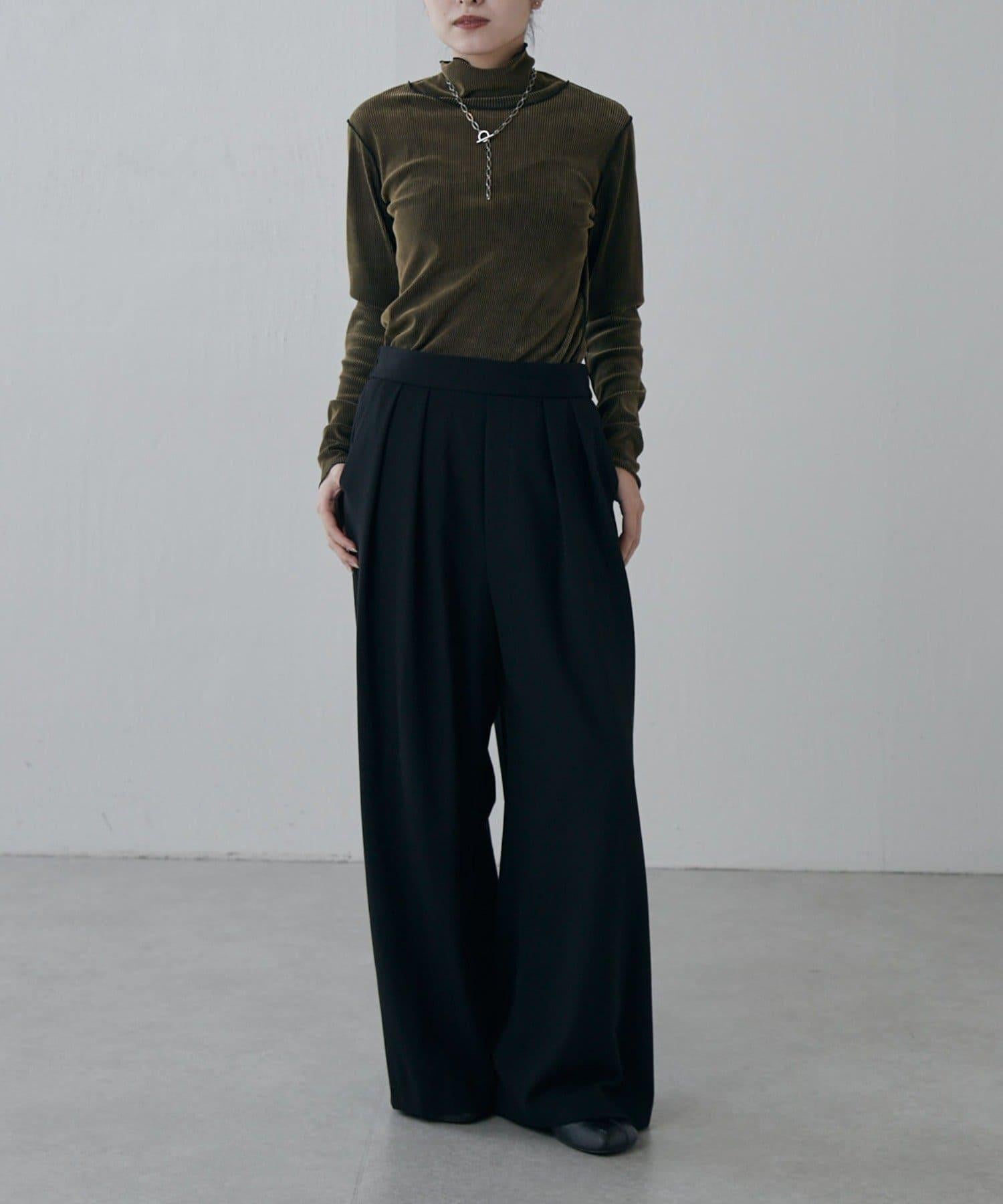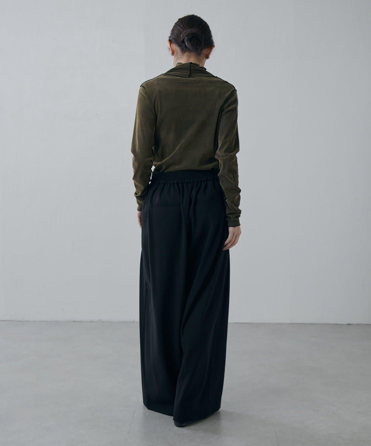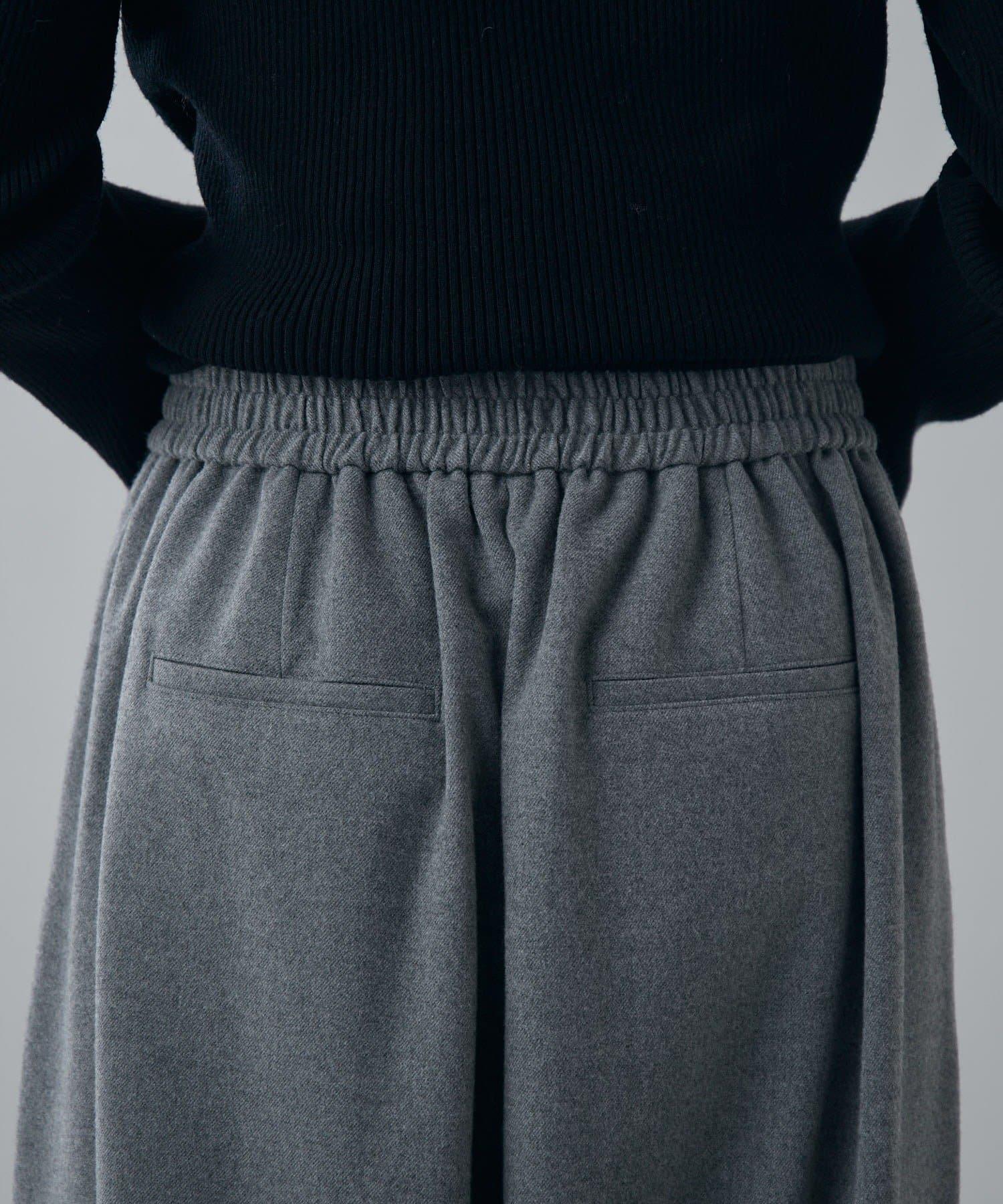 這款休閒褲的輪廓非常優美,腰部有兩個漂亮的收口,下襬寬度較寬,向下擺方向展開。