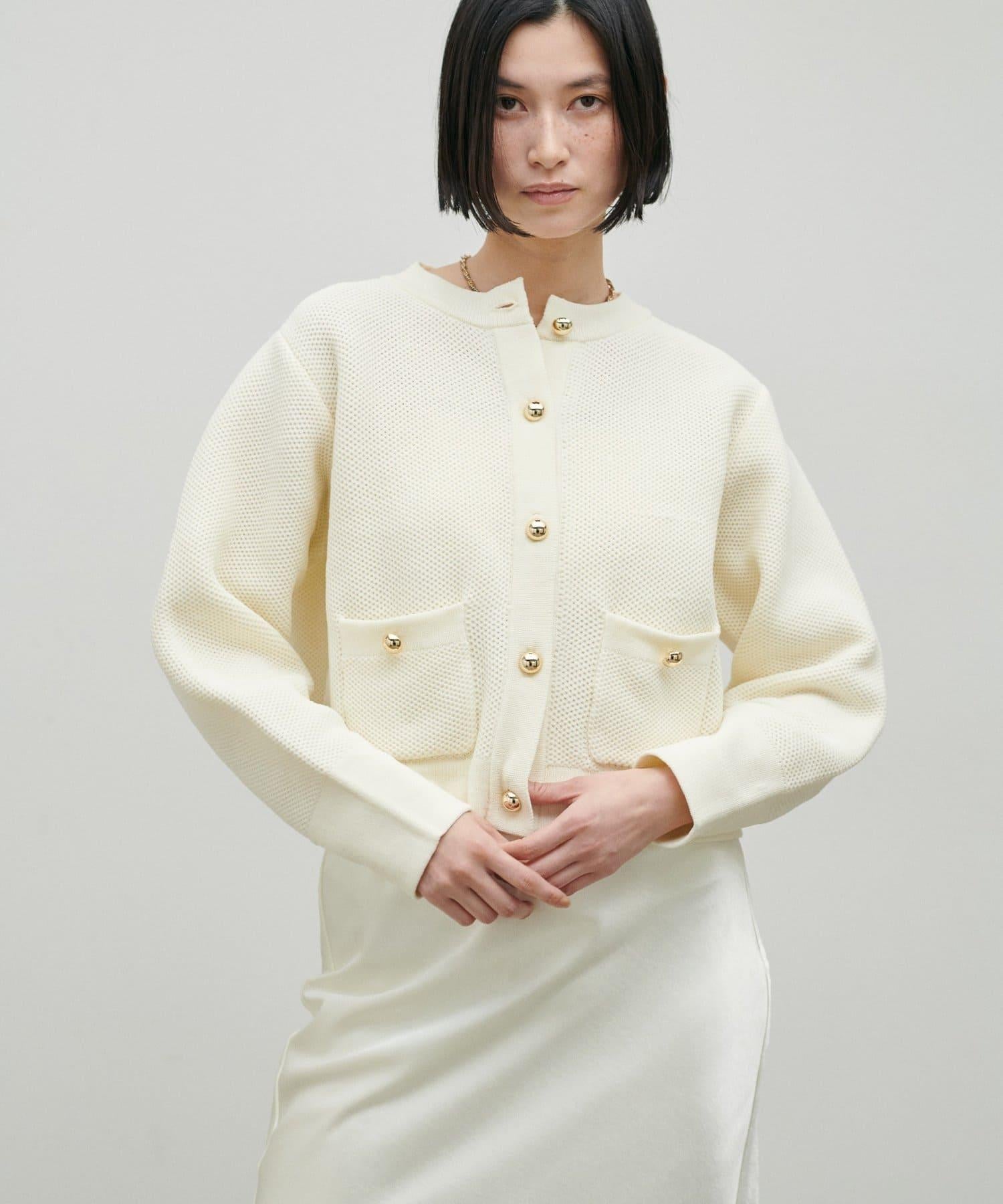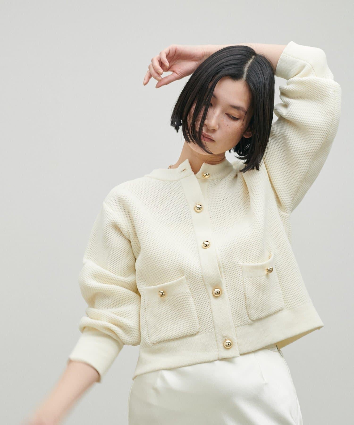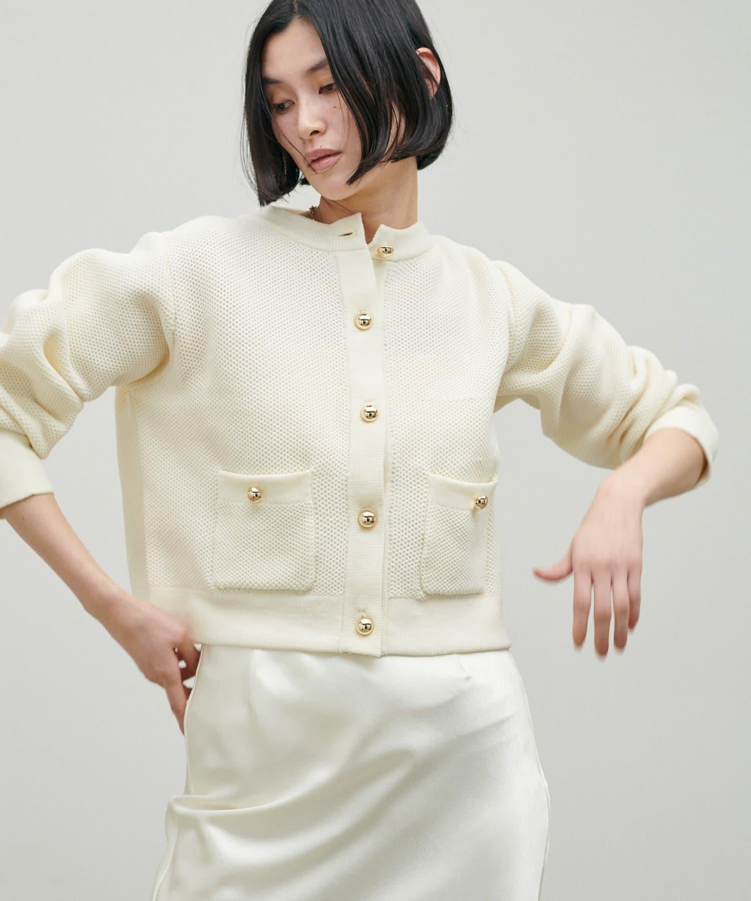 這款針織開衫採用蜂窩狀針織,表面富有表現力。