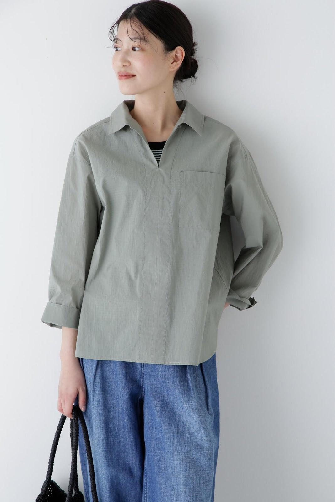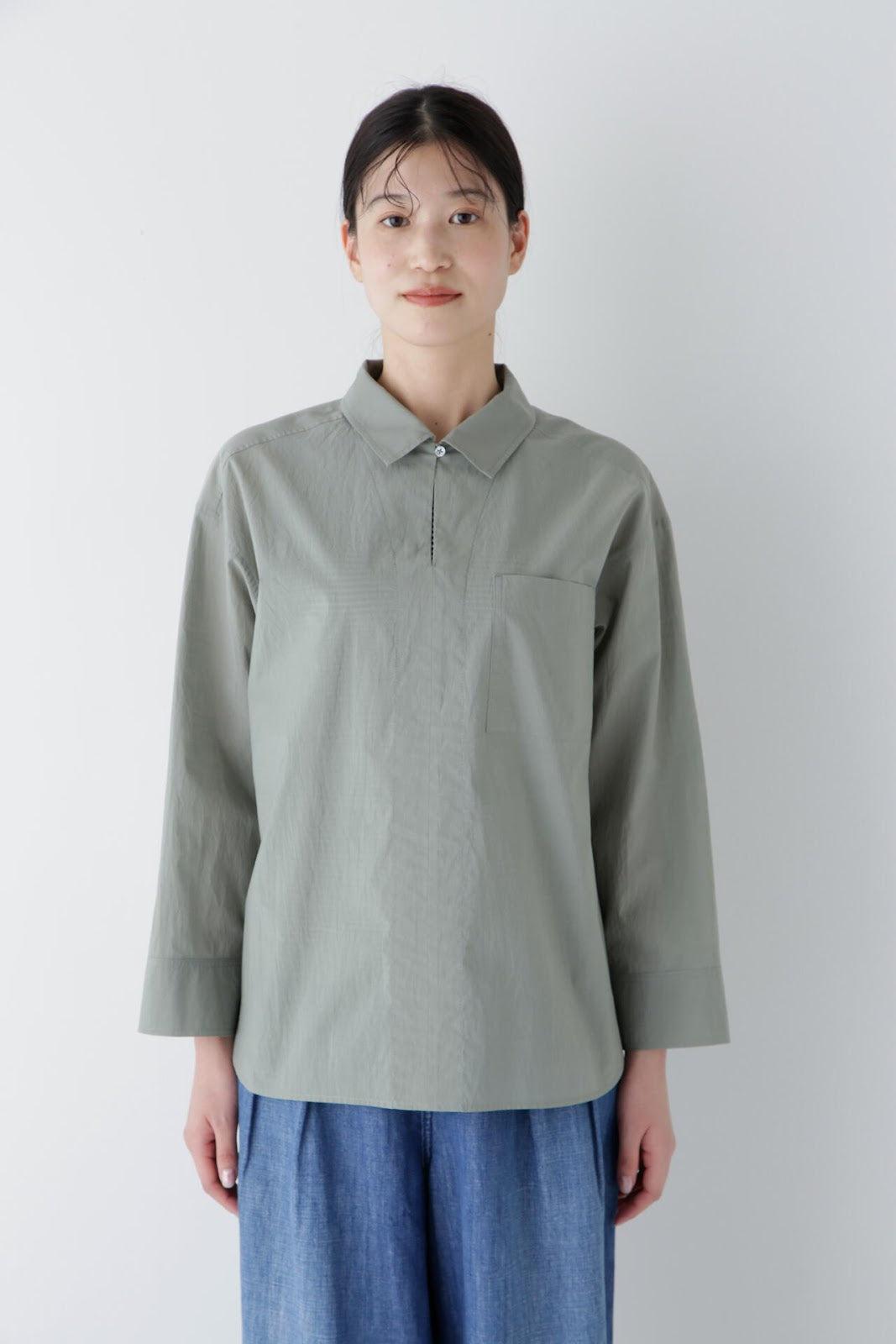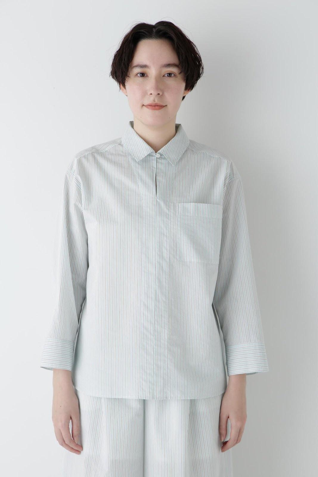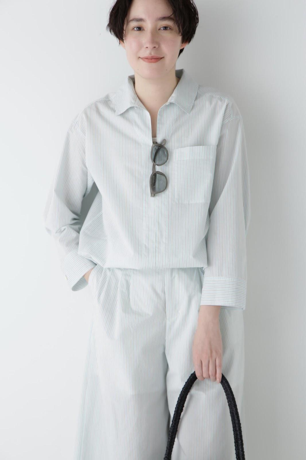 清爽寬鬆的船長襯衫 [設計要點] 這款套頭衫採用了類似船長襯衫的方形剪裁。袖口可通過袖釦調節大小。面料為棉尼龍面料,手感輕盈飄逸,具有襯衫的彈性。有三種顏色可供選擇:藍色條紋、薄荷綠素色和卡其色素色。建議搭配】建議搭配牛仔褲等休閒下裝。也可與同材質的長褲搭配作為套裝穿著。