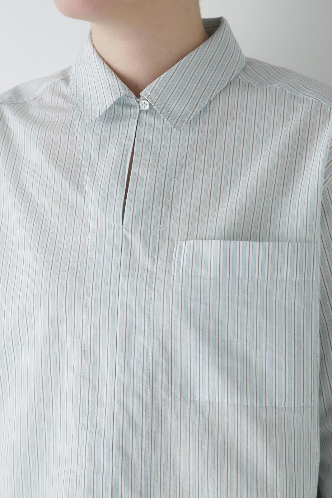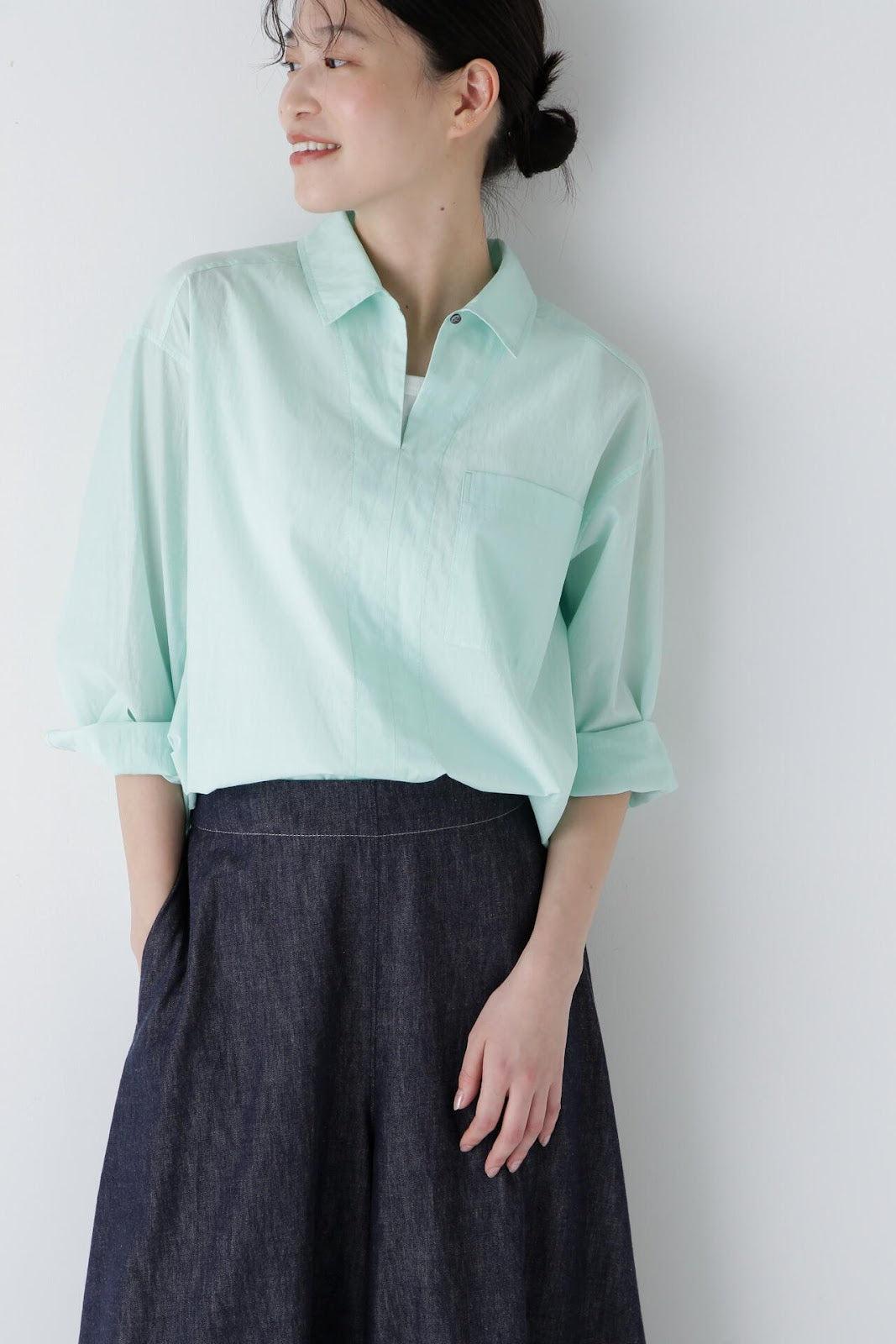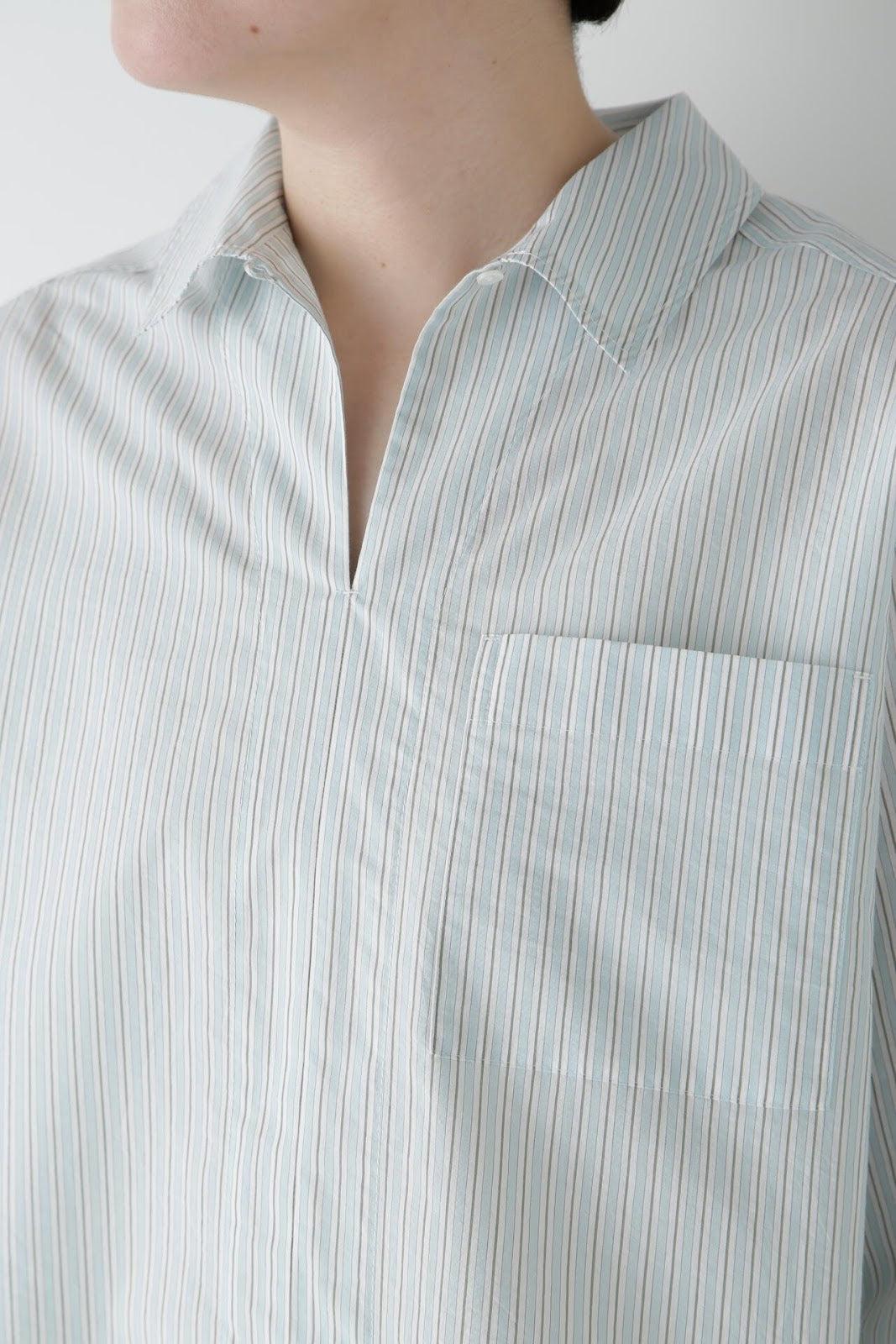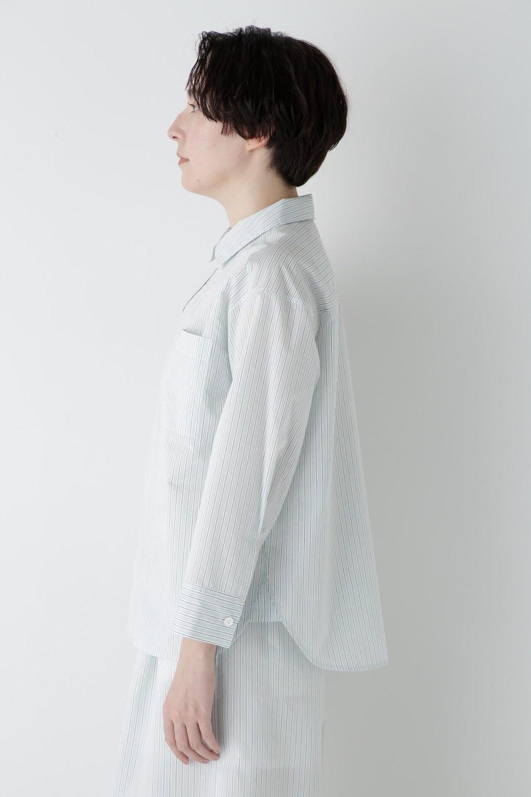 清爽寬鬆的船長襯衫 [設計要點] 這款套頭衫採用了類似船長襯衫的方形剪裁。袖口可通過袖釦調節大小。面料為棉尼龍面料,手感輕盈飄逸,具有襯衫的彈性。有三種顏色可供選擇:藍色條紋、薄荷綠素色和卡其色素色。建議搭配】建議搭配牛仔褲等休閒下裝。也可與同材質的長褲搭配作為套裝穿著。