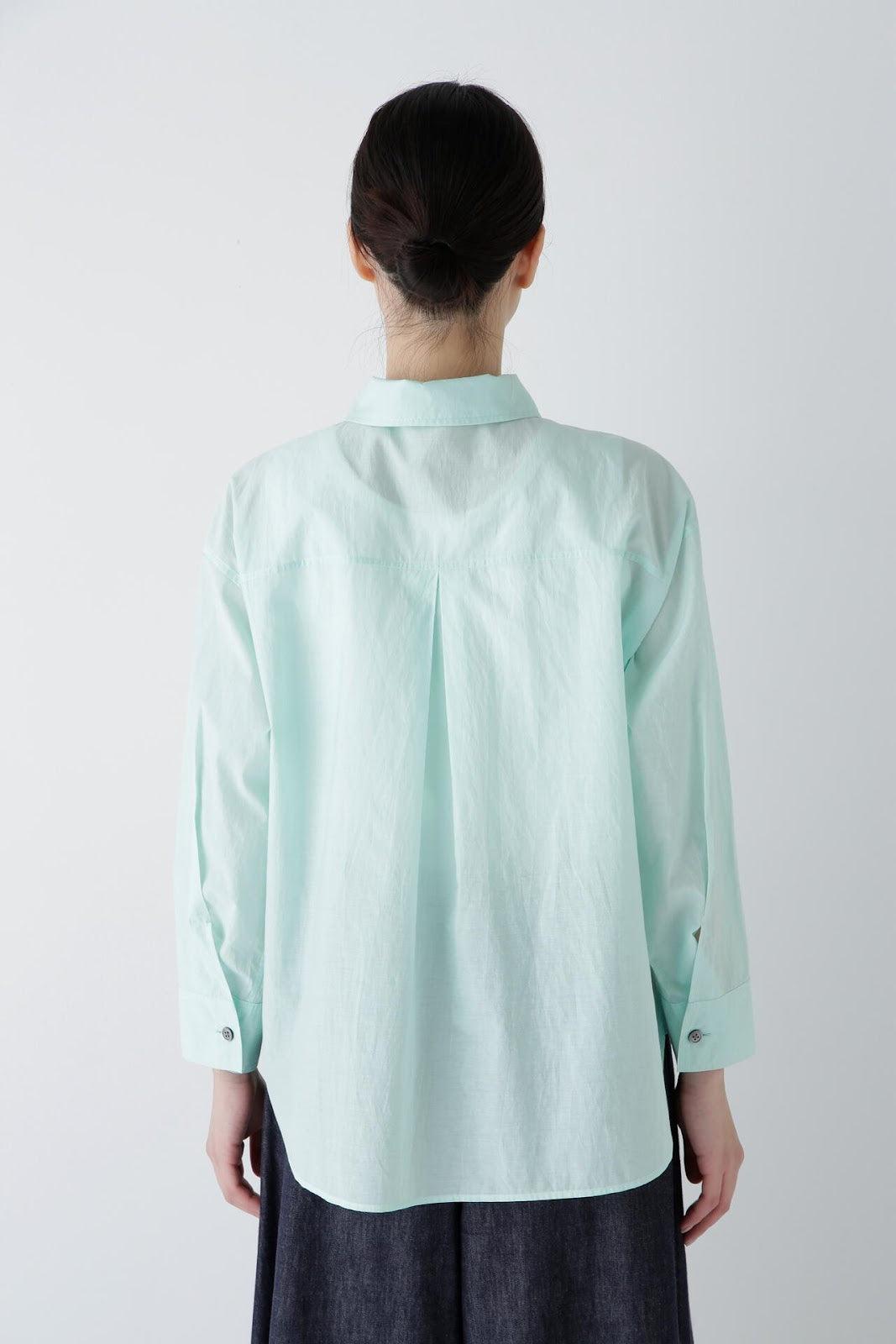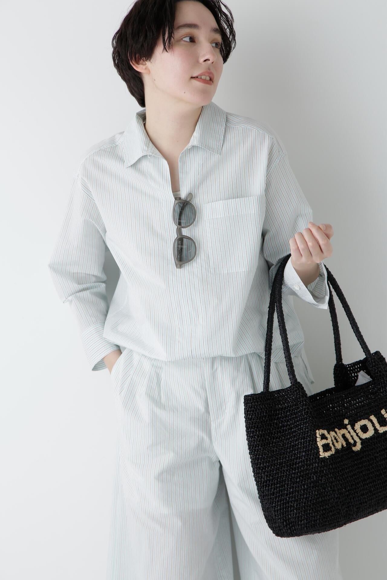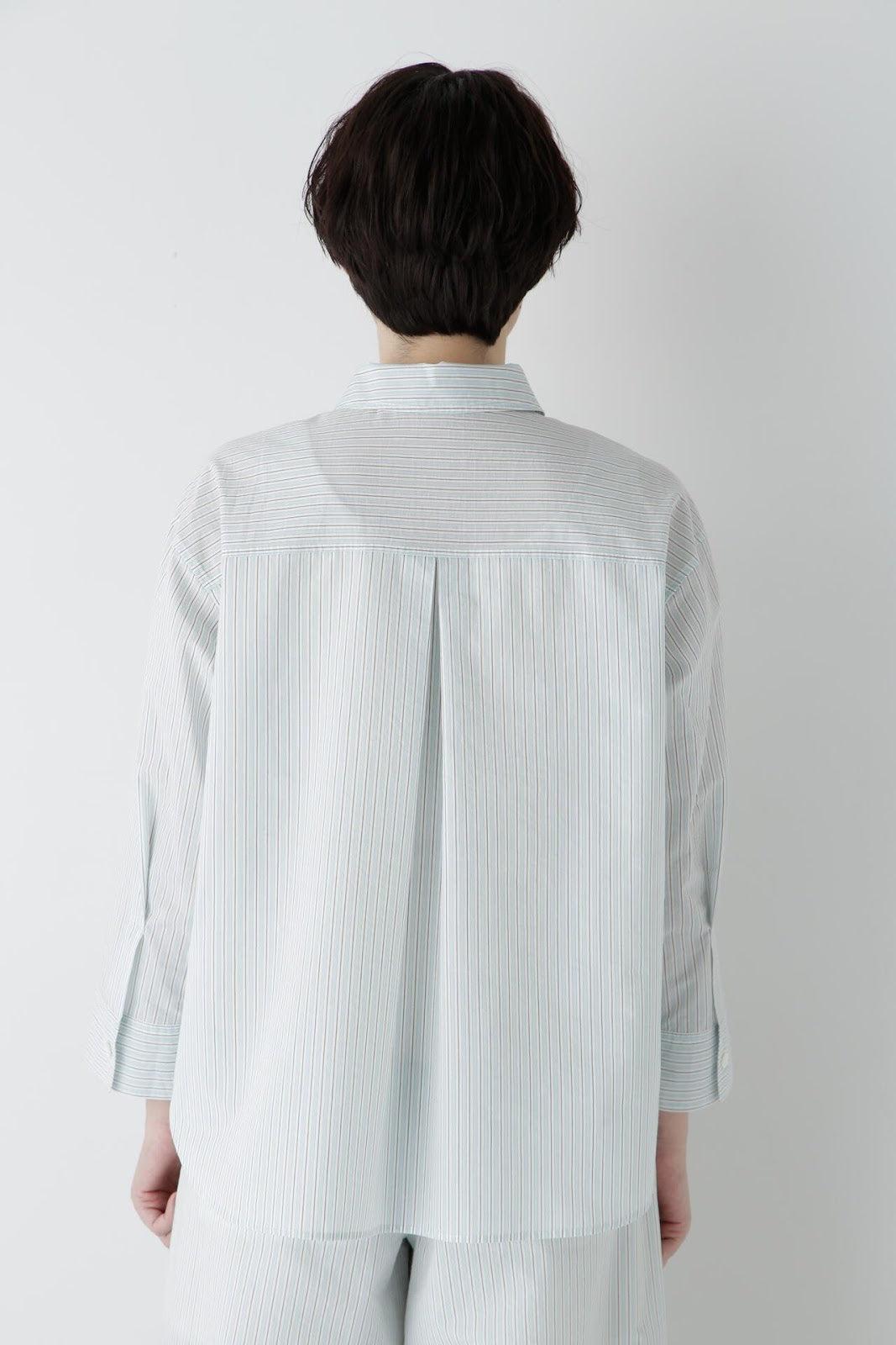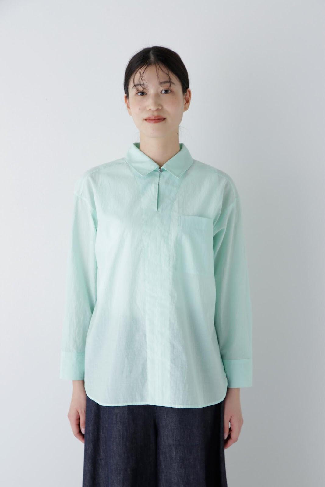 清爽寬鬆的船長襯衫 [設計要點] 這款套頭衫採用了類似船長襯衫的方形剪裁。袖口可通過袖釦調節大小。面料為棉尼龍面料,手感輕盈飄逸,具有襯衫的彈性。有三種顏色可供選擇:藍色條紋、薄荷綠素色和卡其色素色。建議搭配】建議搭配牛仔褲等休閒下裝。也可與同材質的長褲搭配作為套裝穿著。