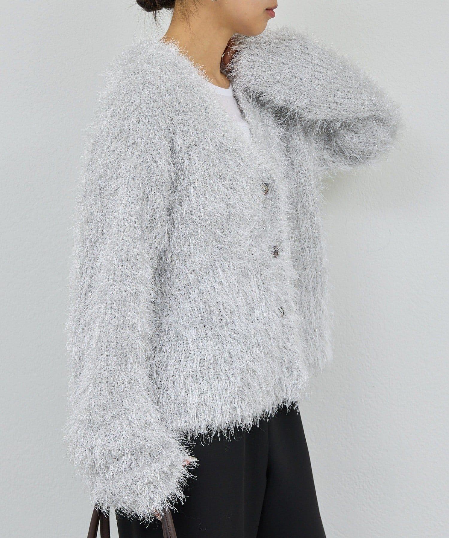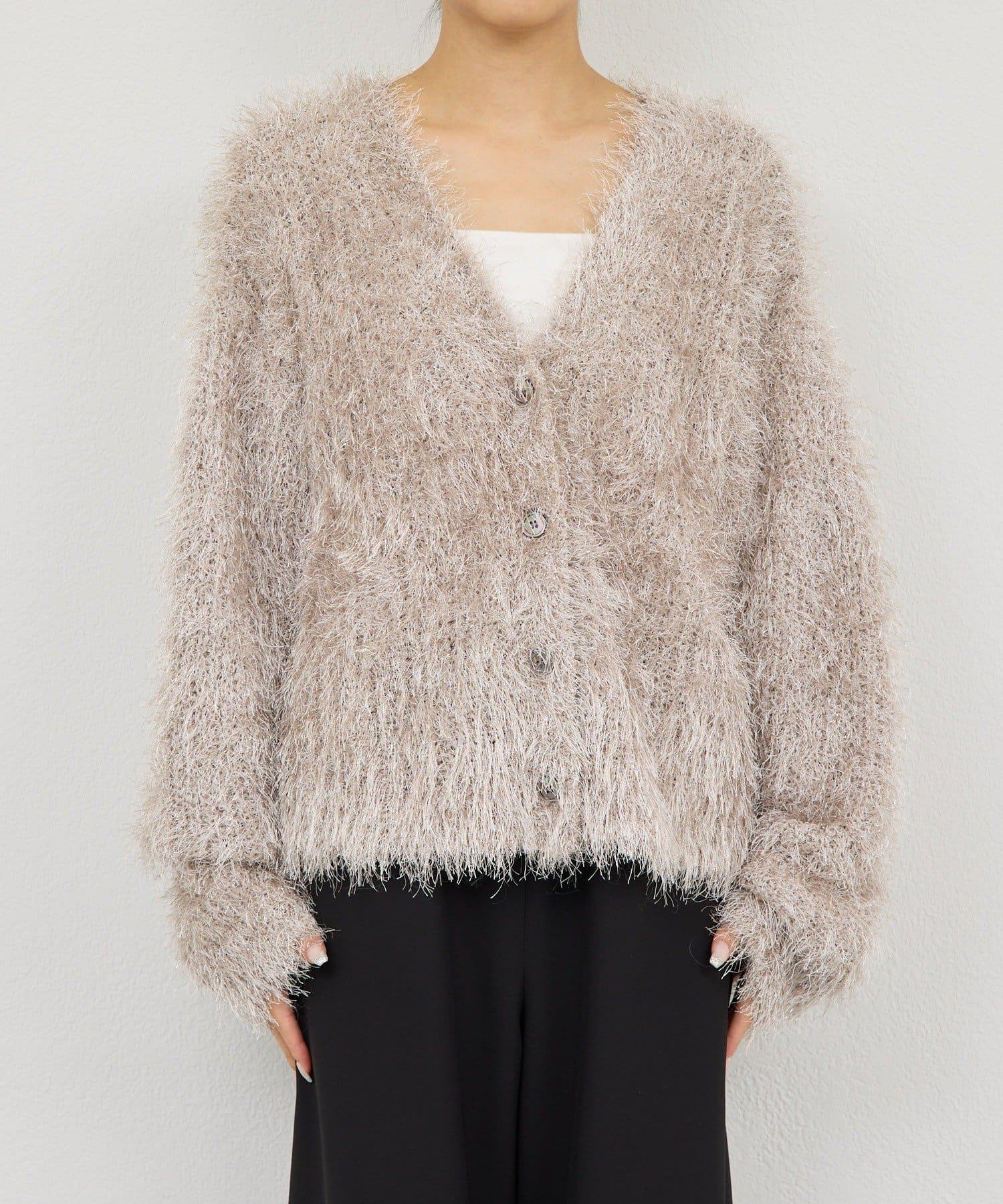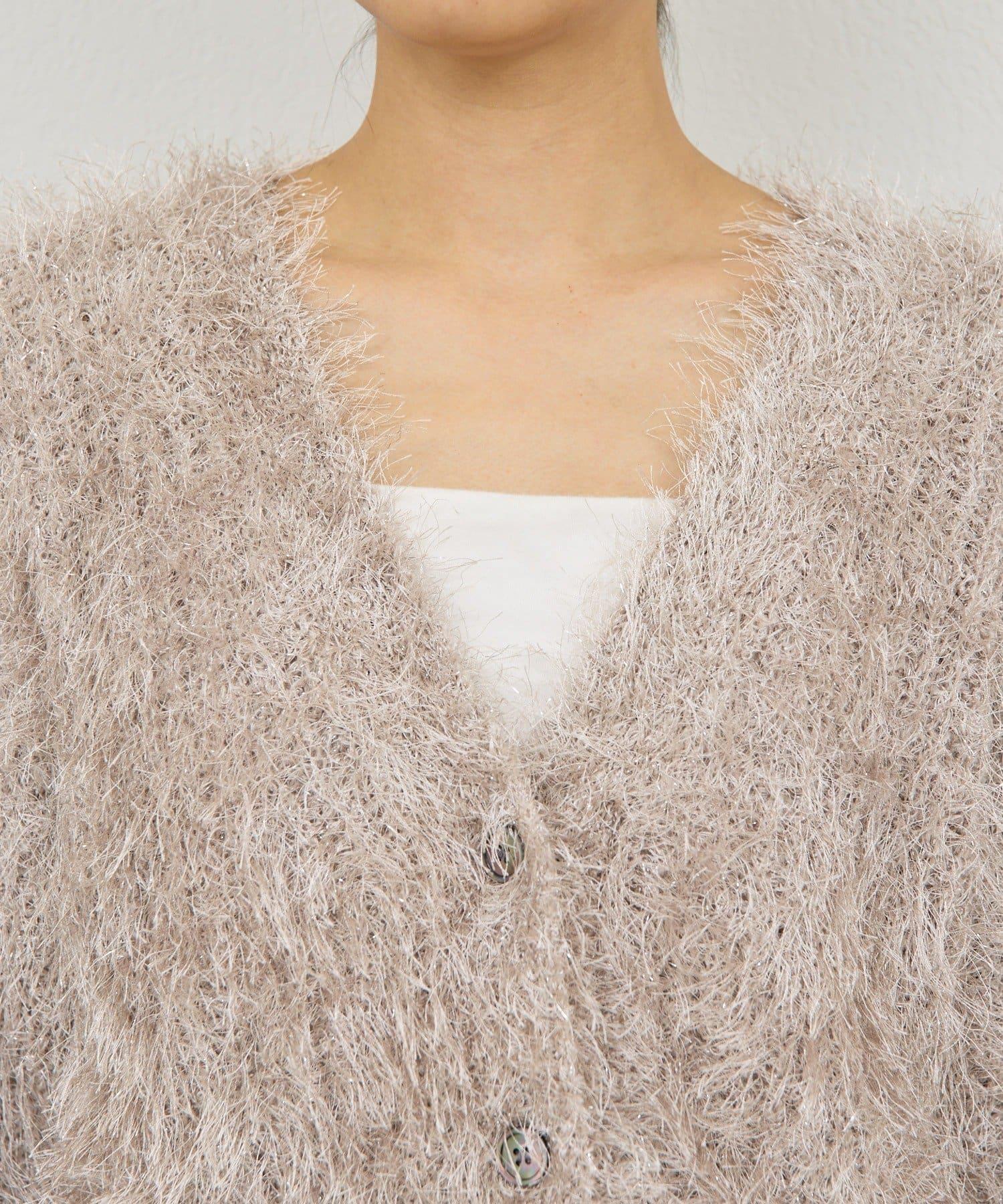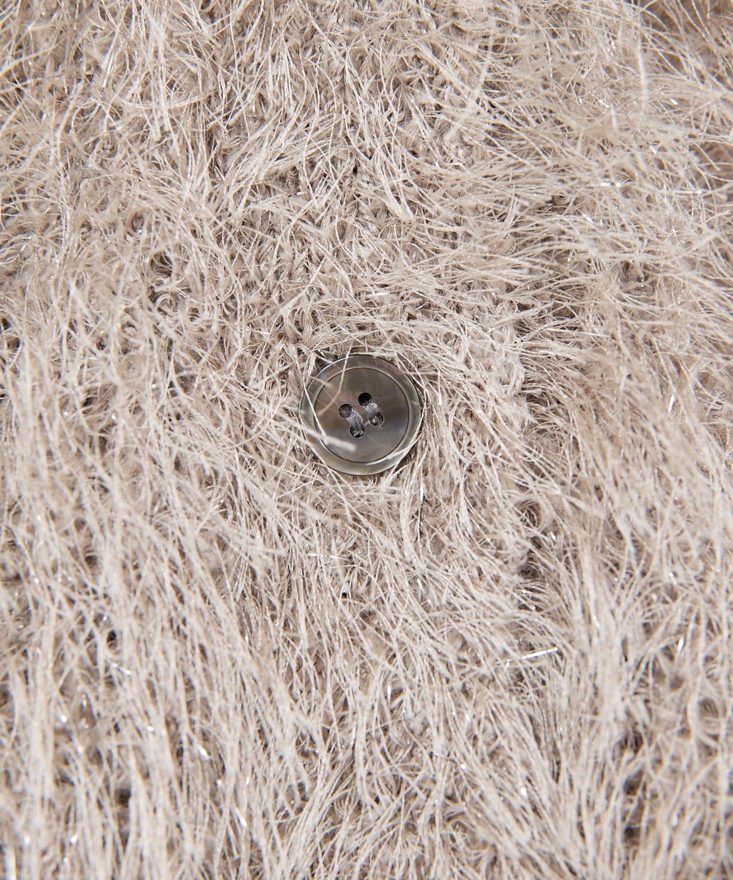 針織開衫上飾有微妙的薄片和長長的絨毛。