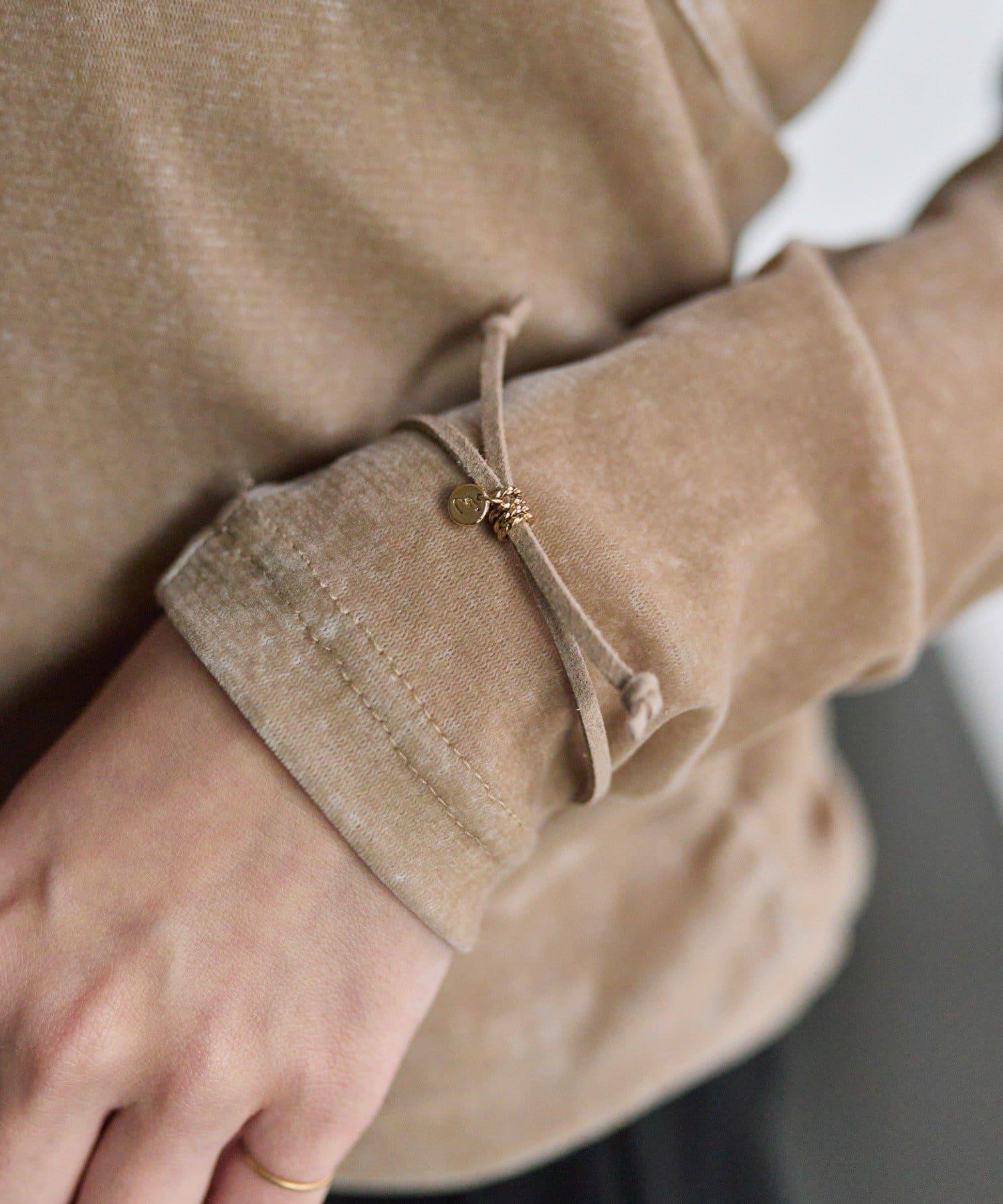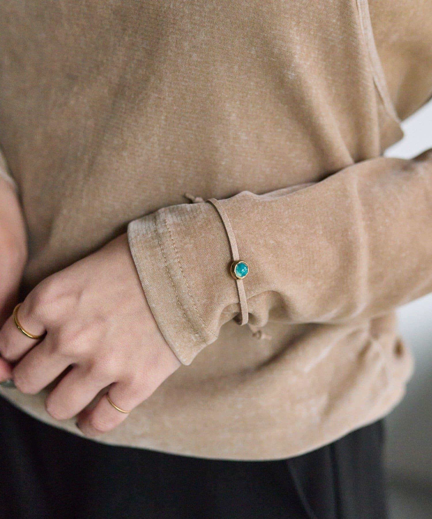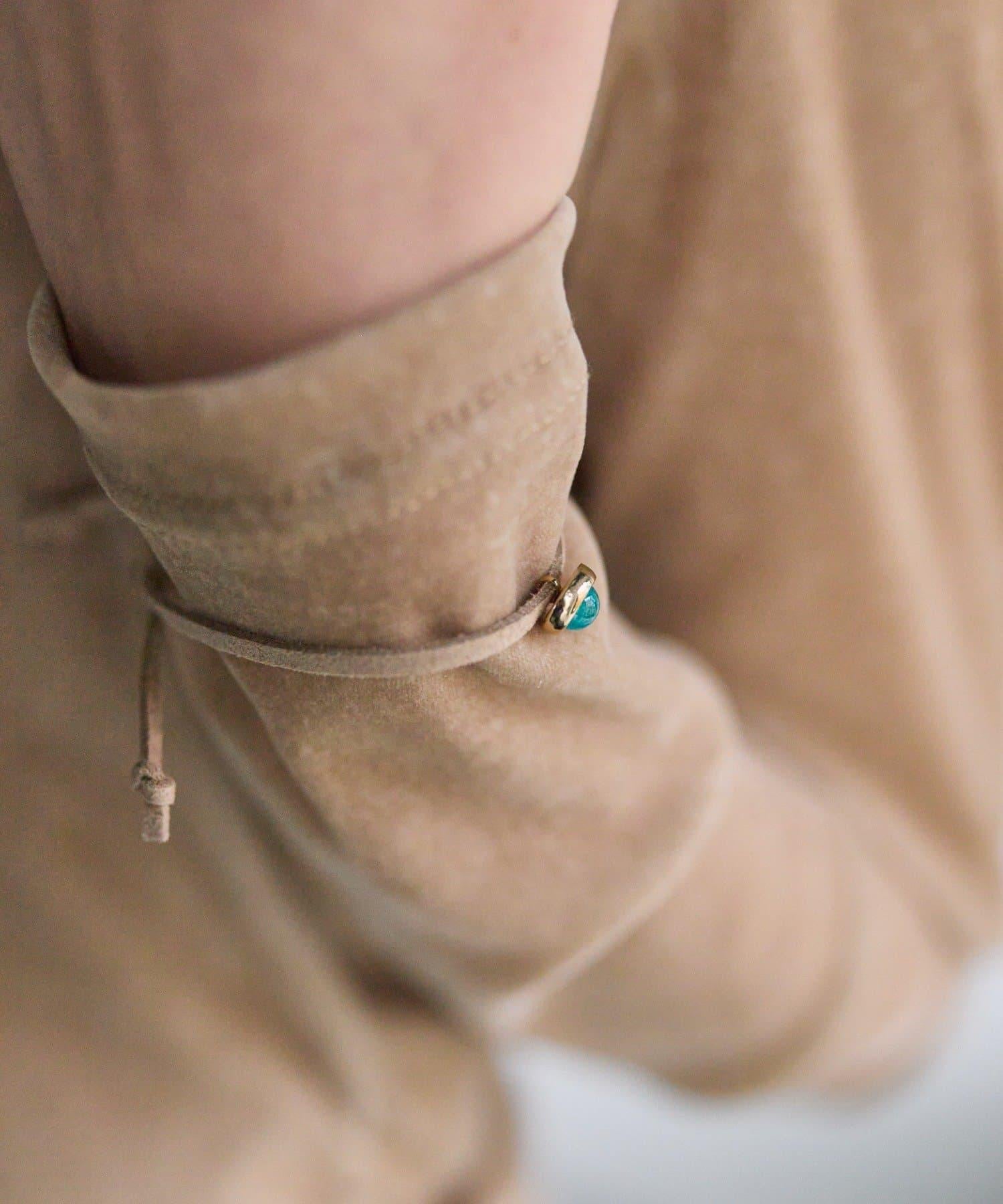 為手部增添微妙的光澤。彩色凸圓形小手鐲 "配麂皮帶。