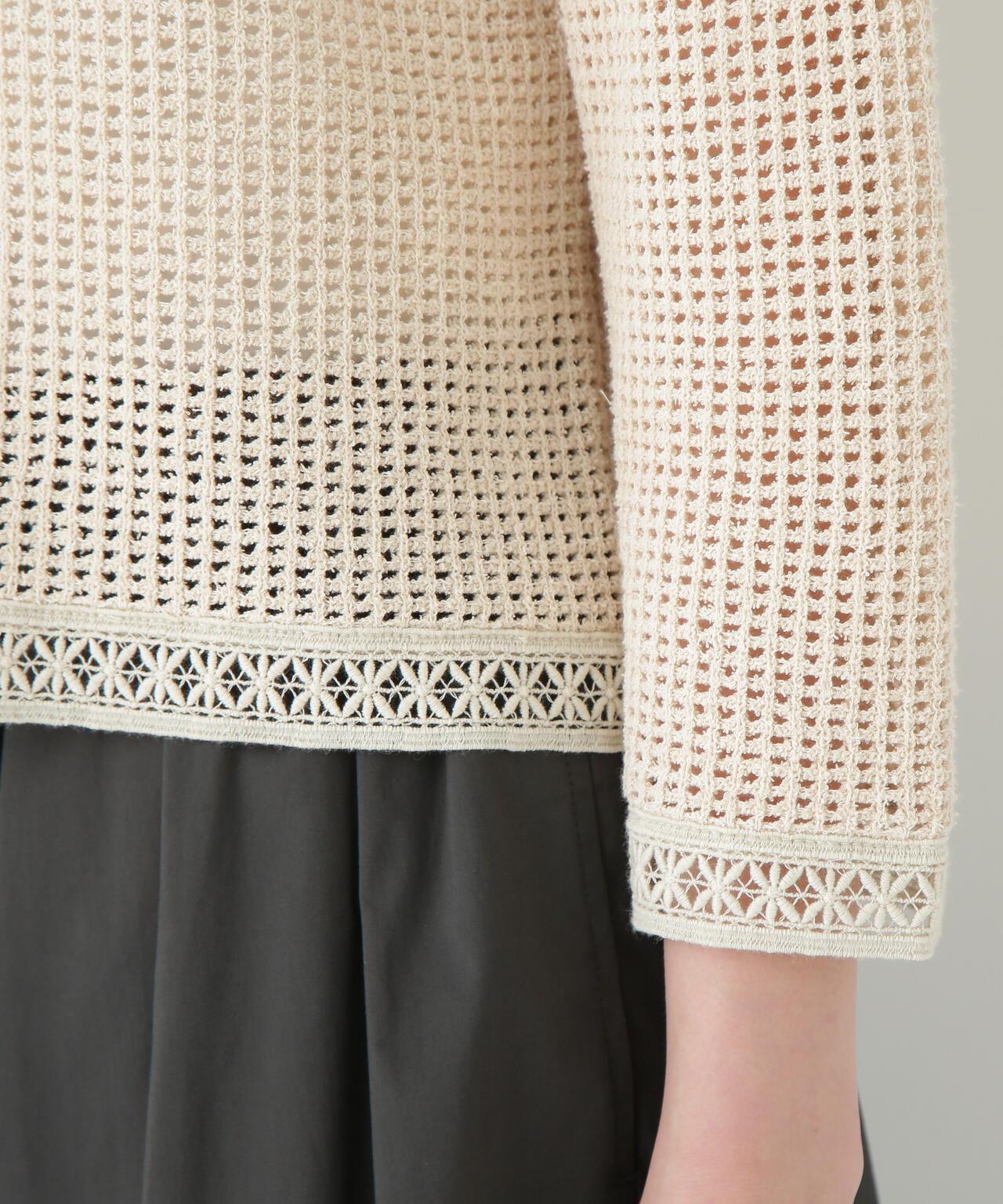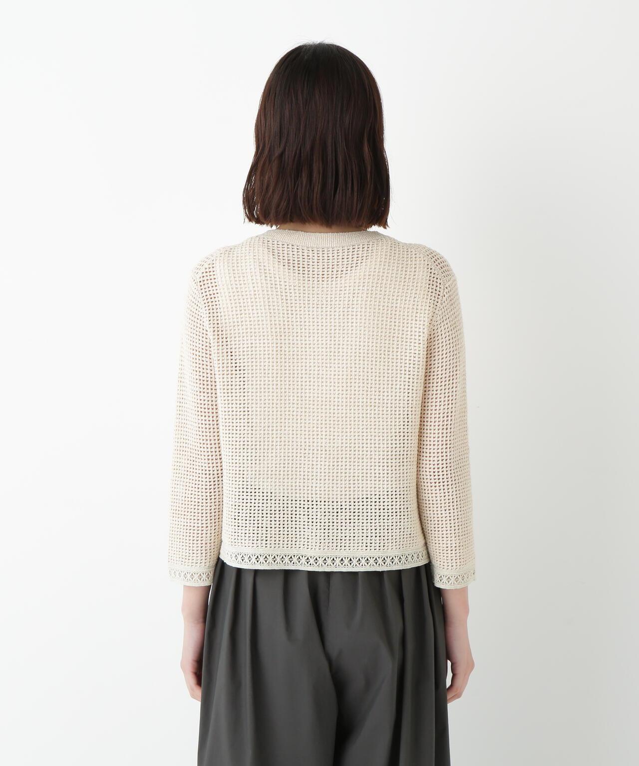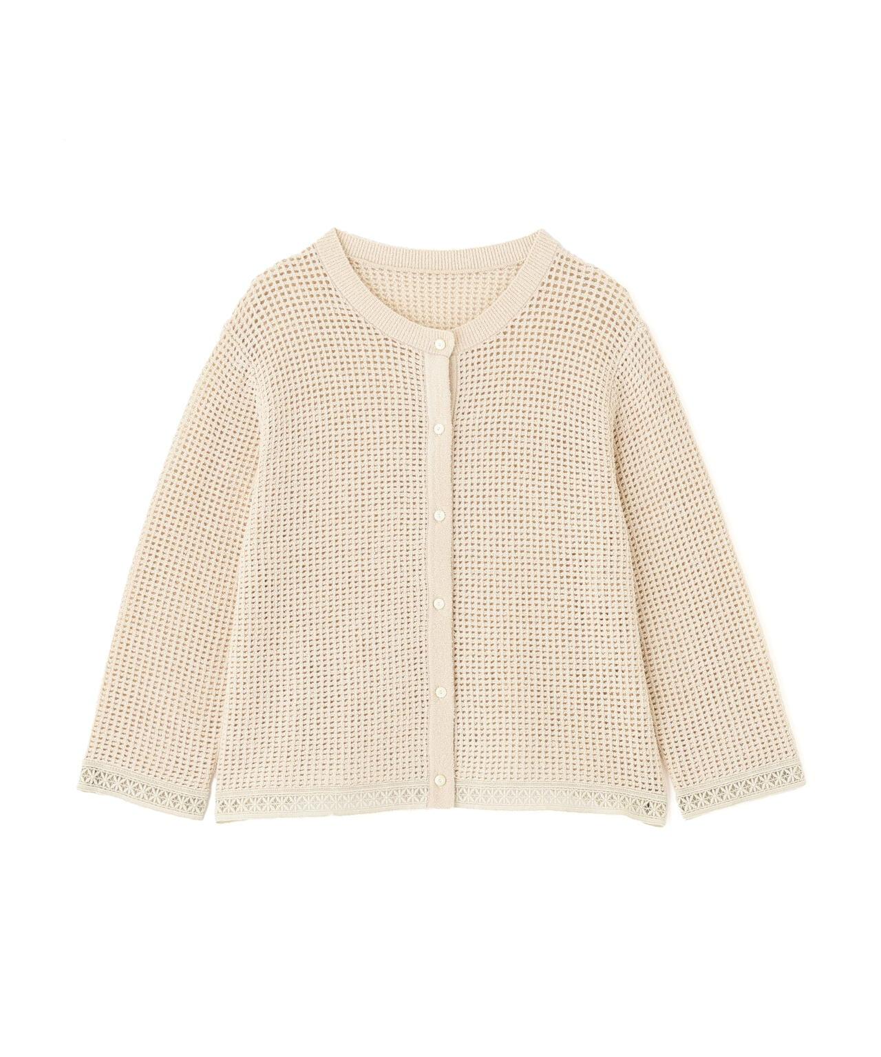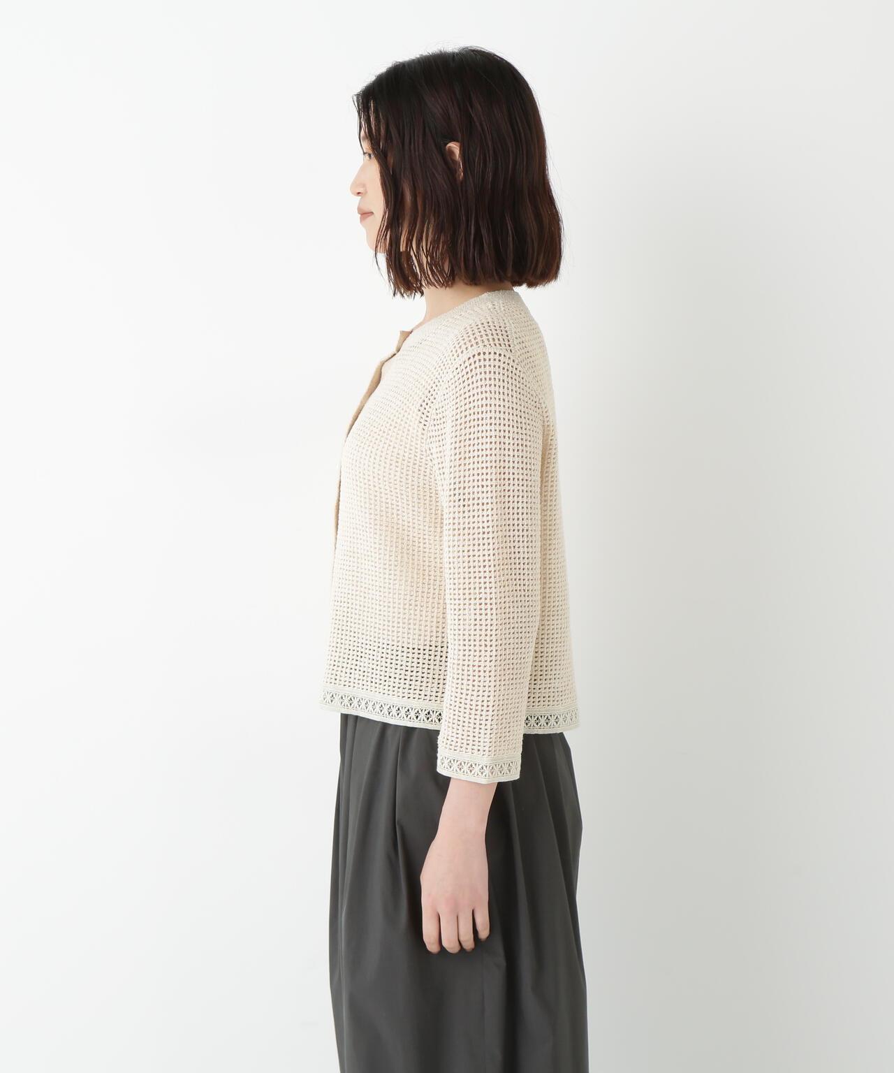 具有醒目網眼 3D 效果的布克萊針織開衫 [設計要點] 這款圓領開衫是通過將直紗和布克萊紗拉在一起編織成網眼的。儘管針數較高,但手感並不平整。袖口和下襬採用棉質蕾絲打毛處理。鏤空針織圖案類似鉤針,質地輕盈。輕盈的表面處理給人一種啞光的感覺。這款開衫的短款設計使其可以像長衫一樣穿著。通過與薄型剪裁縫製的服裝疊穿,可以突出網眼布的凹凸紋理。