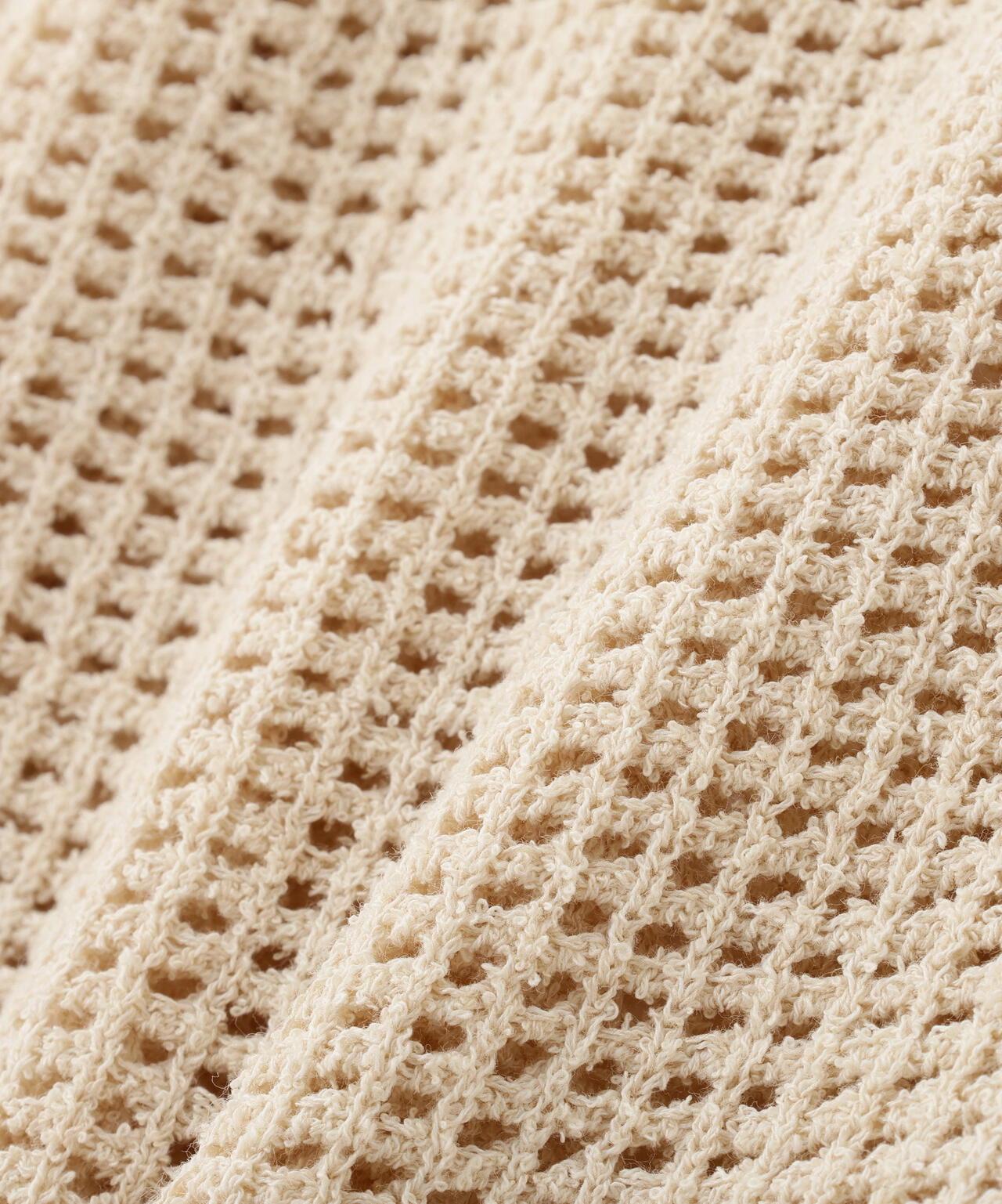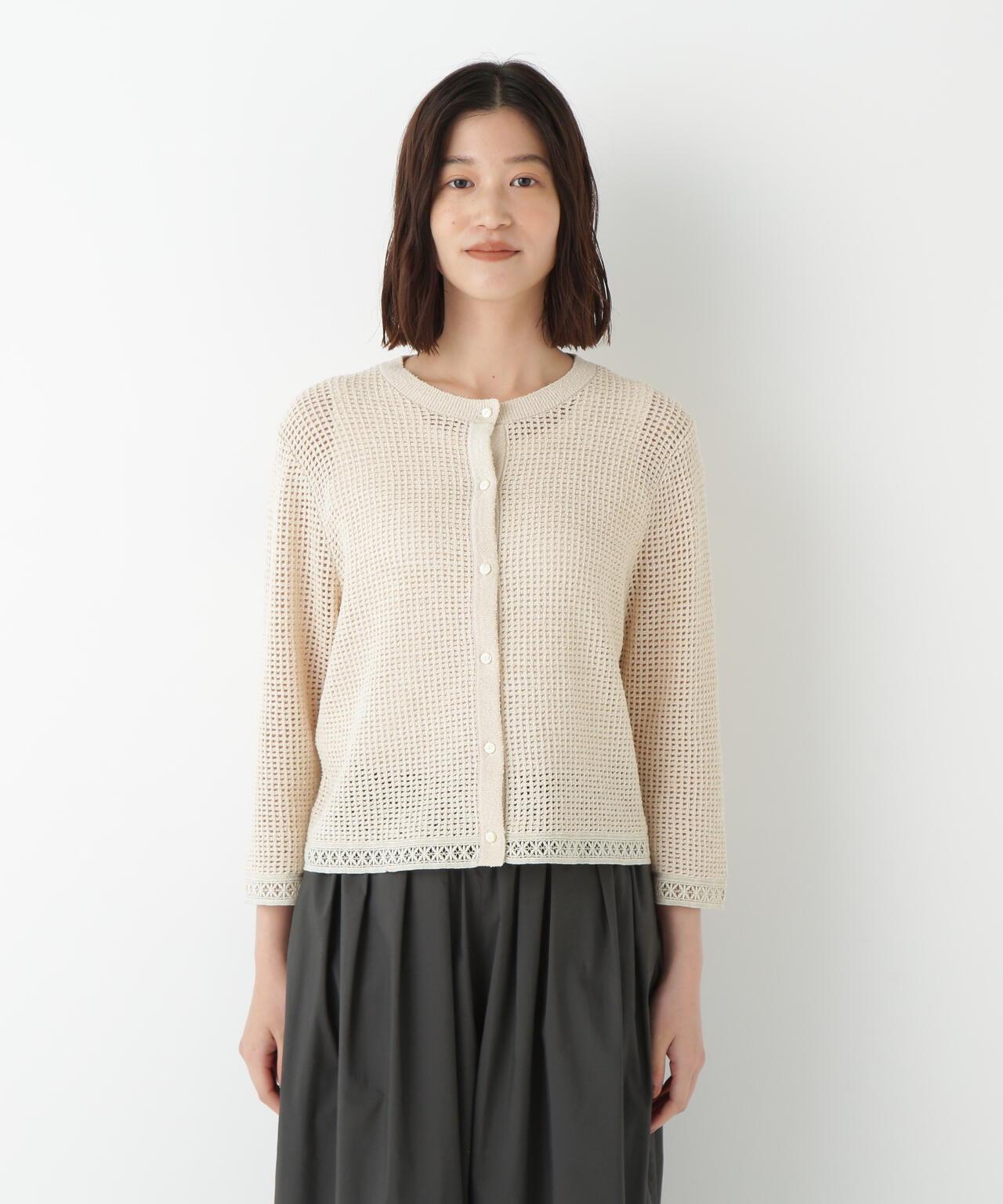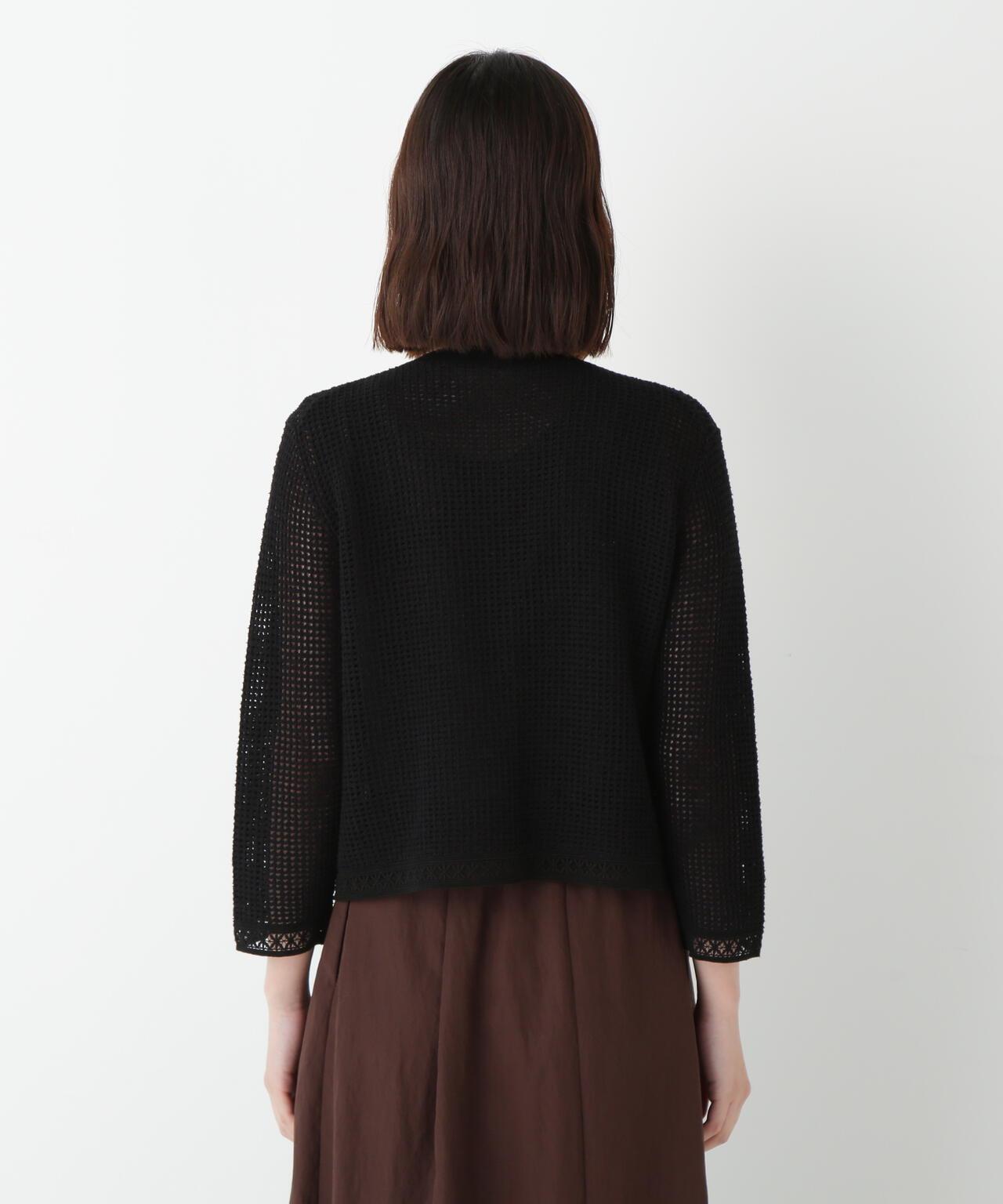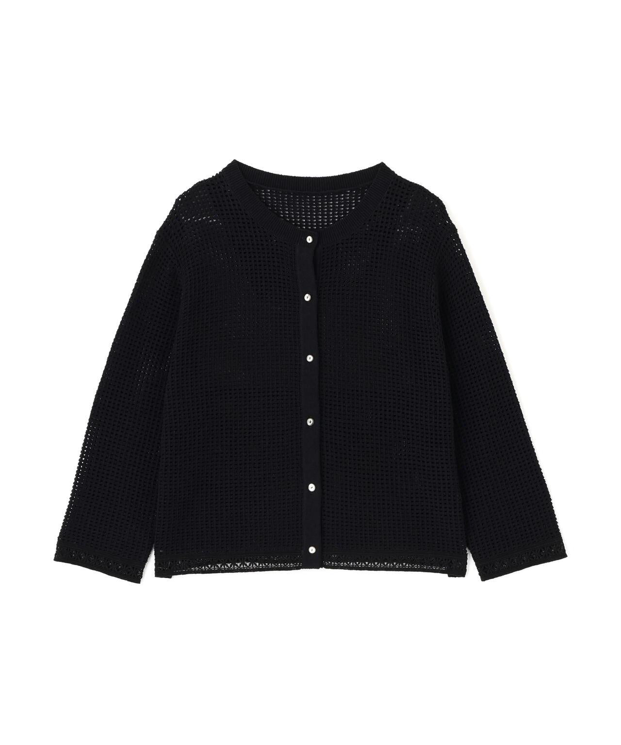 具有醒目網眼 3D 效果的布克萊針織開衫 [設計要點] 這款圓領開衫是通過將直紗和布克萊紗拉在一起編織成網眼的。儘管針數較高,但手感並不平整。袖口和下襬採用棉質蕾絲打毛處理。鏤空針織圖案類似鉤針,質地輕盈。輕盈的表面處理給人一種啞光的感覺。這款開衫的短款設計使其可以像長衫一樣穿著。通過與薄型剪裁縫製的服裝疊穿,可以突出網眼布的凹凸紋理。