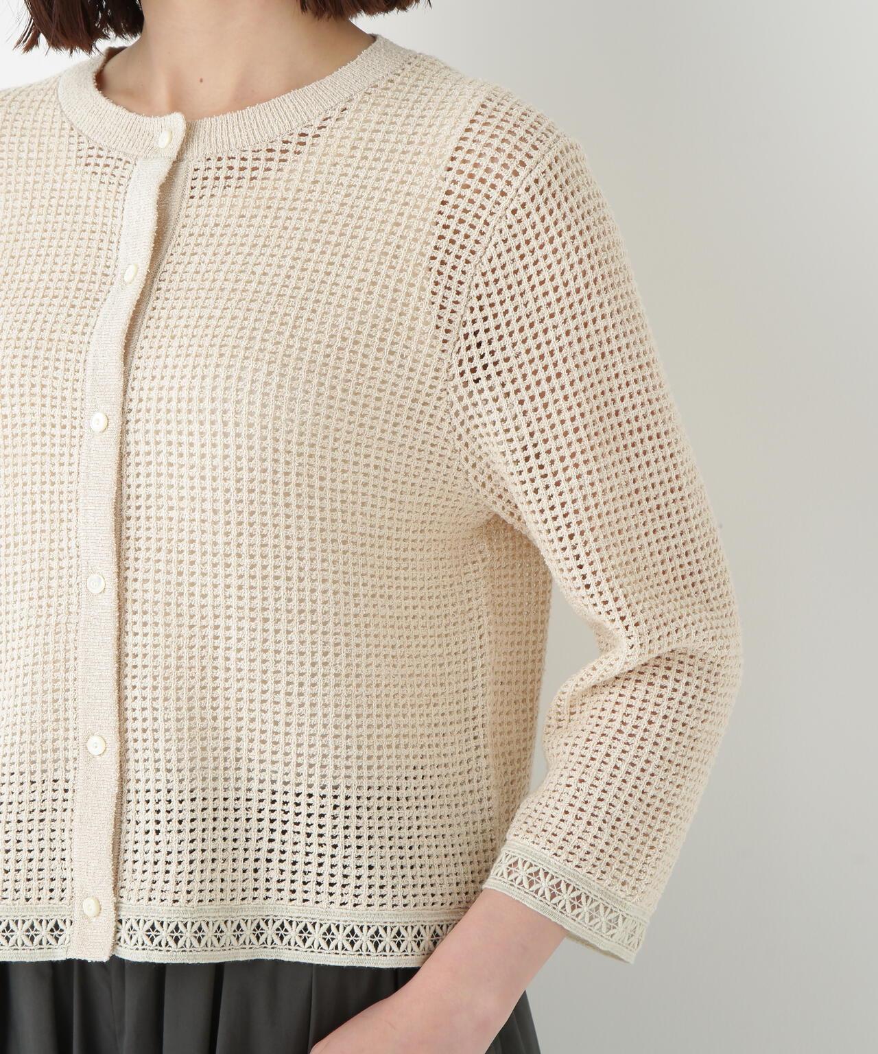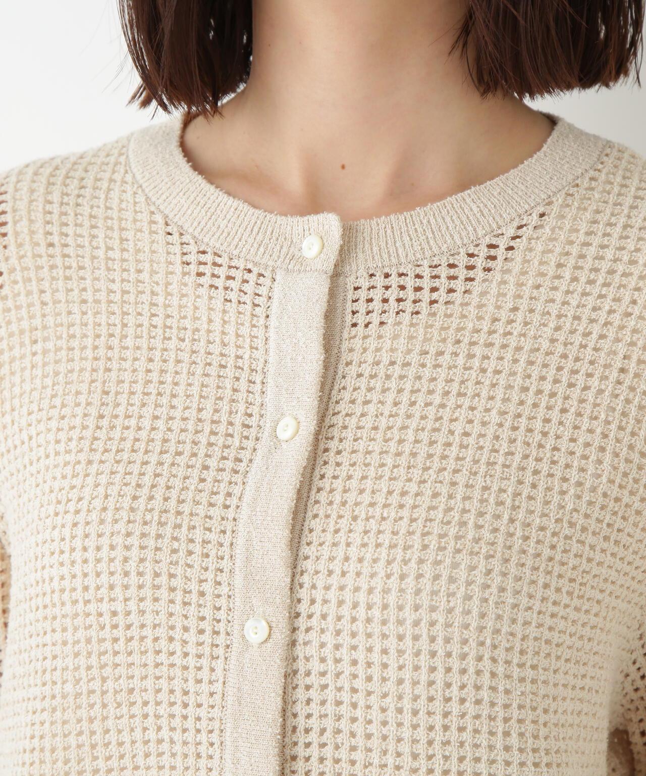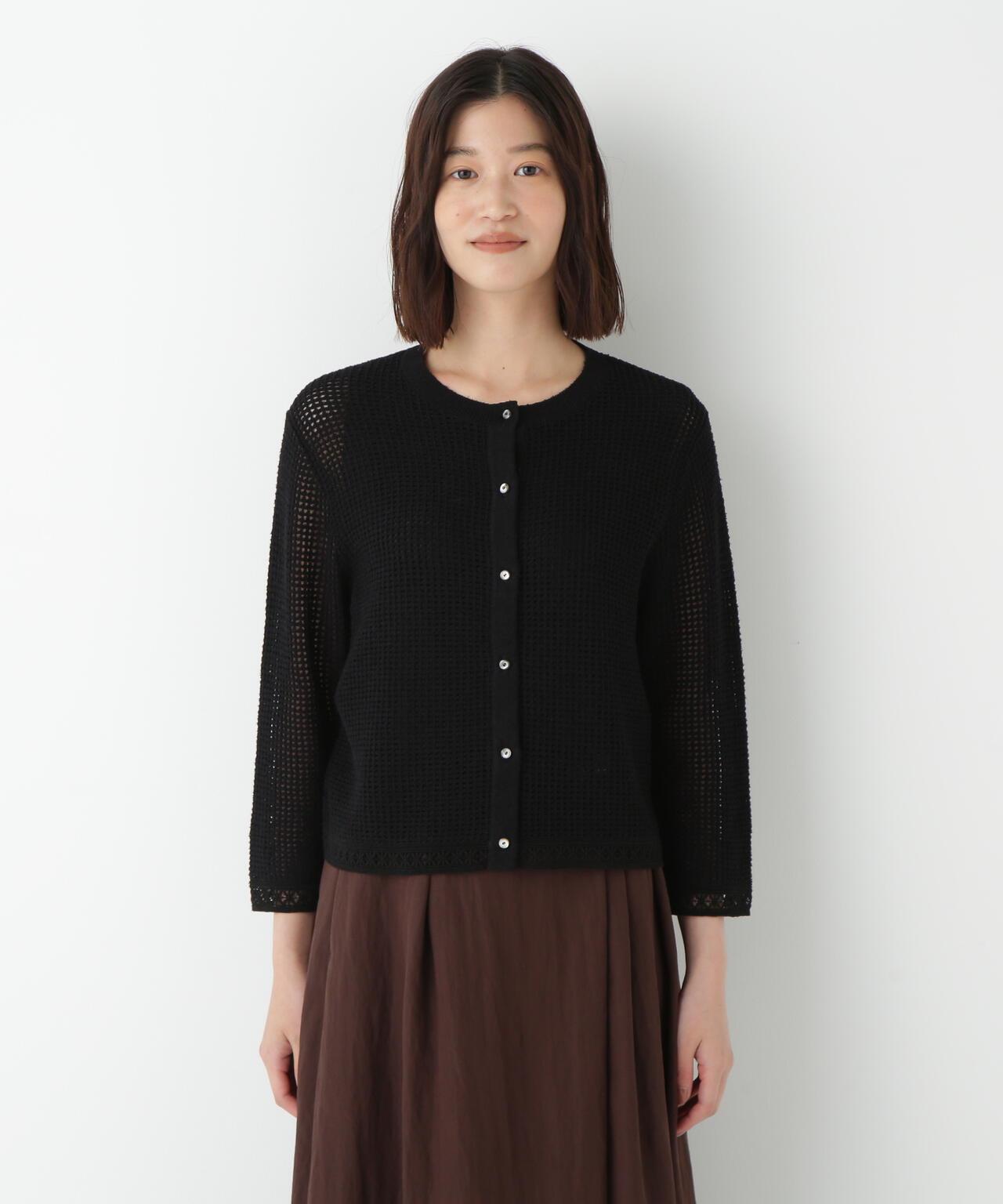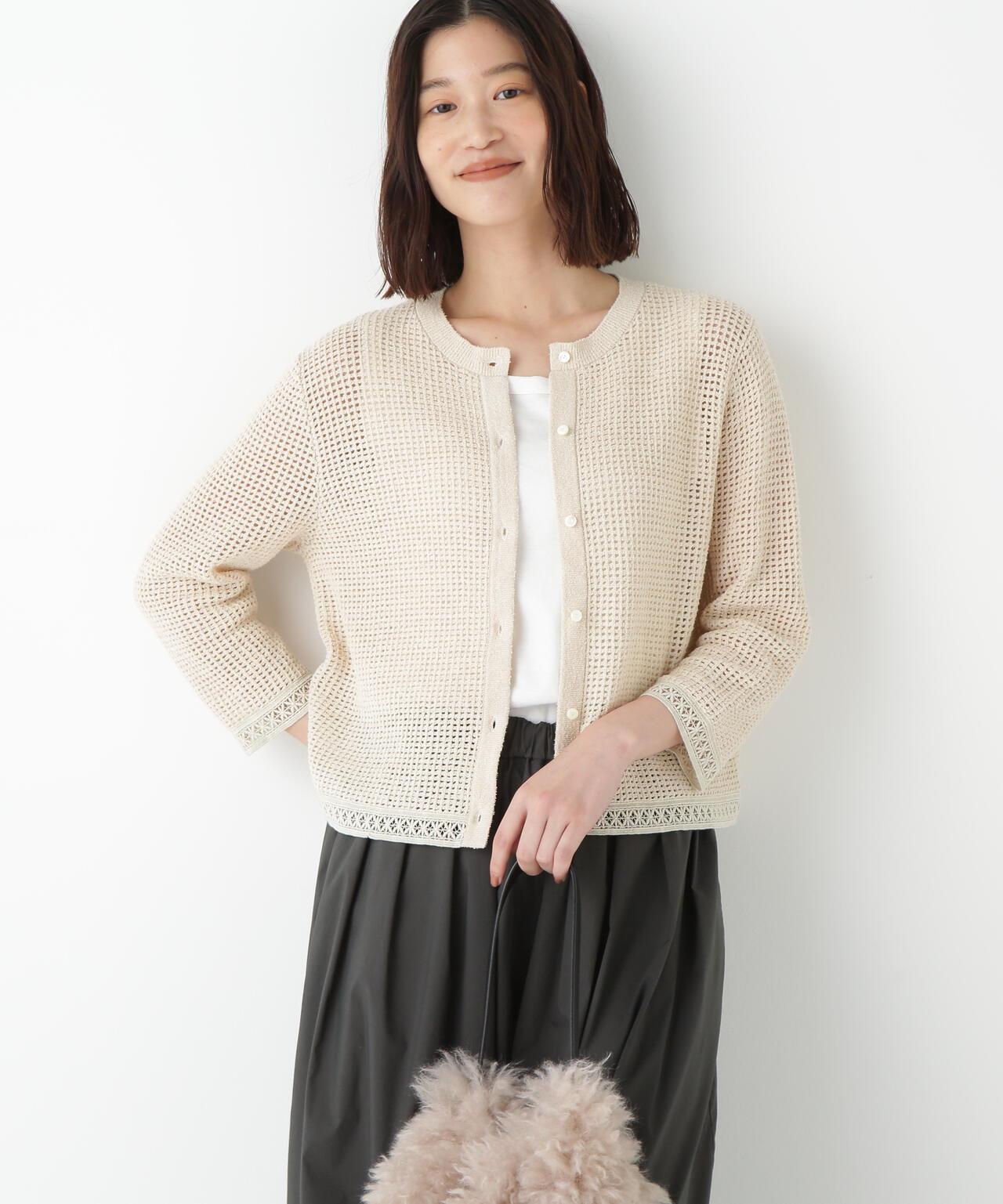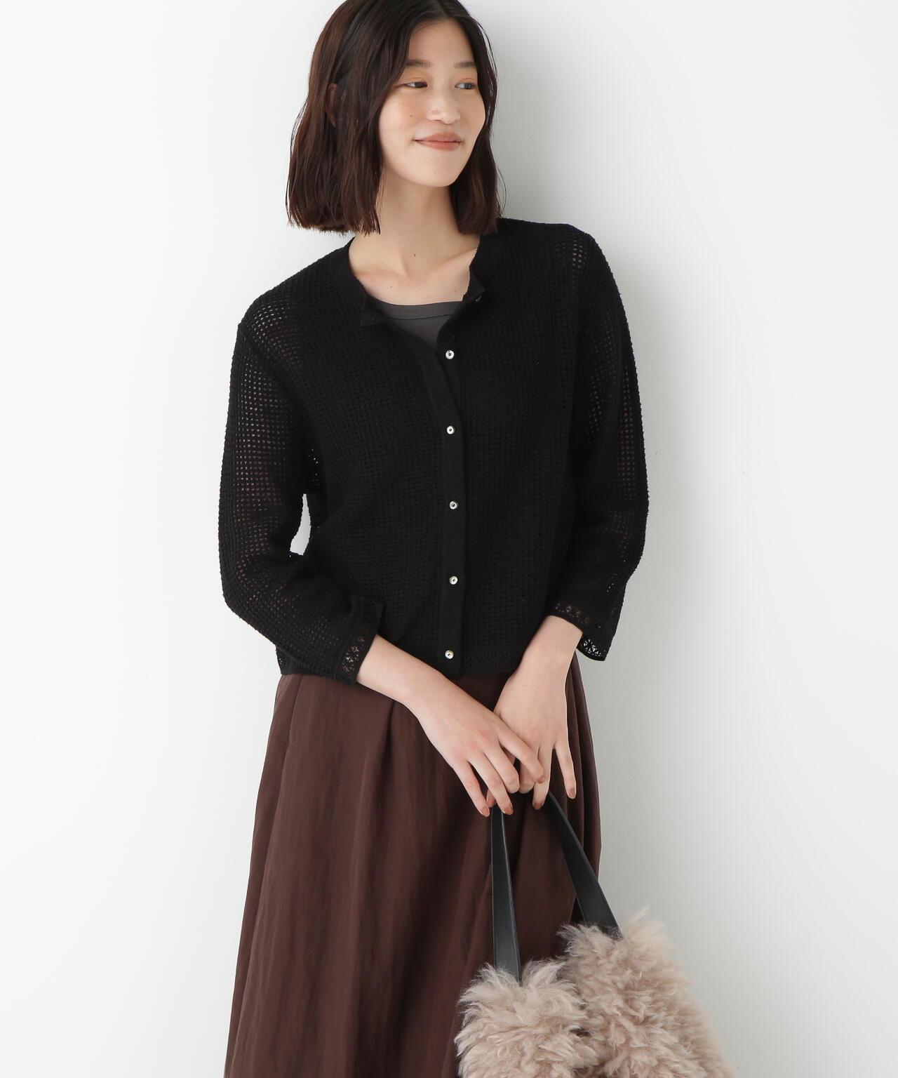 具有醒目網眼 3D 效果的布克萊針織開衫 [設計要點] 這款圓領開衫是通過將直紗和布克萊紗拉在一起編織成網眼的。儘管針數較高,但手感並不平整。袖口和下襬採用棉質蕾絲打毛處理。鏤空針織圖案類似鉤針,質地輕盈。輕盈的表面處理給人一種啞光的感覺。這款開衫的短款設計使其可以像長衫一樣穿著。通過與薄型剪裁縫製的服裝疊穿,可以突出網眼布的凹凸紋理。