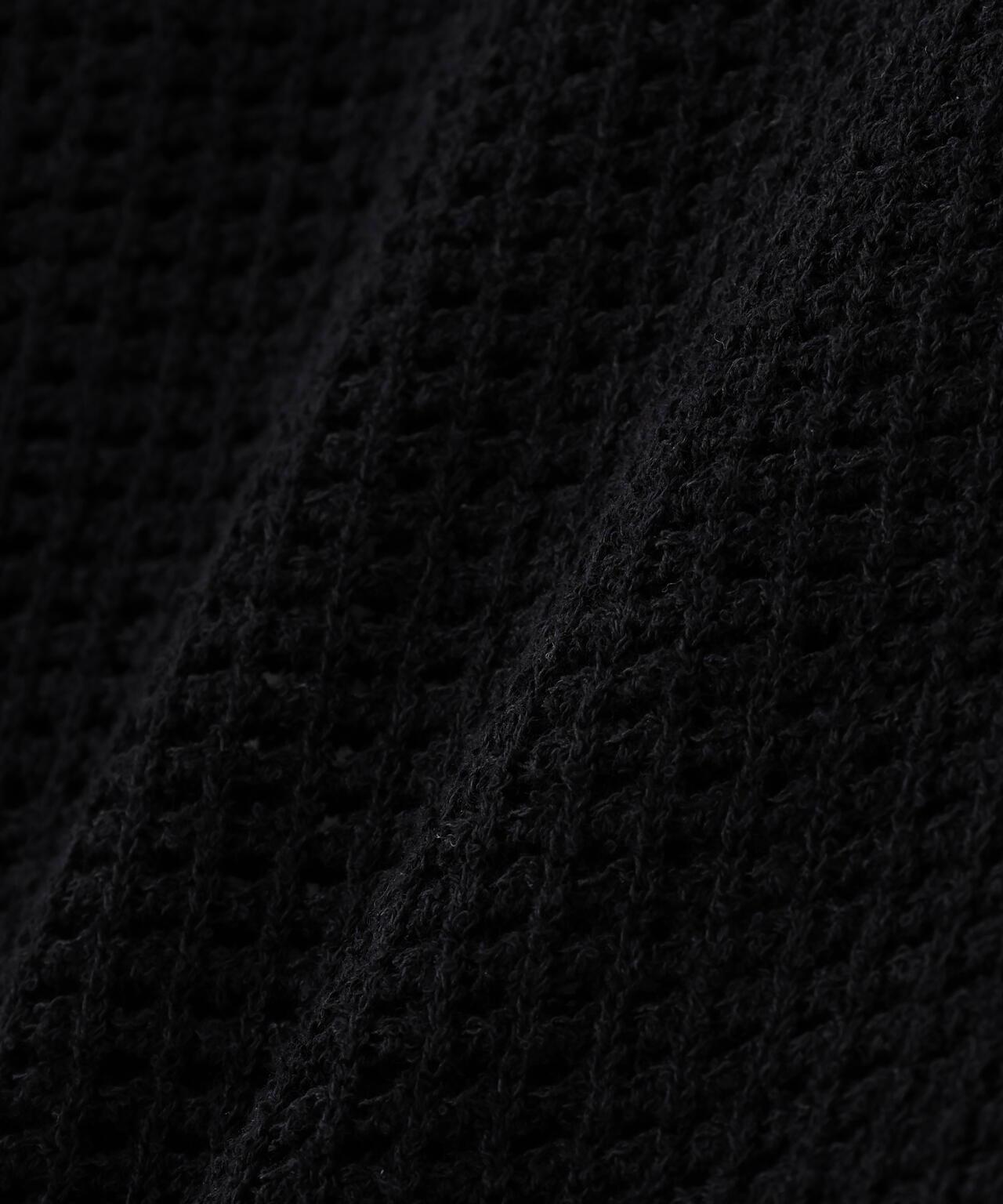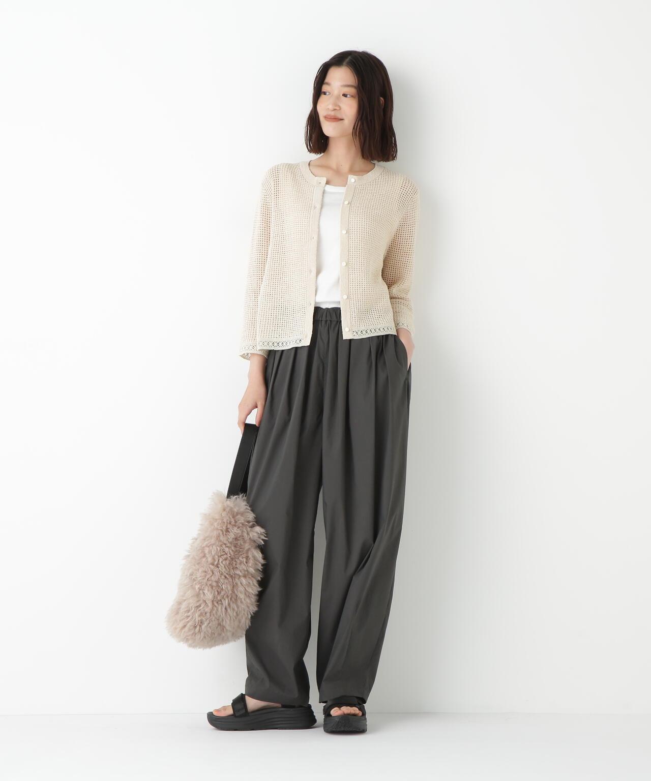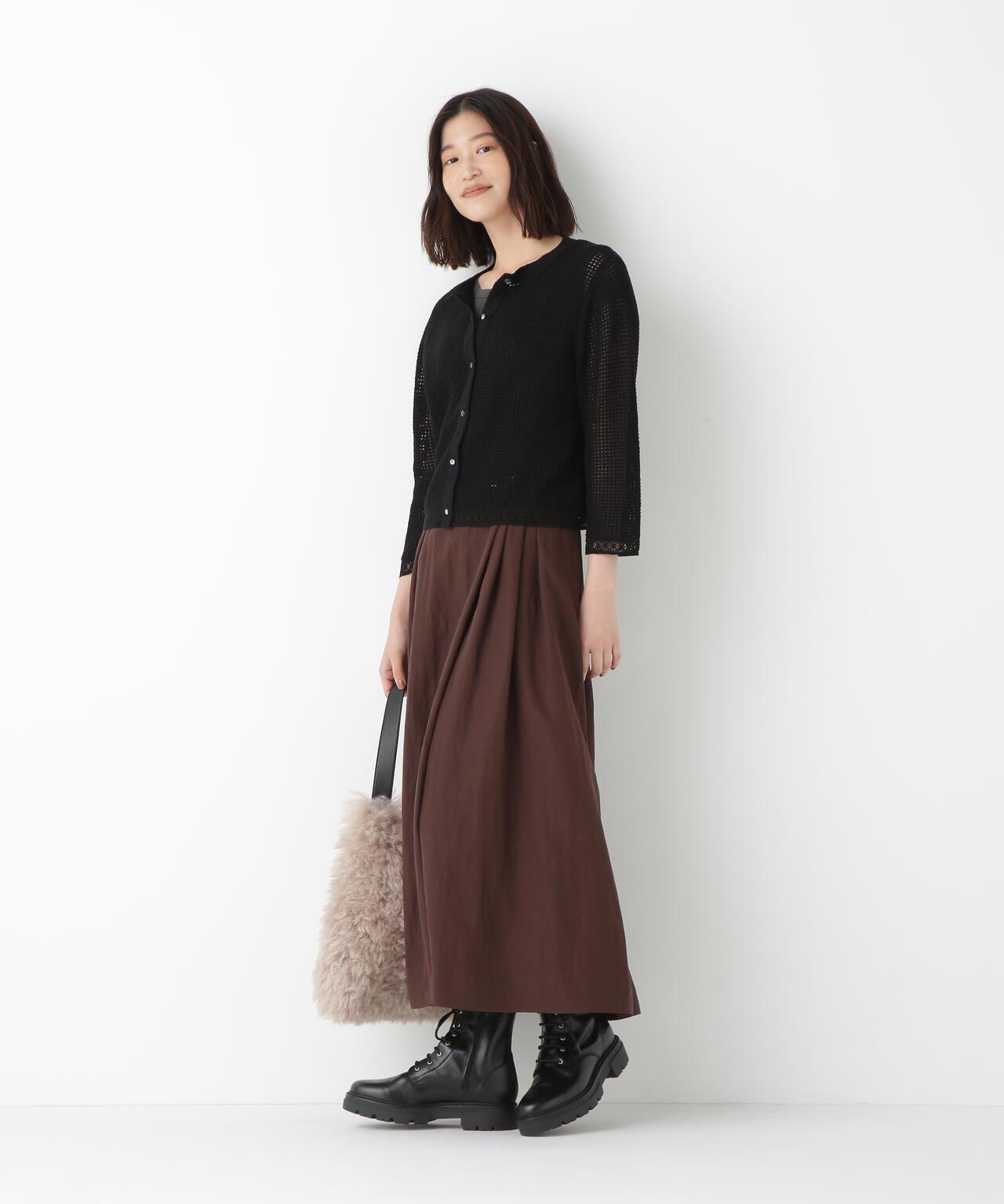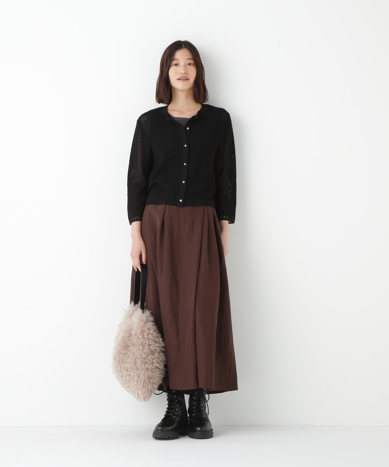 具有醒目網眼 3D 效果的布克萊針織開衫 [設計要點] 這款圓領開衫是通過將直紗和布克萊紗拉在一起編織成網眼的。儘管針數較高,但手感並不平整。袖口和下襬採用棉質蕾絲打毛處理。鏤空針織圖案類似鉤針,質地輕盈。輕盈的表面處理給人一種啞光的感覺。這款開衫的短款設計使其可以像長衫一樣穿著。通過與薄型剪裁縫製的服裝疊穿,可以突出網眼布的凹凸紋理。