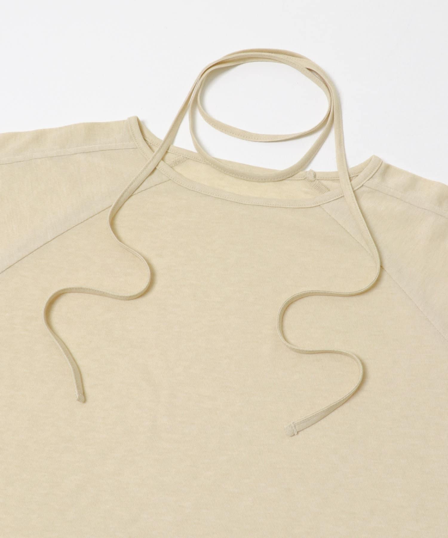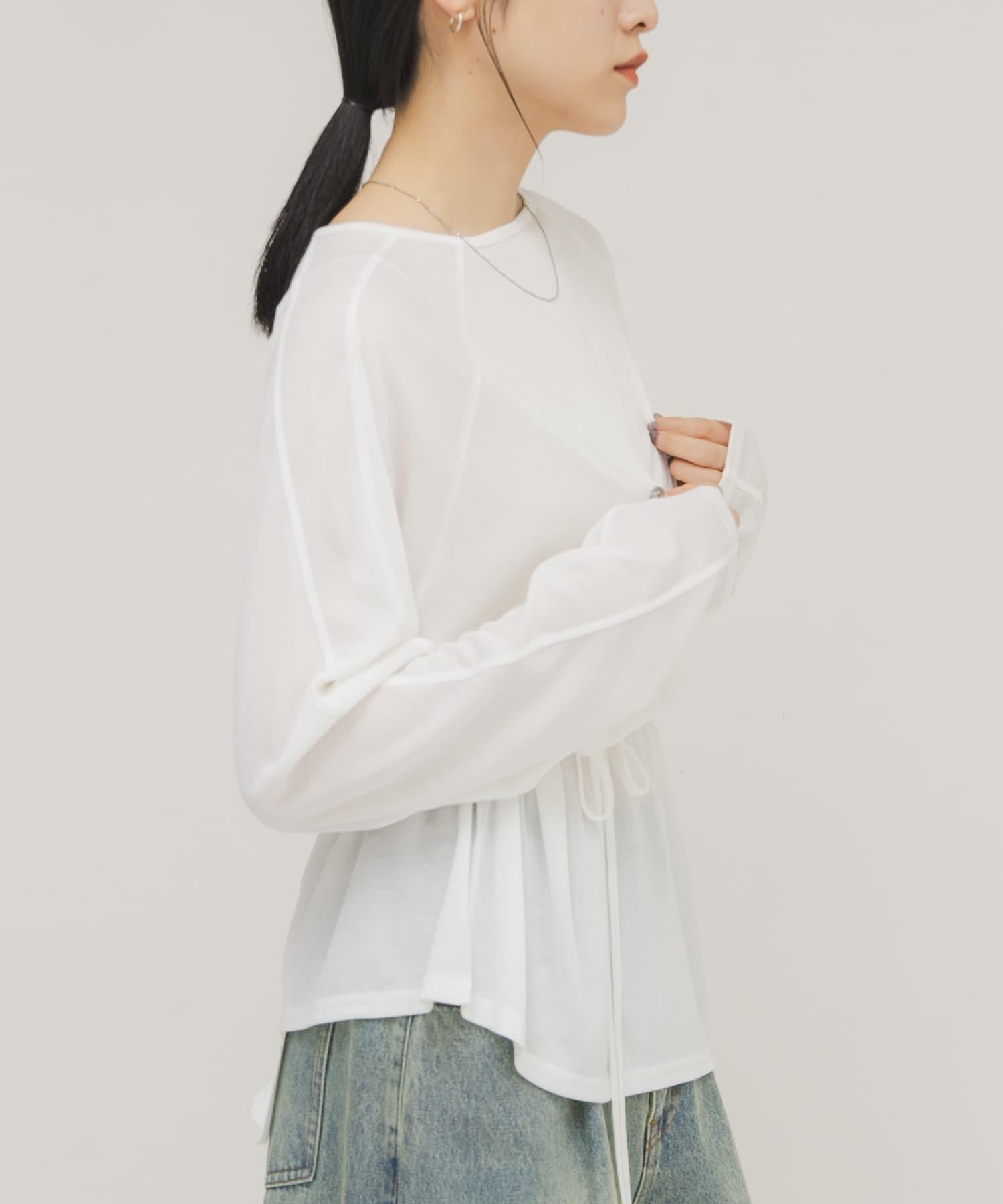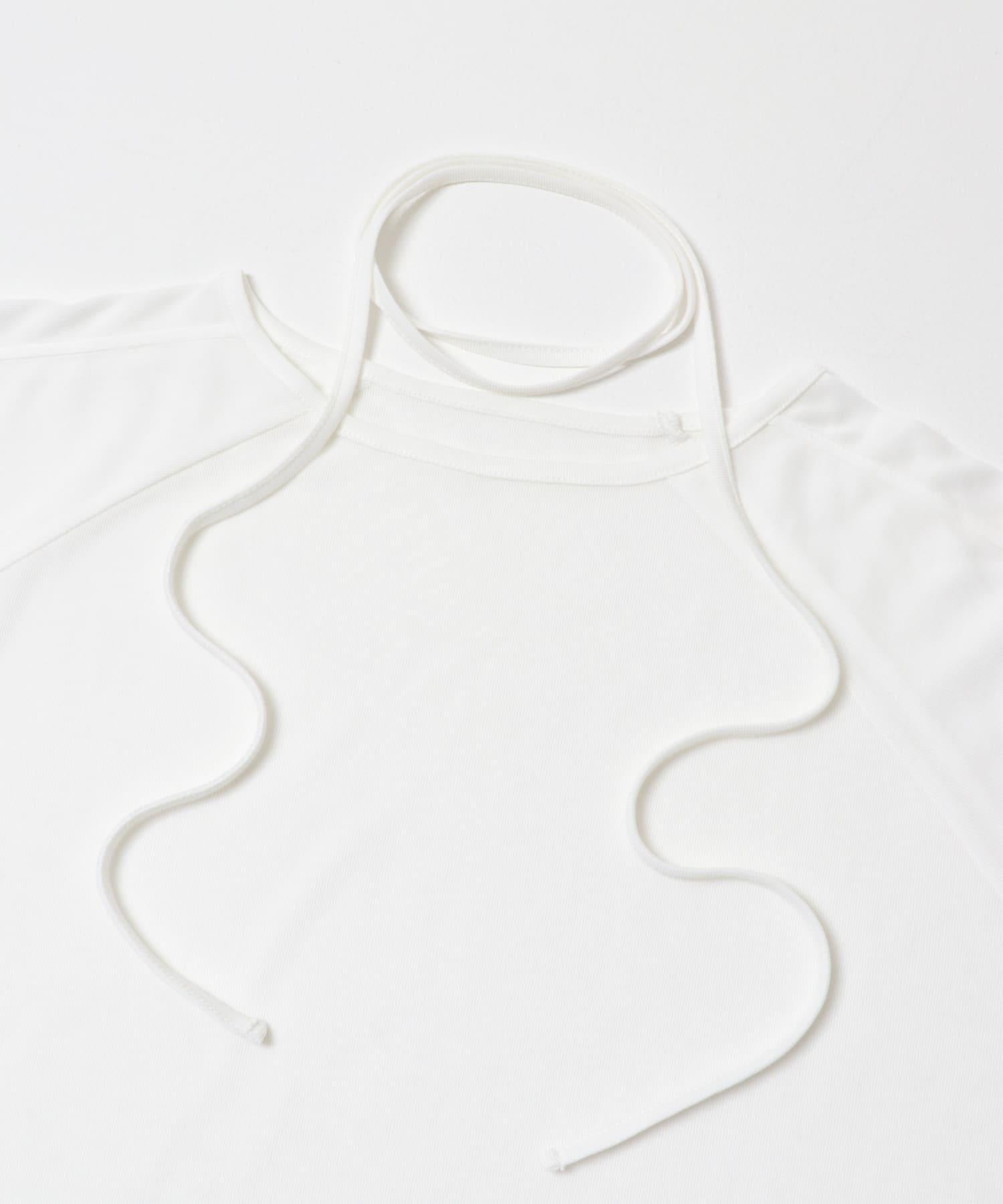 這款單品由一件透視剪接上衣和一組肩帶組成,透視剪接上衣採用輕盈怡人的面料製成。寬鬆的剪裁給人寬鬆的感覺,附帶的肩帶可以纏繞在腰間,也可以像choker一樣穿在身上。它很容易與各種下裝搭配。