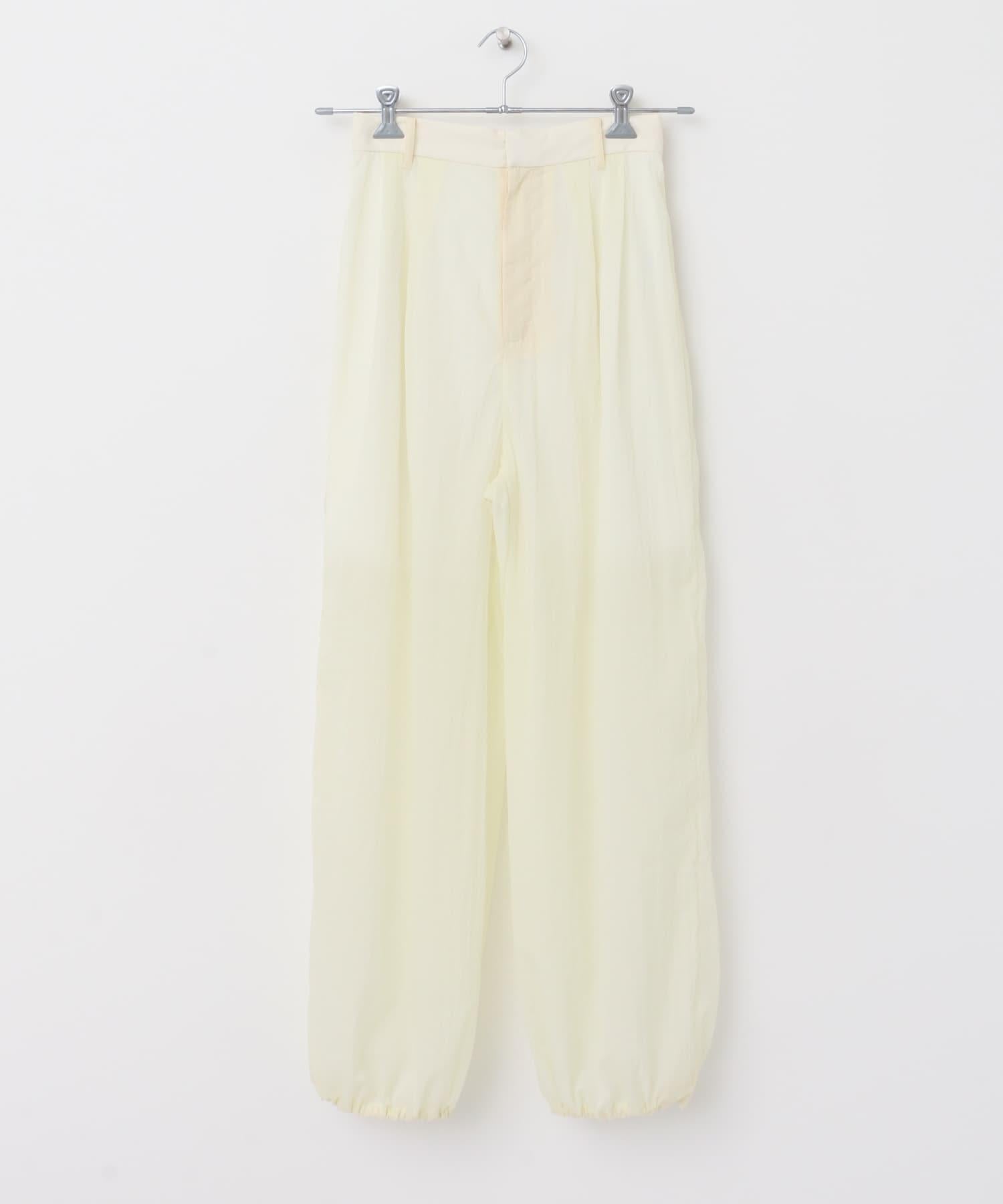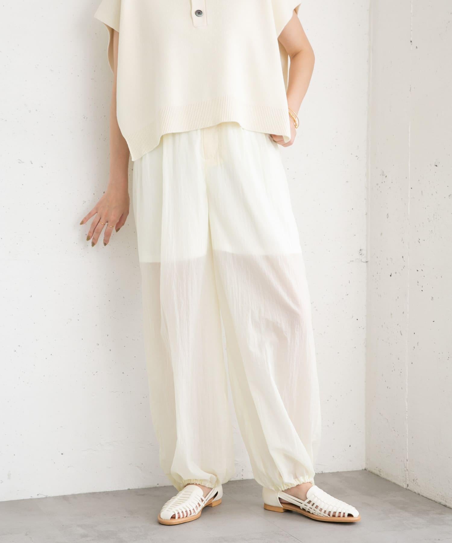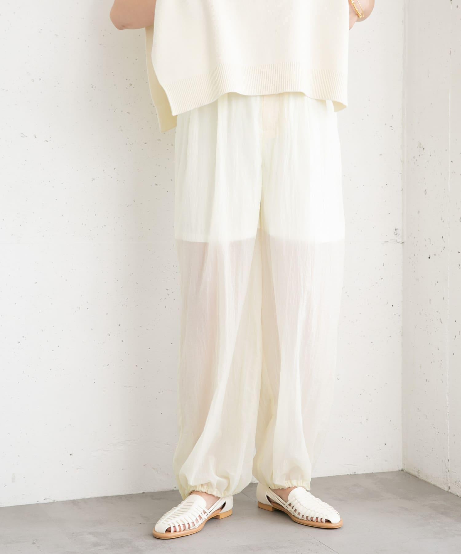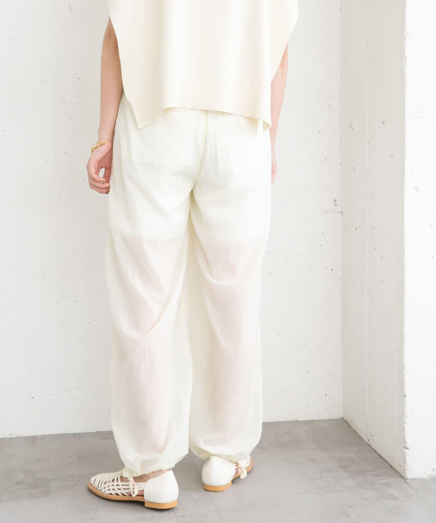長褲採用具有表面觸感的透視面料。下襬處的抽繩可讓您改變輪廓。襯裡長度超過膝蓋,設計讓您盡享透明感。
