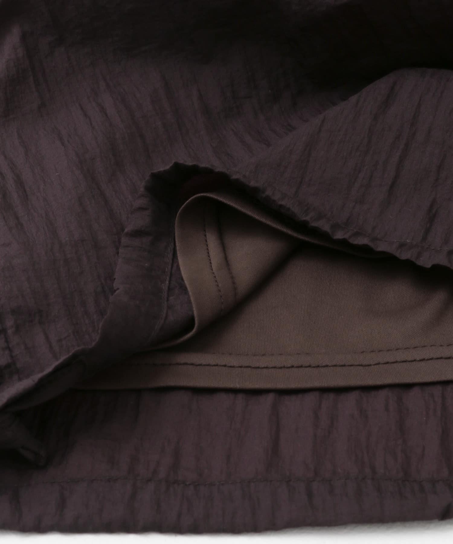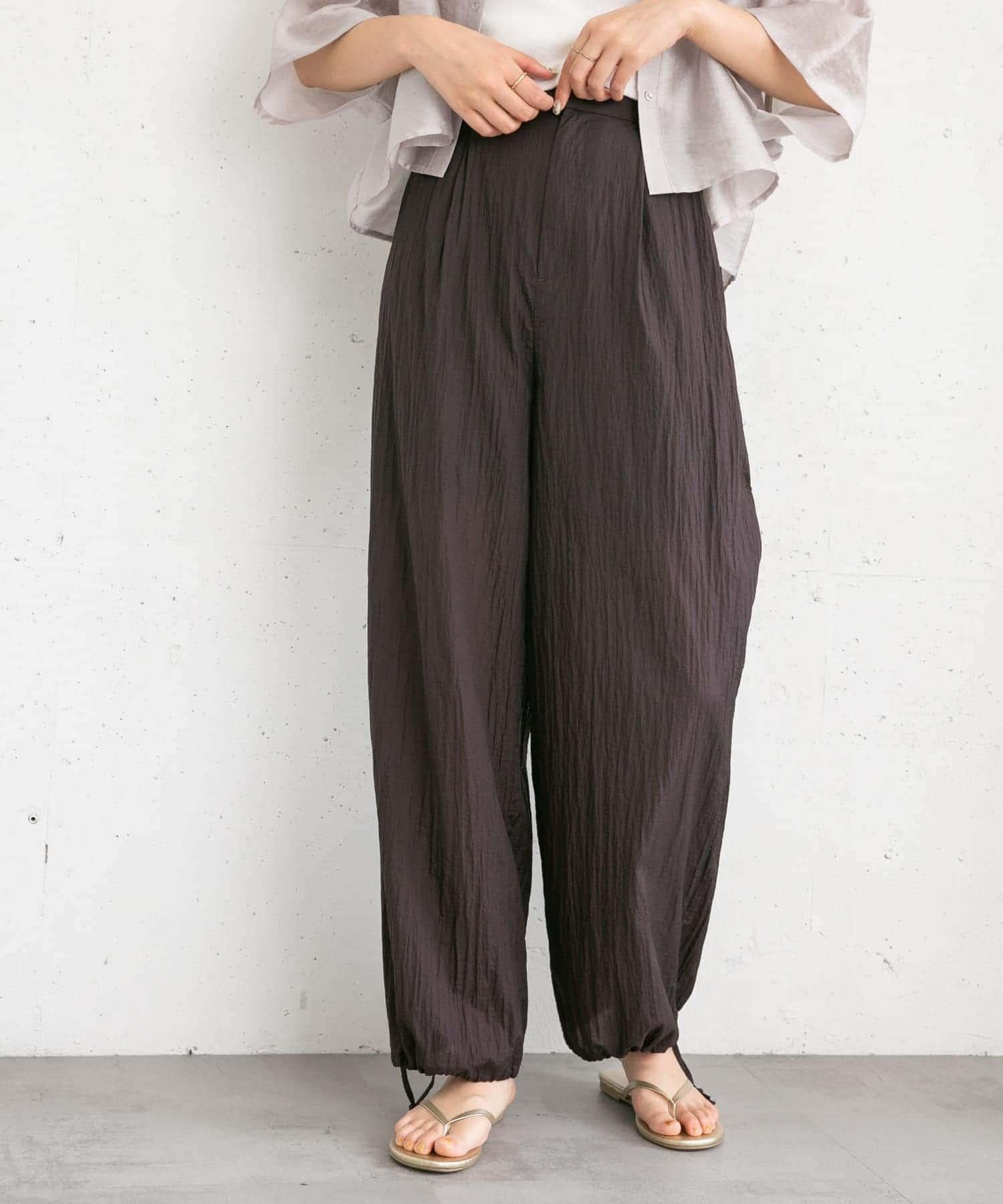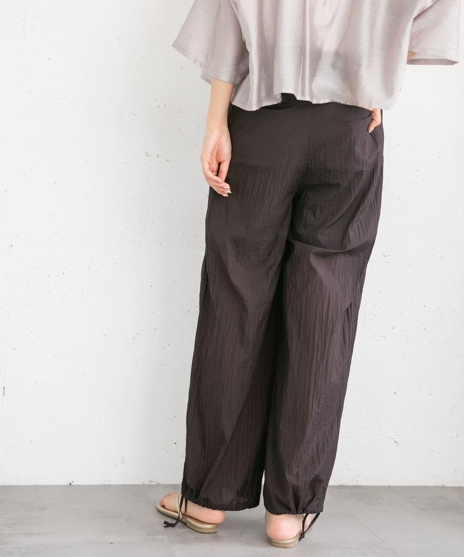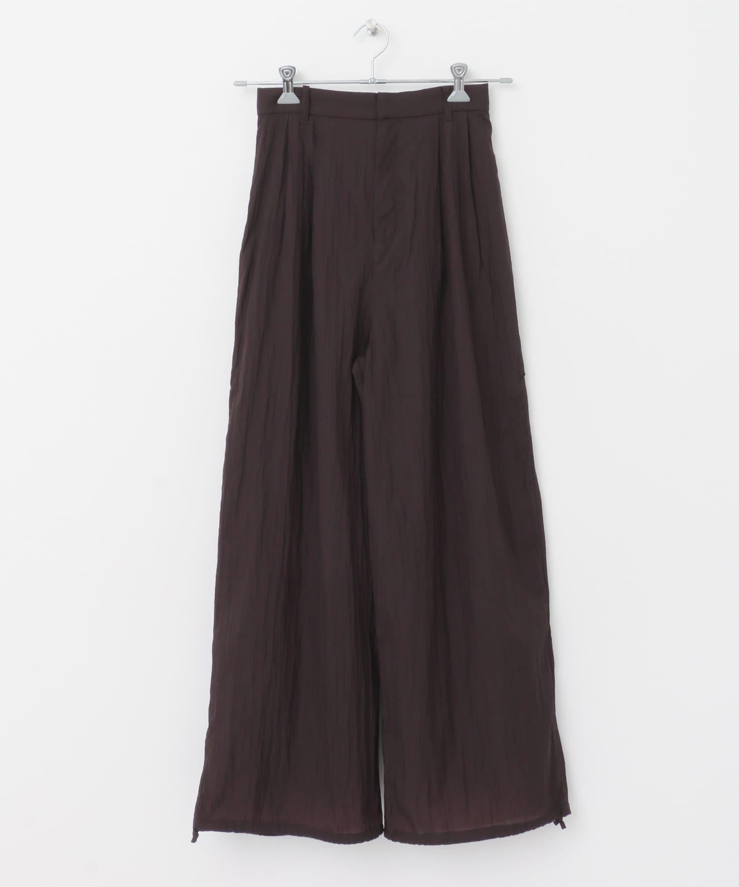 長褲採用具有表面觸感的透視面料。下襬處的抽繩可讓您改變輪廓。襯裡長度超過膝蓋,設計讓您盡享透明感。