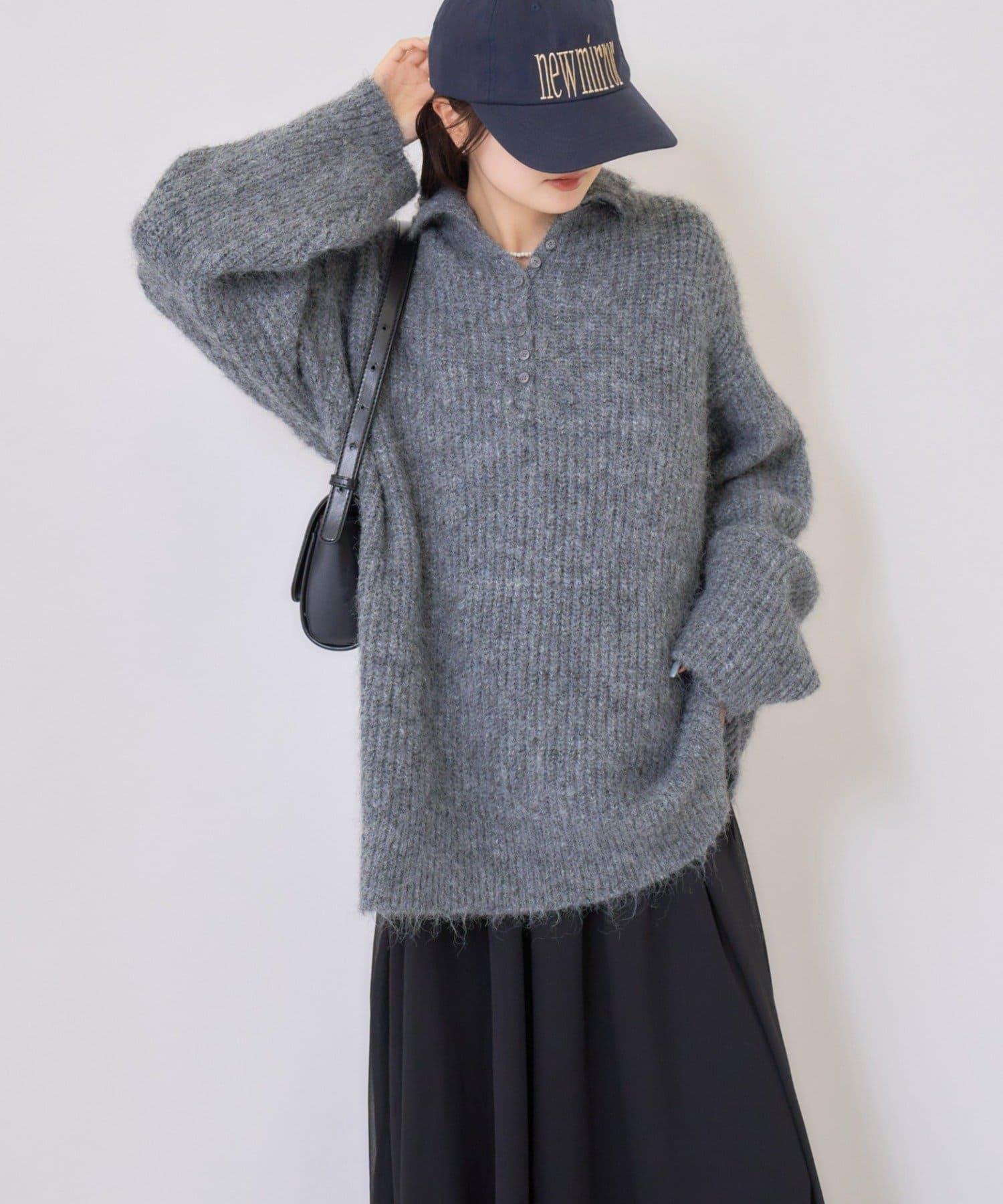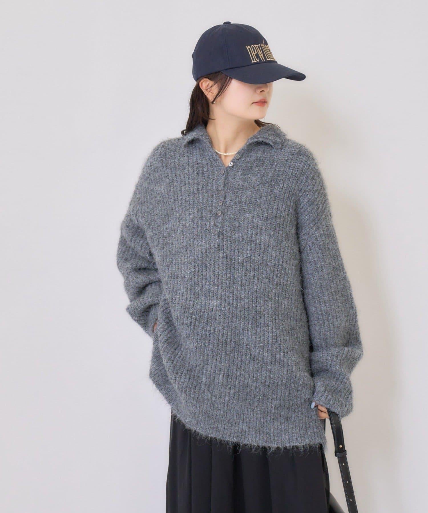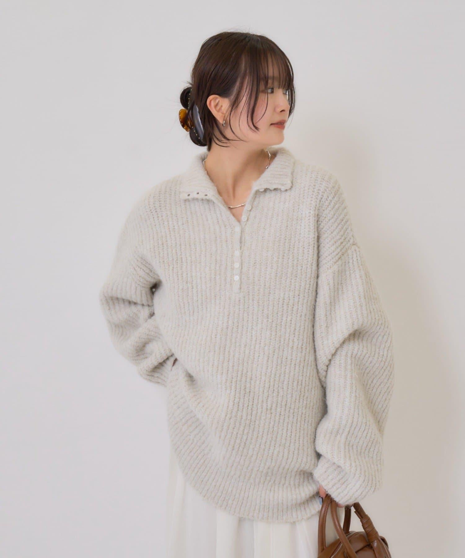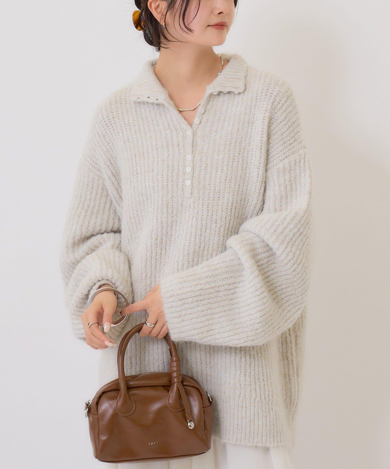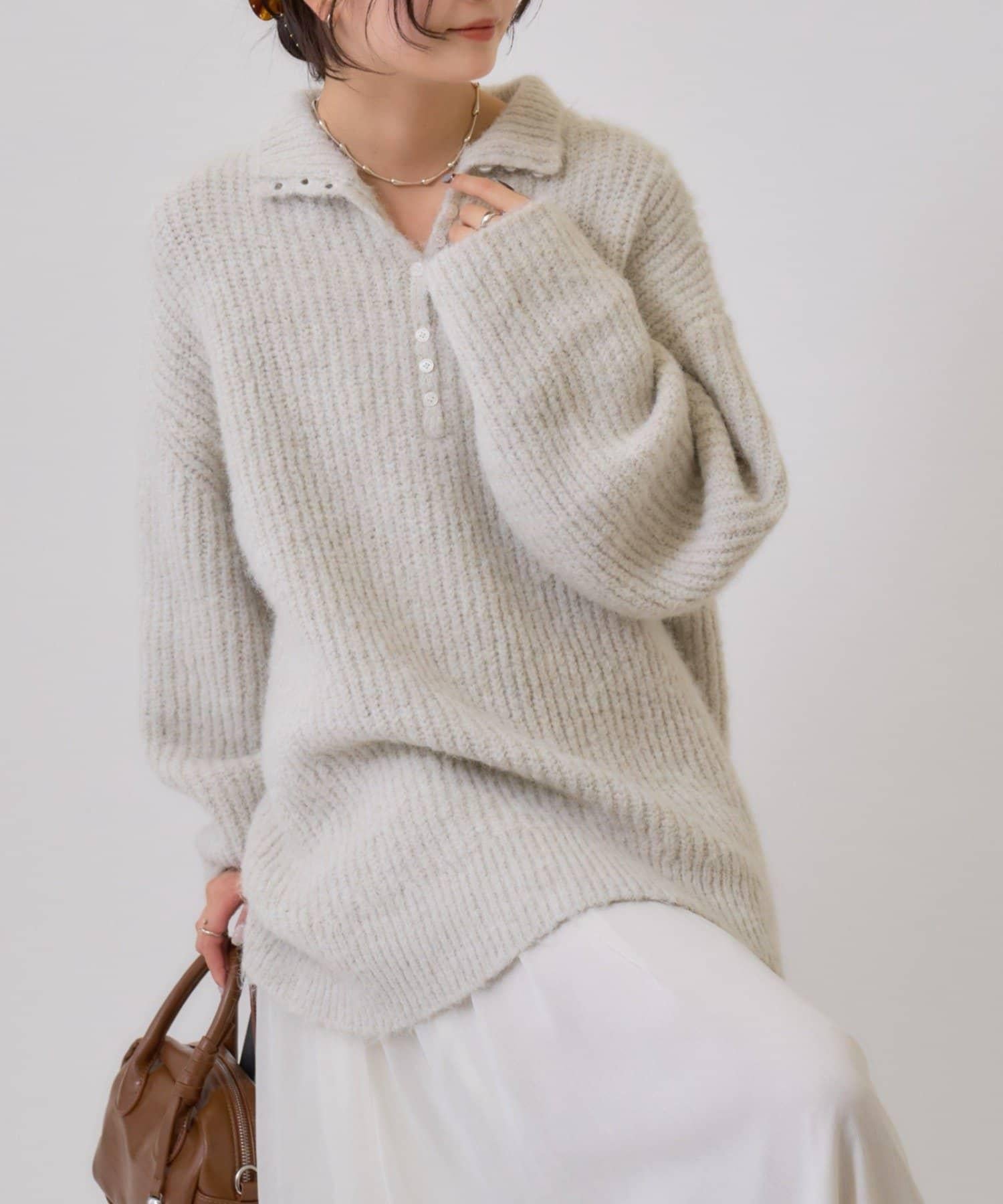 針織衫採用時髦的 polo 設計,前襟有紐扣裝飾。通過開合可以穿出不同的感覺。