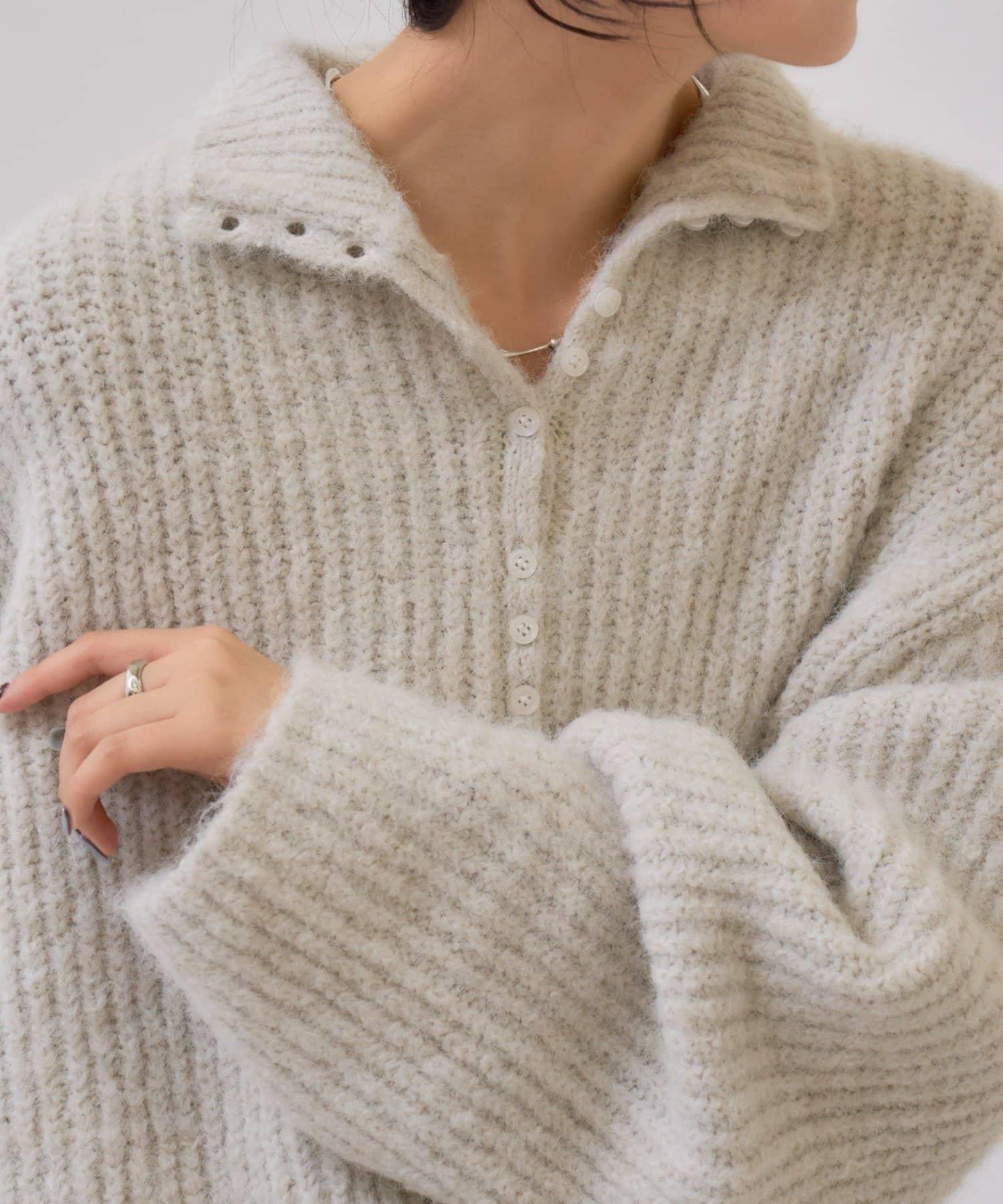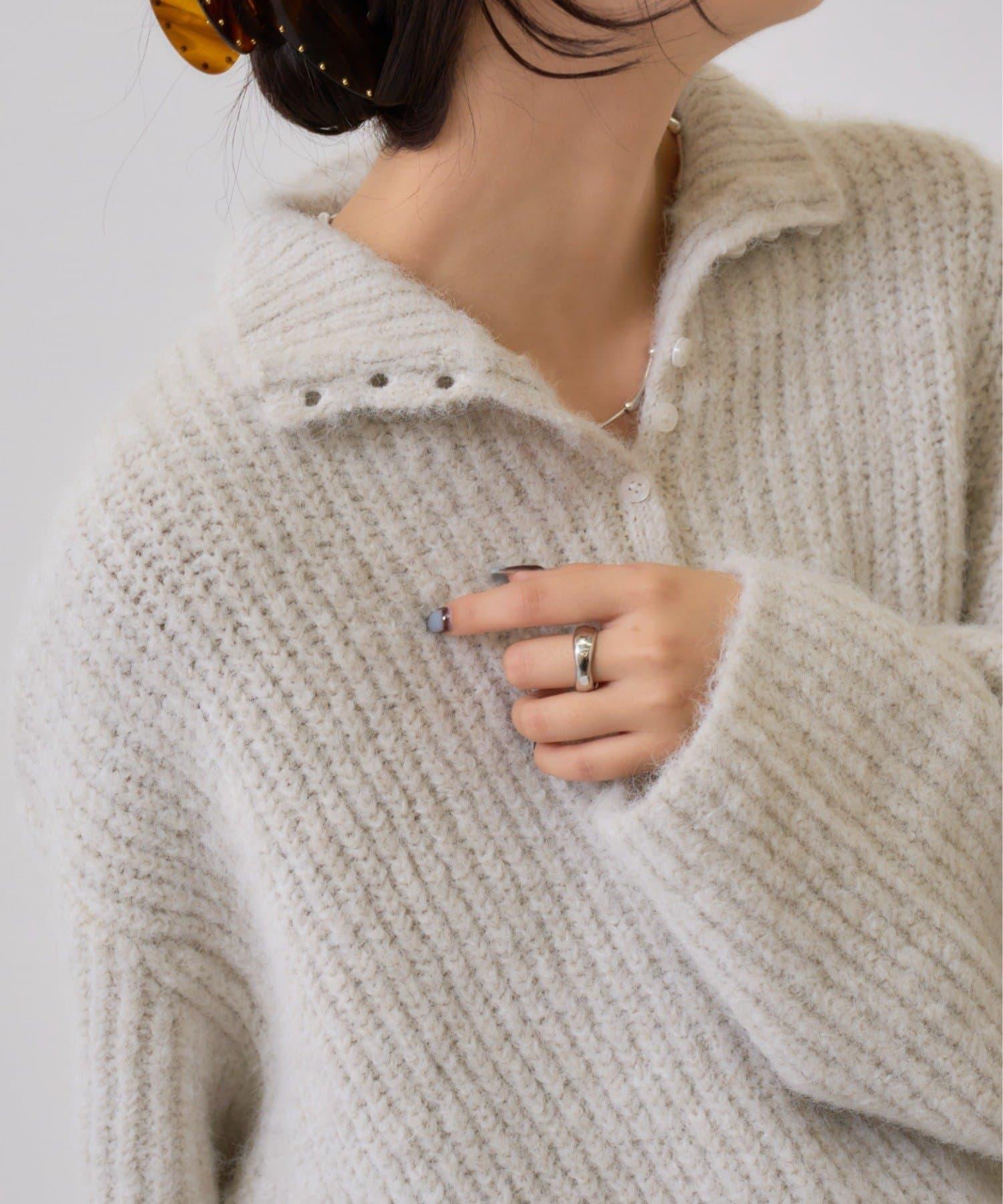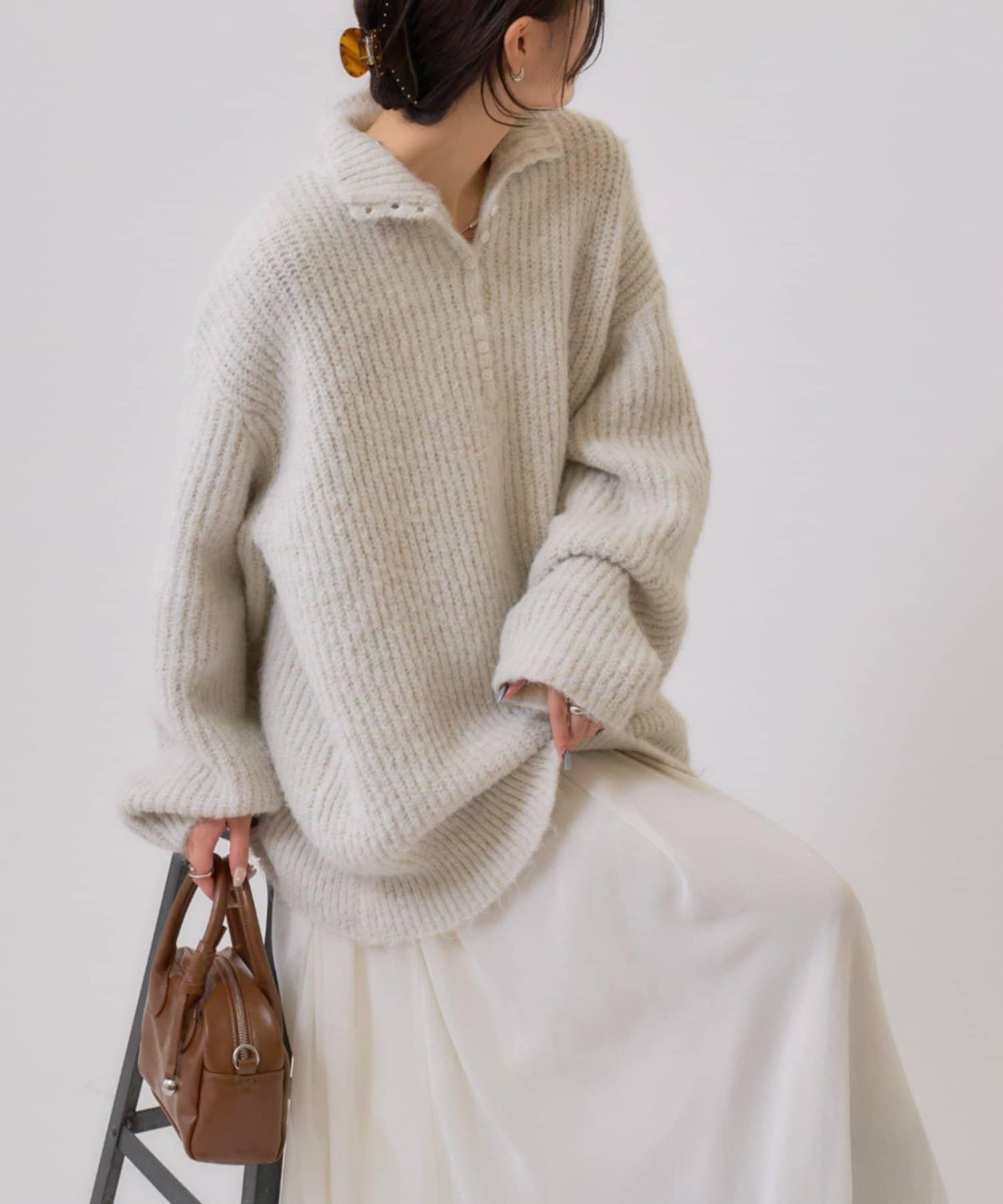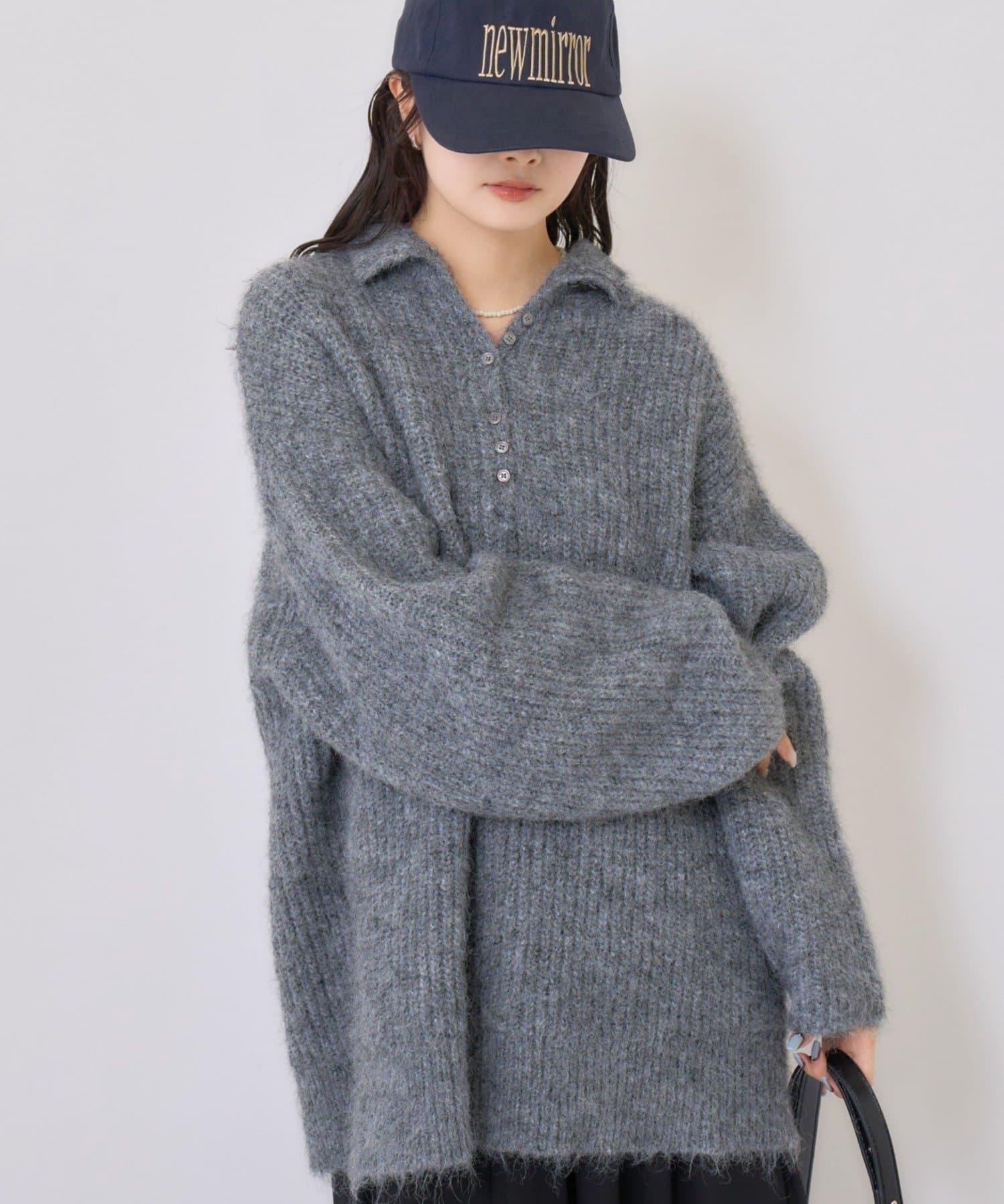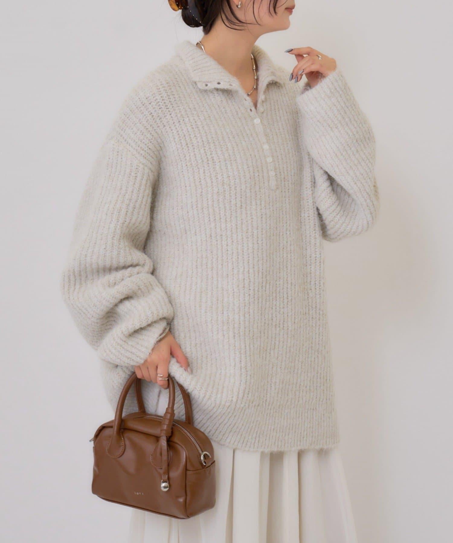 針織衫採用時髦的 polo 設計,前襟有紐扣裝飾。通過開合可以穿出不同的感覺。