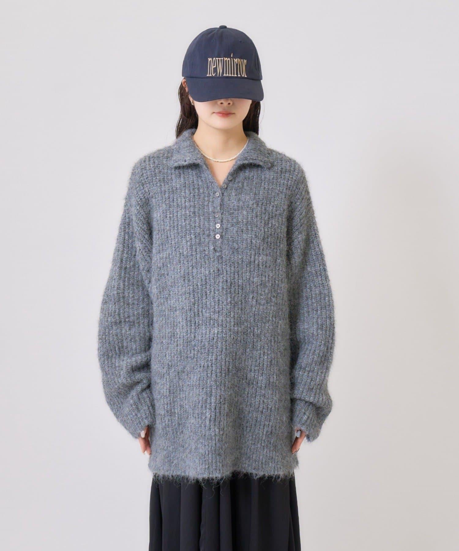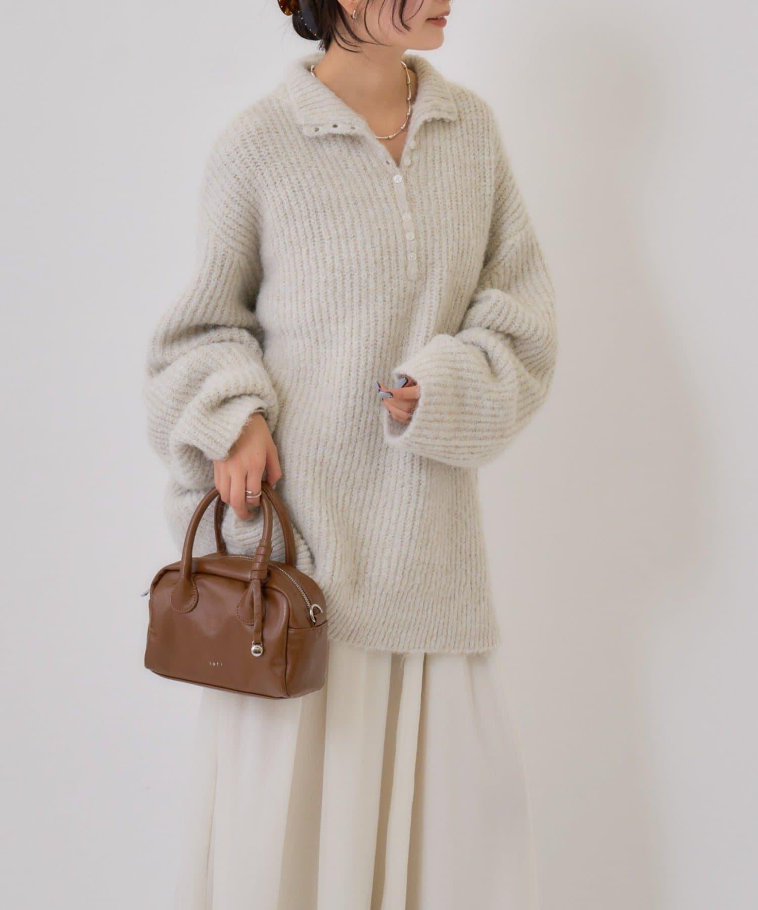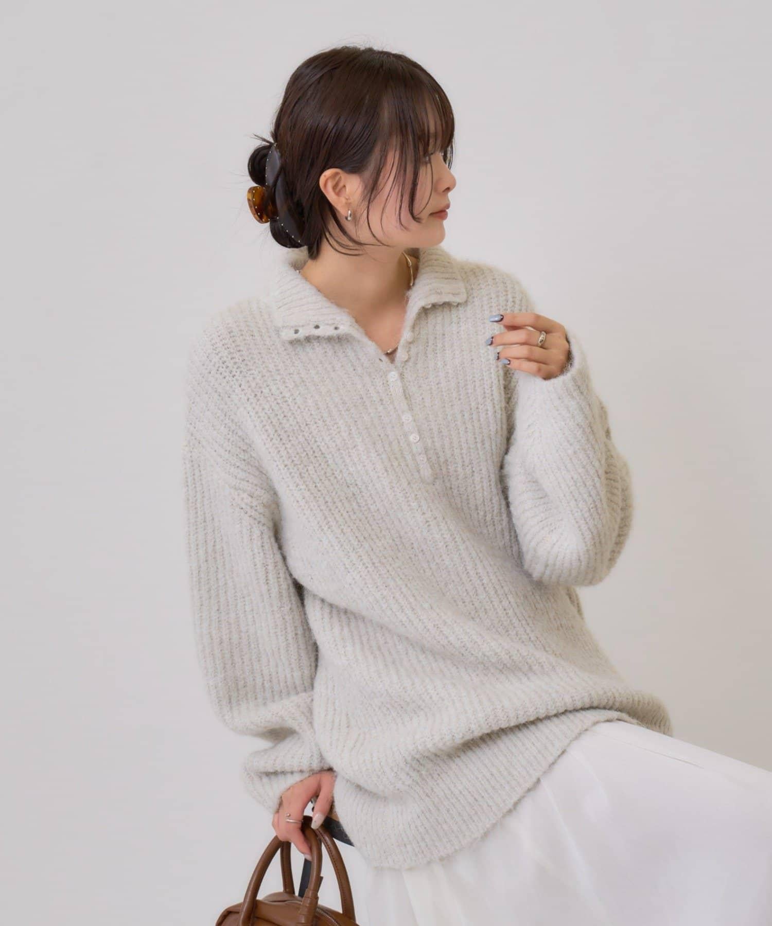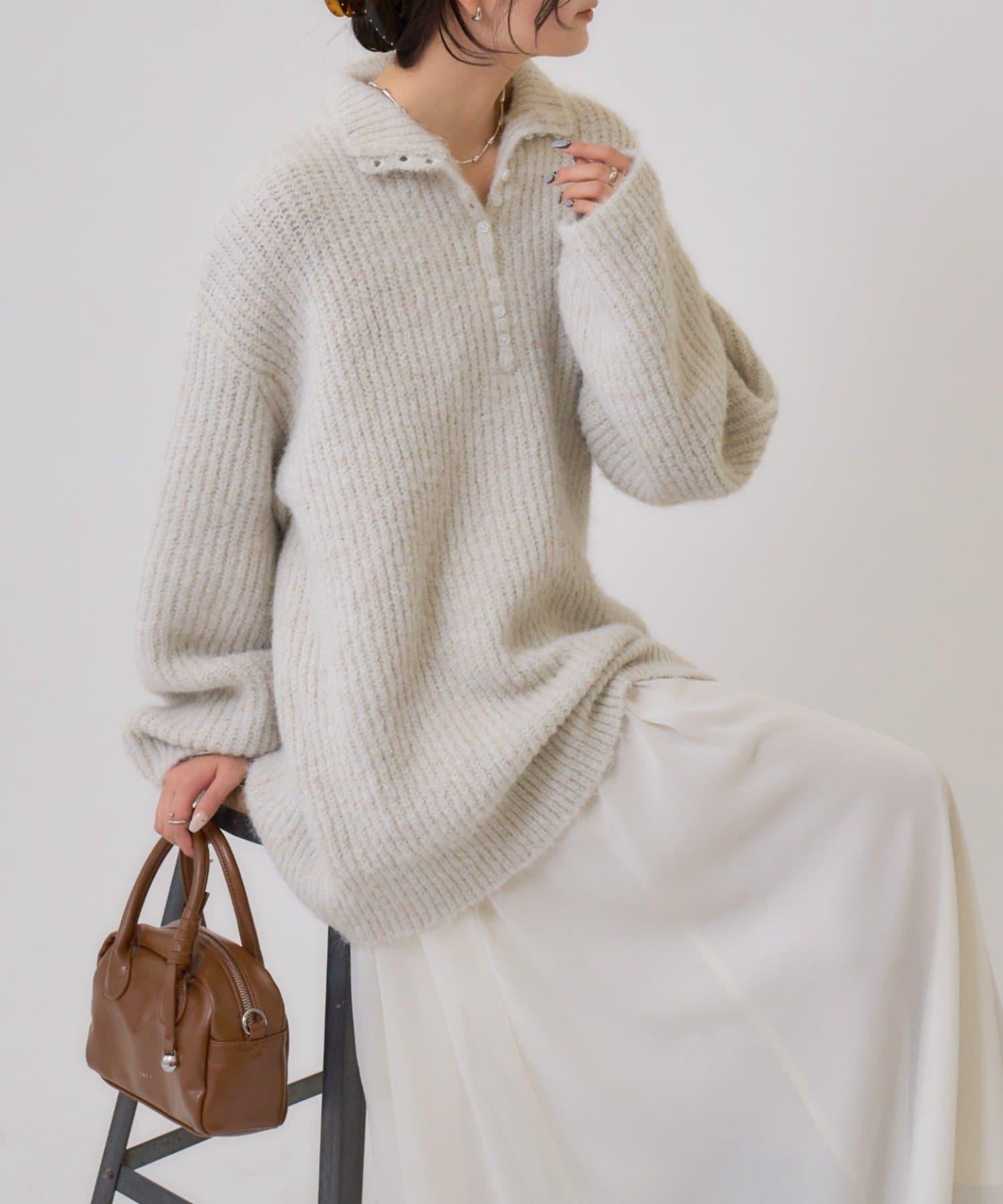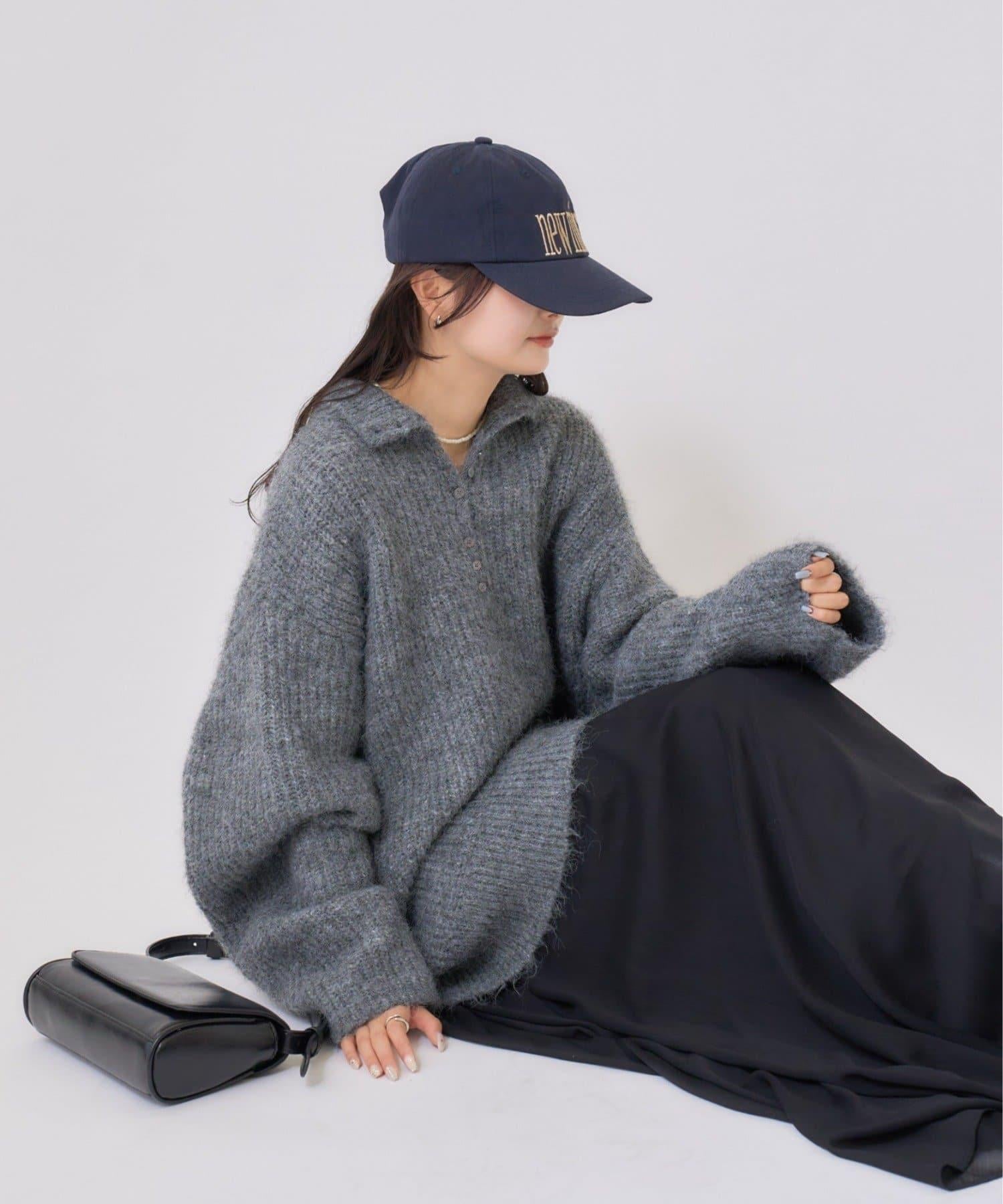 針織衫採用時髦的 polo 設計,前襟有紐扣裝飾。通過開合可以穿出不同的感覺。
