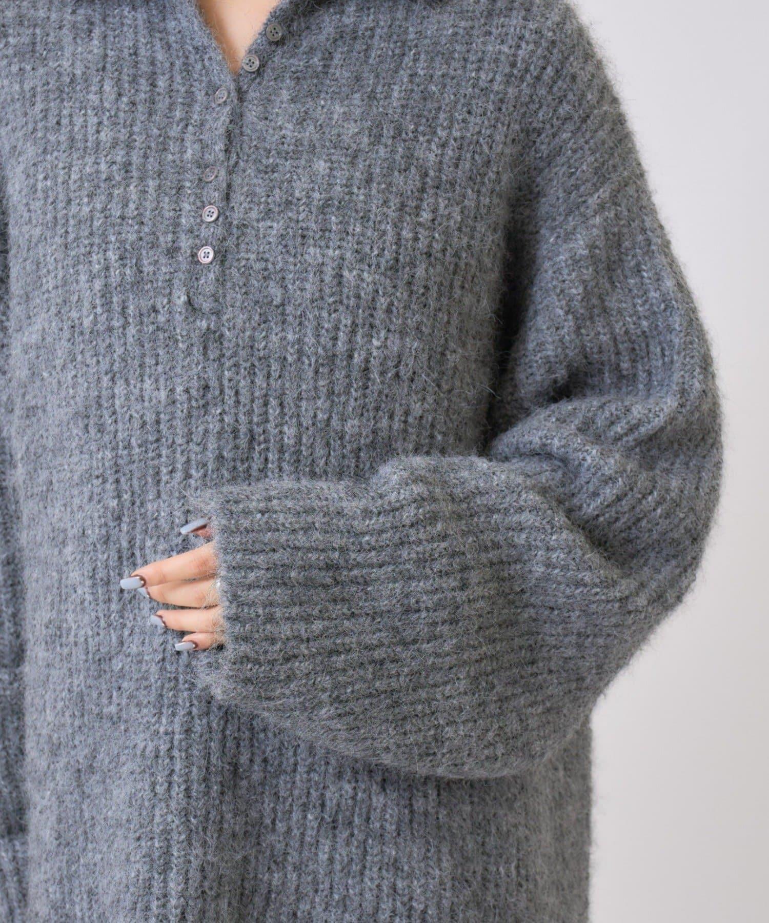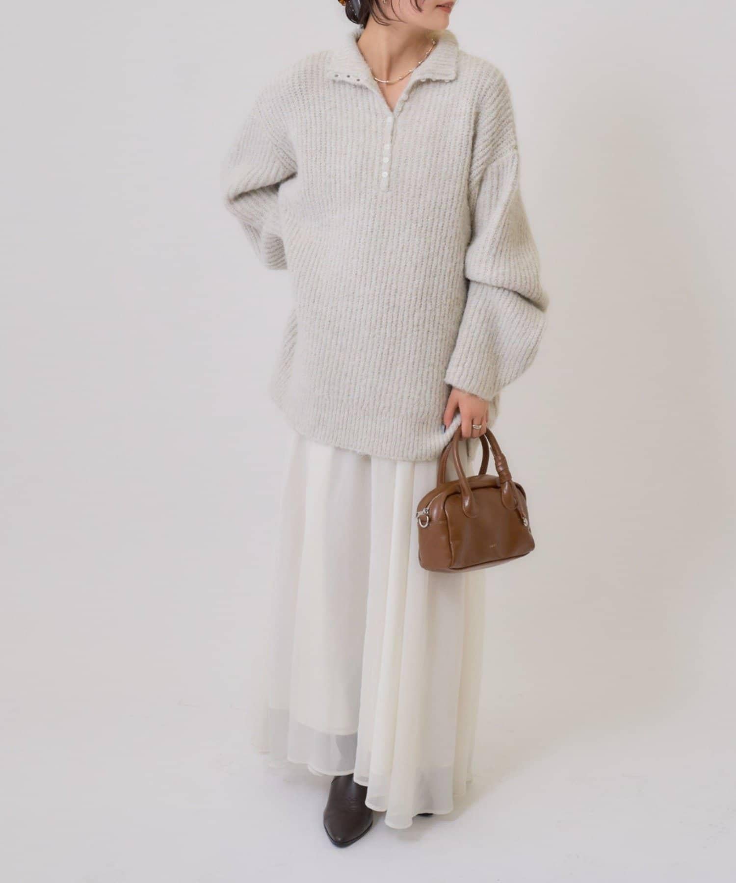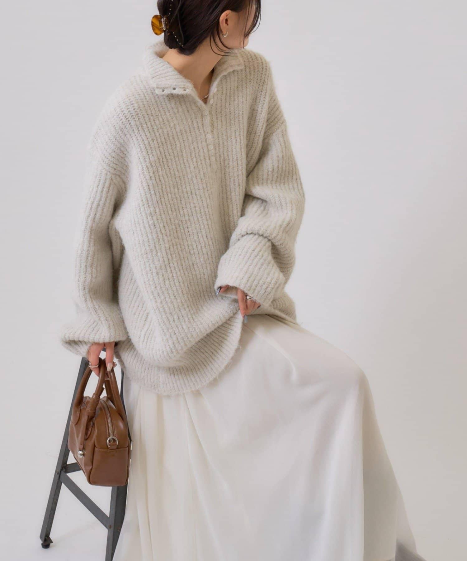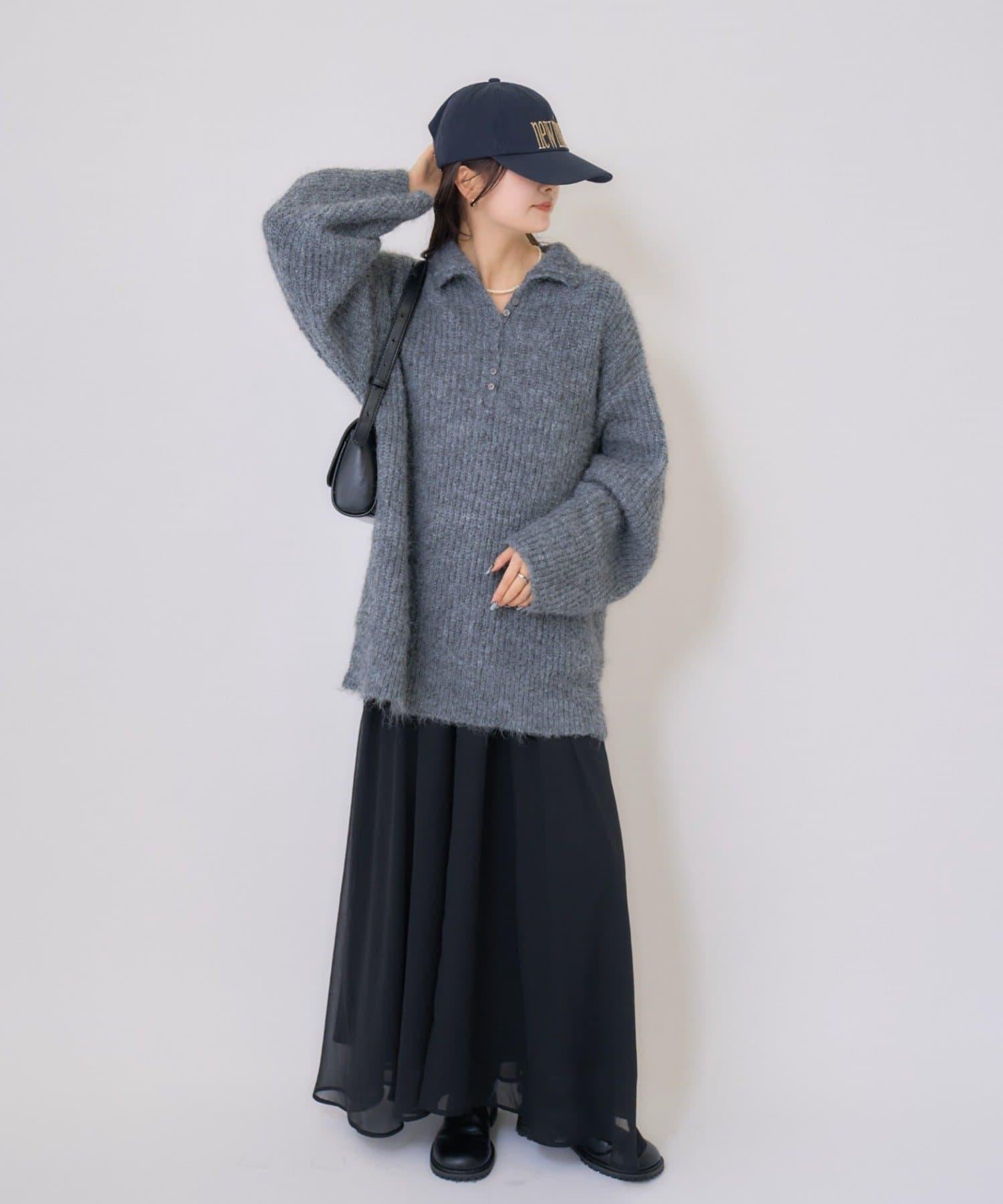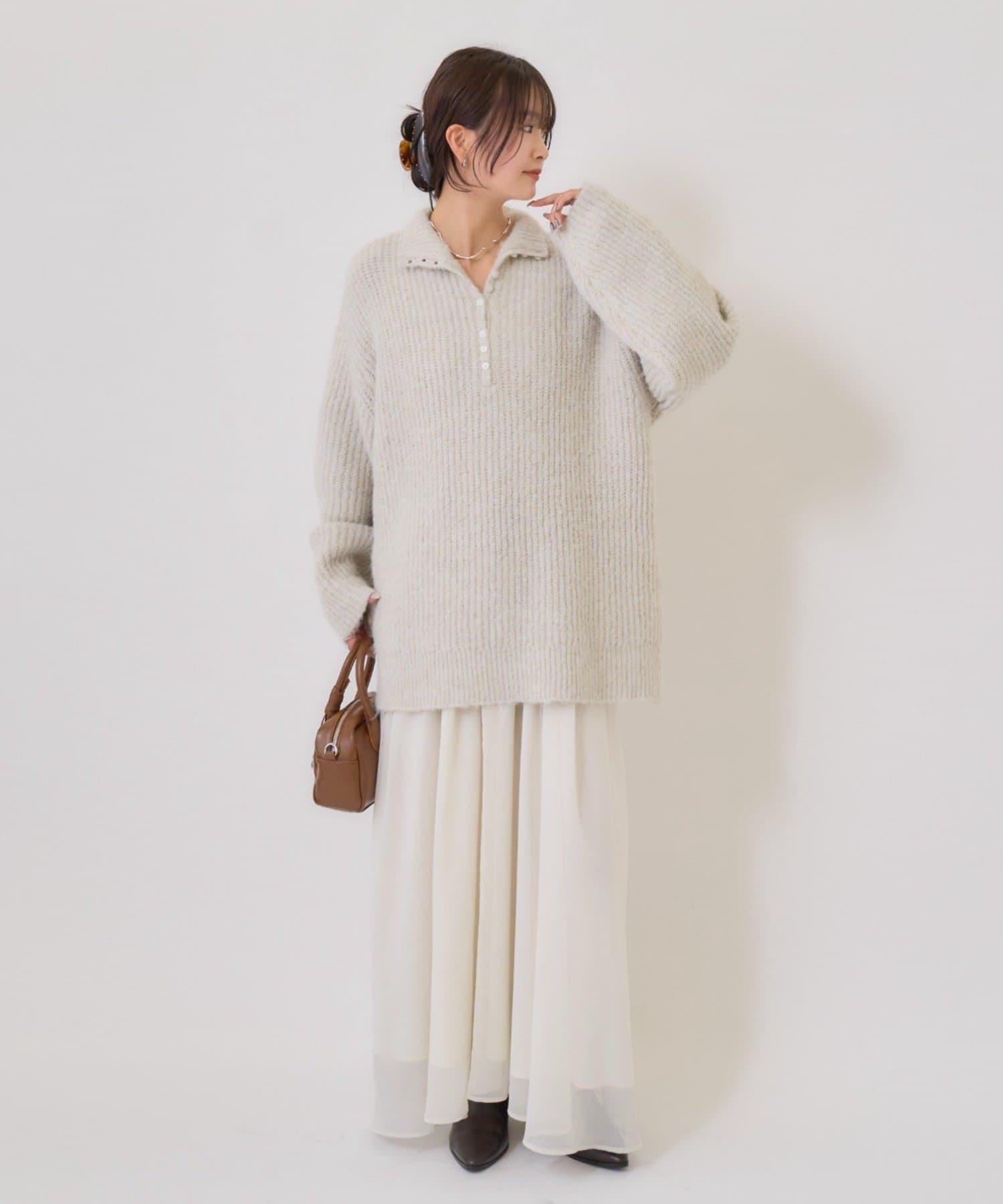 針織衫採用時髦的 polo 設計,前襟有紐扣裝飾。通過開合可以穿出不同的感覺。