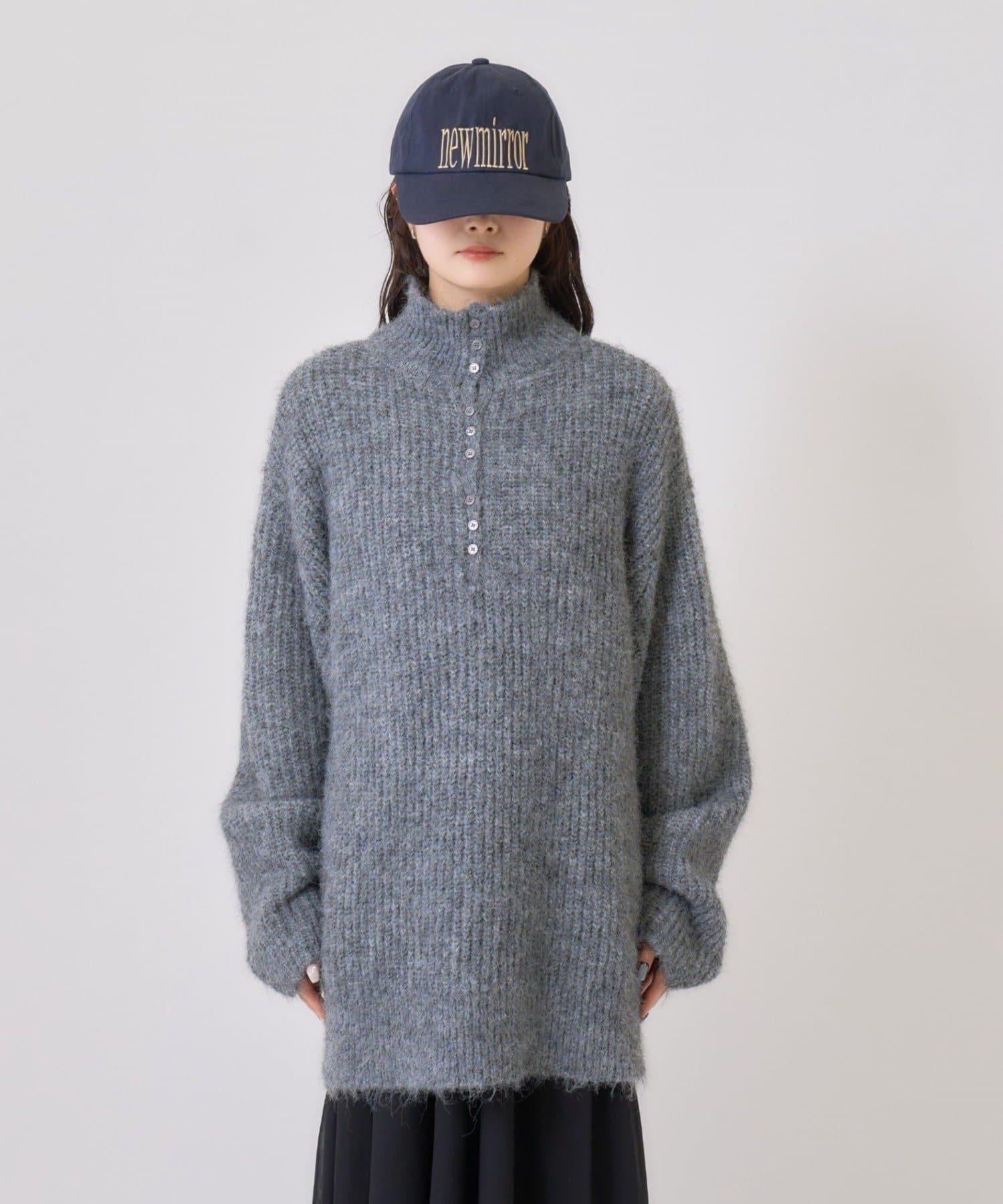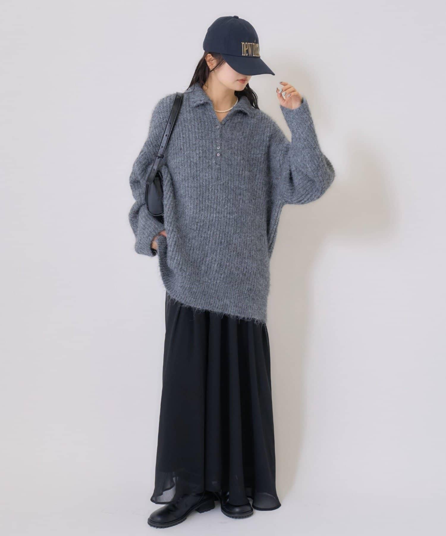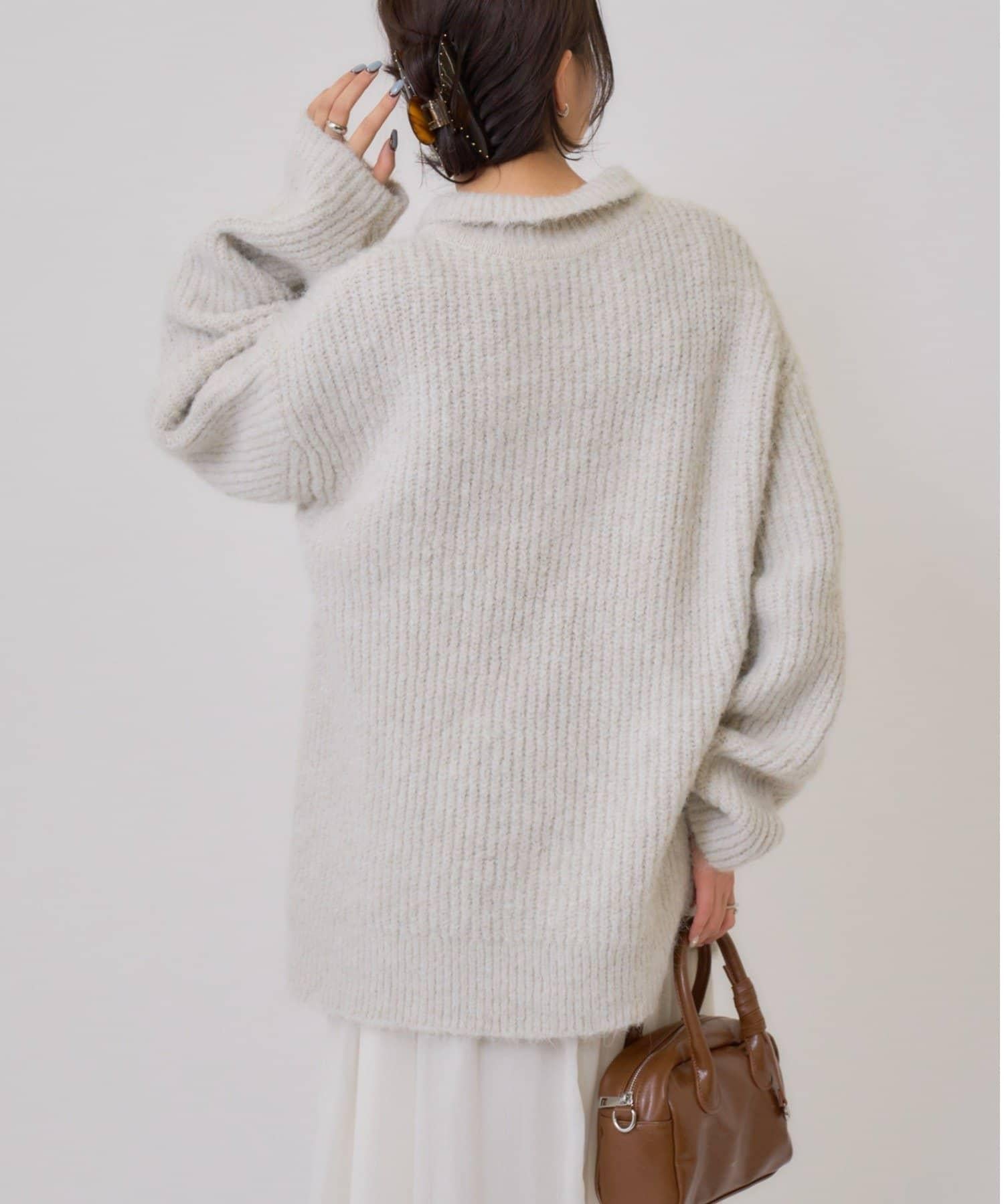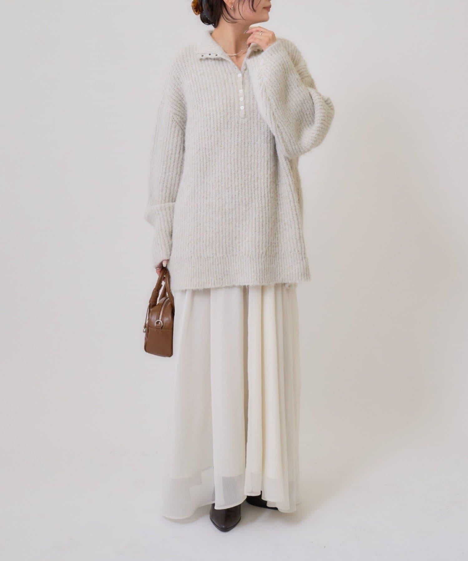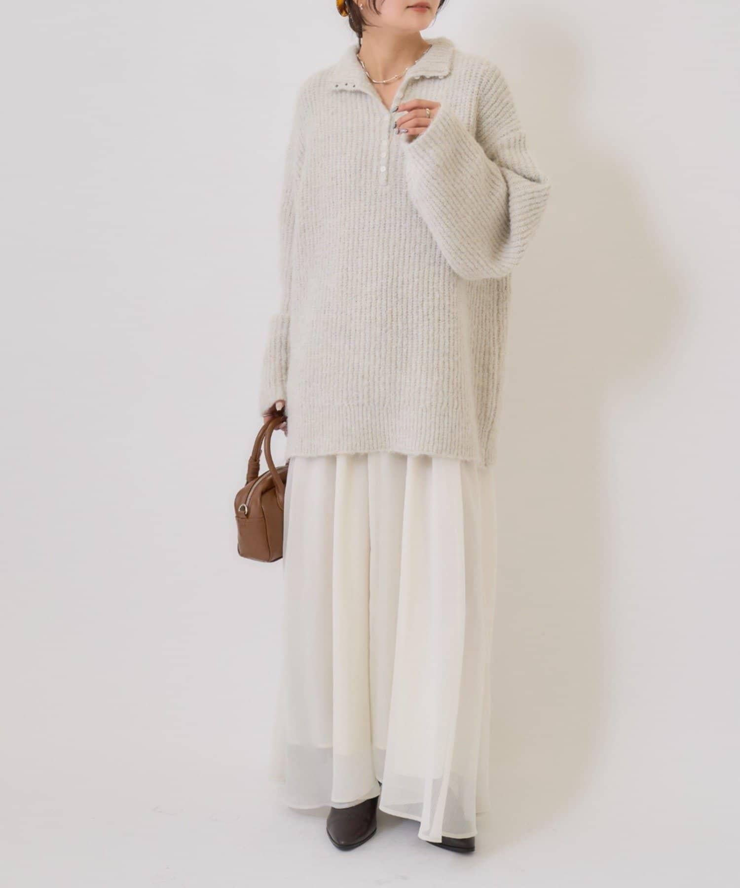 針織衫採用時髦的 polo 設計,前襟有紐扣裝飾。通過開合可以穿出不同的感覺。