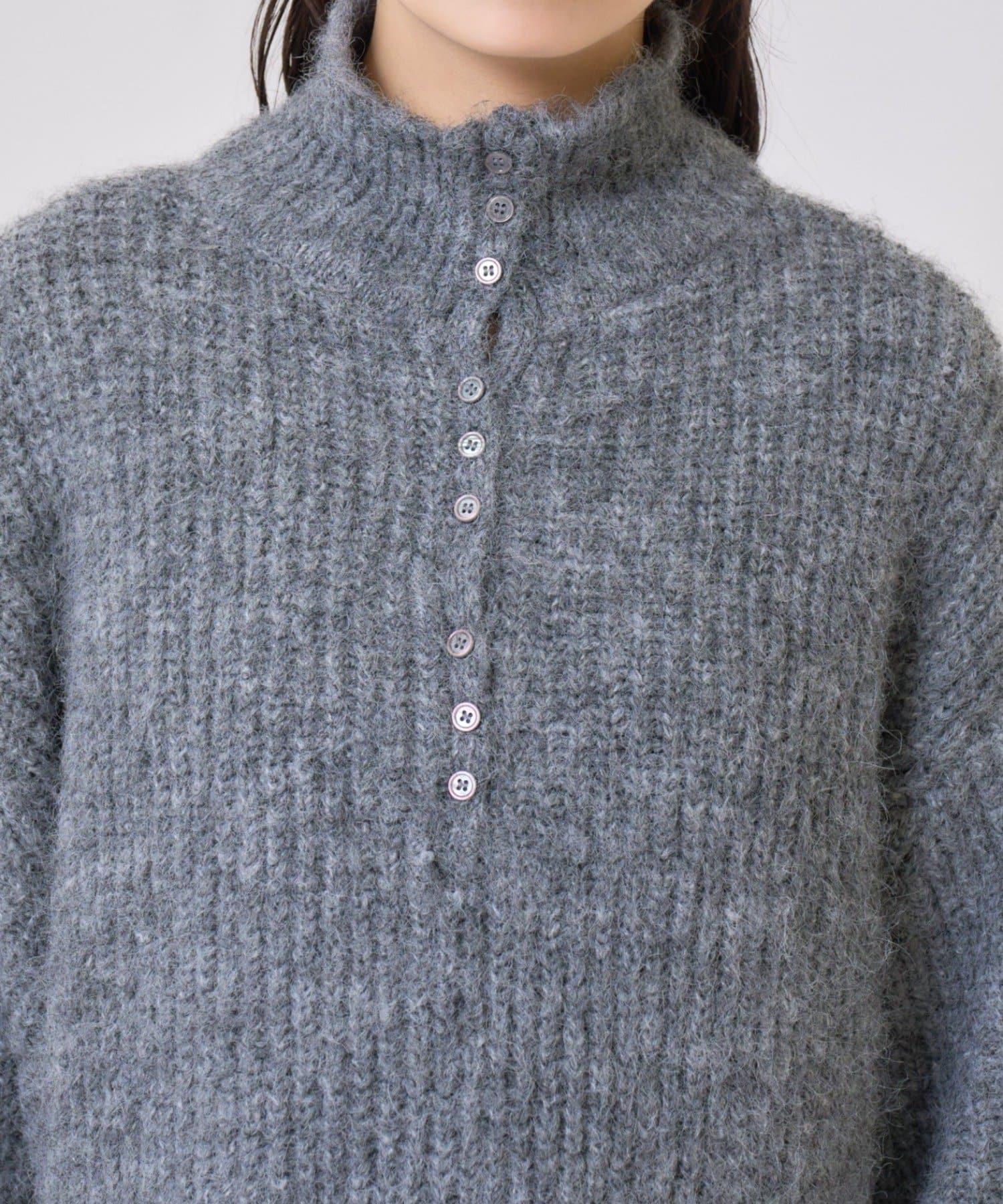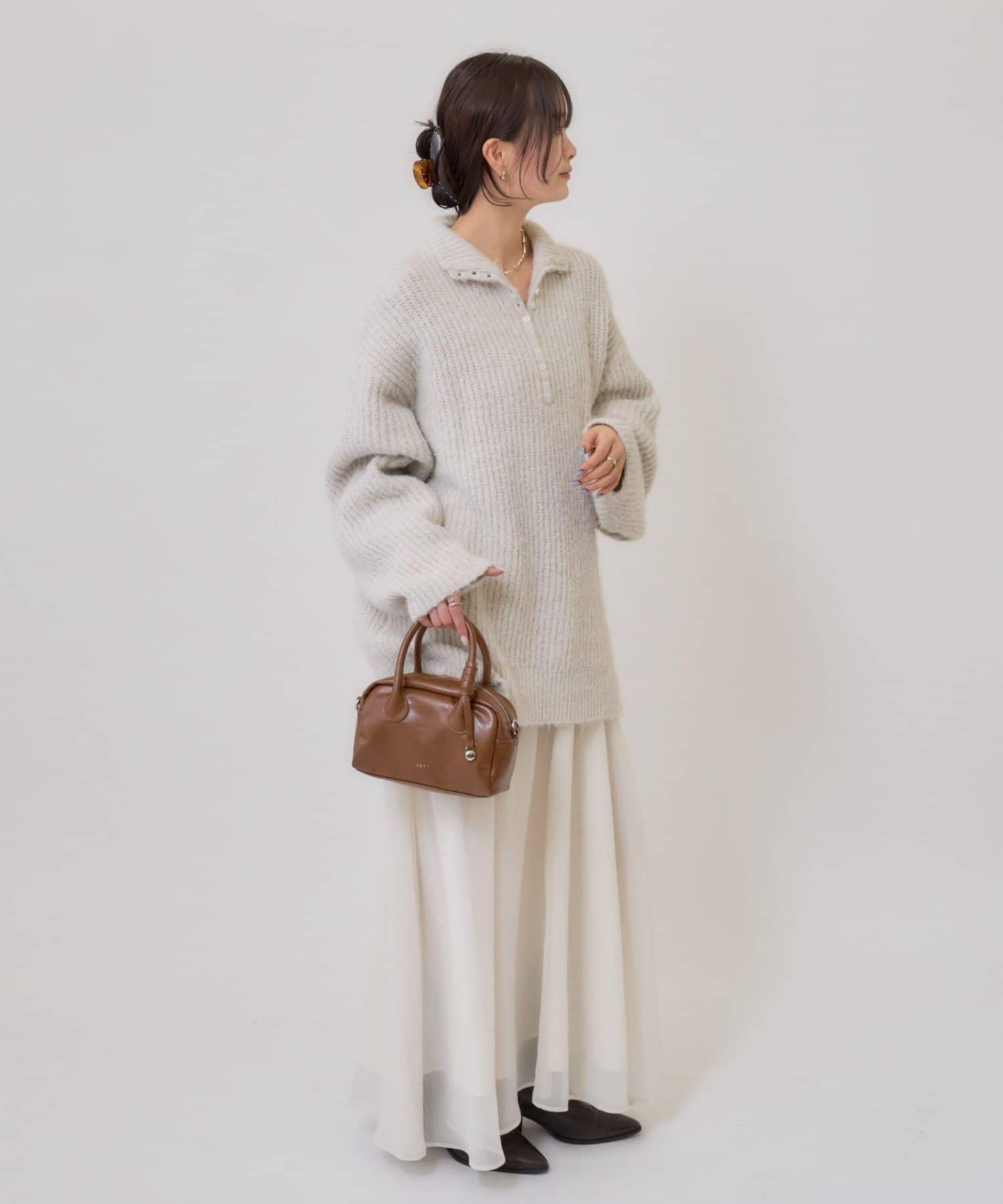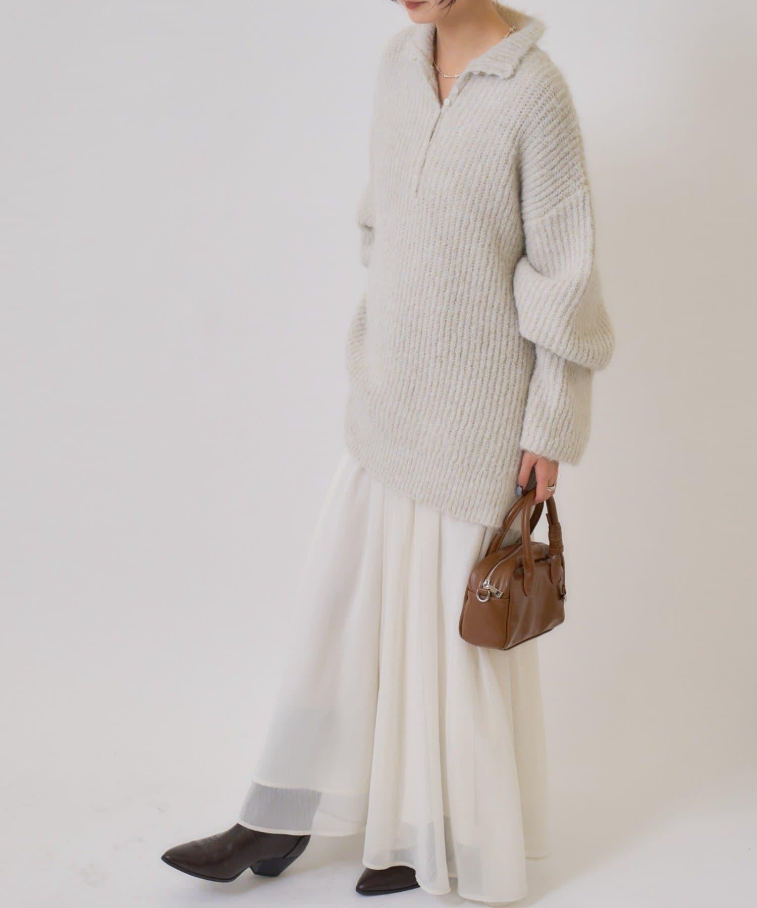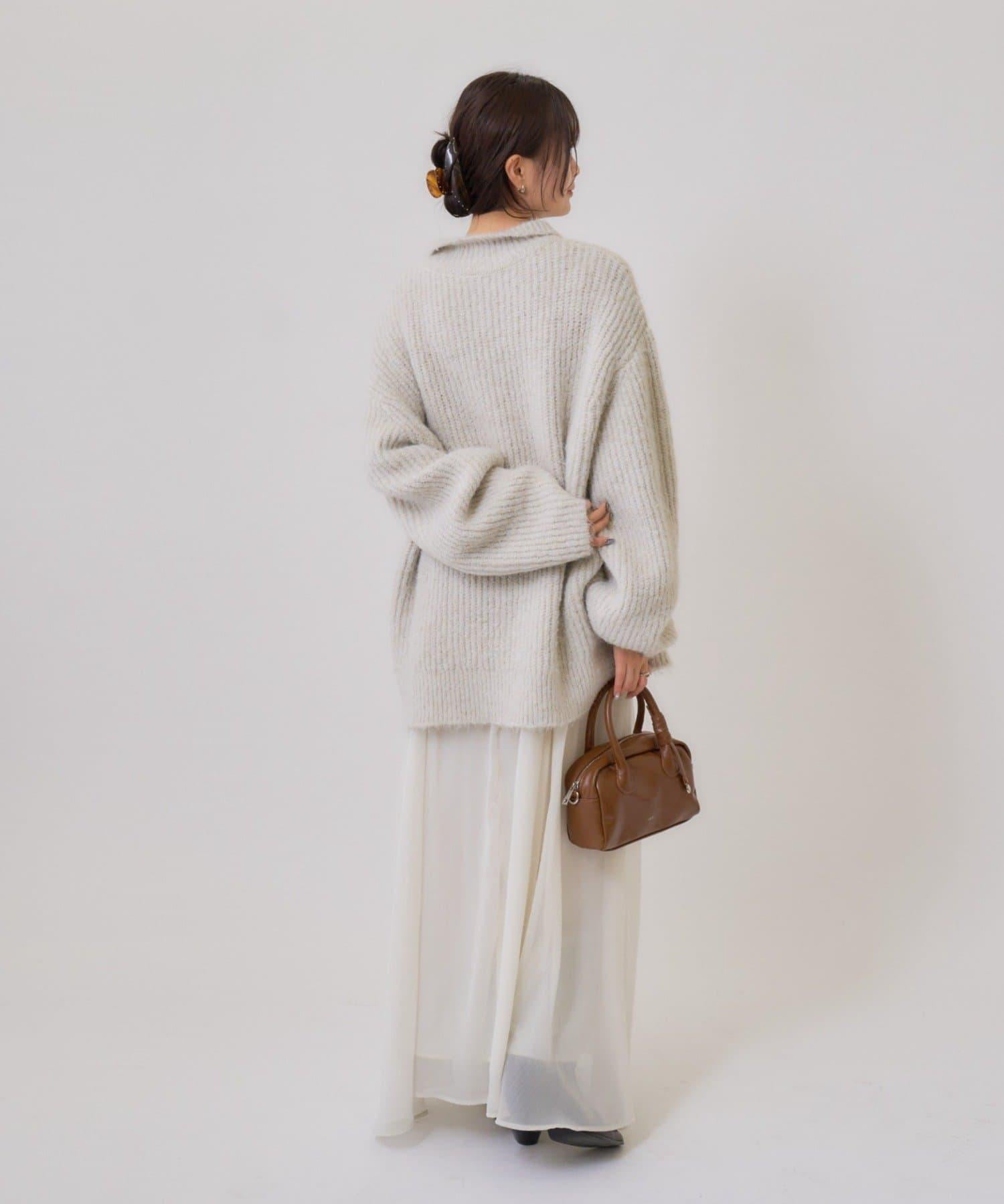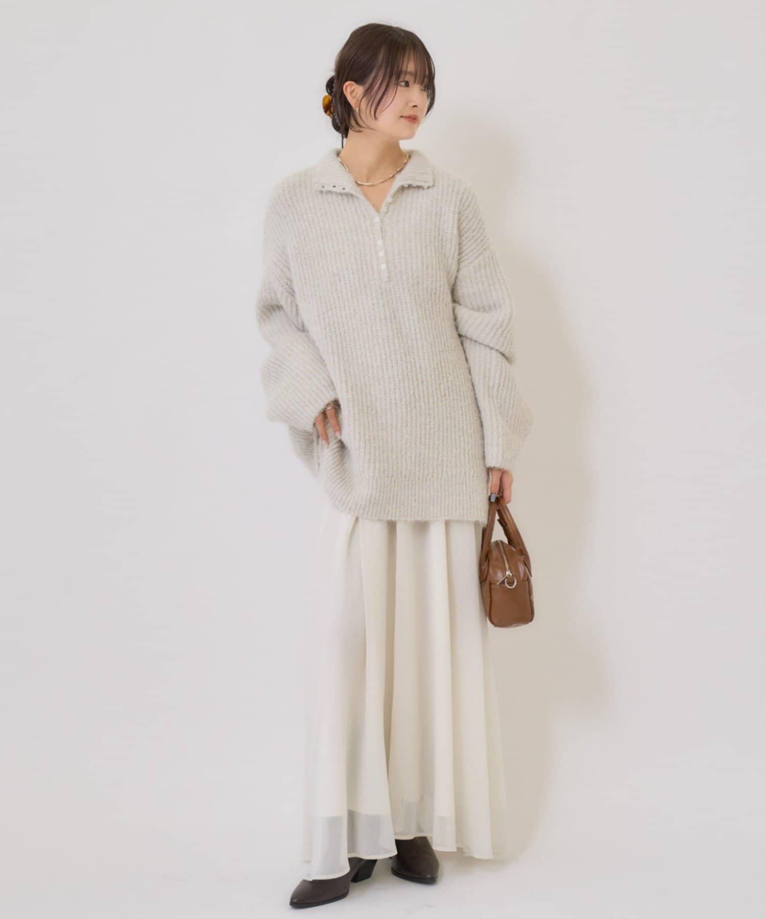 針織衫採用時髦的 polo 設計,前襟有紐扣裝飾。通過開合可以穿出不同的感覺。