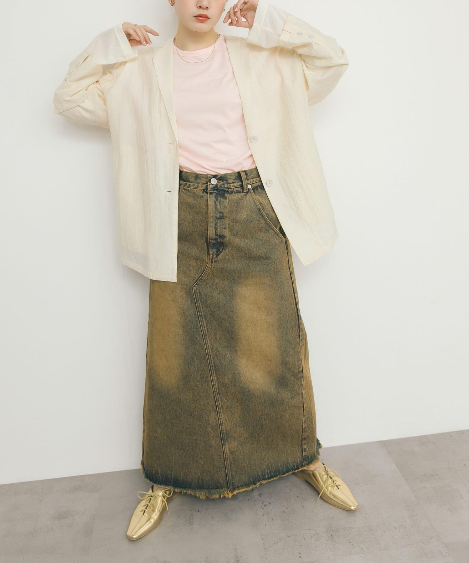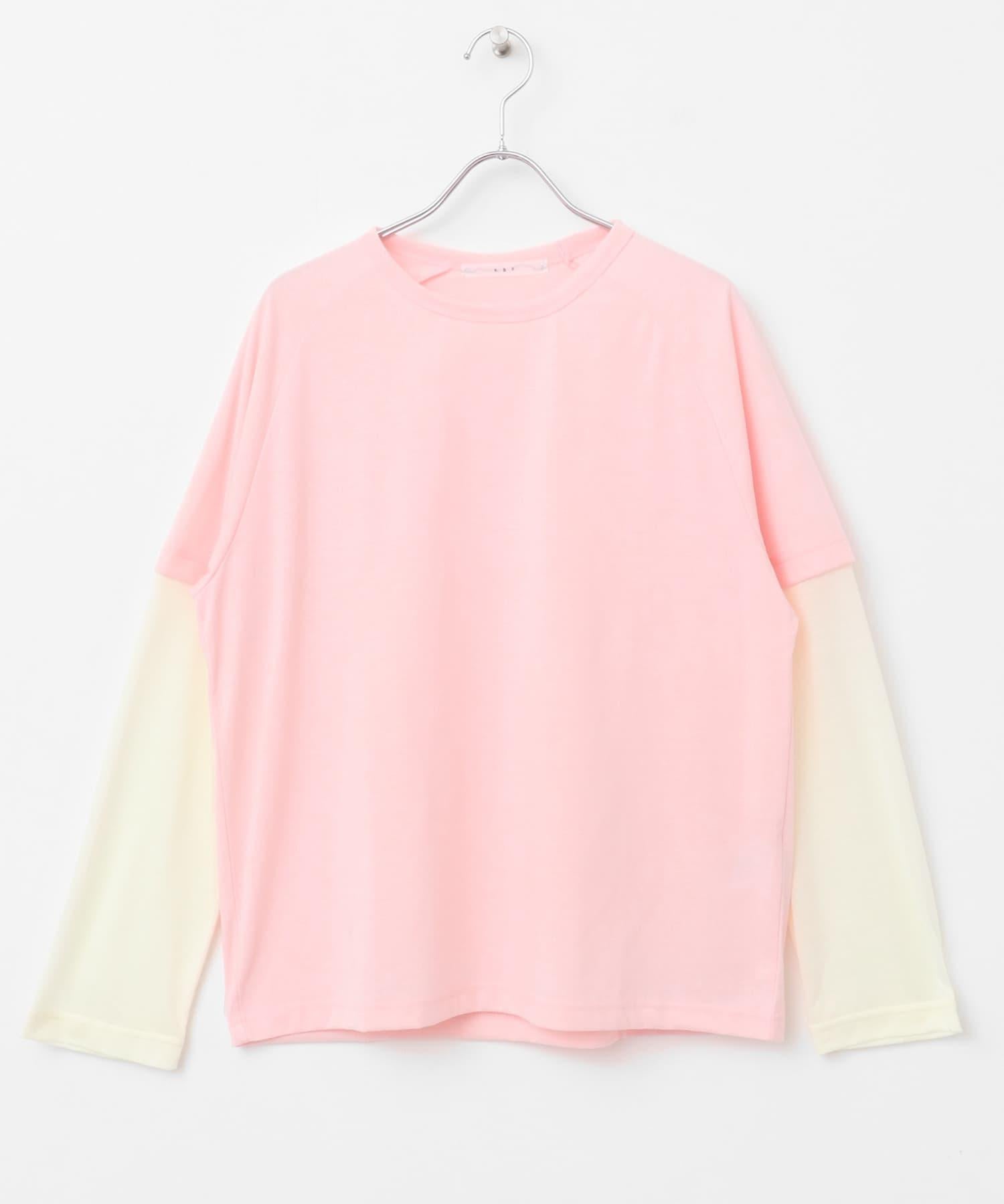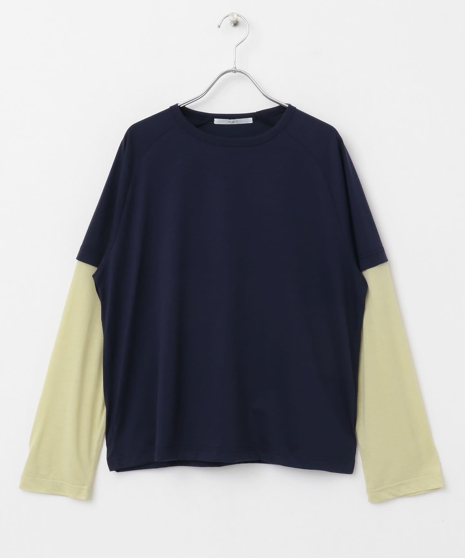 短袖 T 恤和透視長 T 恤疊穿的分層設計上衣。斜交縫設計為這款單品增添了休閒感,這也是 KBF 的典型風格。有粉色和海軍藍兩種顏色可供選擇,營造出不同的氛圍。
