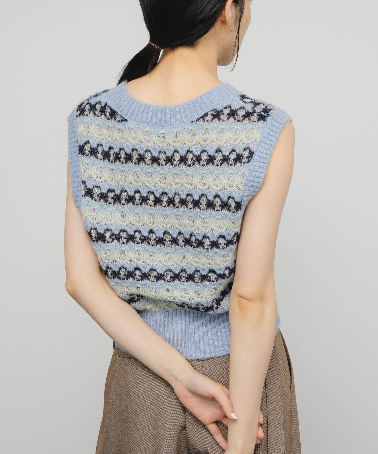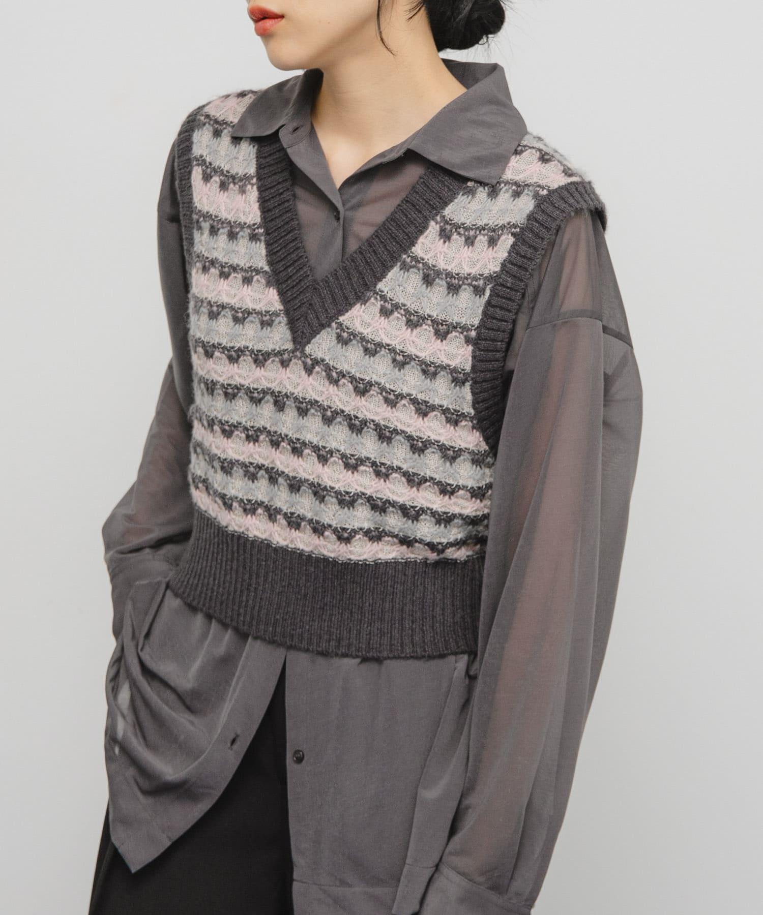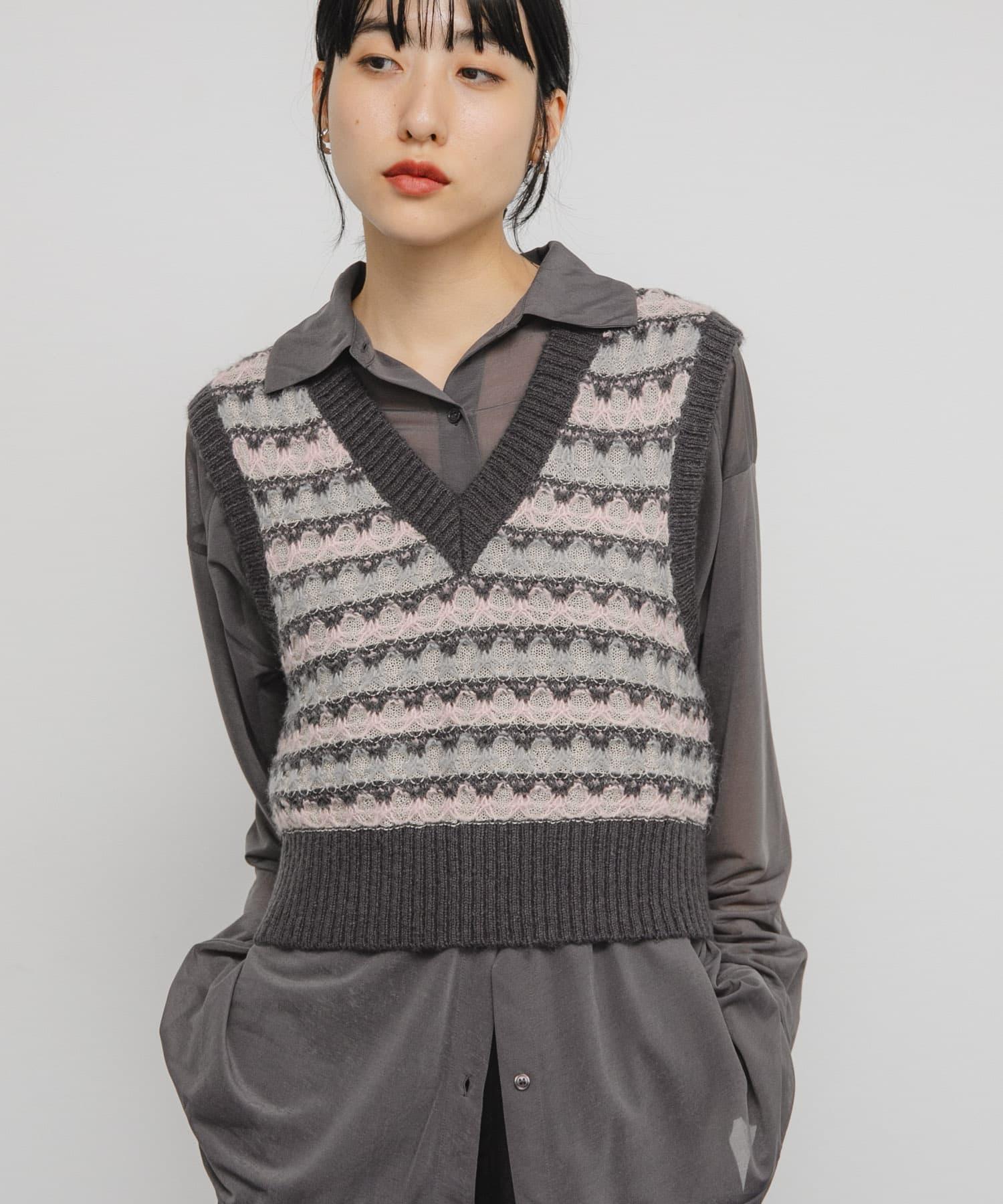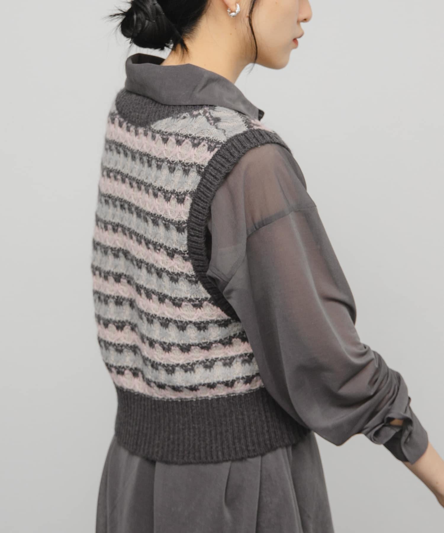 蓬鬆的馬海毛風格針織馬甲,配以醒目的圖案配色。底層部分由薄紗製成,略帶涼爽感,即使在這個季節也能輕鬆穿著。它可以疊穿在剪接式連衣裙和連身裙上,也可以作為夾克的內層。