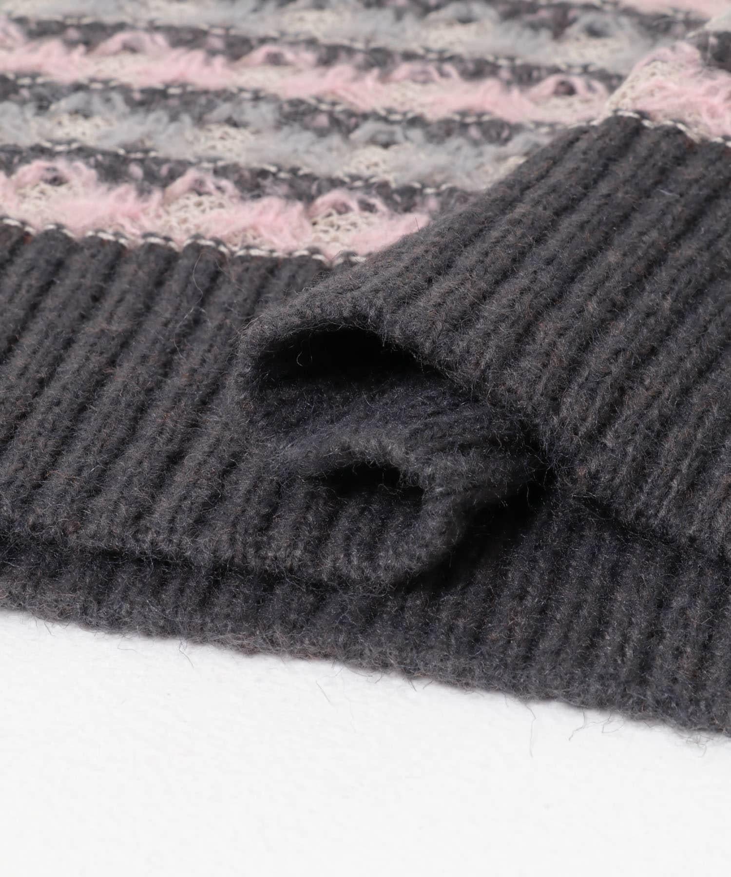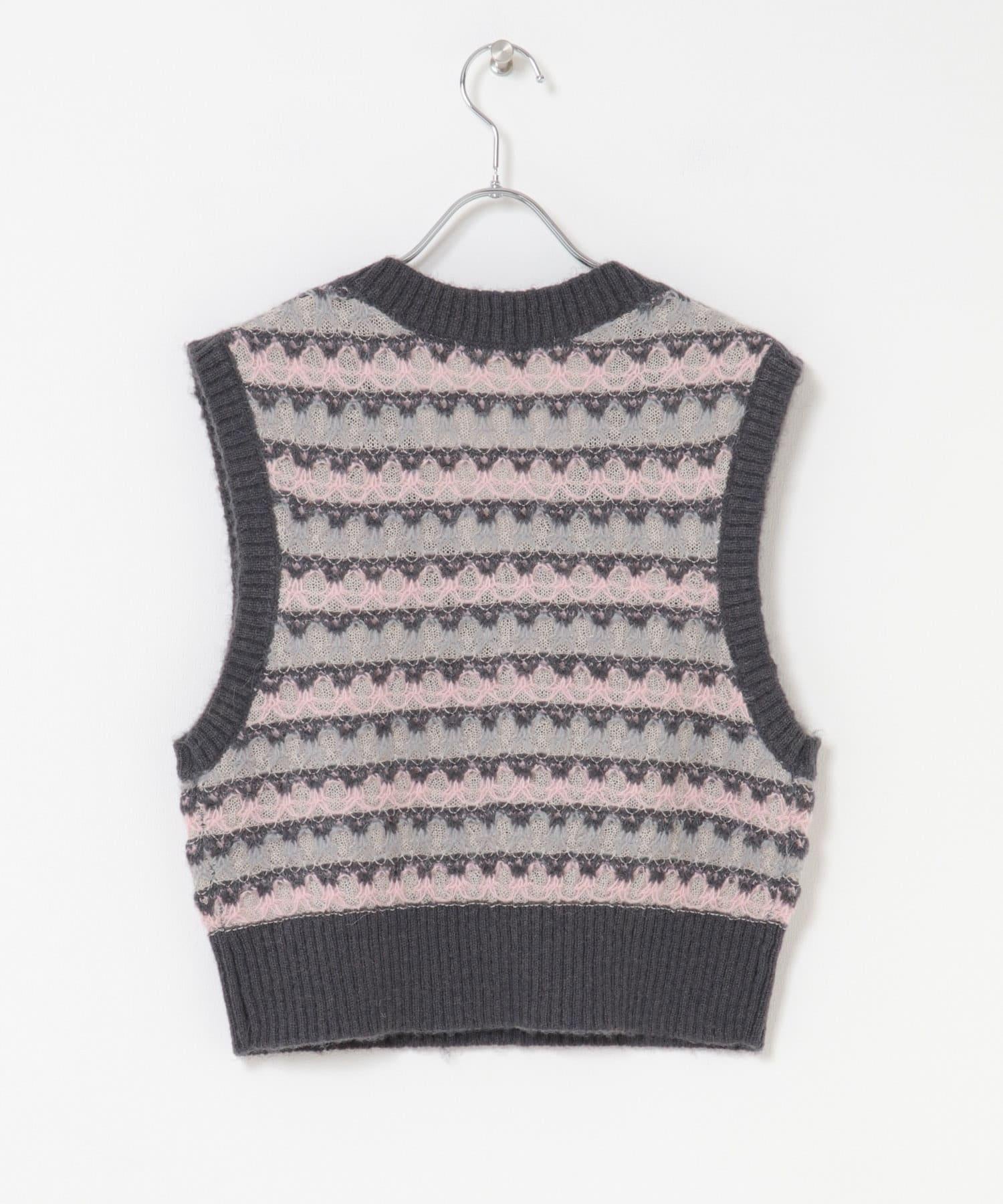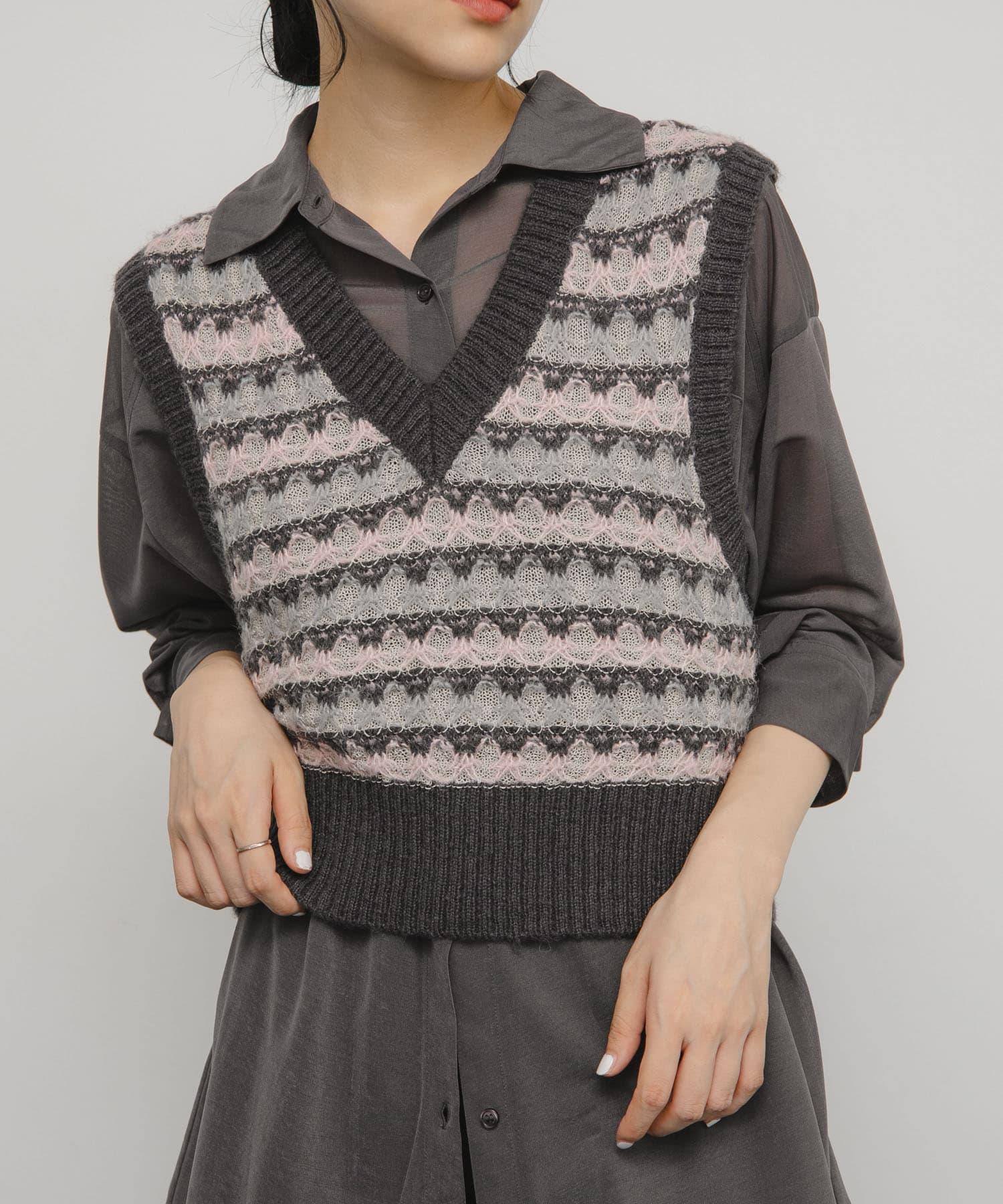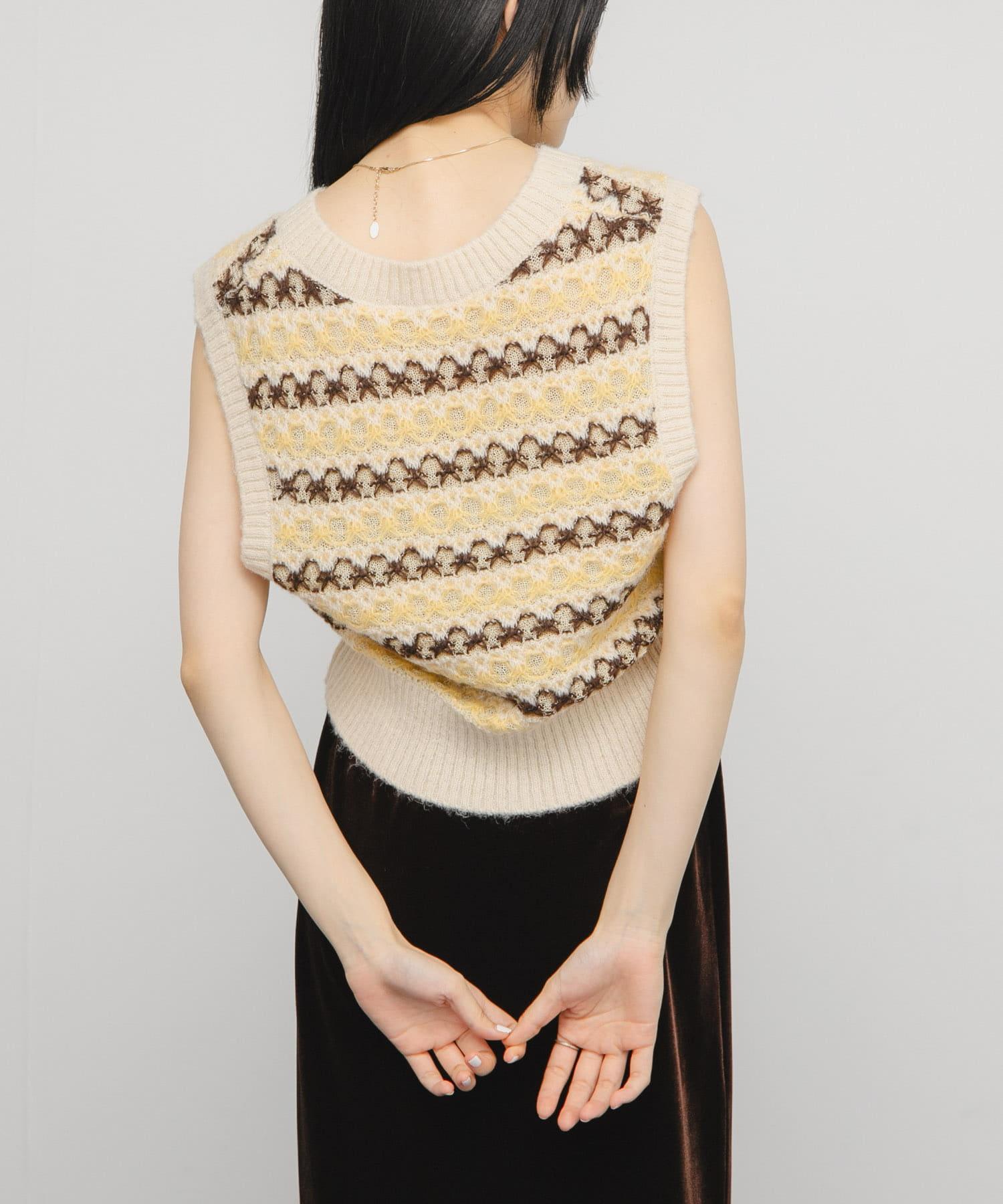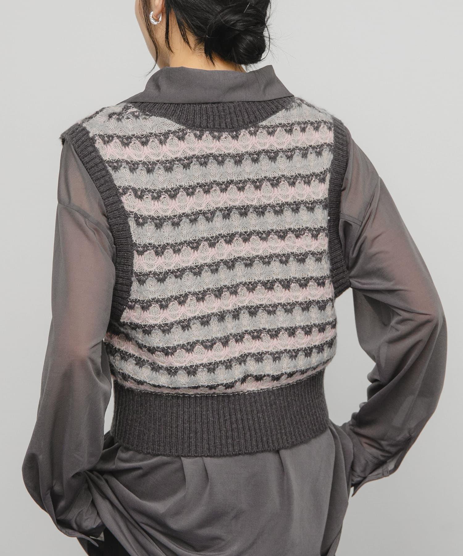蓬鬆的馬海毛風格針織馬甲,配以醒目的圖案配色。底層部分由薄紗製成,略帶涼爽感,即使在這個季節也能輕鬆穿著。它可以疊穿在剪接式連衣裙和連身裙上,也可以作為夾克的內層。