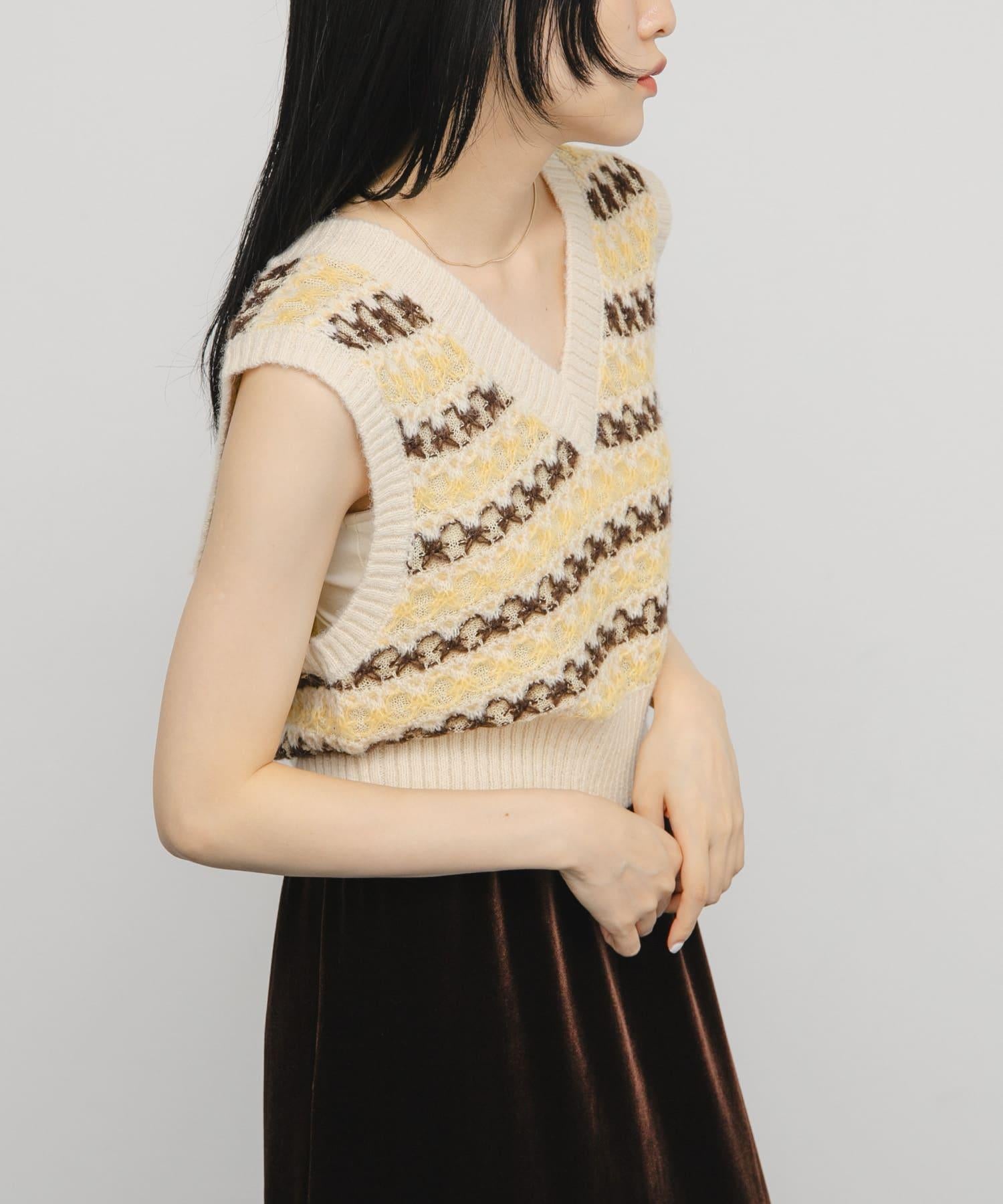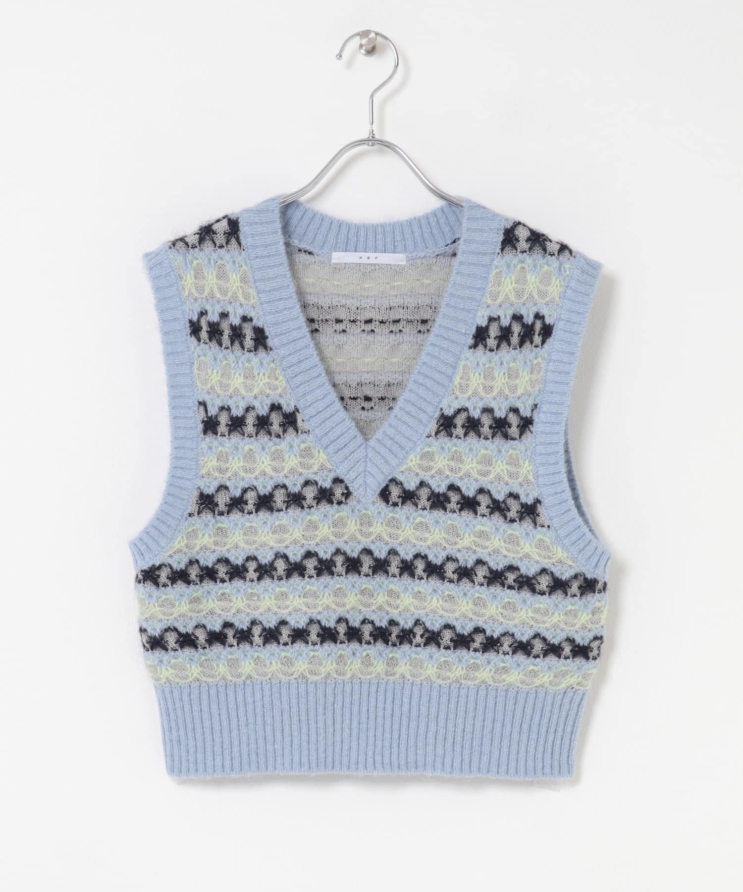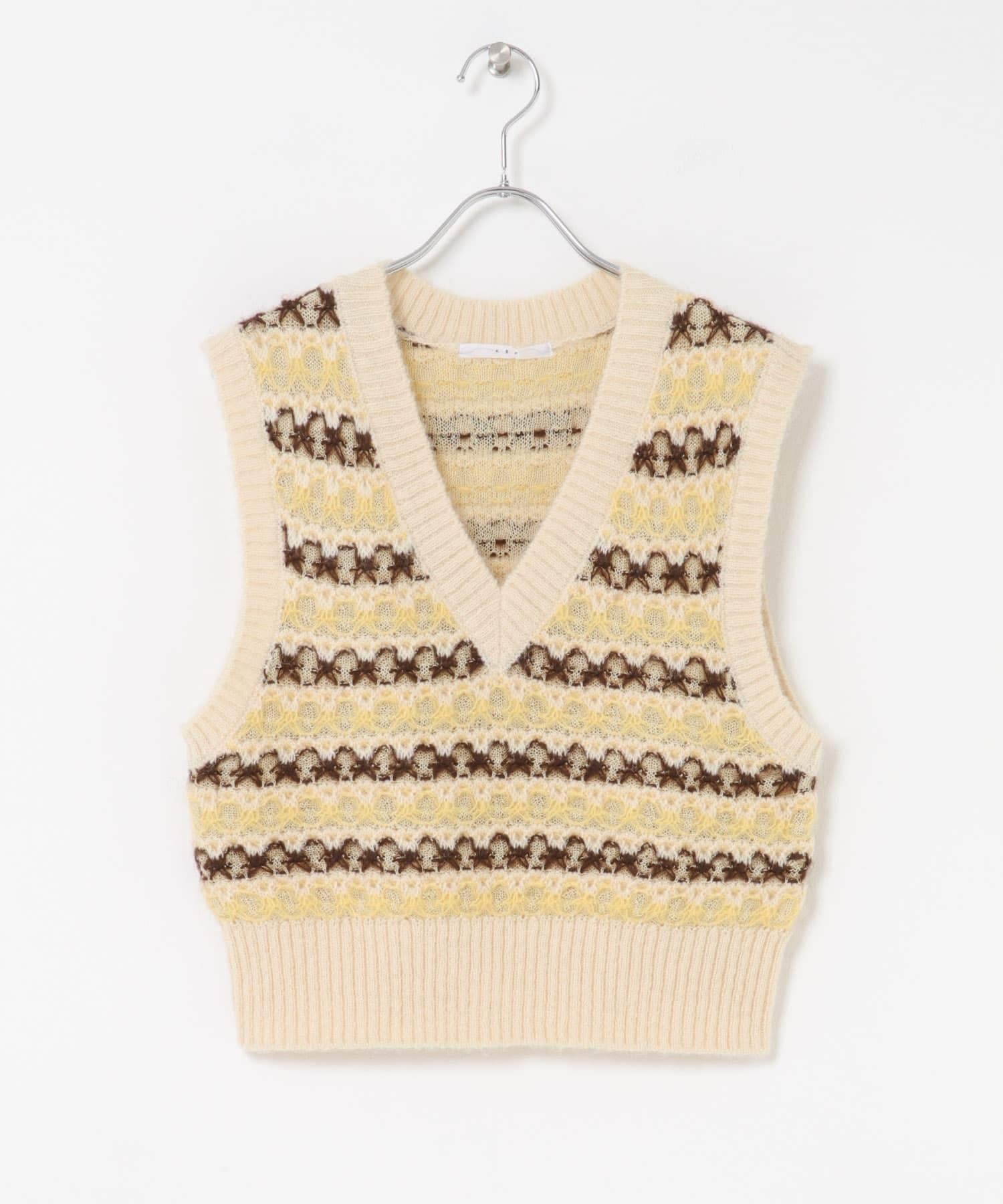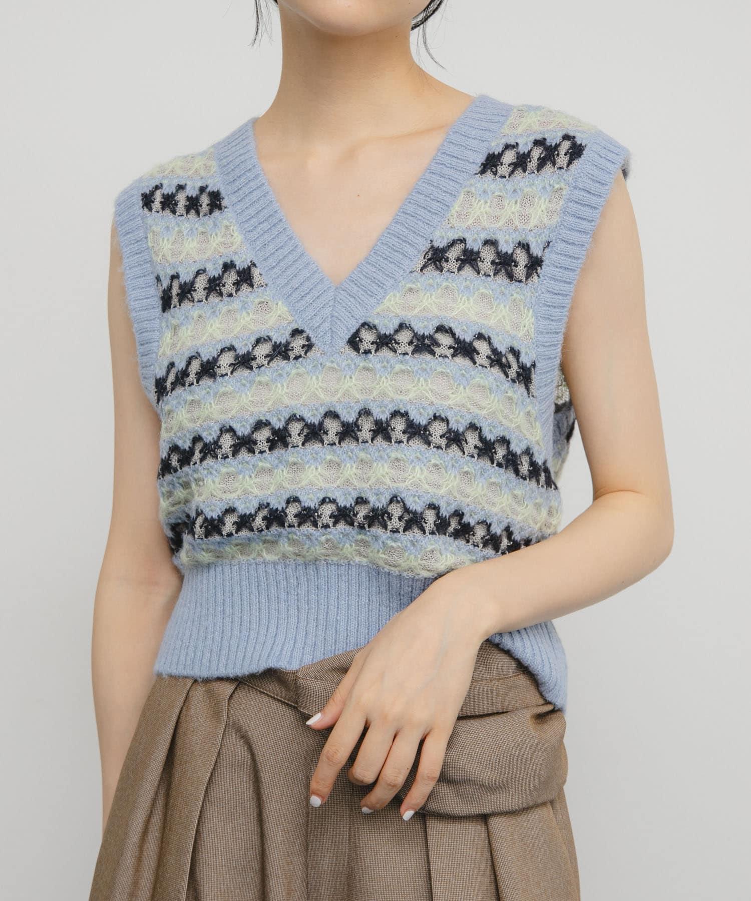 蓬鬆的馬海毛風格針織馬甲,配以醒目的圖案配色。底層部分由薄紗製成,略帶涼爽感,即使在這個季節也能輕鬆穿著。它可以疊穿在剪接式連衣裙和連身裙上,也可以作為夾克的內層。